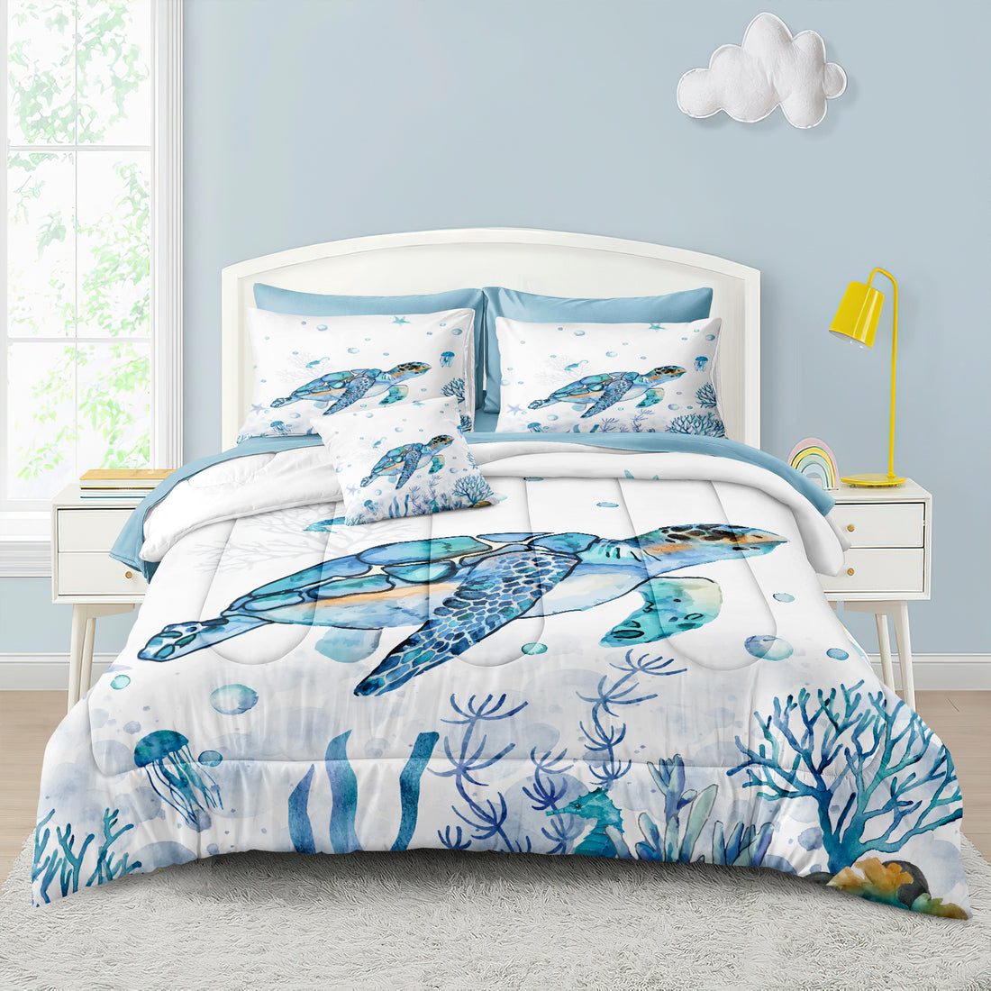 Sea Turtle Bed in a Bag – Beach Ocean Comforter with Sheets, Marine Life Print Bedding, Teal Blue Coastal Decor
