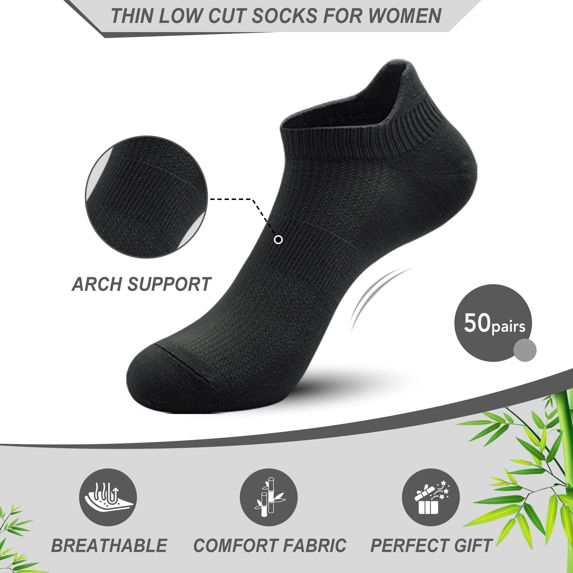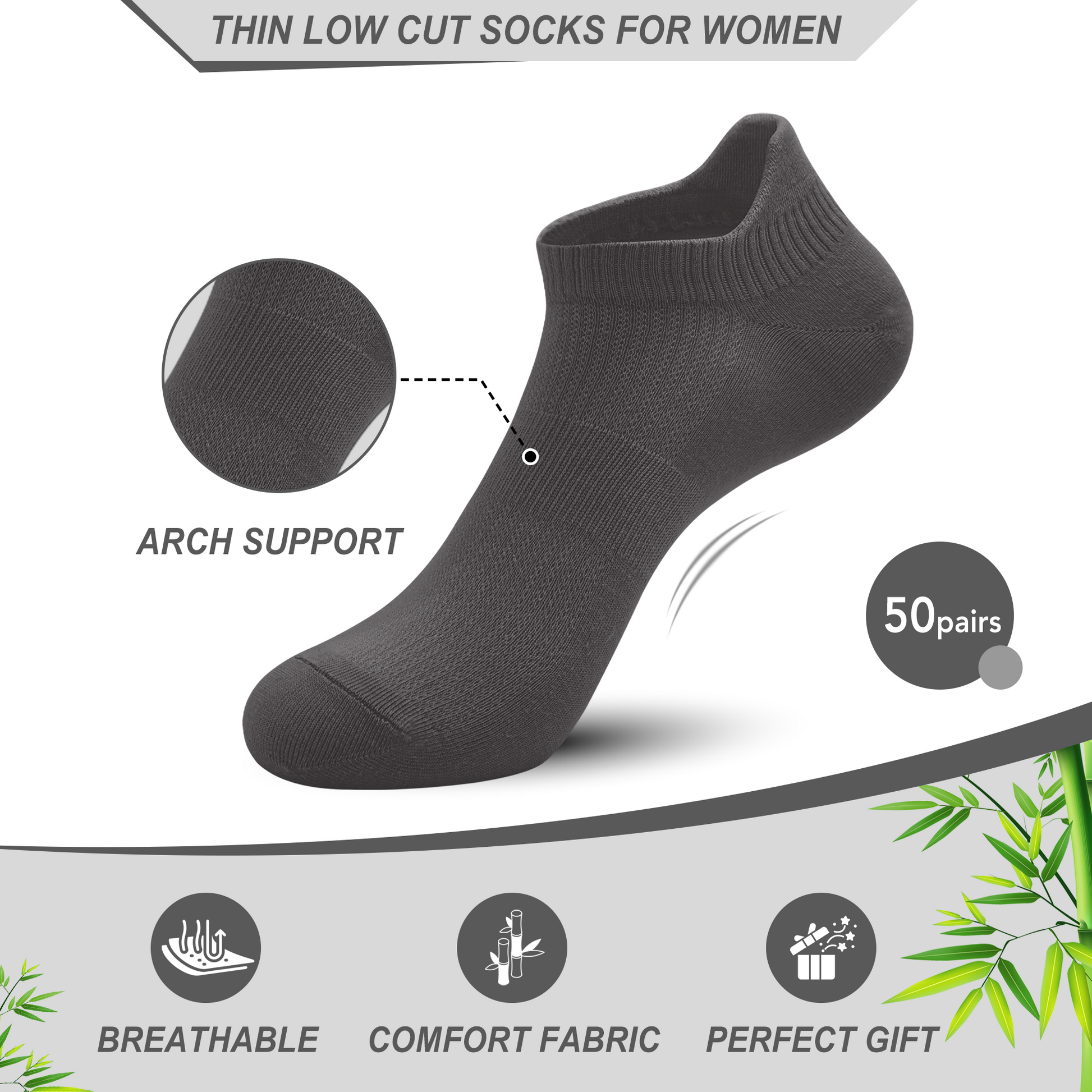 GENTLEAGU Women's No-Show Socks - Thin, Soft Viscose Bamboo with Arch Support Breathable in Bulk Wholesale 50 Pairs