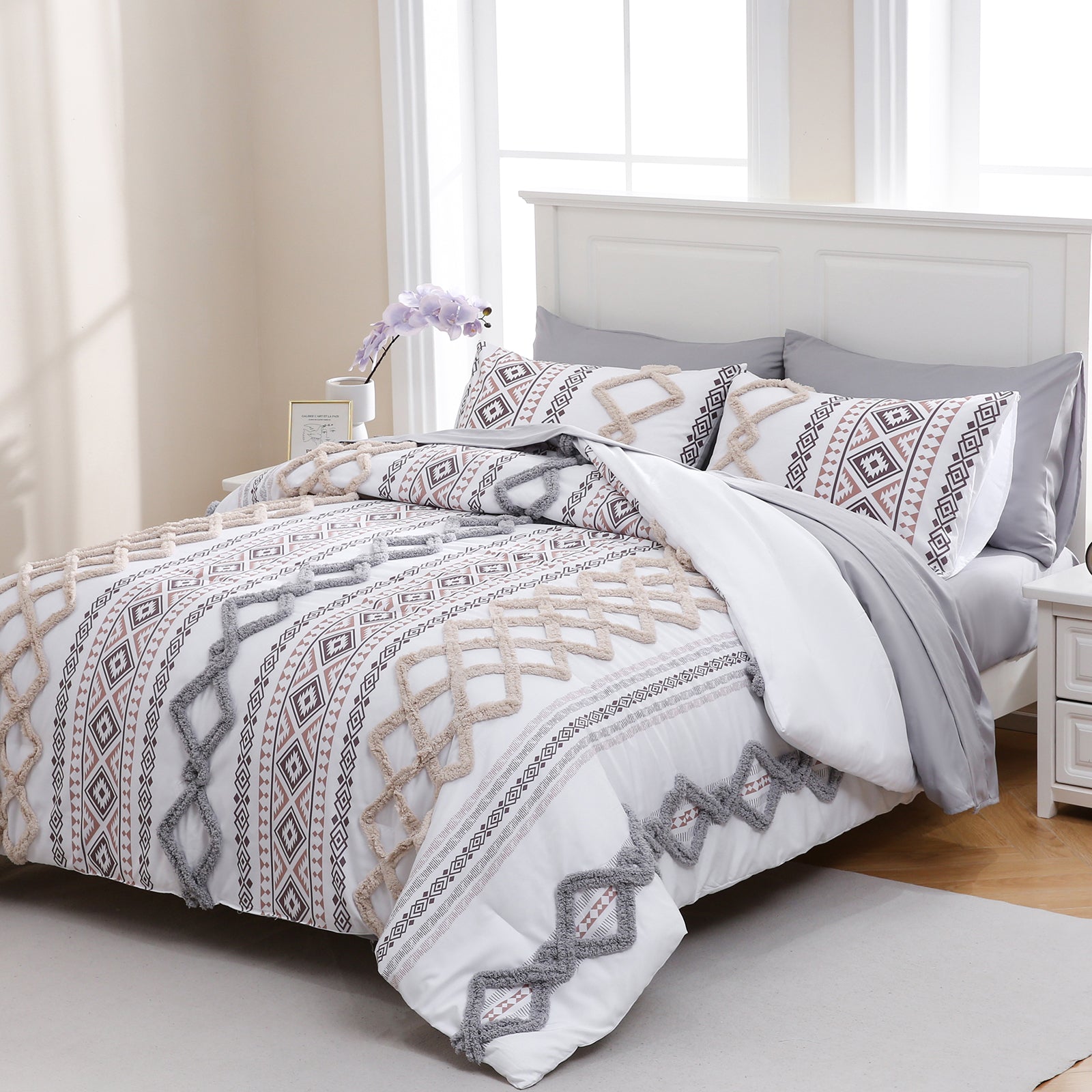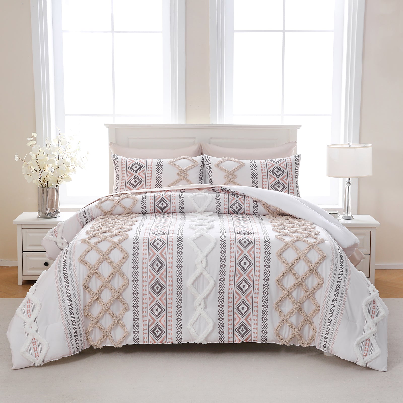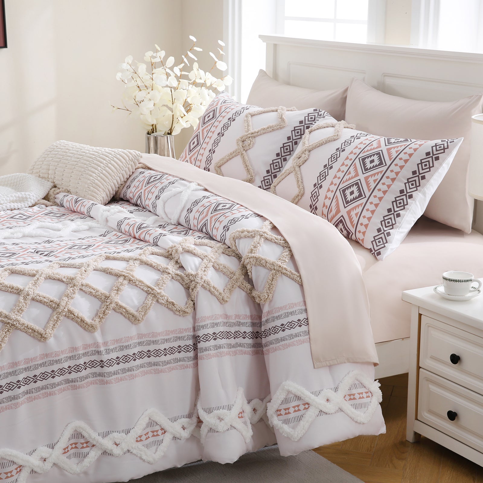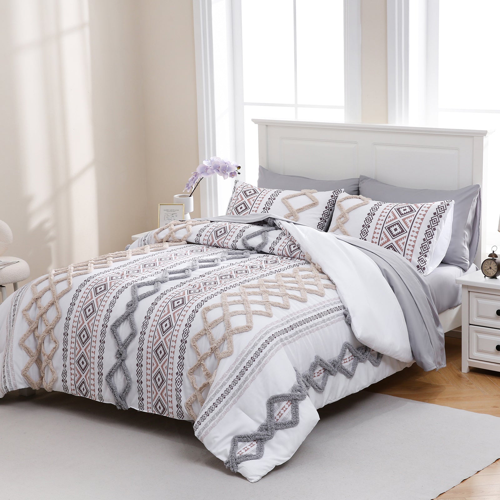 Refresh your bedroom with the 7-Piece Tufted Comforter Set Bed in a Bag, blending boho chic style with everyday comfort. Featuring hand-embellished chenille tufting and geometric Aztec-inspired designs, this set adds warmth and texture for a farmhouse or bohemian look.