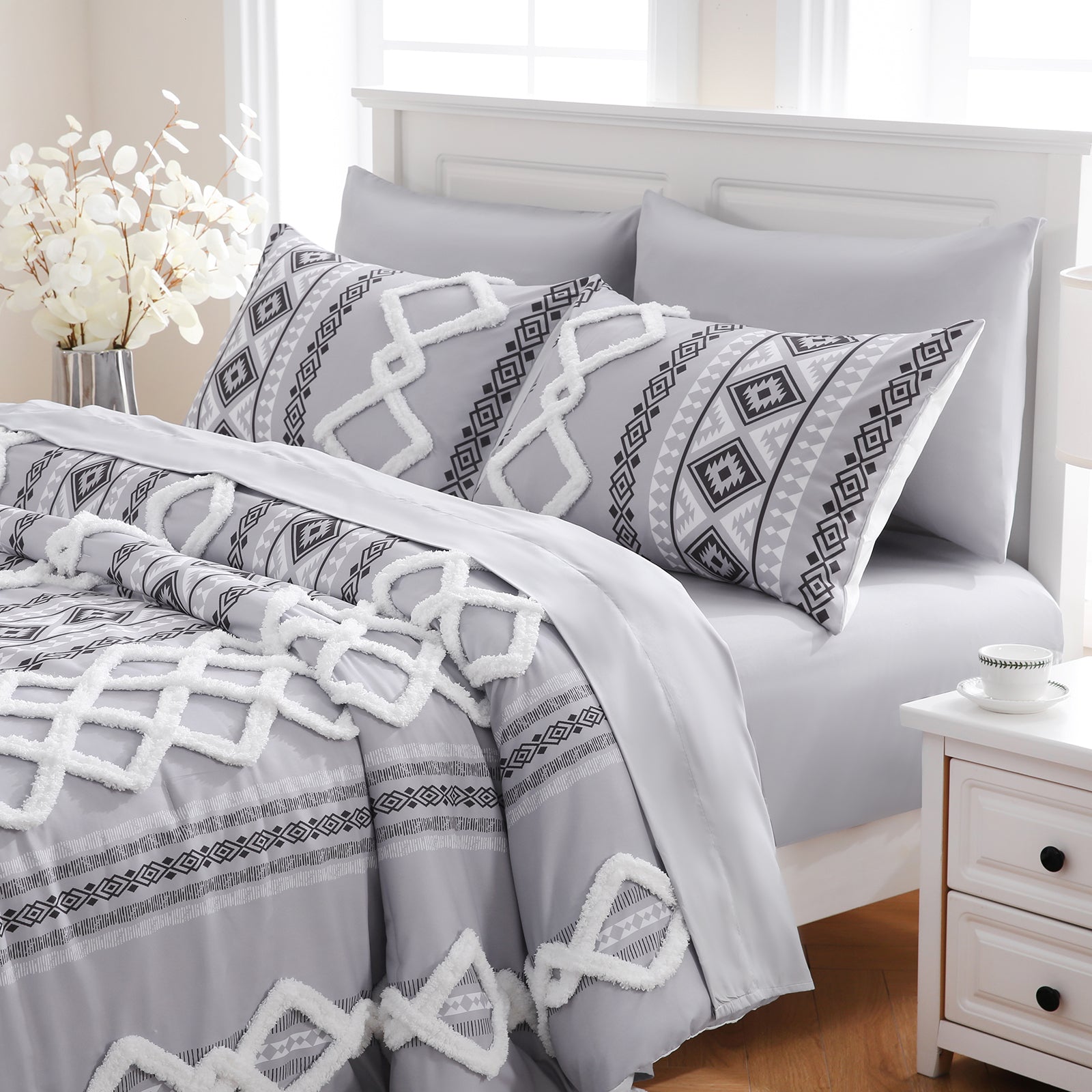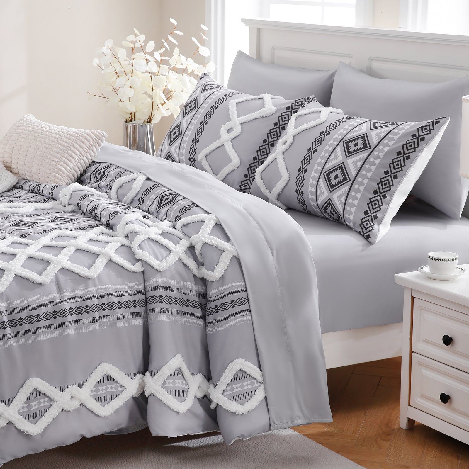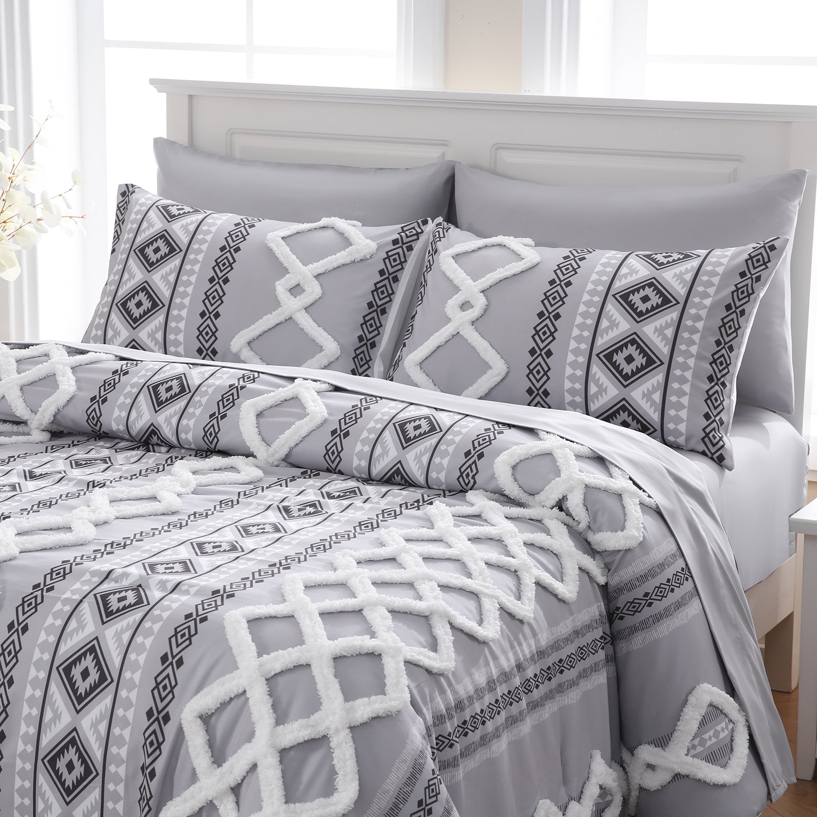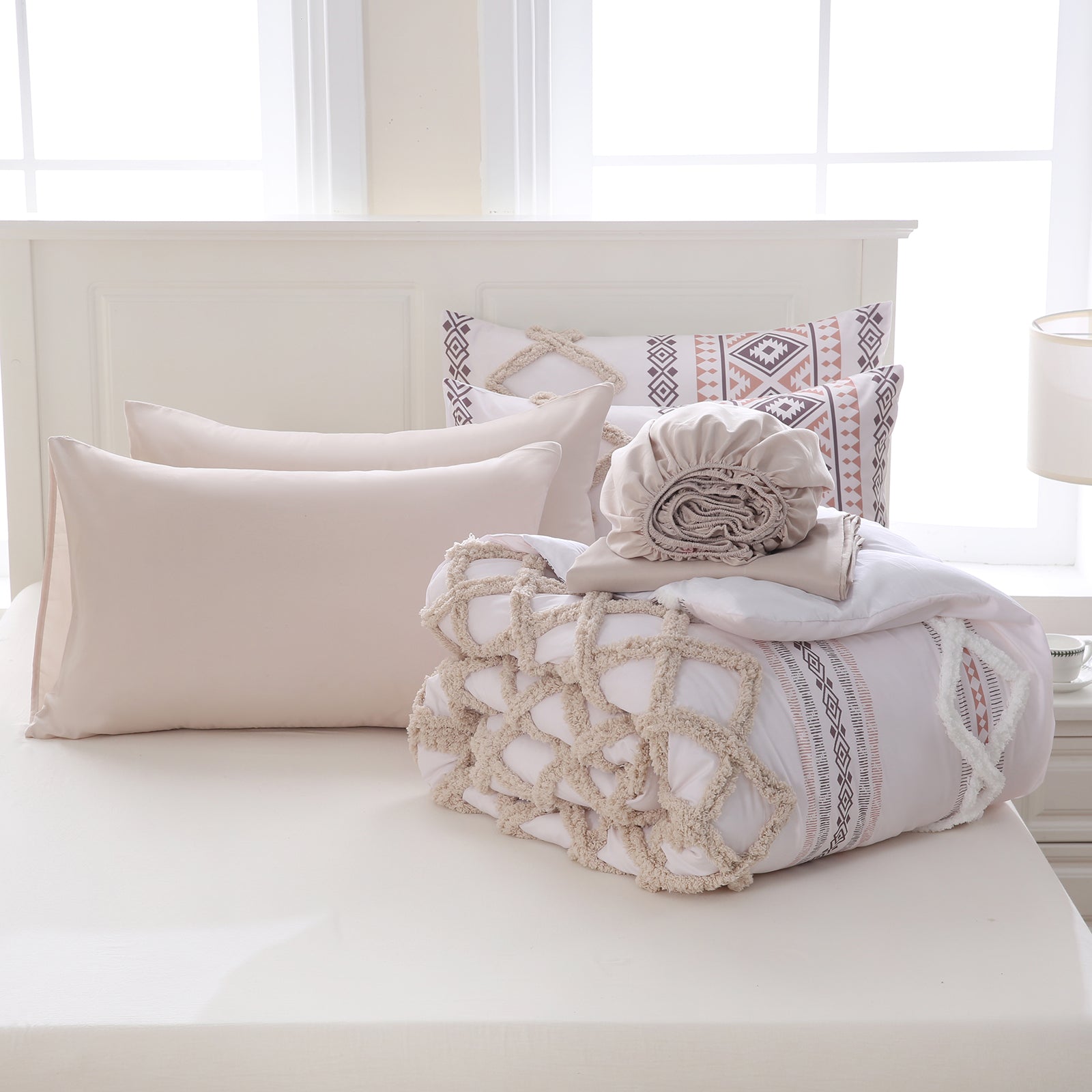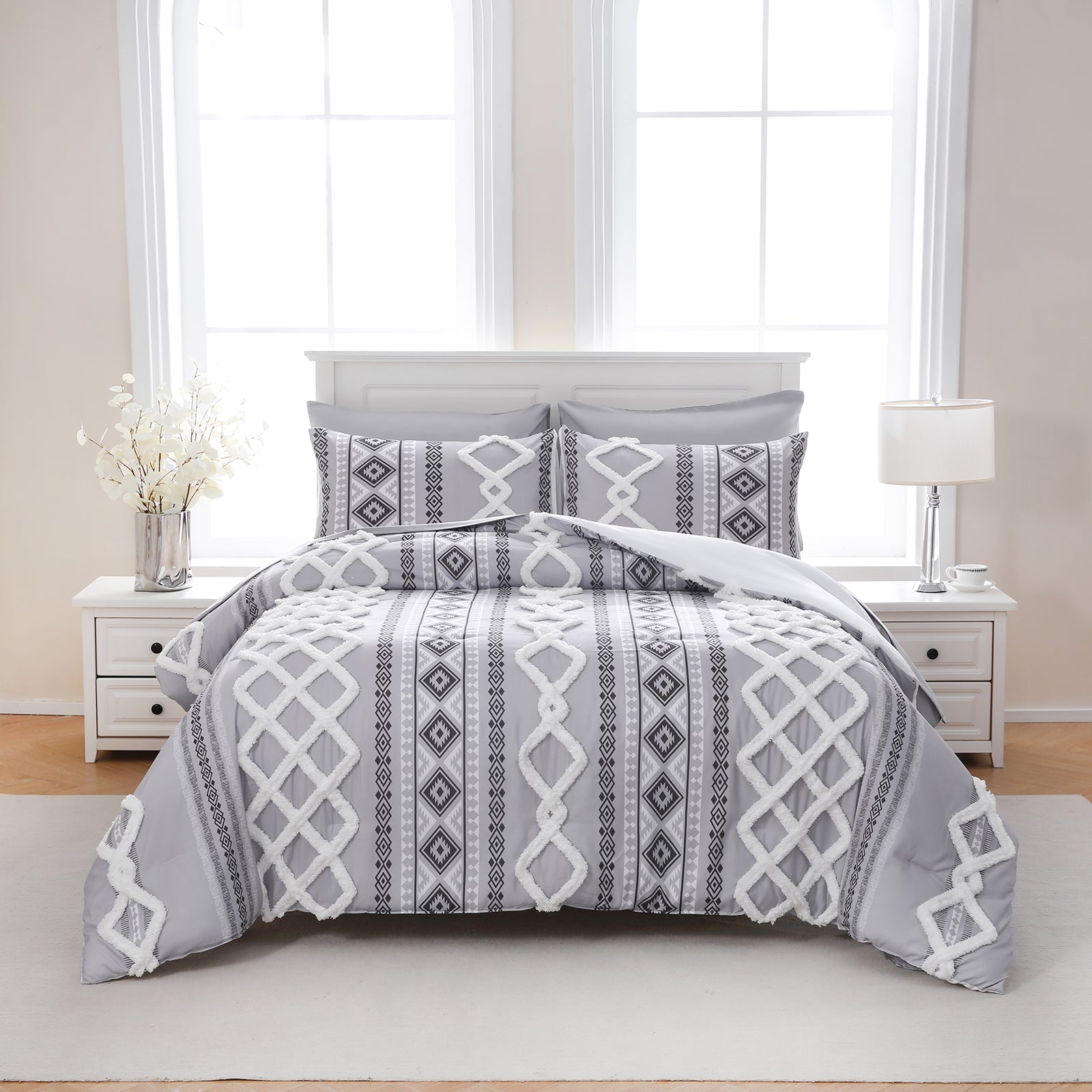 Refresh your bedroom with the 7-Piece Tufted Comforter Set Bed in a Bag, blending boho chic style with everyday comfort. Featuring hand-embellished chenille tufting and geometric Aztec-inspired designs, this set adds warmth and texture for a farmhouse or bohemian look.