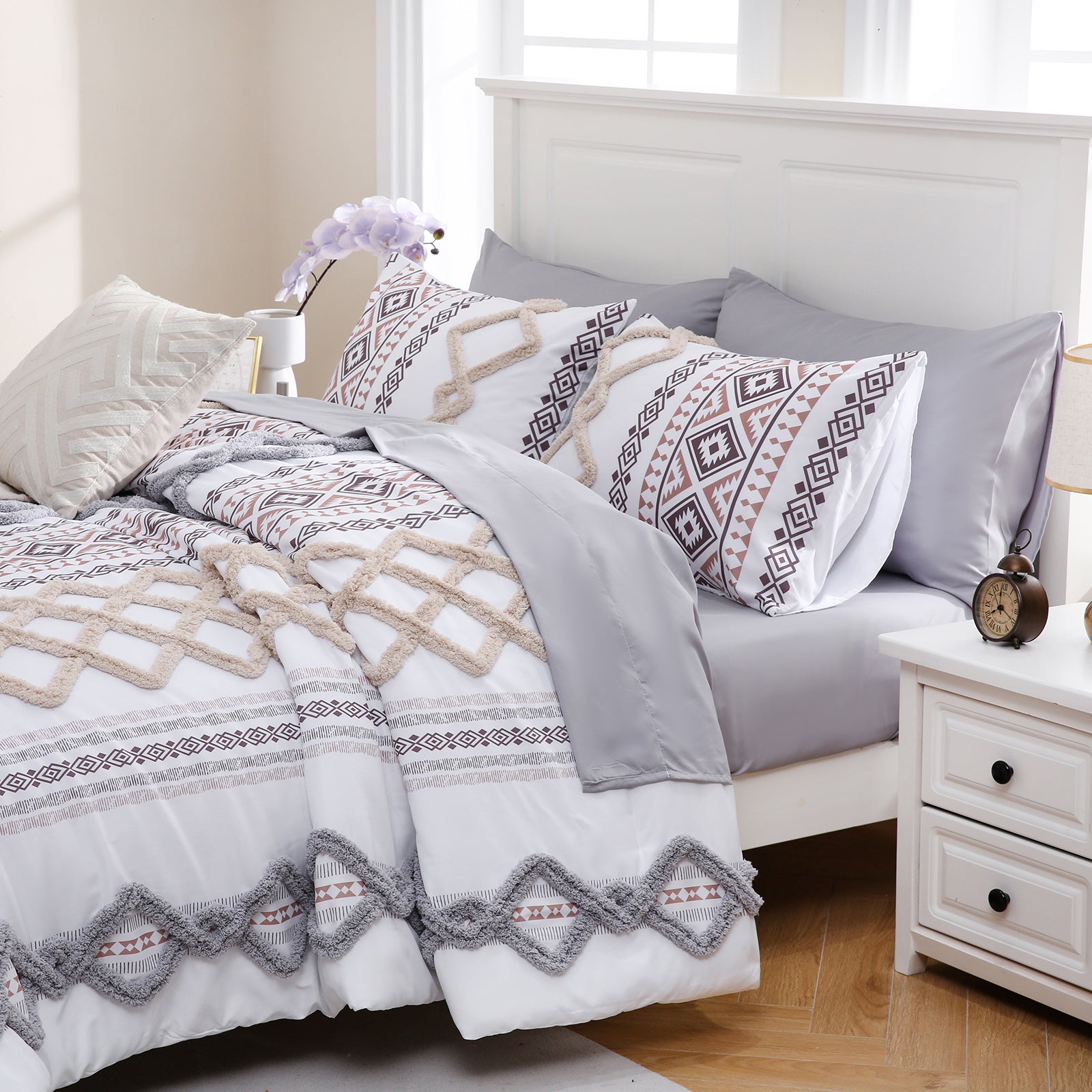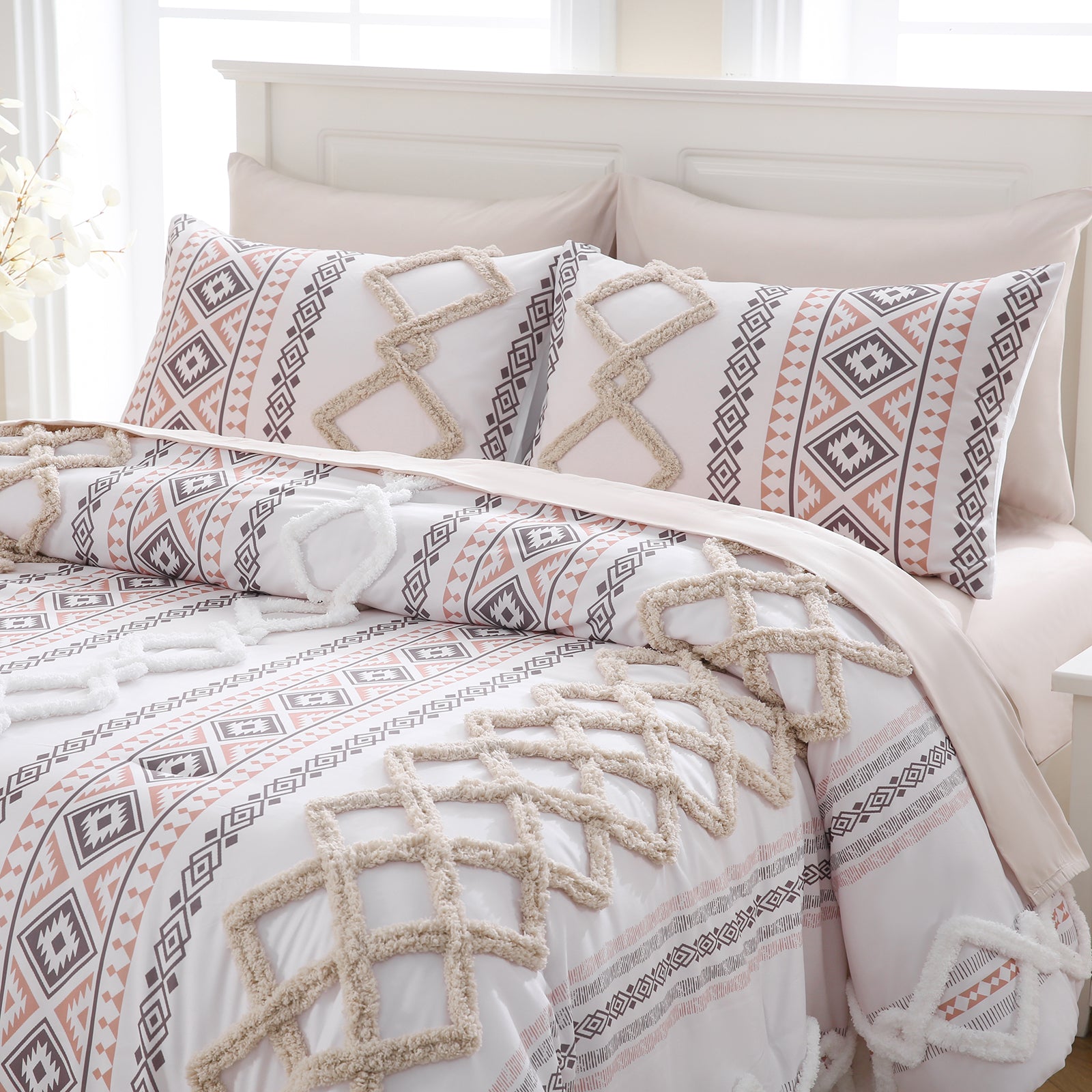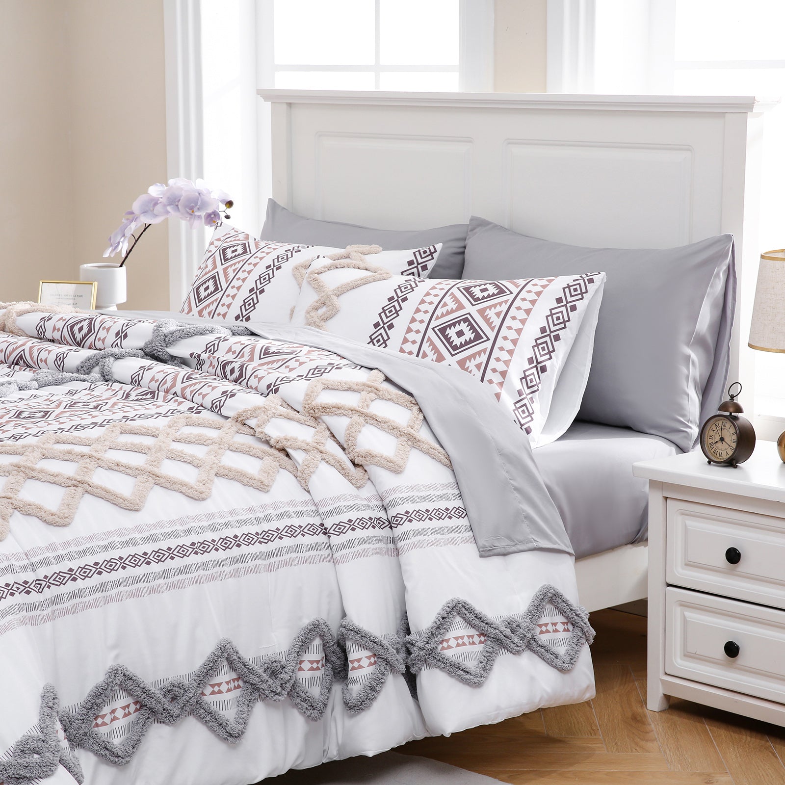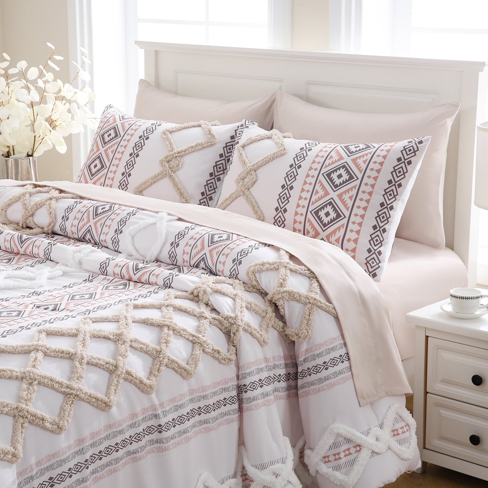 Refresh your bedroom with the 7-Piece Tufted Comforter Set Bed in a Bag, blending boho chic style with everyday comfort. Featuring hand-embellished chenille tufting and geometric Aztec-inspired designs, this set adds warmth and texture for a farmhouse or bohemian look.
