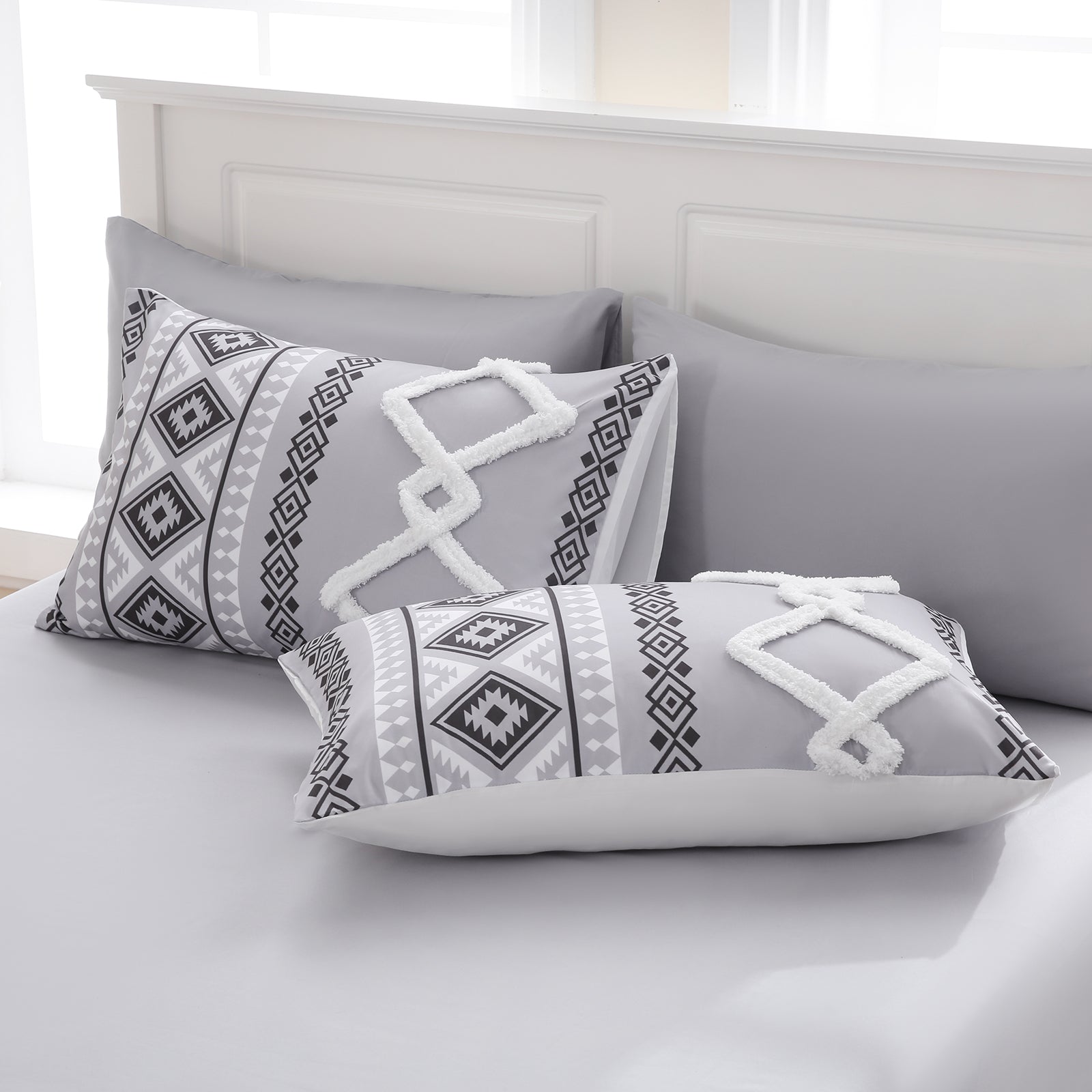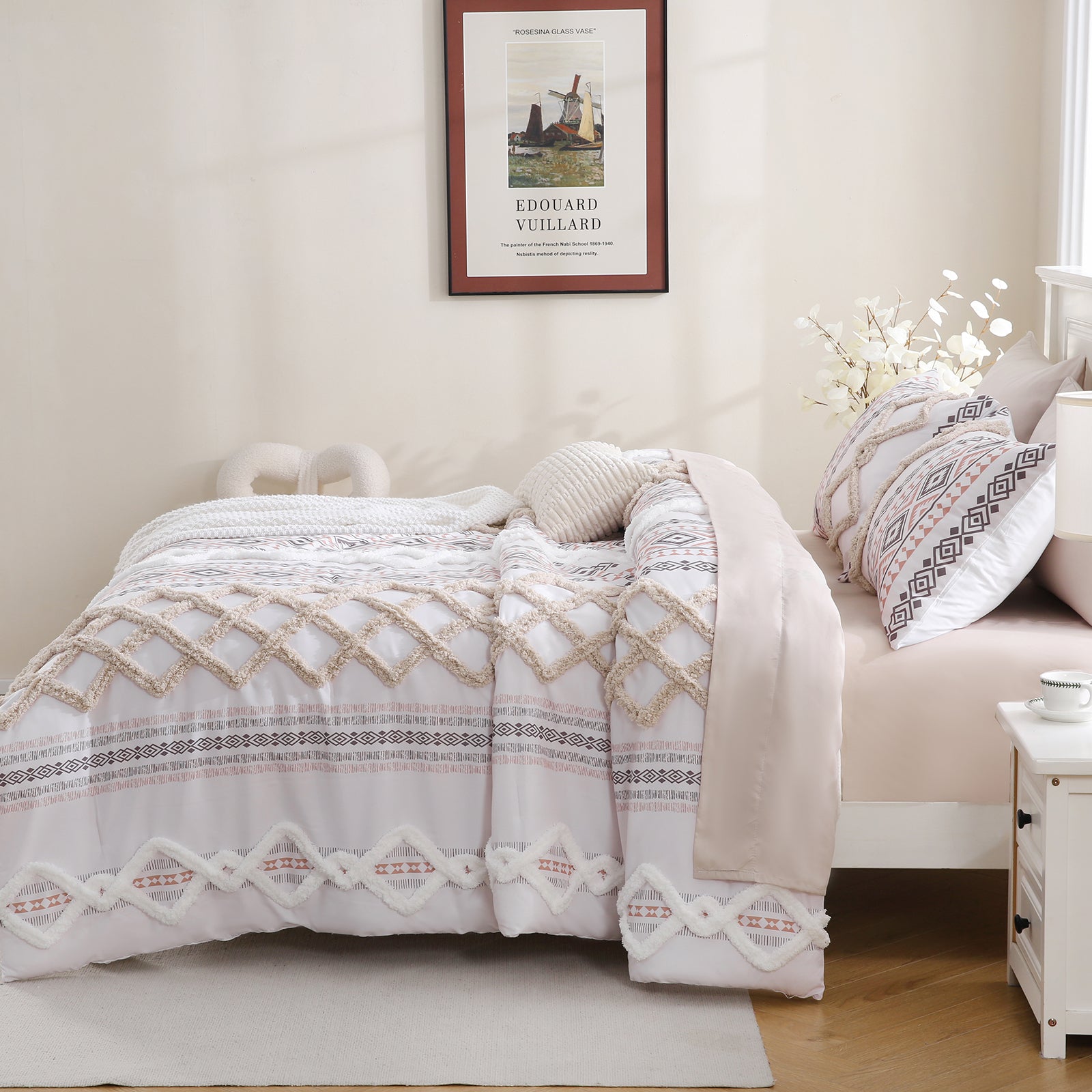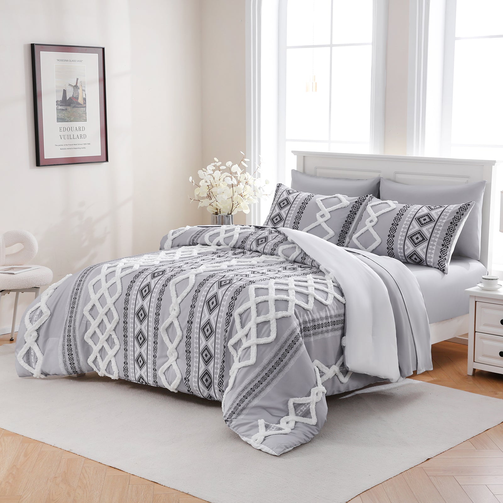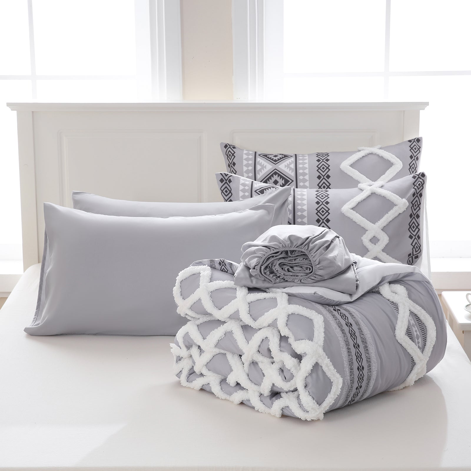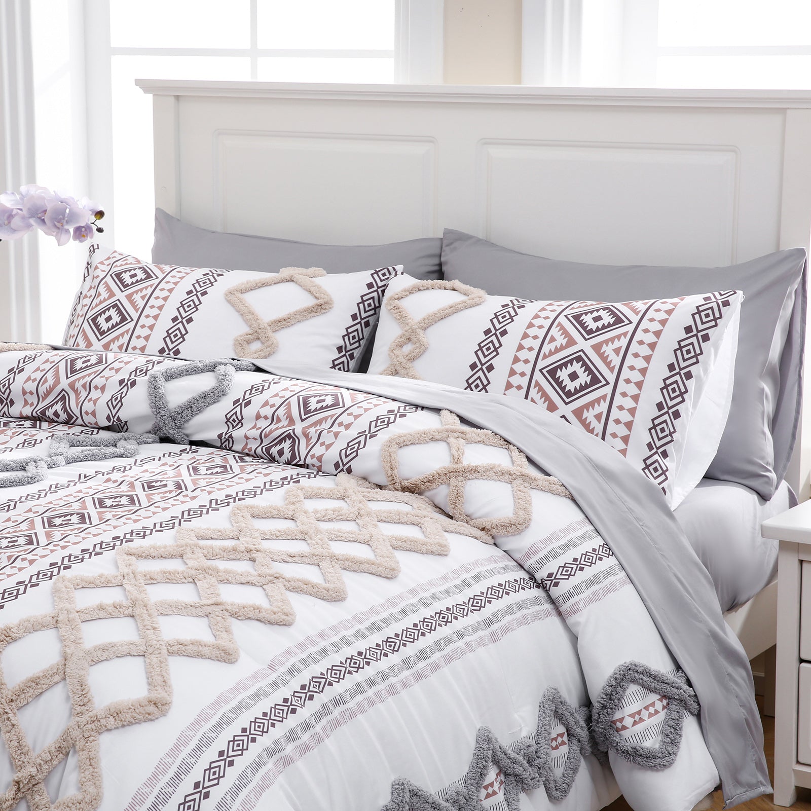 Refresh your bedroom with the 7-Piece Tufted Comforter Set Bed in a Bag, blending boho chic style with everyday comfort. Featuring hand-embellished chenille tufting and geometric Aztec-inspired designs, this set adds warmth and texture for a farmhouse or bohemian look.