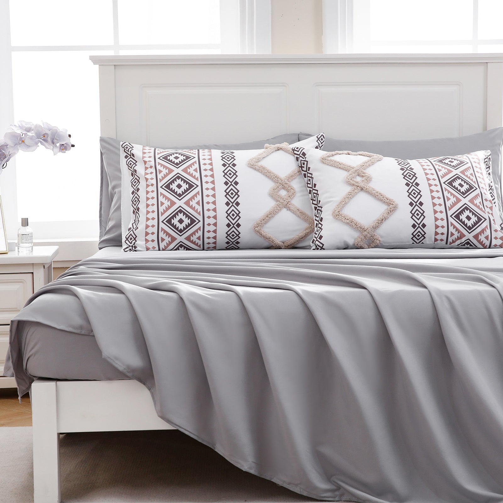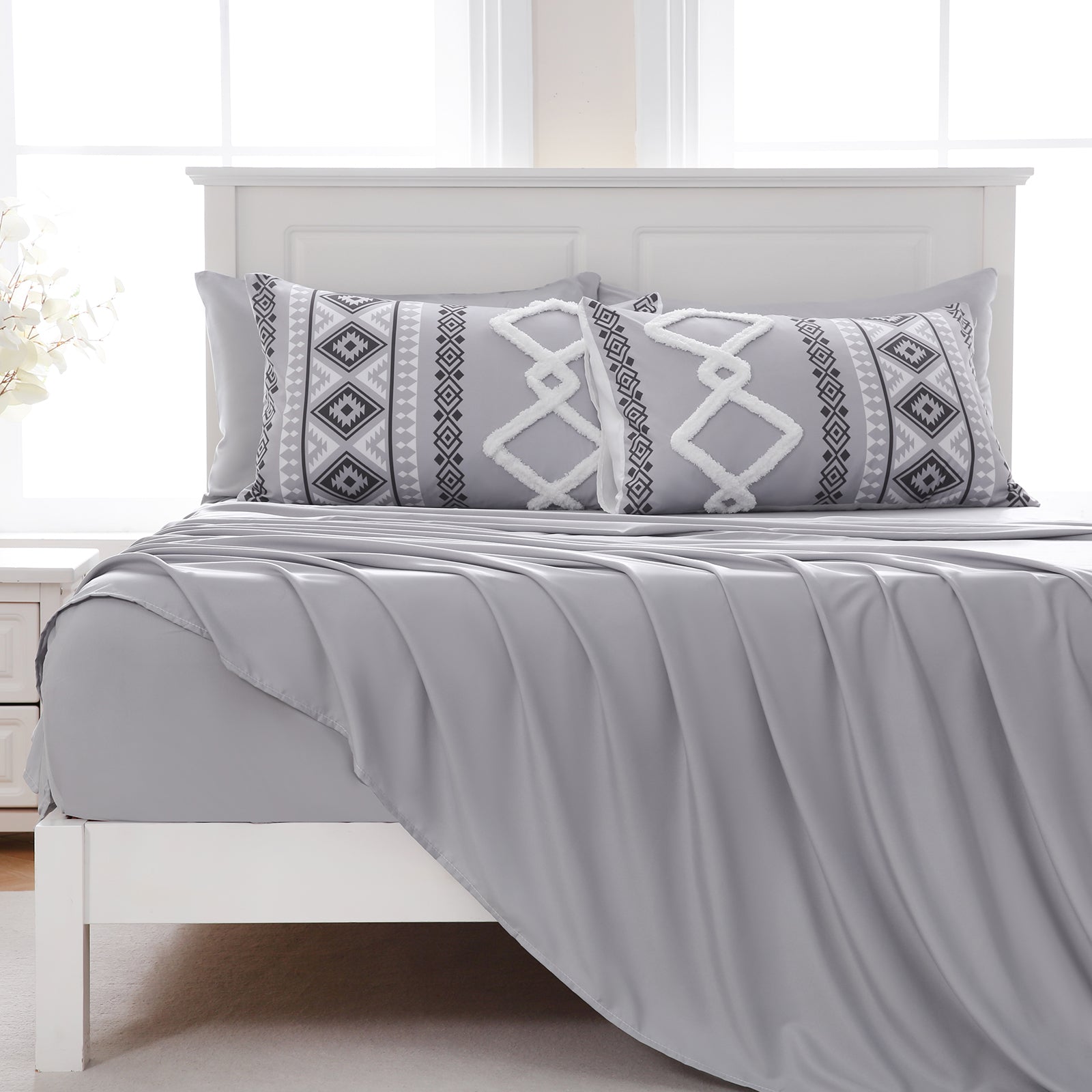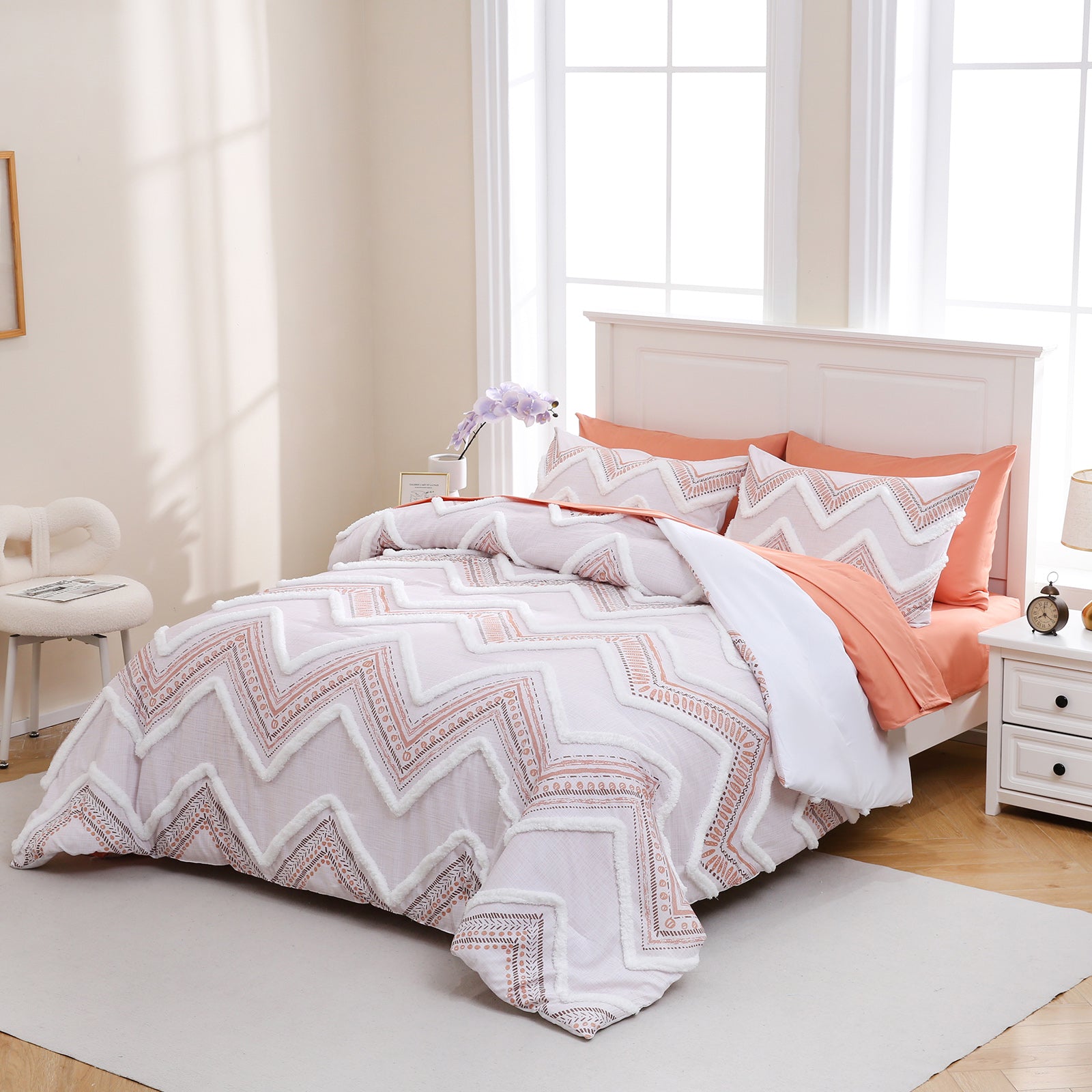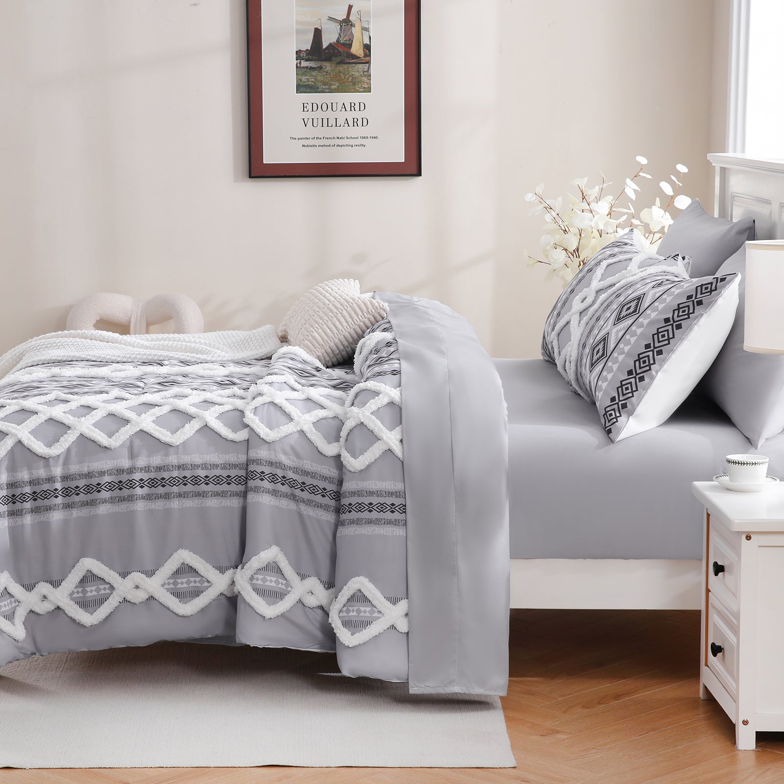 Refresh your bedroom with the 7-Piece Tufted Comforter Set Bed in a Bag, blending boho chic style with everyday comfort. Featuring hand-embellished chenille tufting and geometric Aztec-inspired designs, this set adds warmth and texture for a farmhouse or bohemian look.