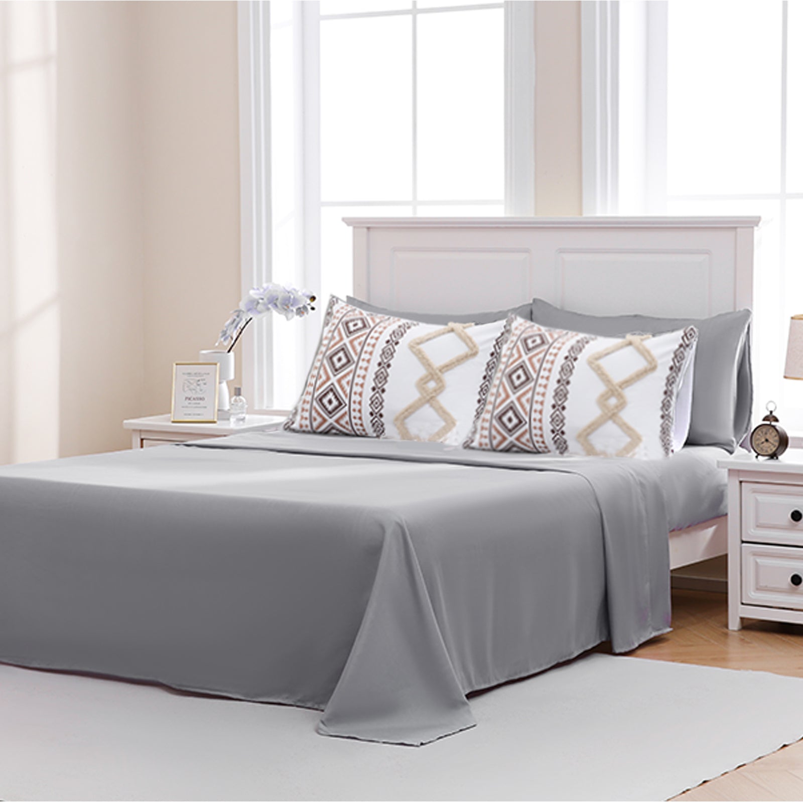 Each set includes a comforter, fitted sheet (16" pocket), flat sheet, and pillowcases, giving you everything you need for a coordinated bedroom makeover. Available in King and Queen sizes, the comforter is made from soft microfiber fabric with fluffy fill, offering breathable warmth and cozy softness year-round. Tight stitching prevents shifting and clumping, ensuring long-lasting durability.