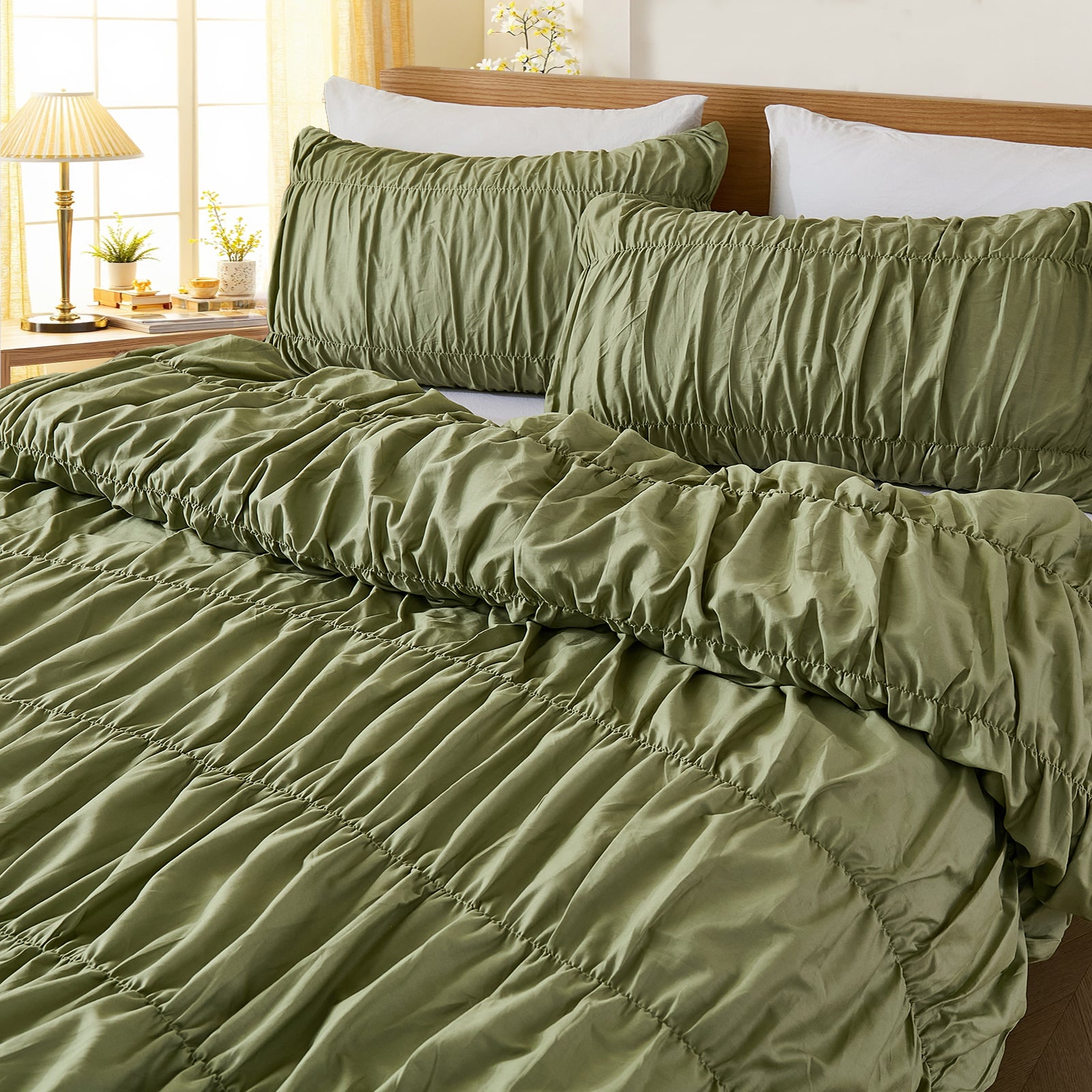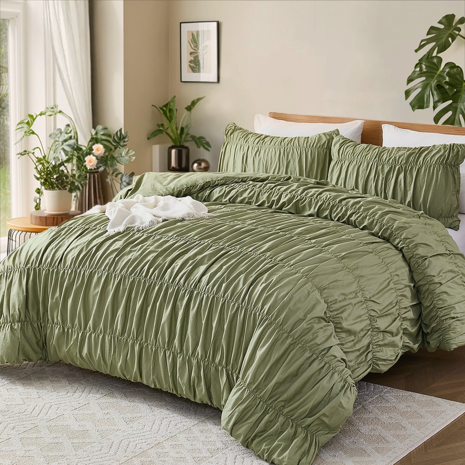 Made from 100% pure cotton, this set is breathable, moisture-absorbing, and gentle on skin, helping you stay cool in summer and comfortable in cooler seasons. Each 3-piece set includes a ruched duvet cover and matching pillowcases in Queen or King size for an effortless, coordinated look.