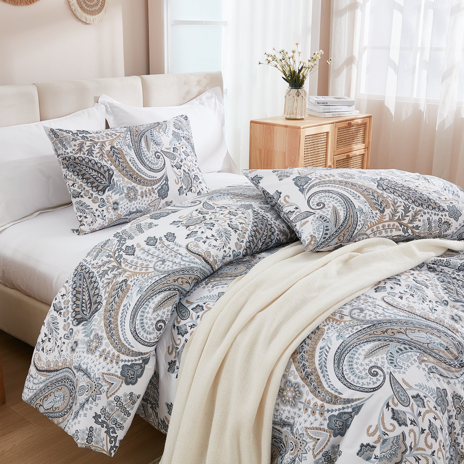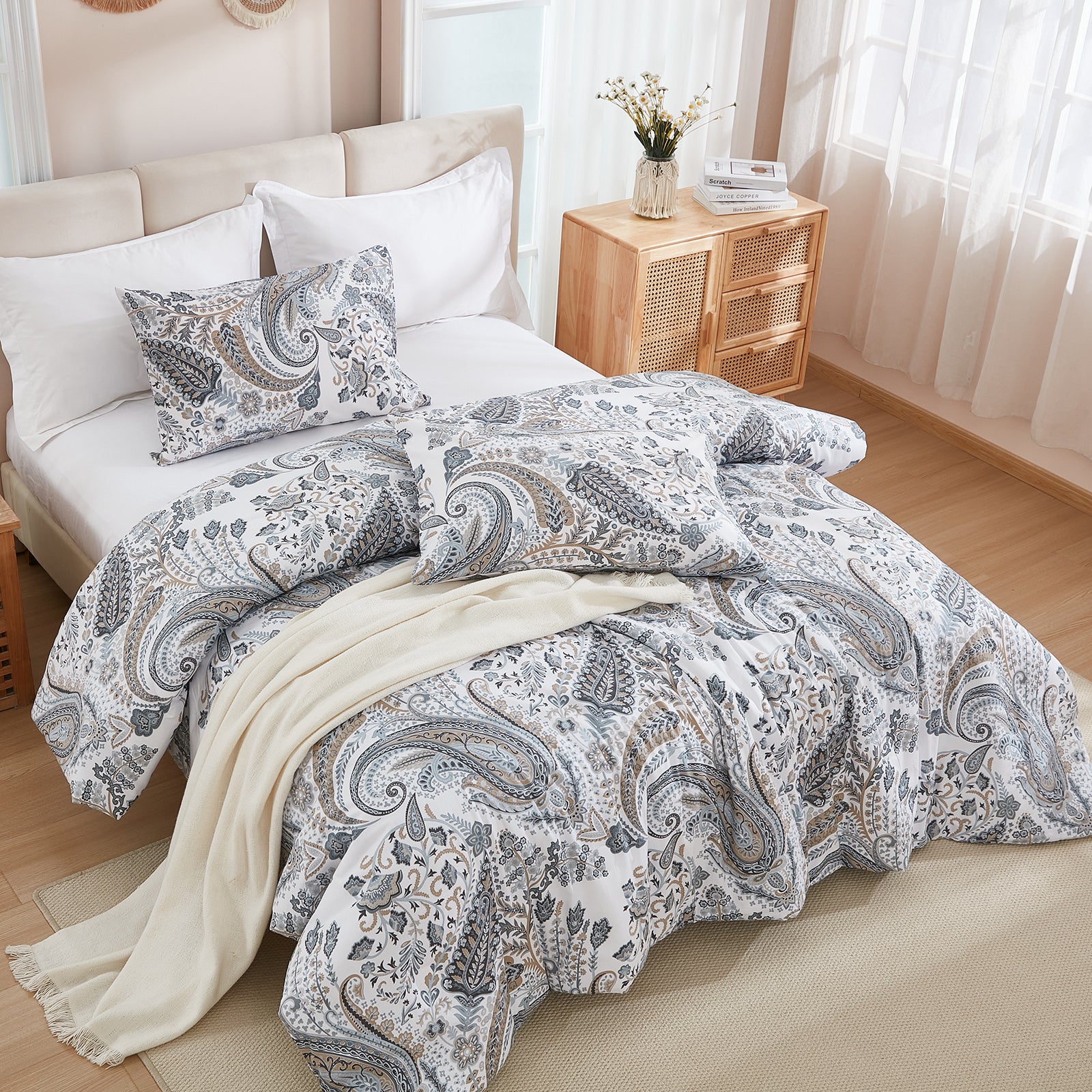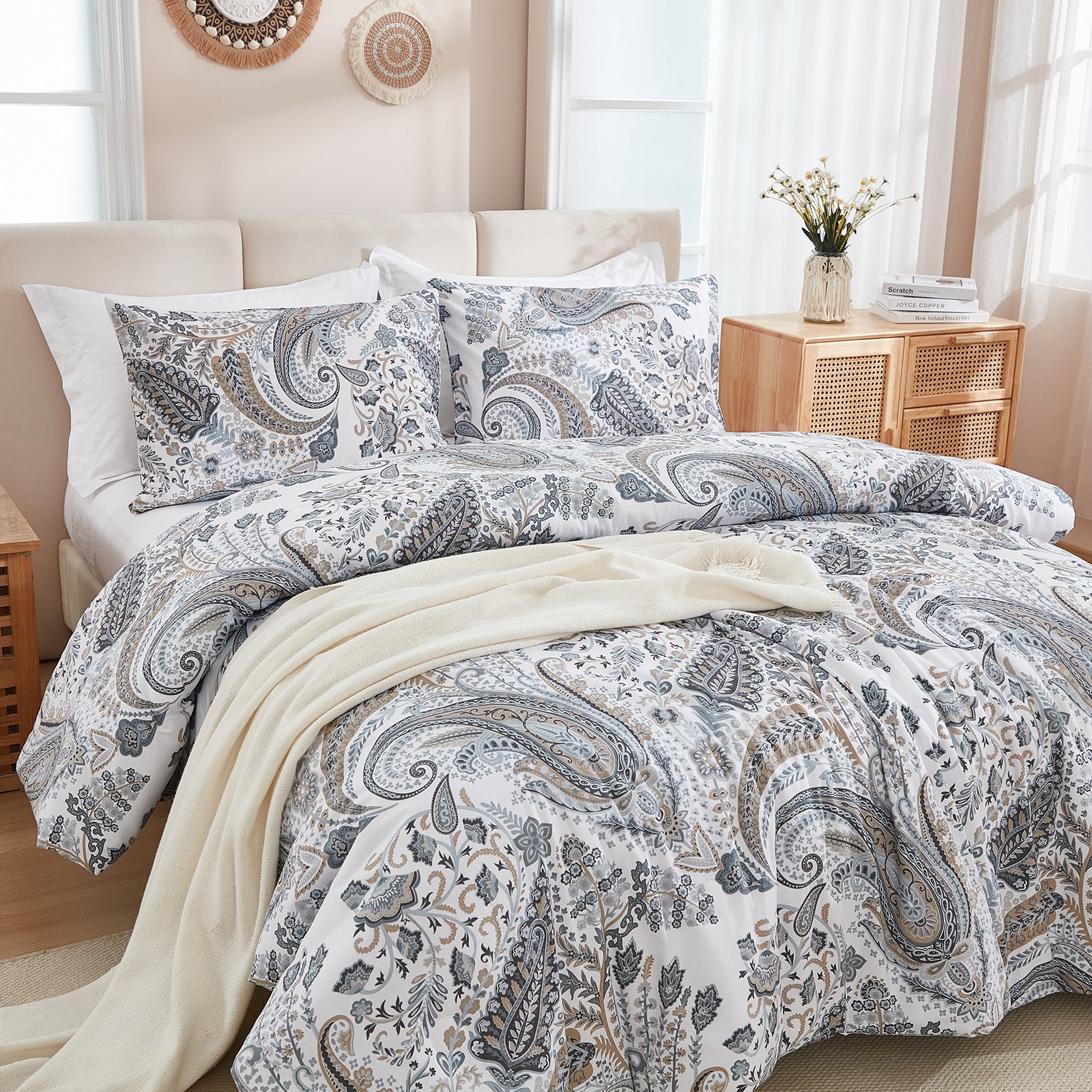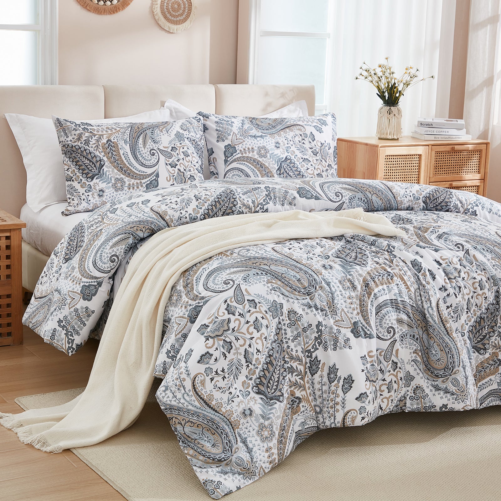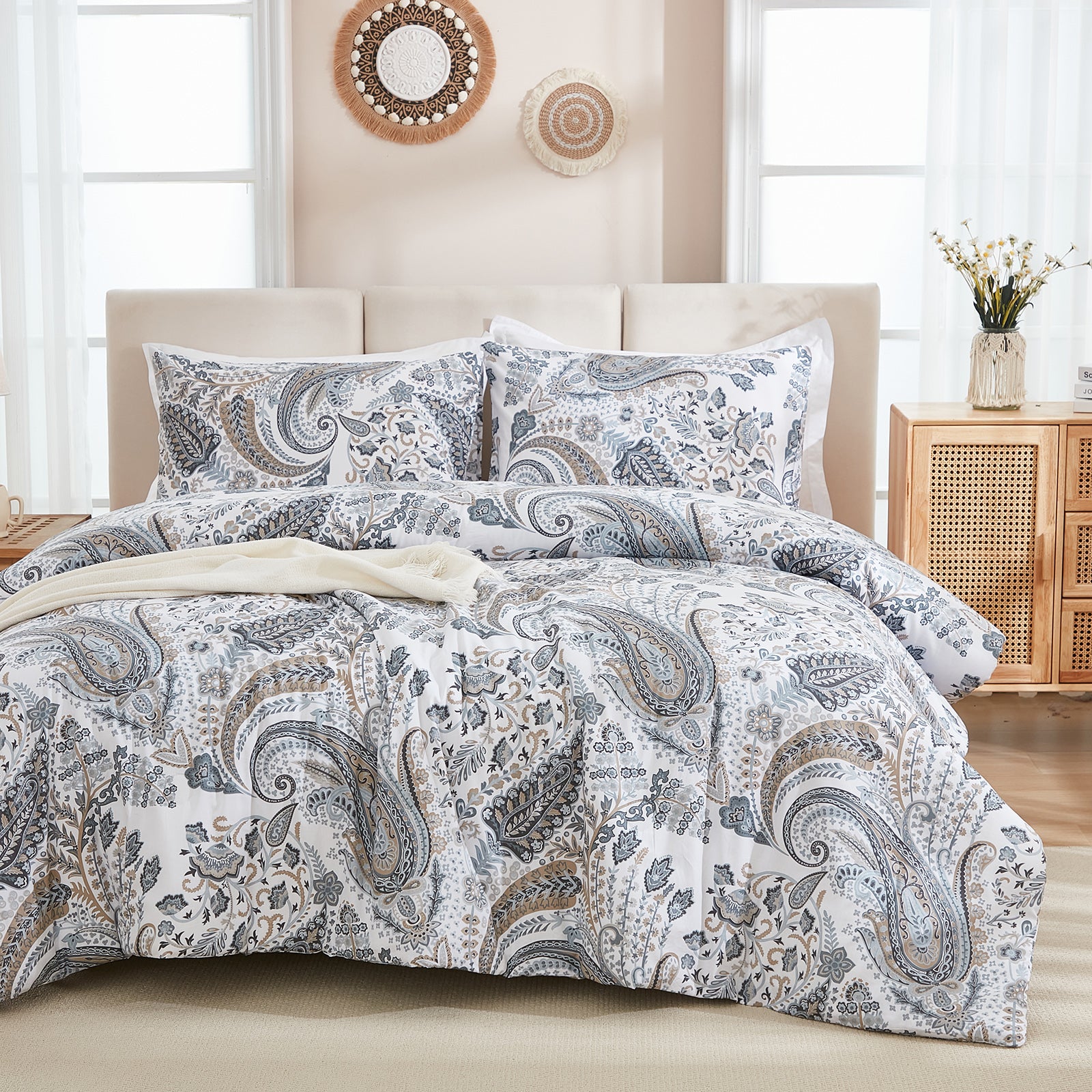 Featuring a unique printed design, it brings boho-inspired elegance and cozy farmhouse charm to your décor, creating a stylish focal point for your bedroom. Each set includes a comforter and 2 matching pillowcases, available in Queen and King sizes.