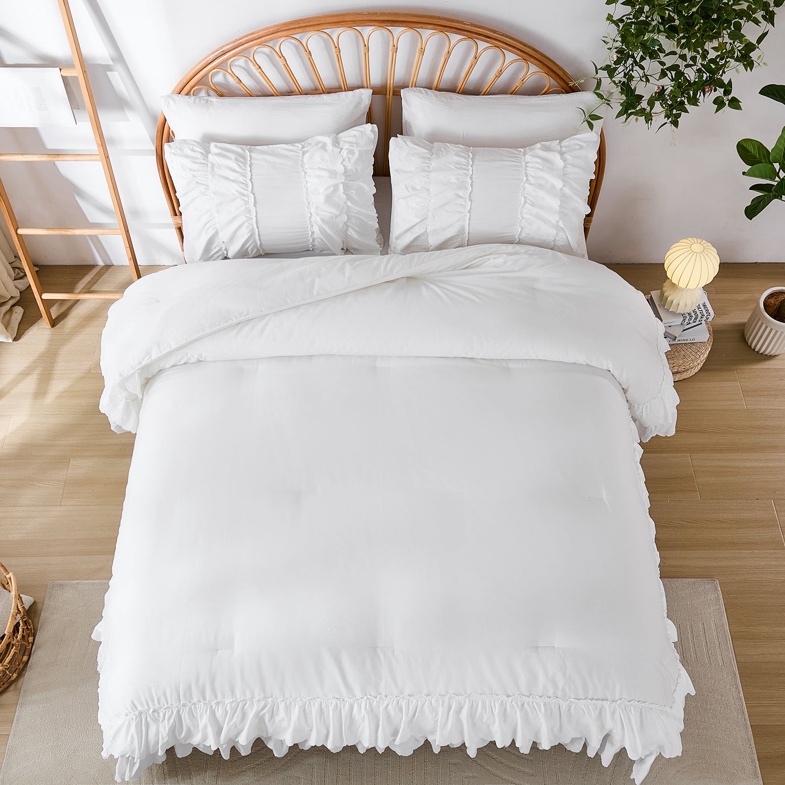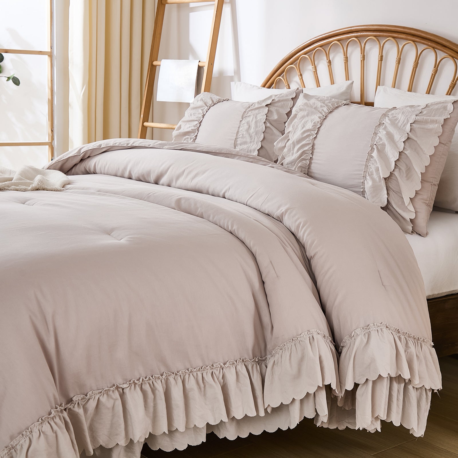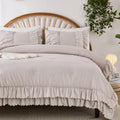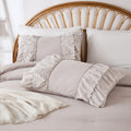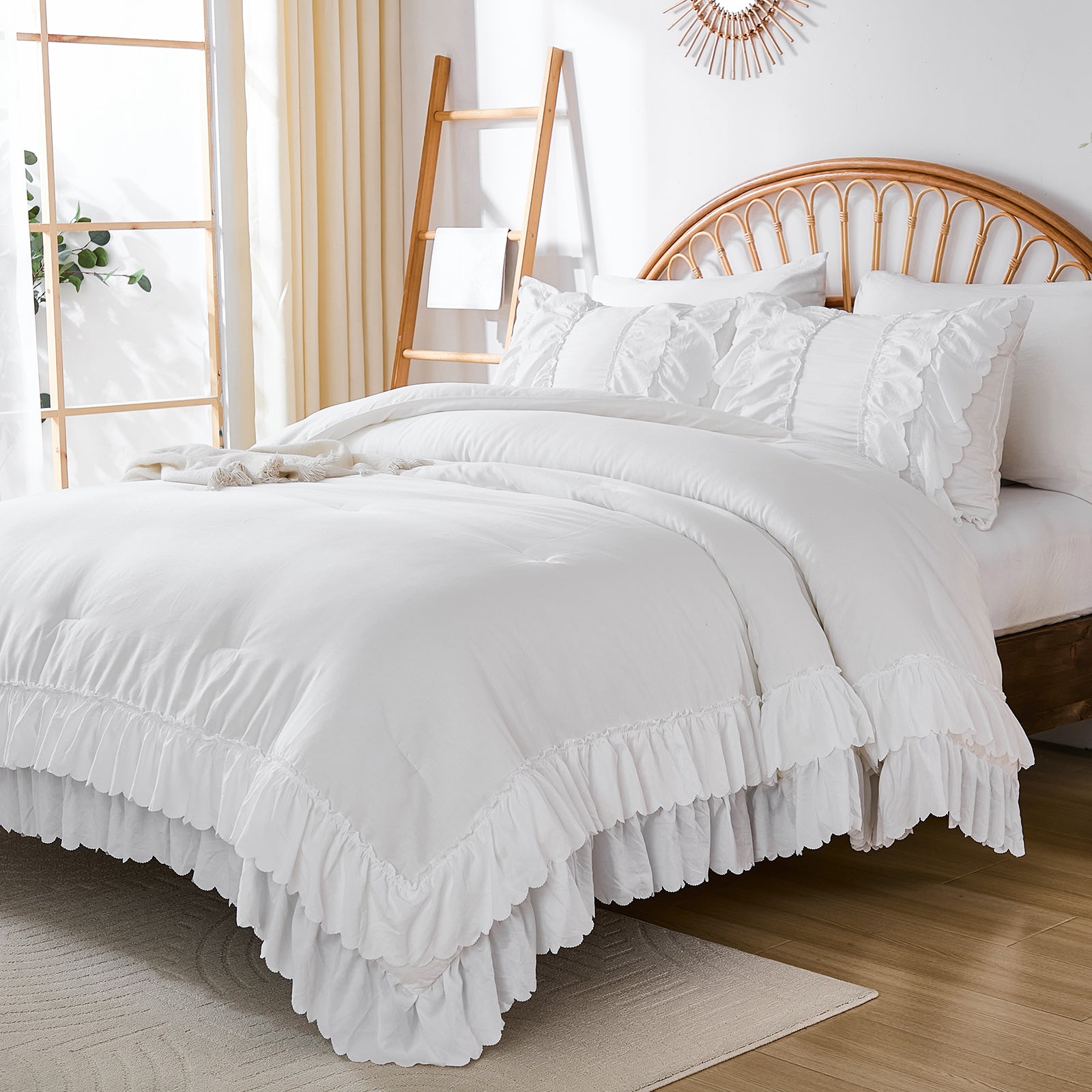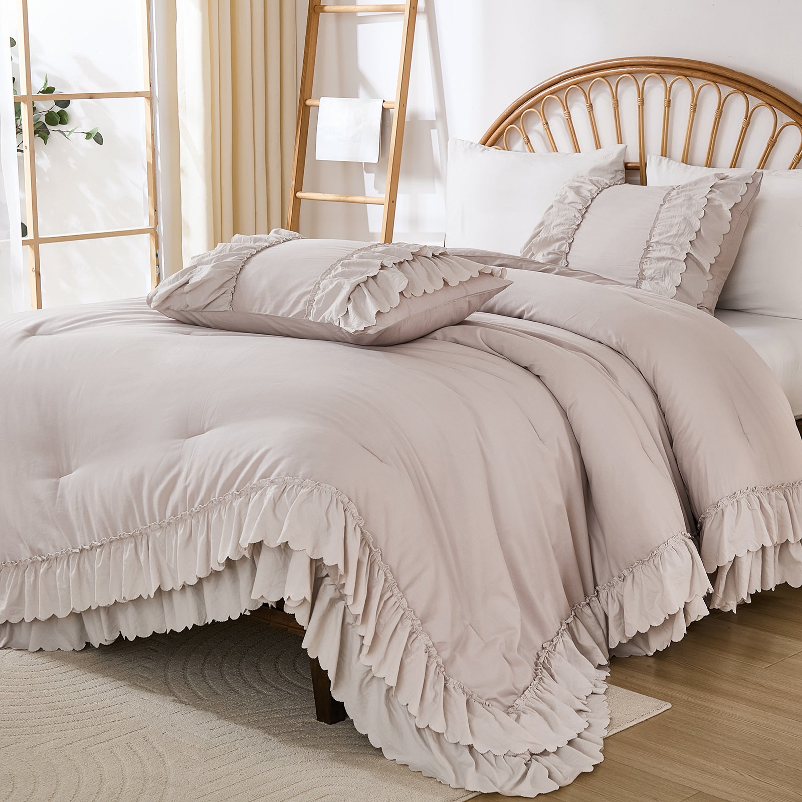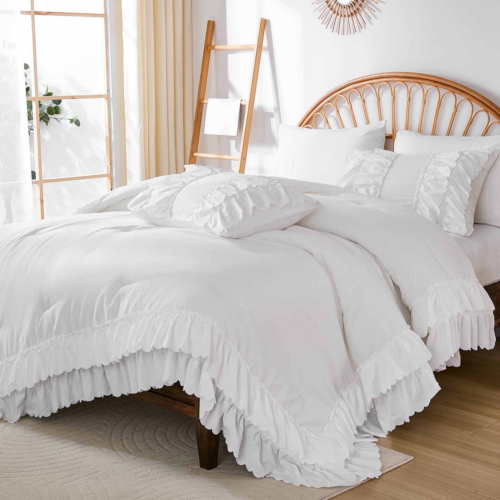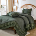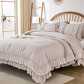 The comforter and matching pillow shams feature signature double layer ruffles that add elegant volume and French country romance. The timeless design pairs beautifully with farmhouse, cottagecore, bohemian, or modern minimalist bedrooms, making your bed the visual centerpiece of the room.