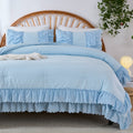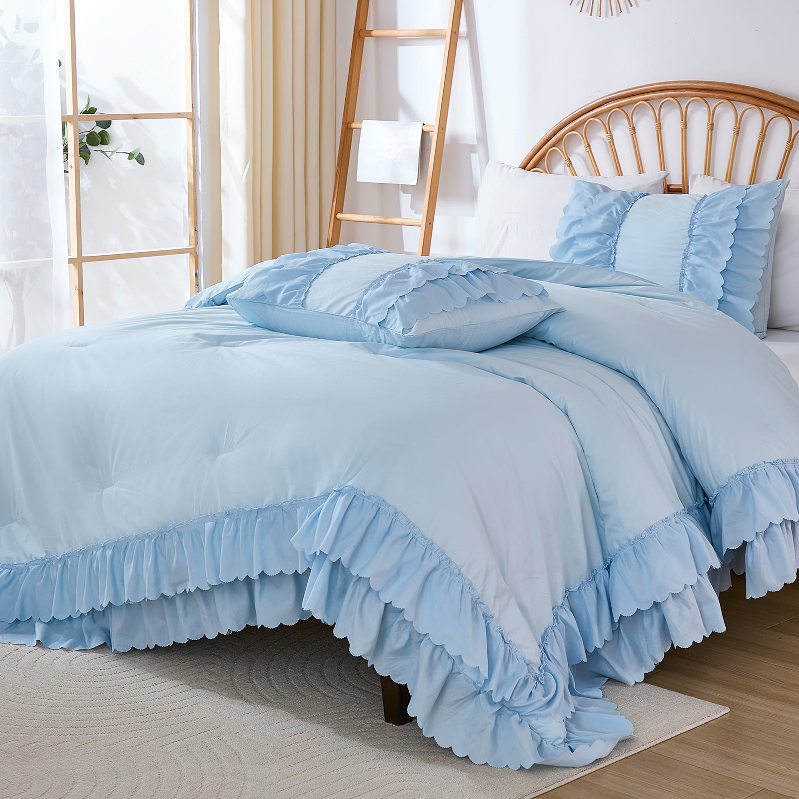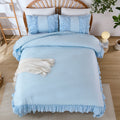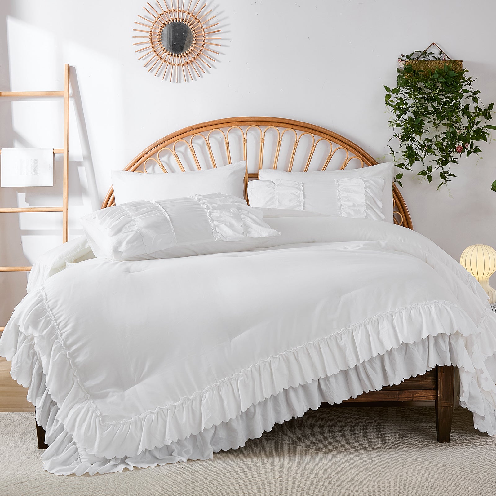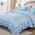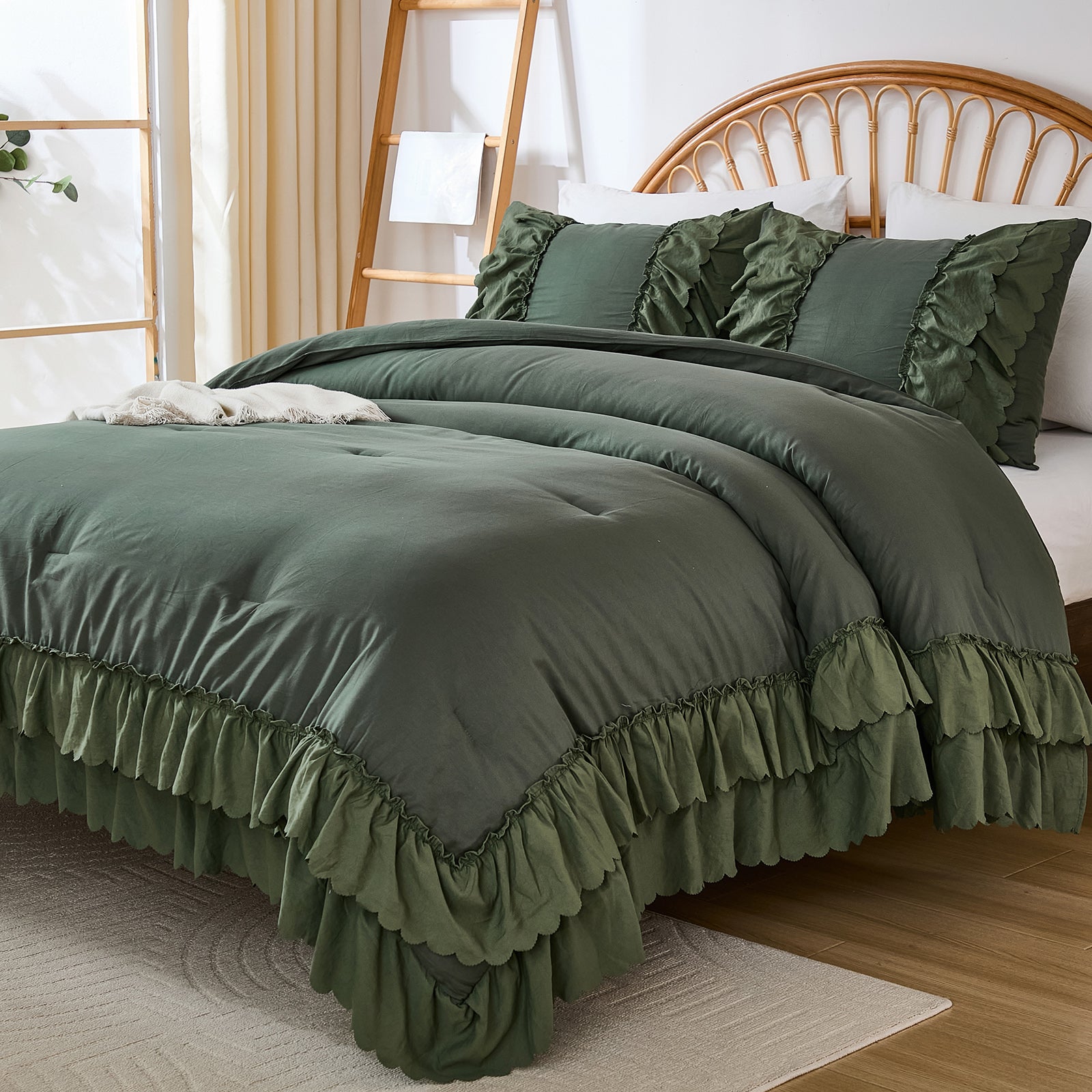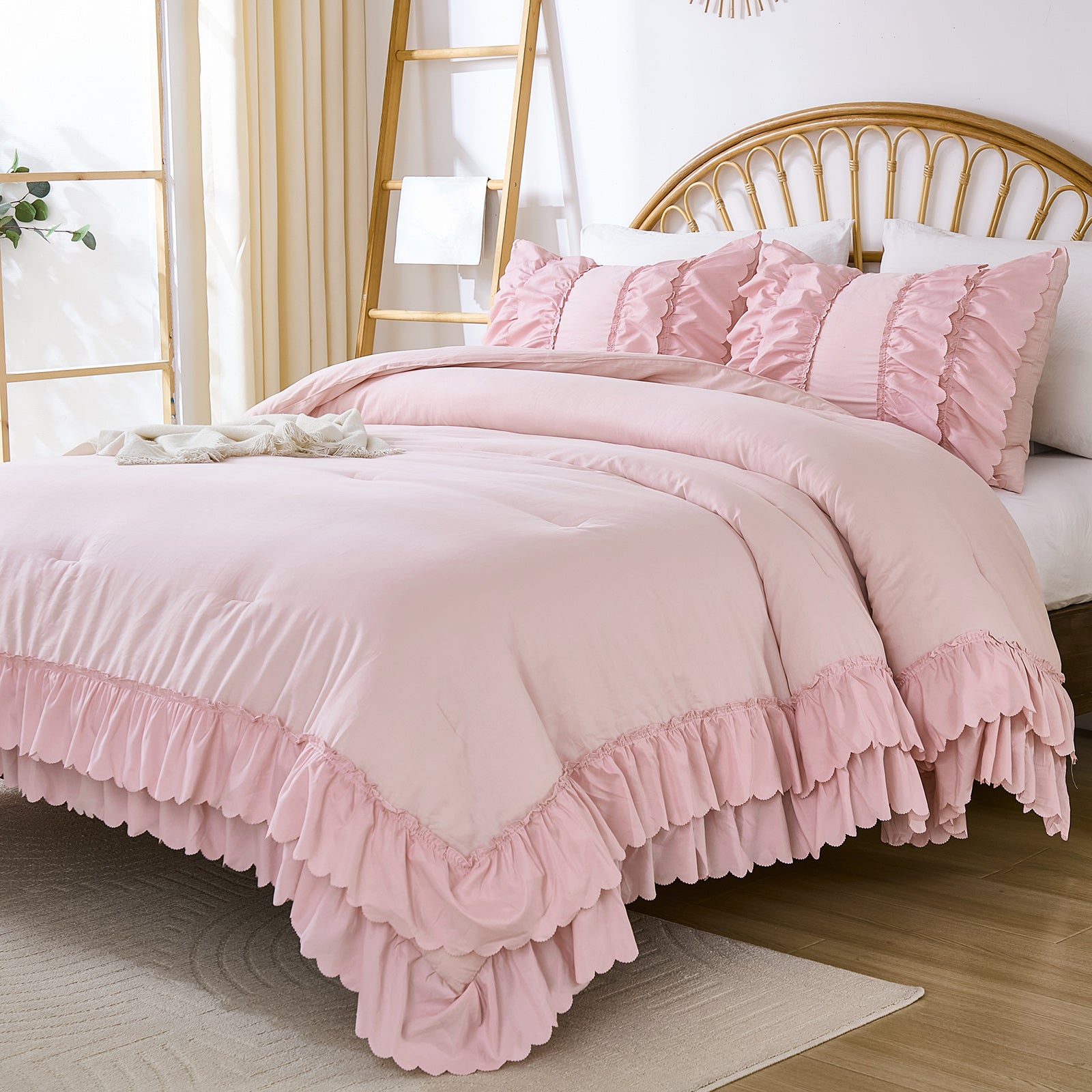 The comforter and matching pillow shams feature signature double layer ruffles that add elegant volume and French country romance. The timeless design pairs beautifully with farmhouse, cottagecore, bohemian, or modern minimalist bedrooms, making your bed the visual centerpiece of the room.