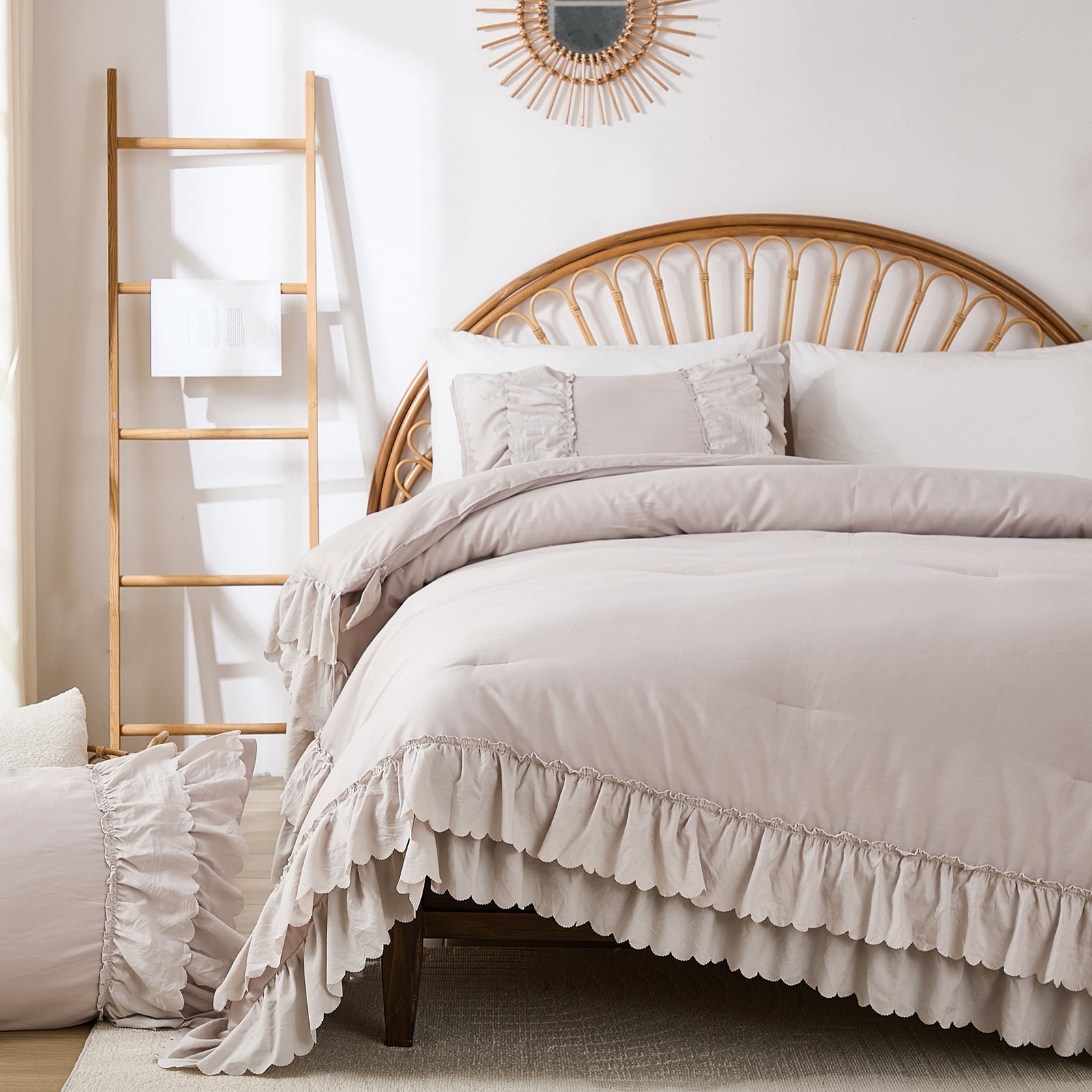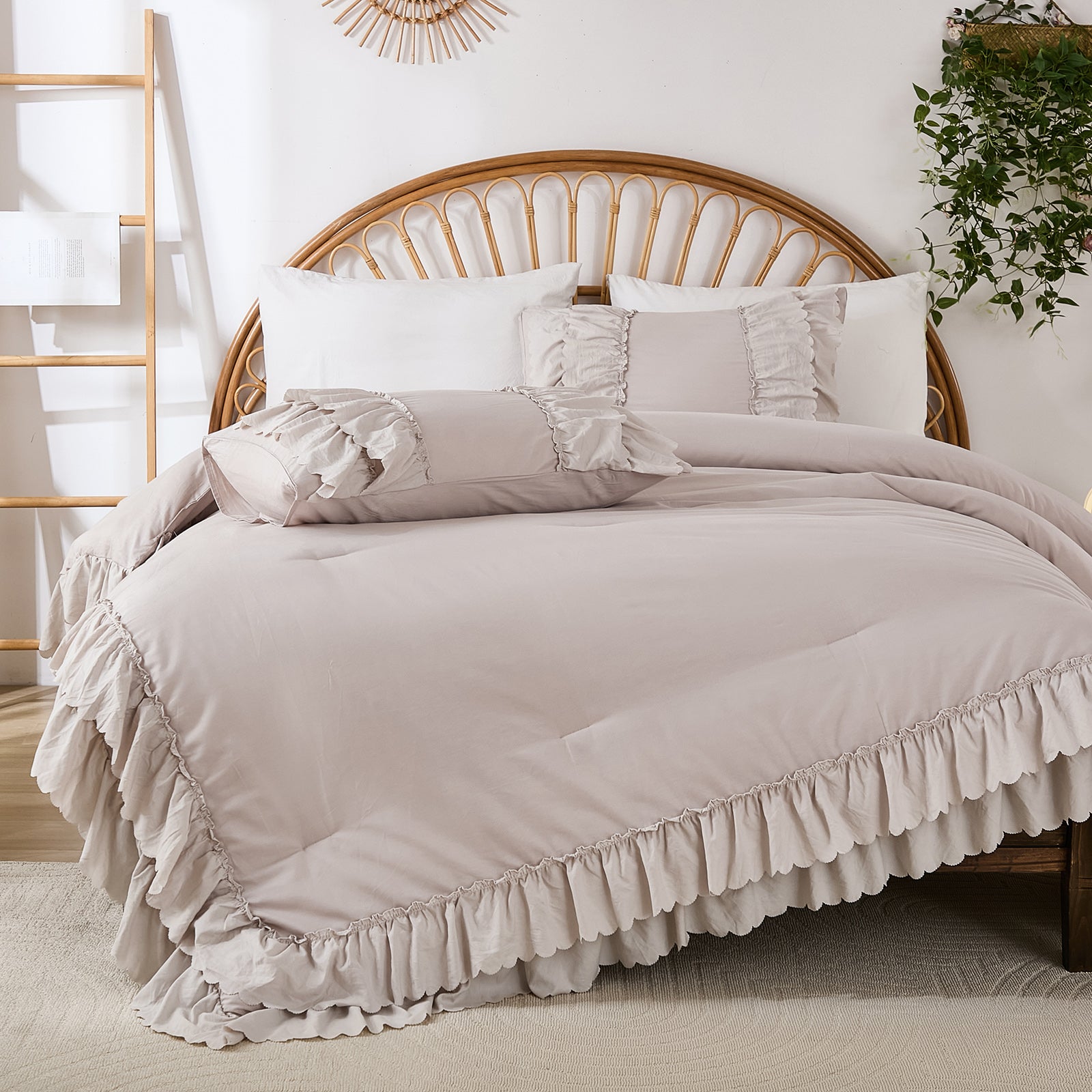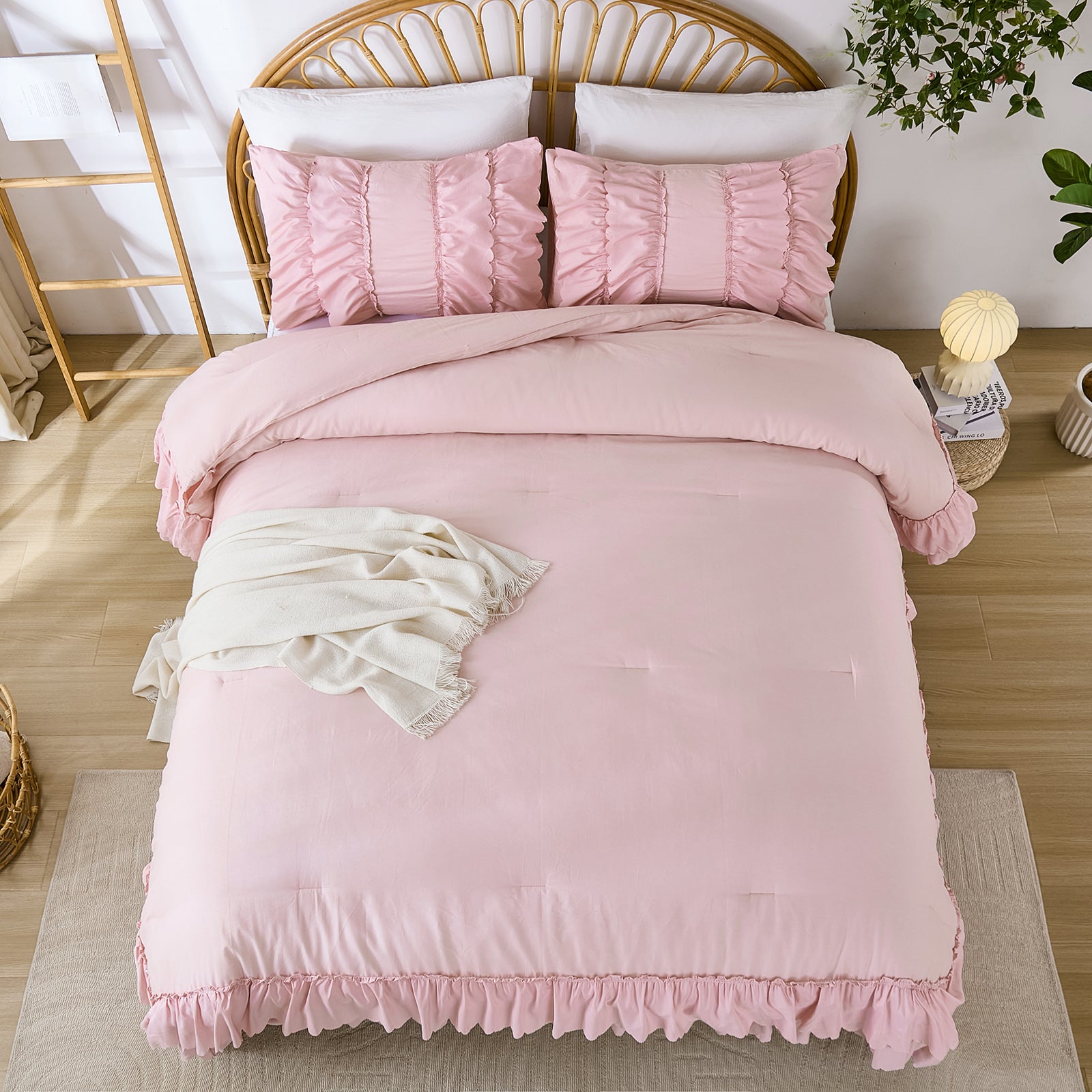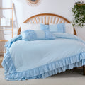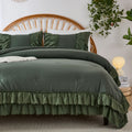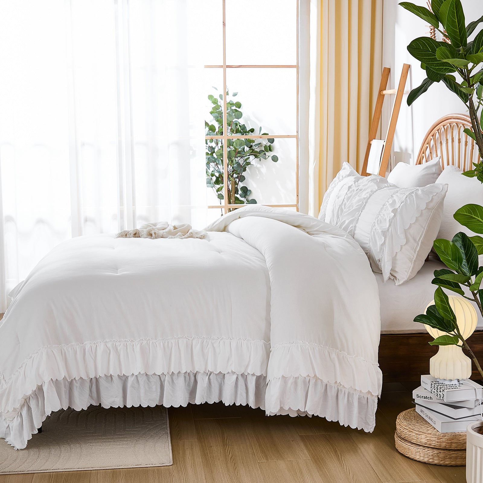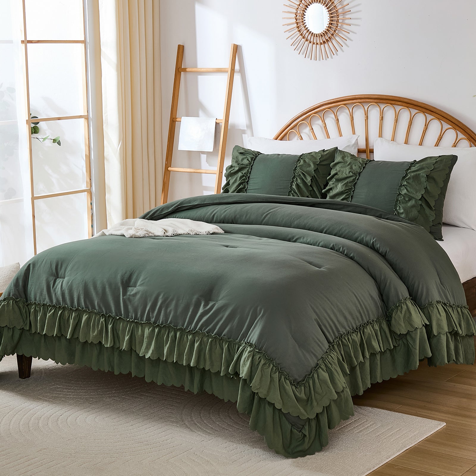 The comforter and matching pillow shams feature signature double layer ruffles that add elegant volume and French country romance. The timeless design pairs beautifully with farmhouse, cottagecore, bohemian, or modern minimalist bedrooms, making your bed the visual centerpiece of the room.