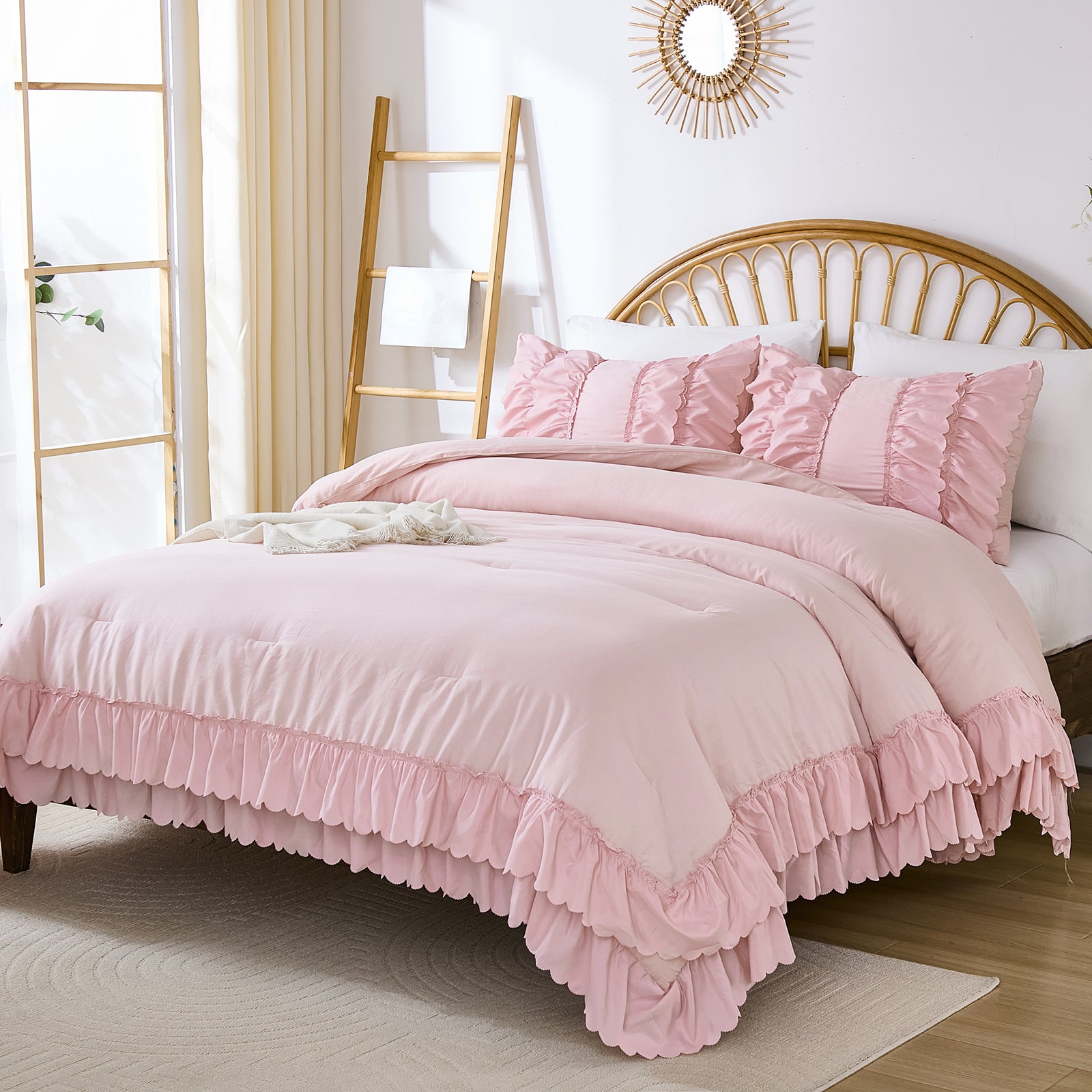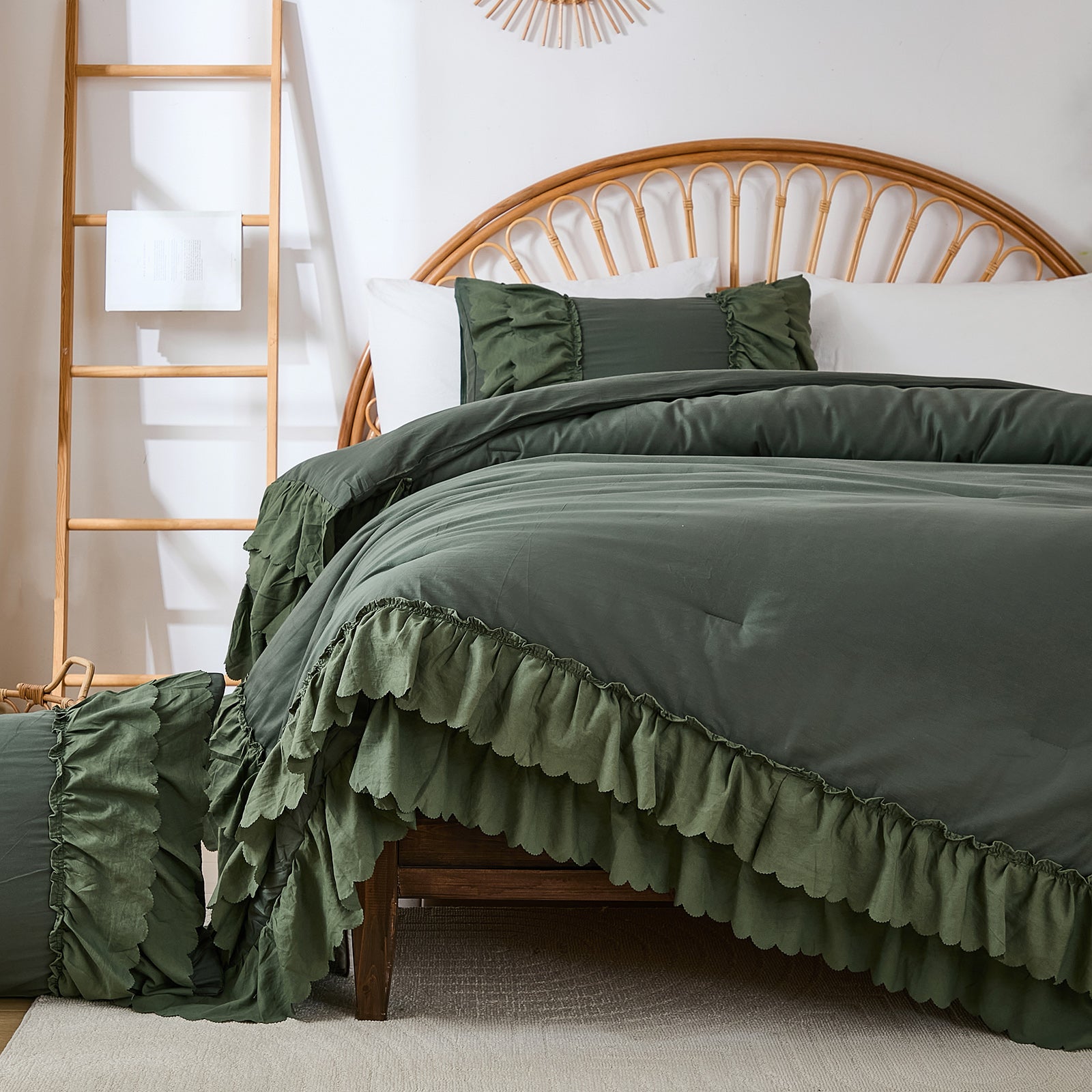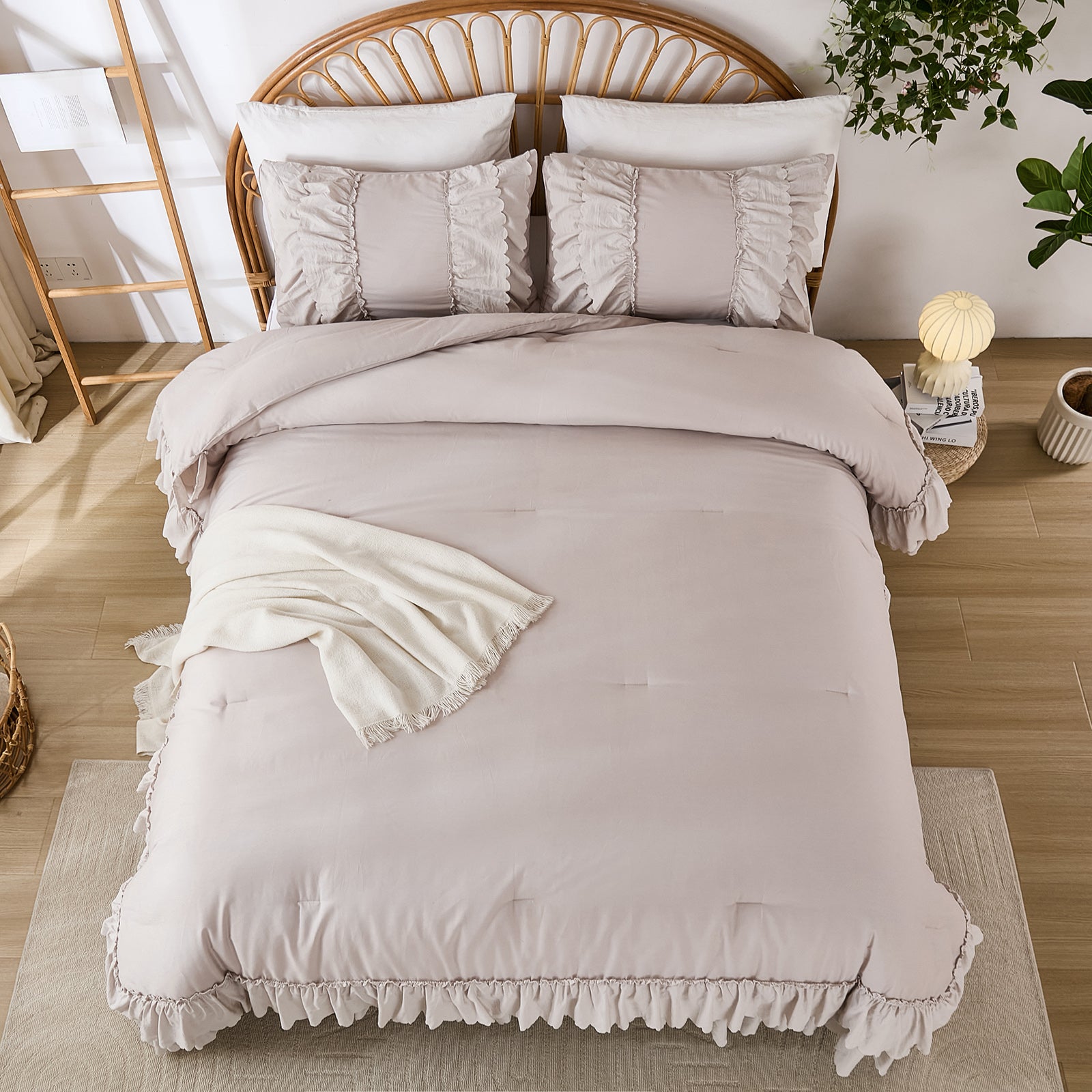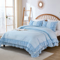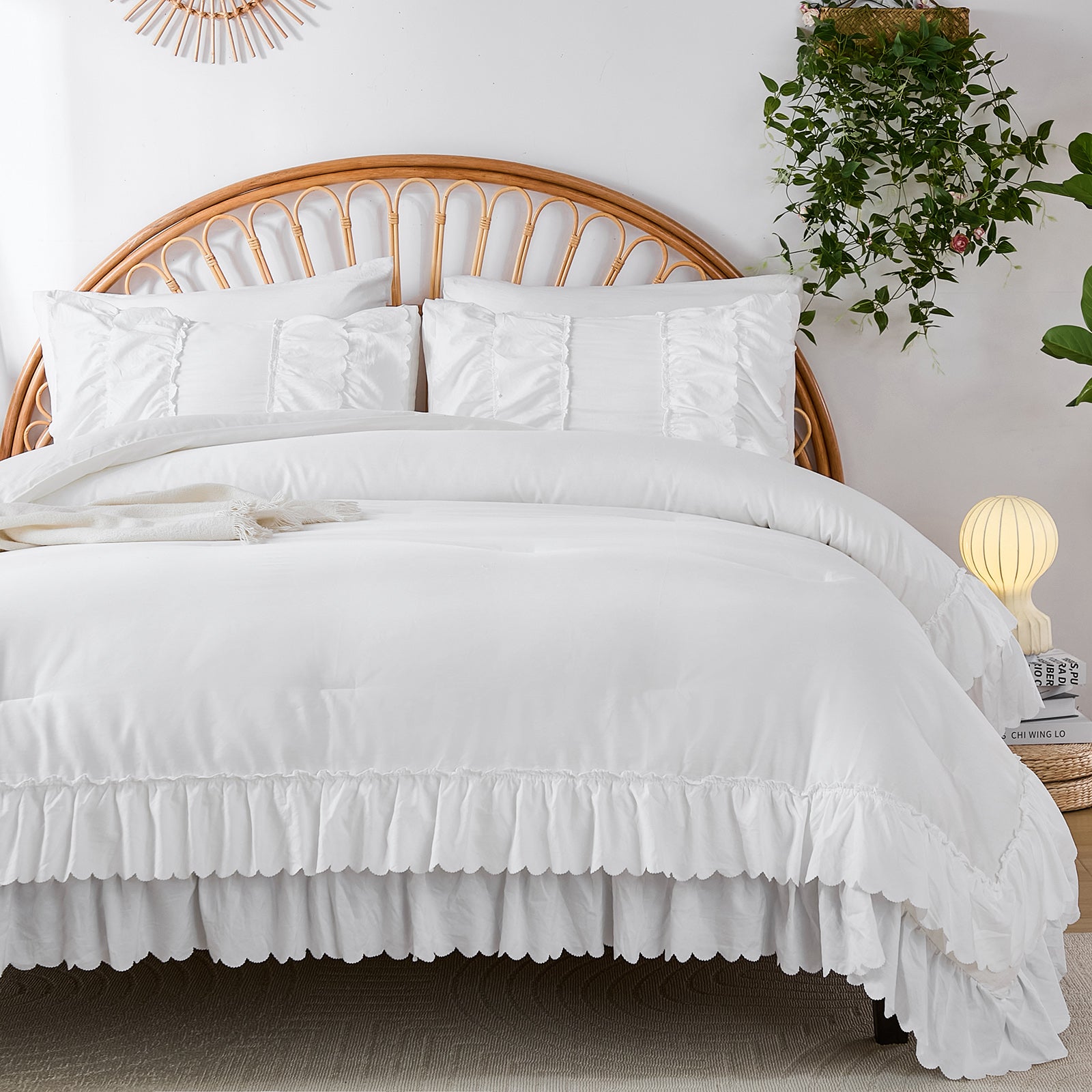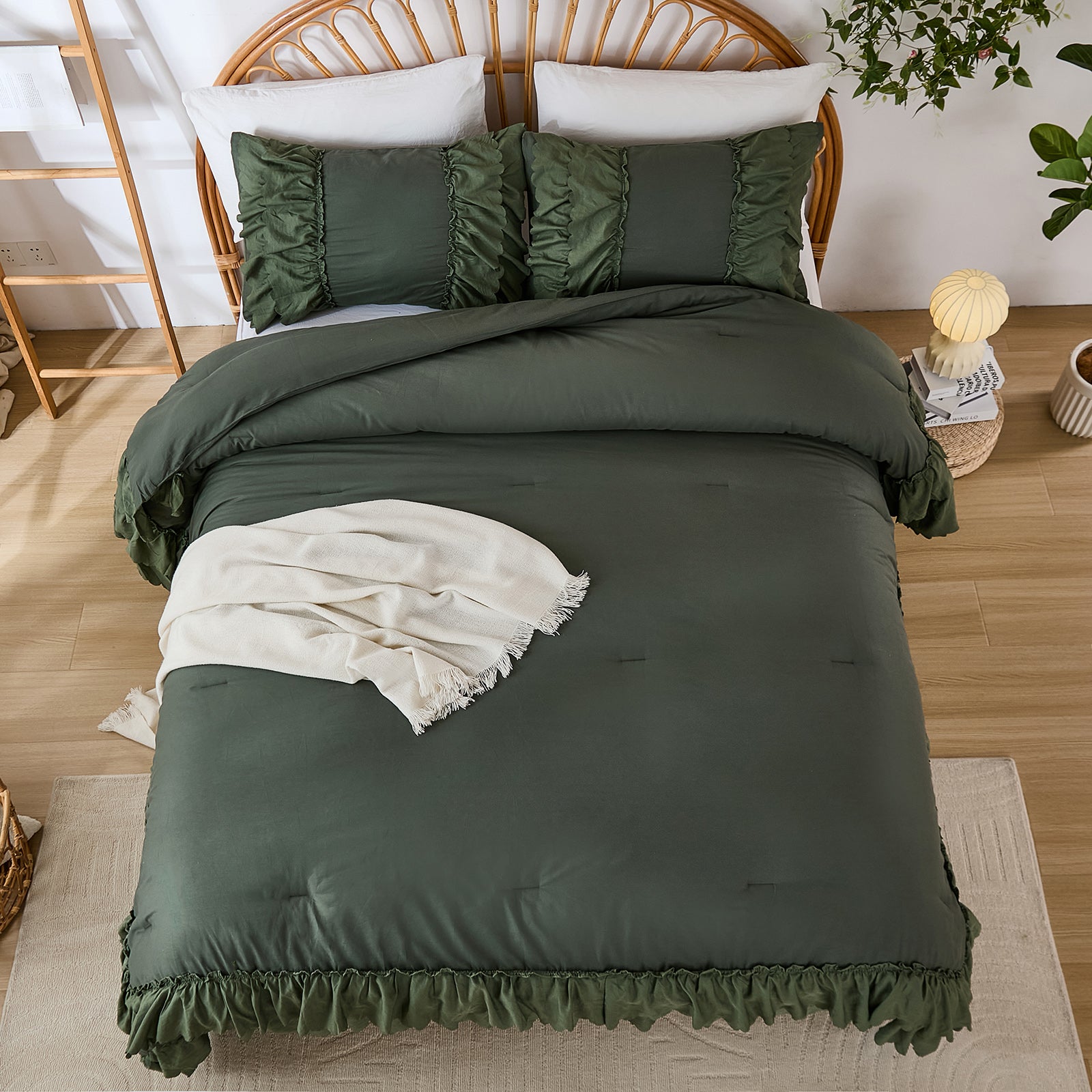 The comforter and matching pillow shams feature signature double layer ruffles that add elegant volume and French country romance. The timeless design pairs beautifully with farmhouse, cottagecore, bohemian, or modern minimalist bedrooms, making your bed the visual centerpiece of the room.