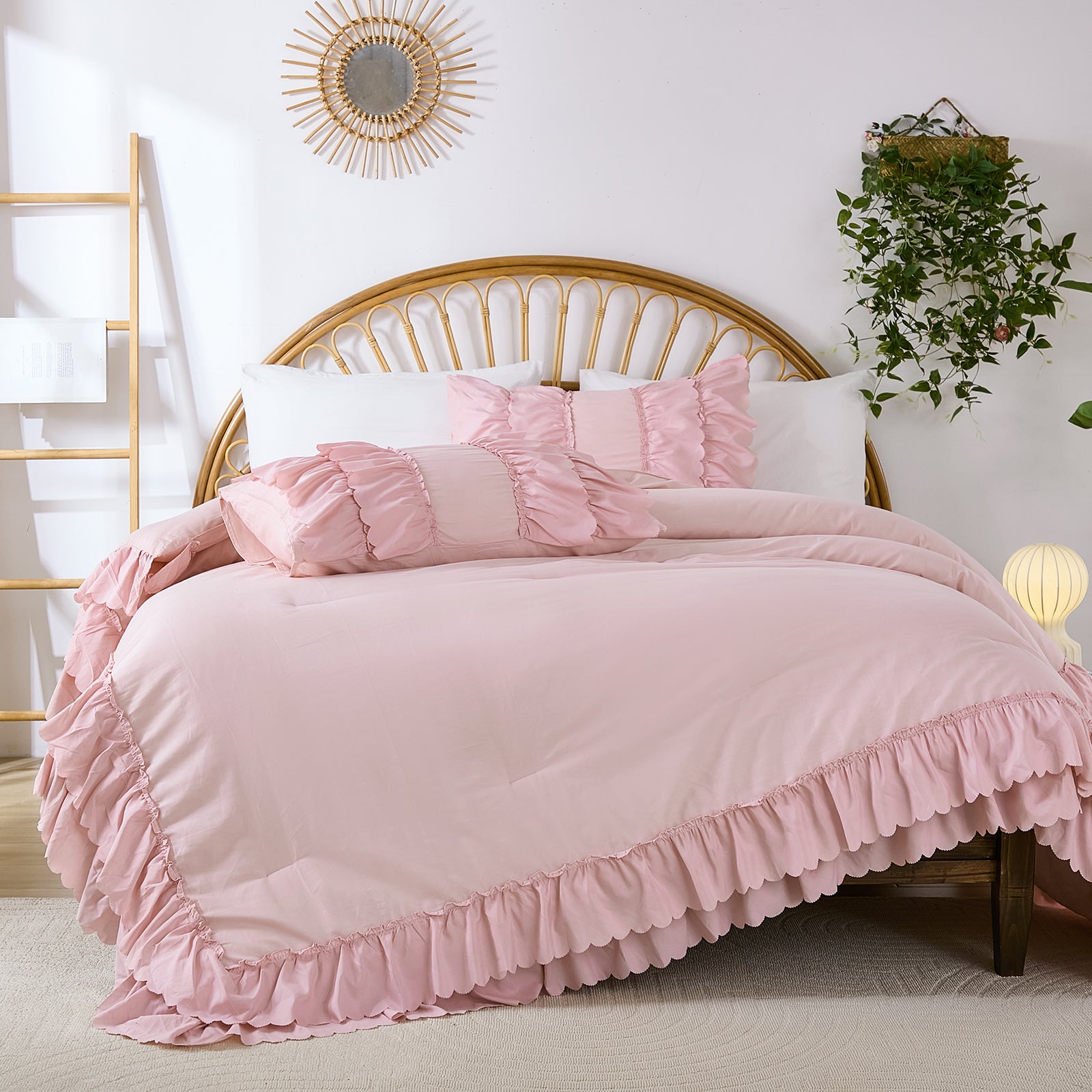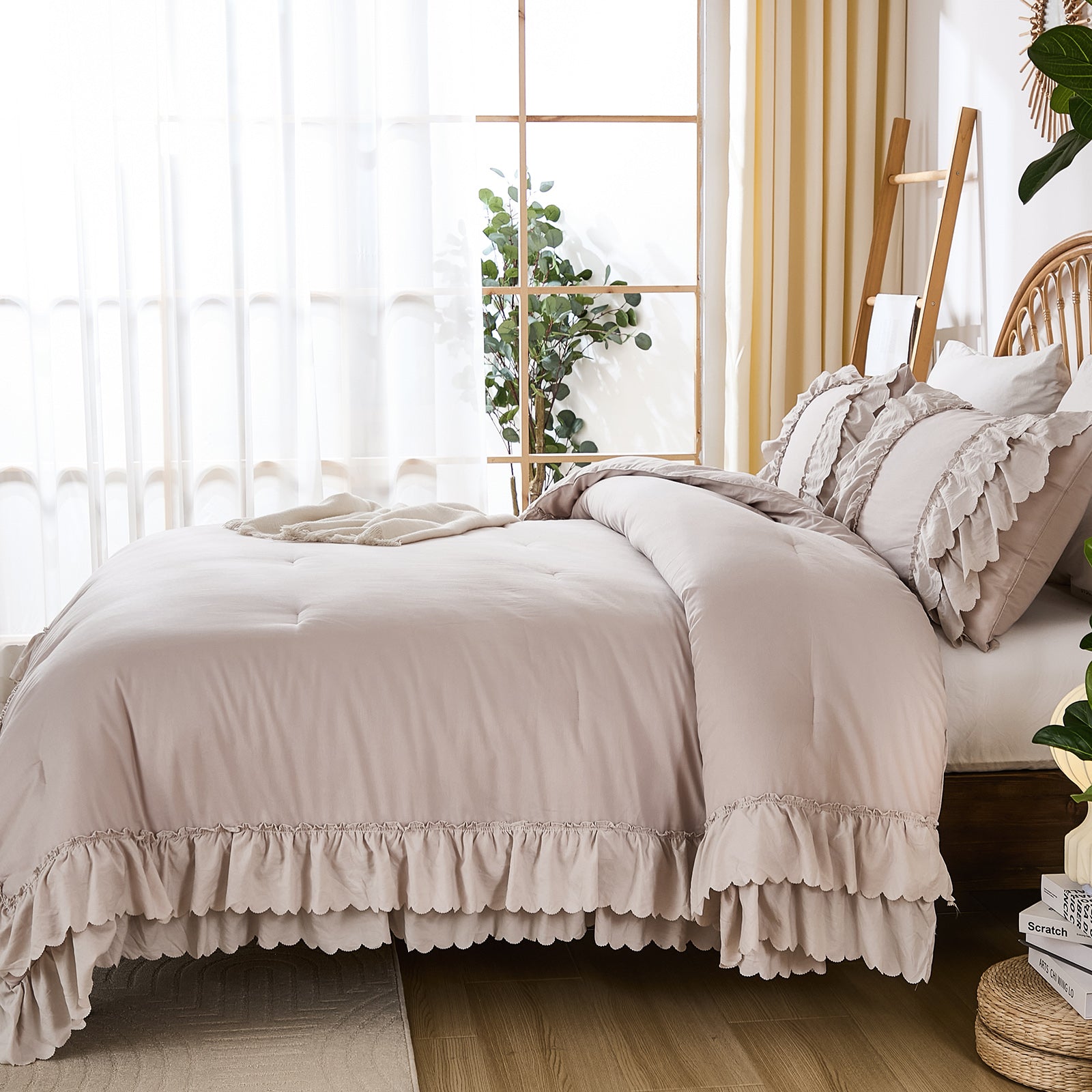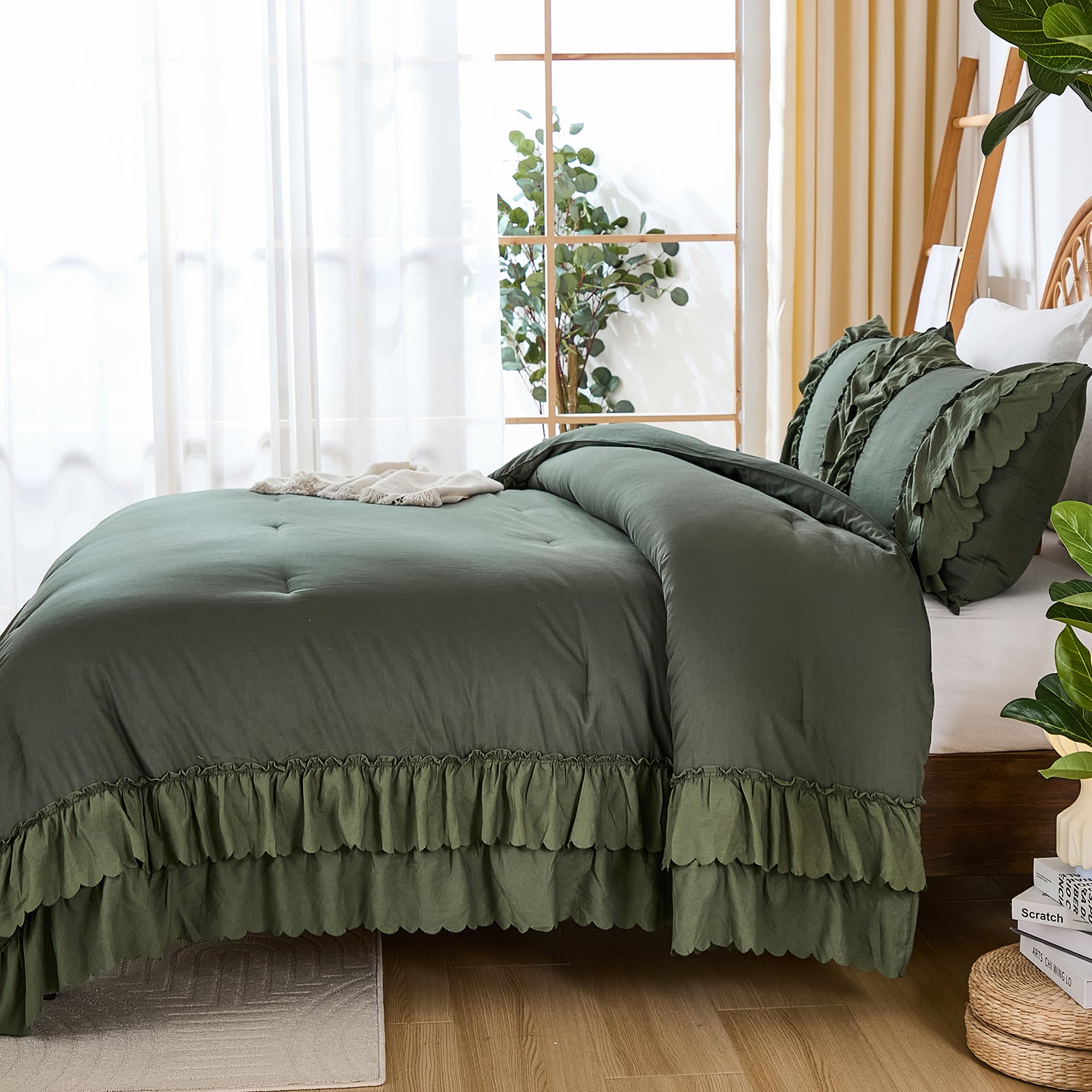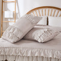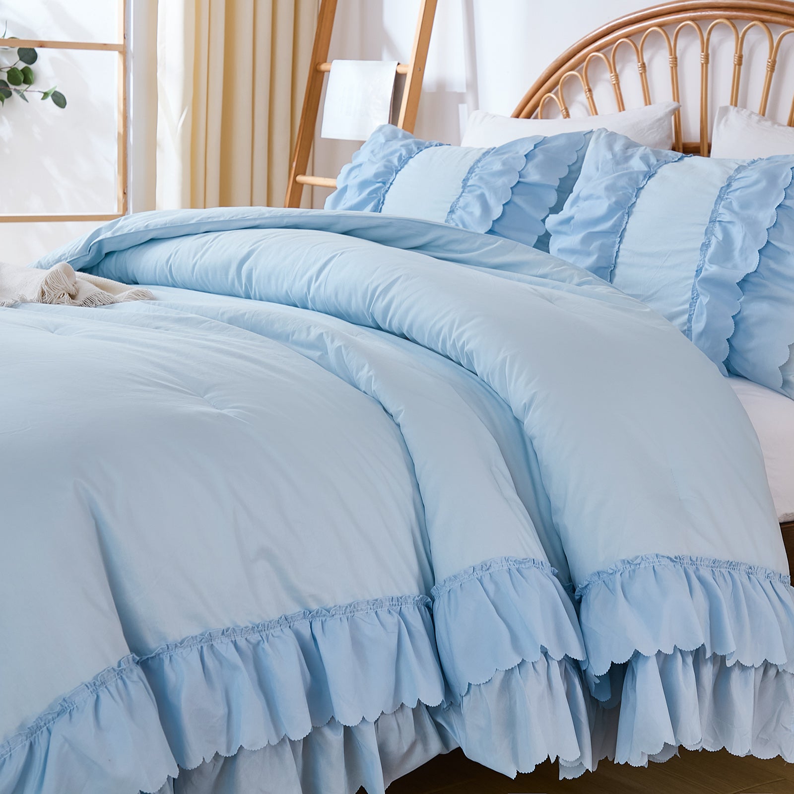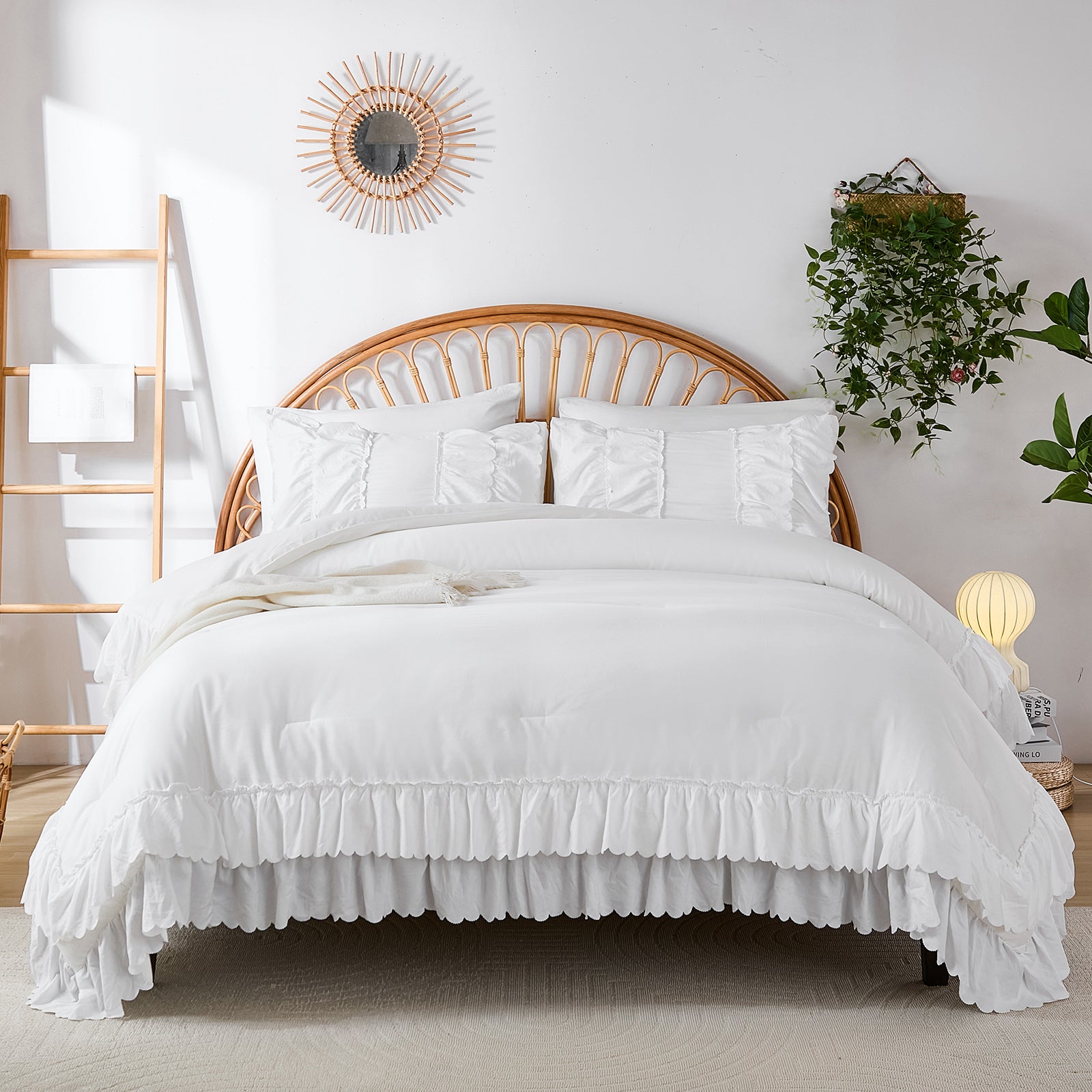 The comforter and matching pillow shams feature signature double layer ruffles that add elegant volume and French country romance. The timeless design pairs beautifully with farmhouse, cottagecore, bohemian, or modern minimalist bedrooms, making your bed the visual centerpiece of the room.