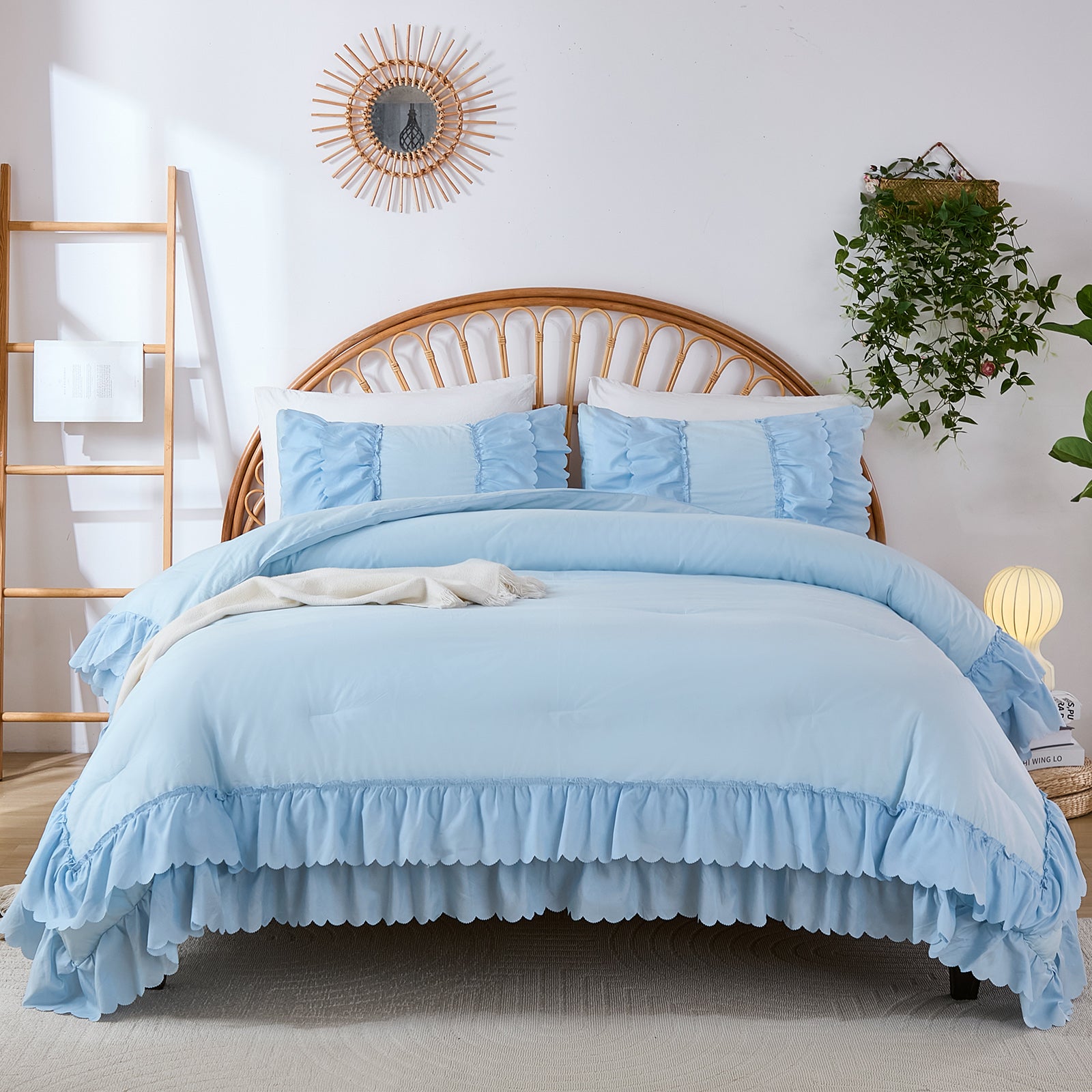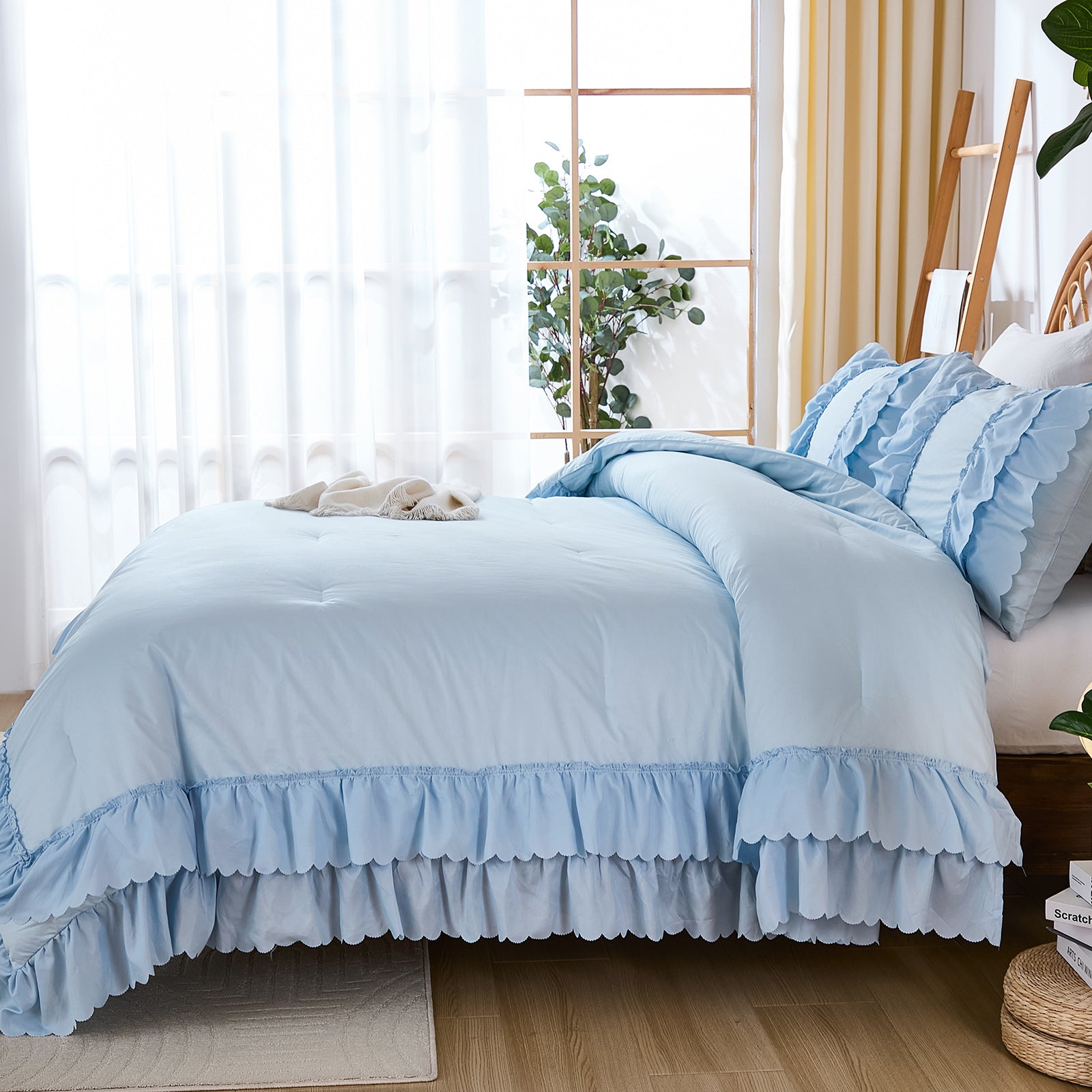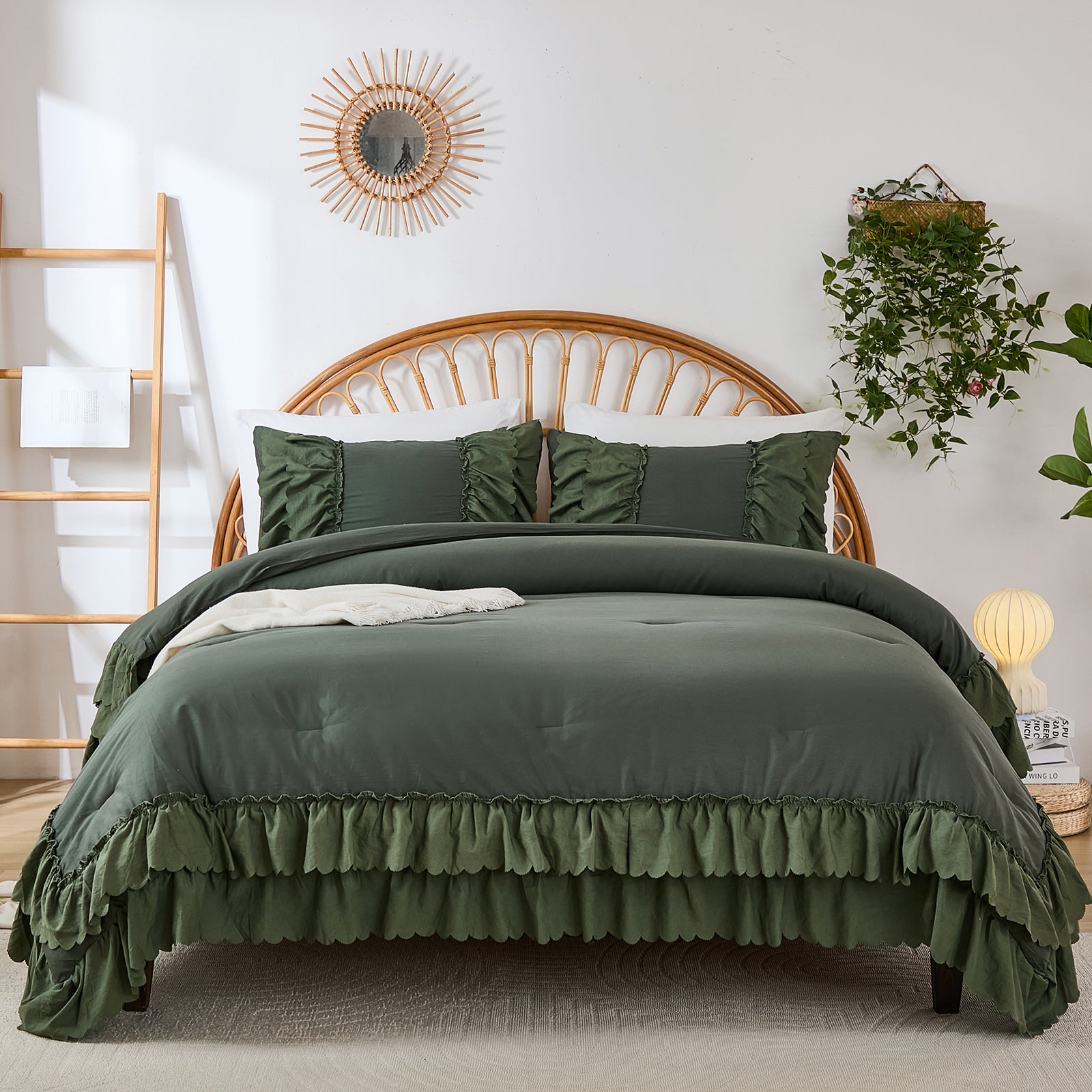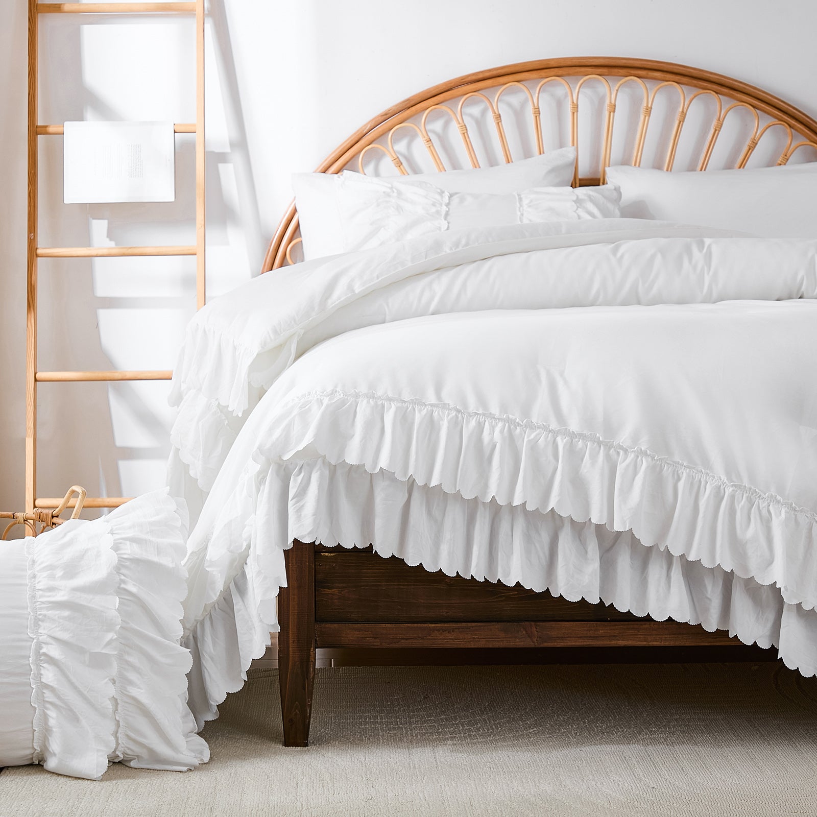 The comforter and matching pillow shams feature signature double layer ruffles that add elegant volume and French country romance. The timeless design pairs beautifully with farmhouse, cottagecore, bohemian, or modern minimalist bedrooms, making your bed the visual centerpiece of the room.
