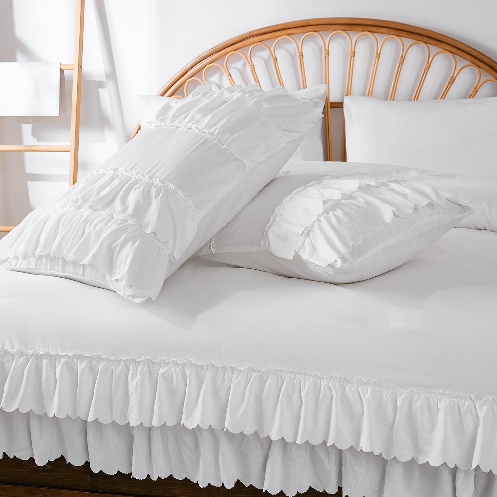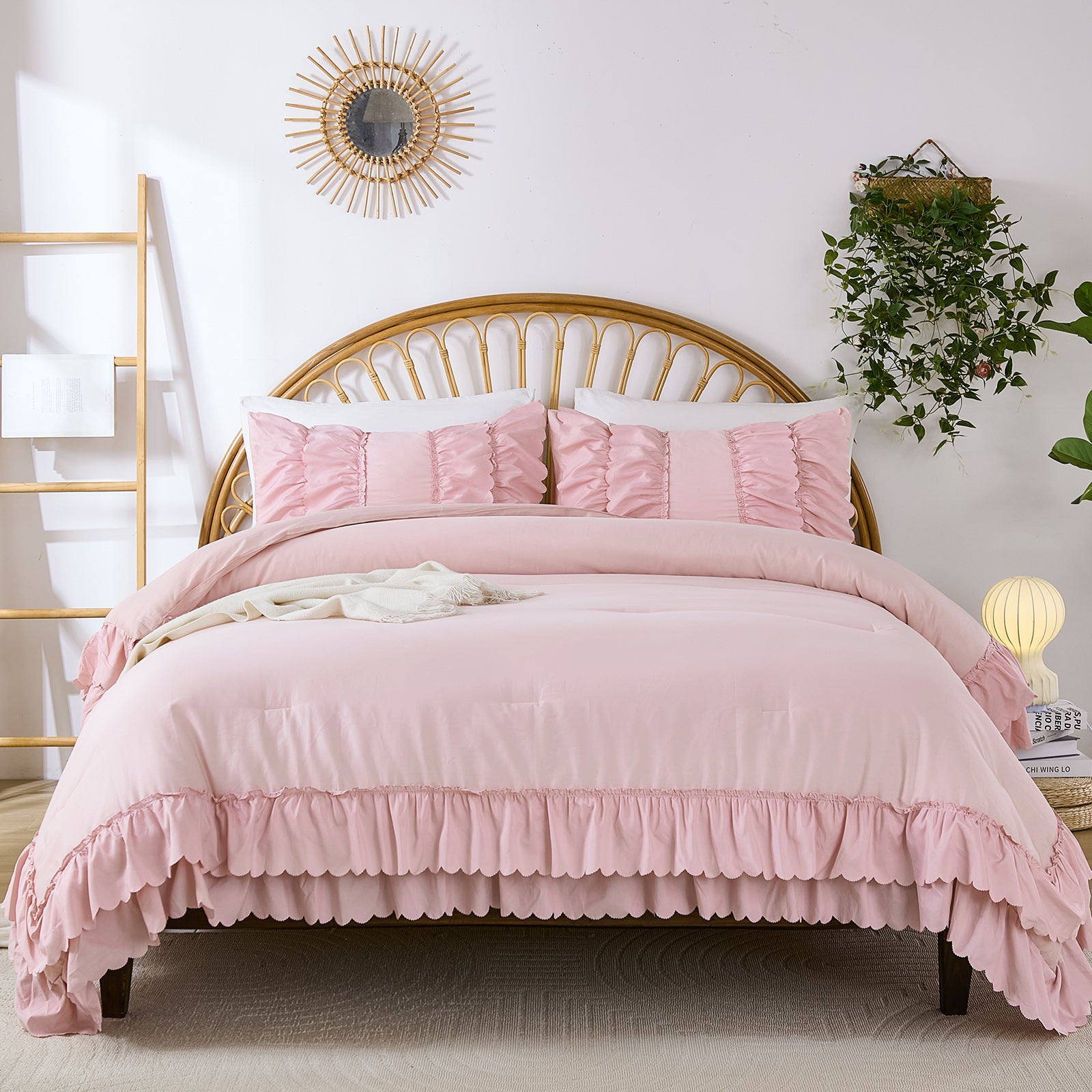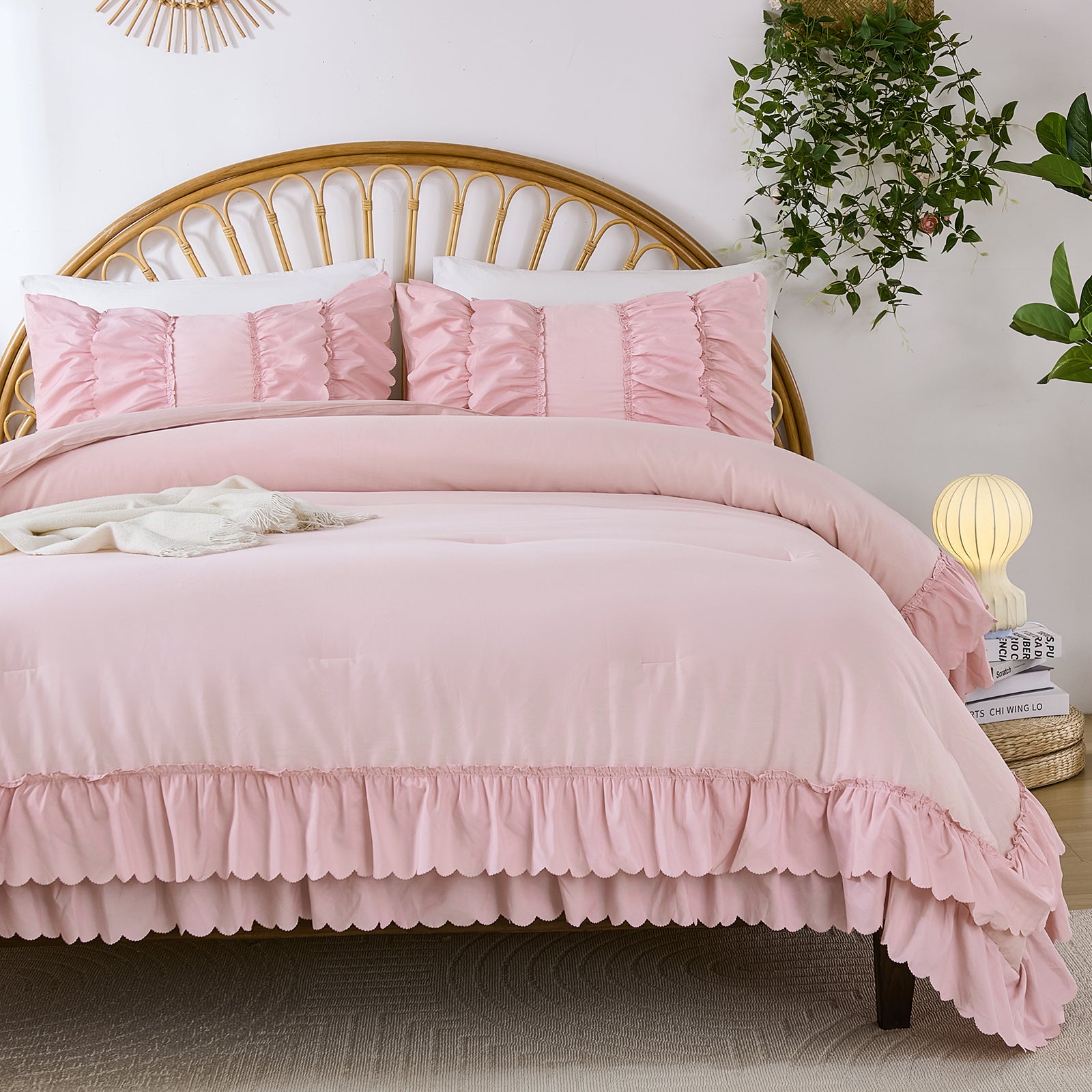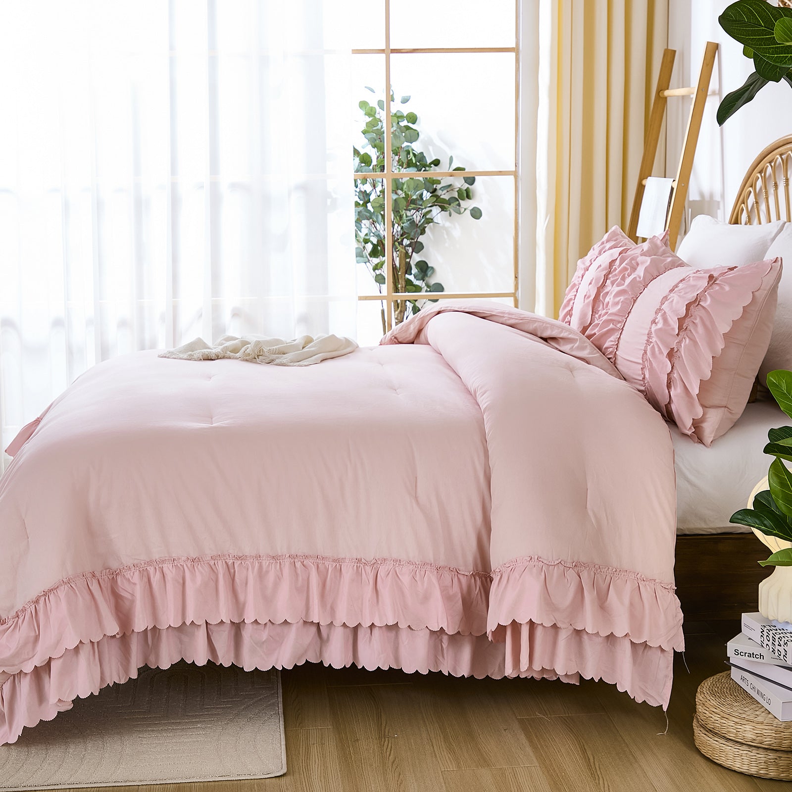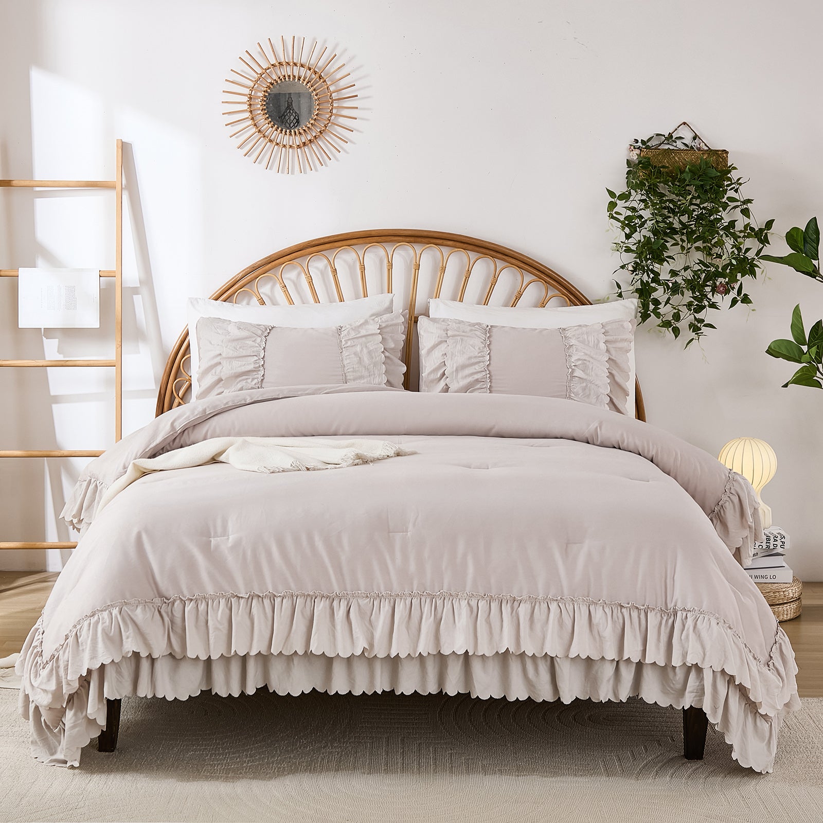 The comforter and matching pillow shams feature signature double layer ruffles that add elegant volume and French country romance. The timeless design pairs beautifully with farmhouse, cottagecore, bohemian, or modern minimalist bedrooms, making your bed the visual centerpiece of the room.