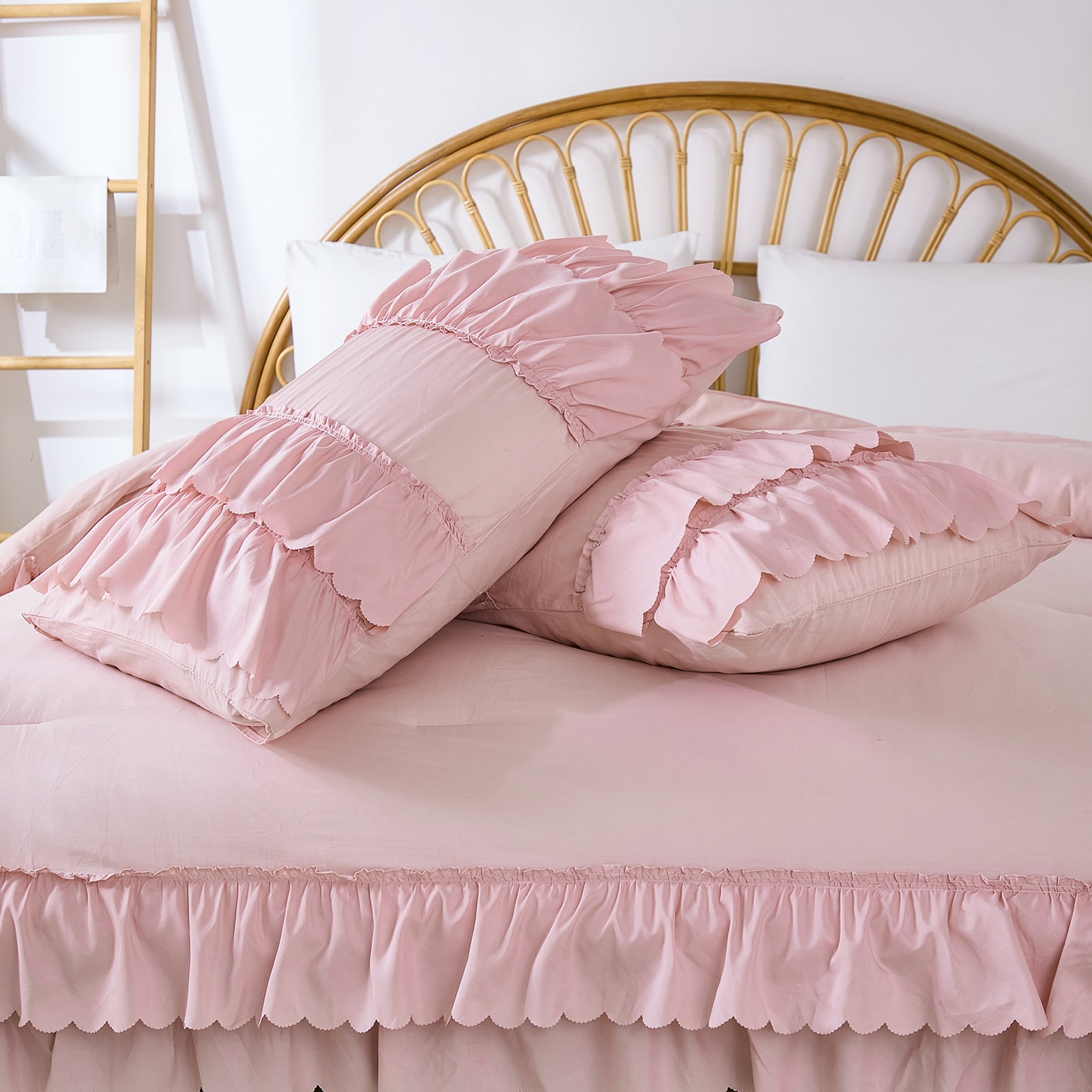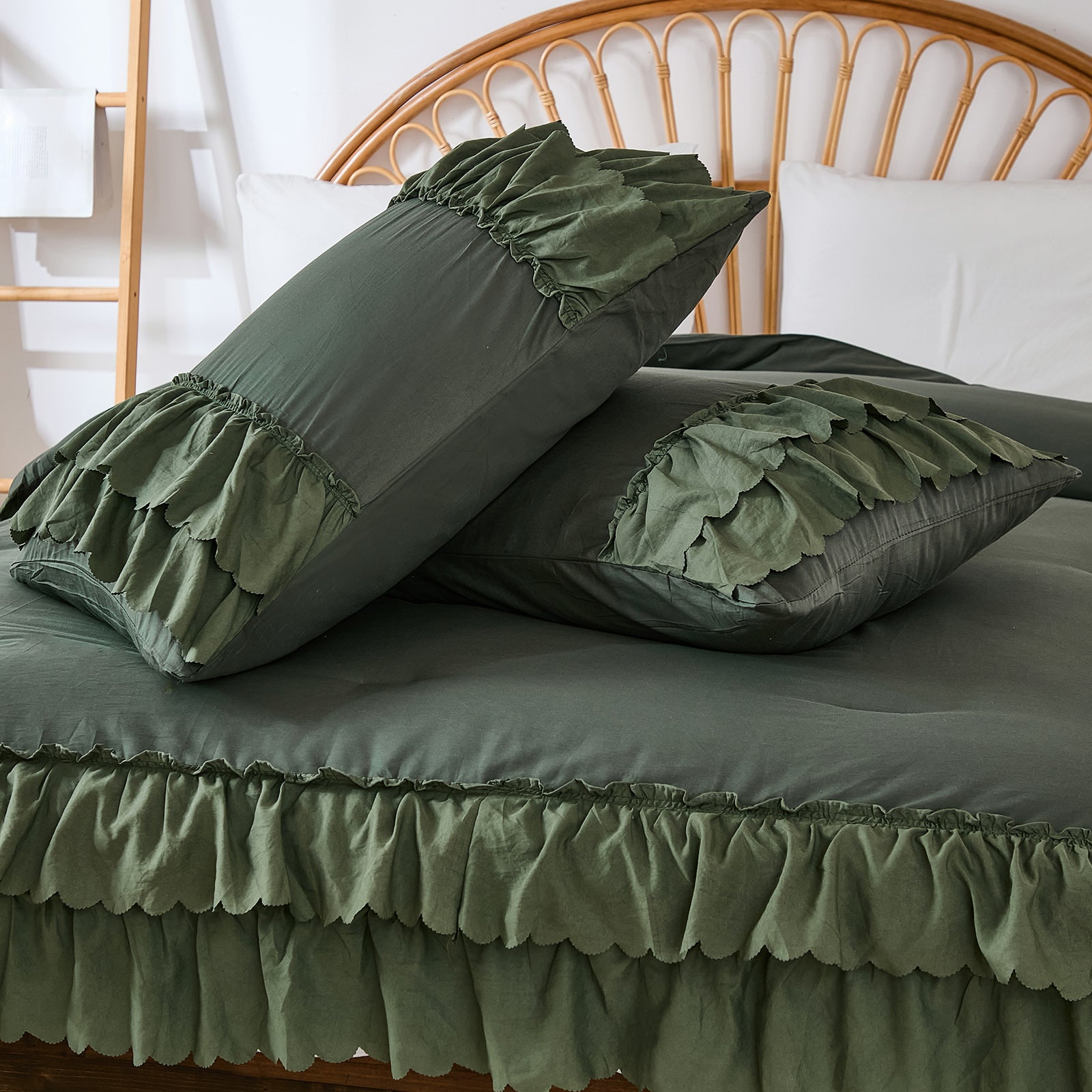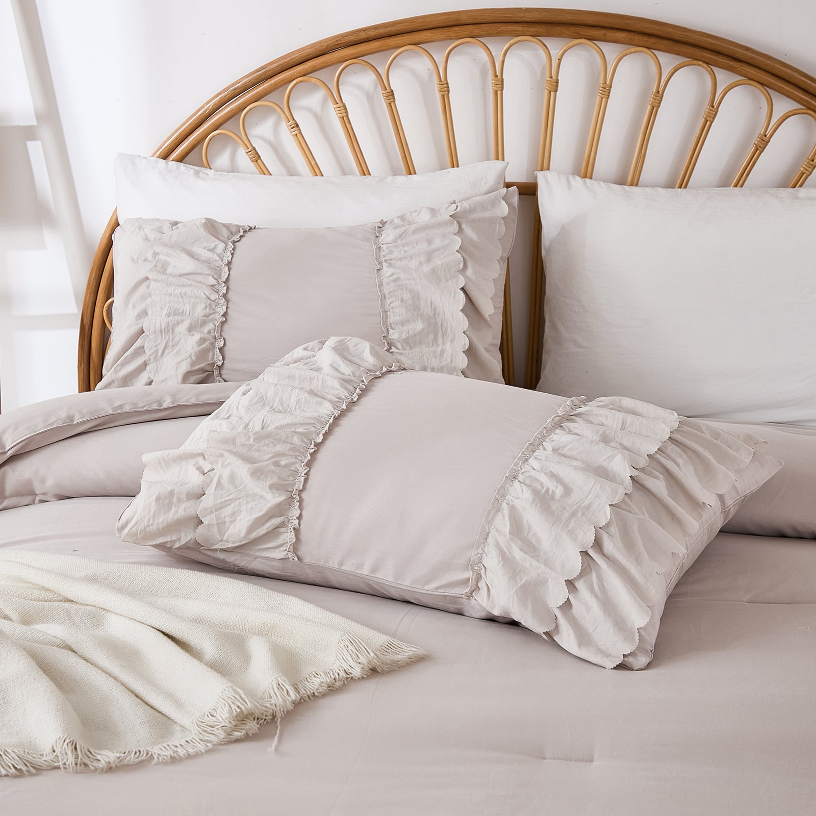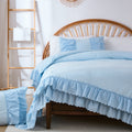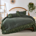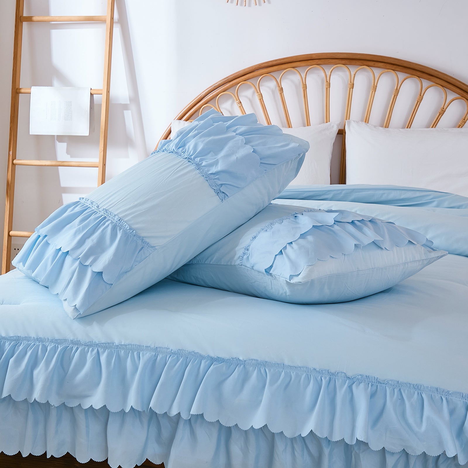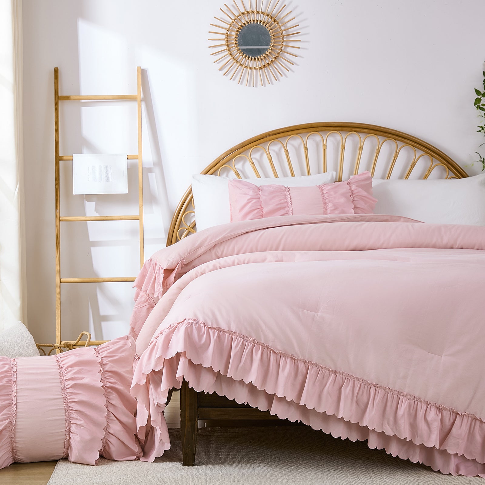 The comforter and matching pillow shams feature signature double layer ruffles that add elegant volume and French country romance. The timeless design pairs beautifully with farmhouse, cottagecore, bohemian, or modern minimalist bedrooms, making your bed the visual centerpiece of the room.