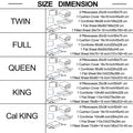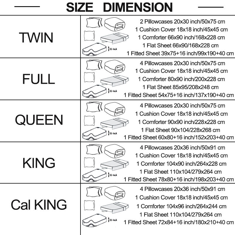 Packet: 8 Pieces California King Size marble bed in a bag including 1 Comforter 104 in x 96 in, 4 Pillow cases 20 in x 36 in, 1 Flat Sheet 110 in wide x 104 in length, 1 Fitted Sheet 78 in wide x 80 in length, 1 Cushion Cover: 18 in x 18 in.The fitted sheet is 16 inches pocket, fits mattresses up to 16 inches