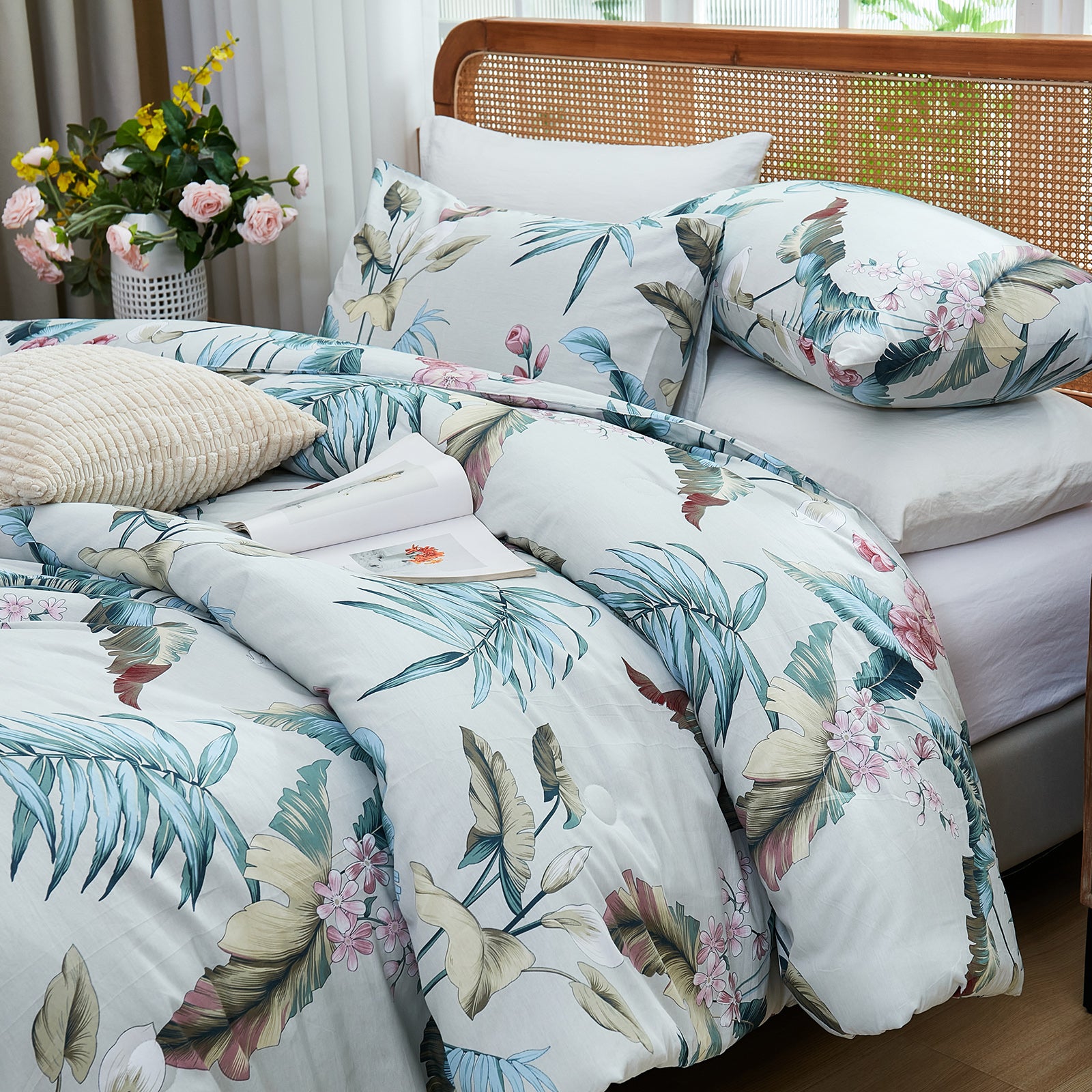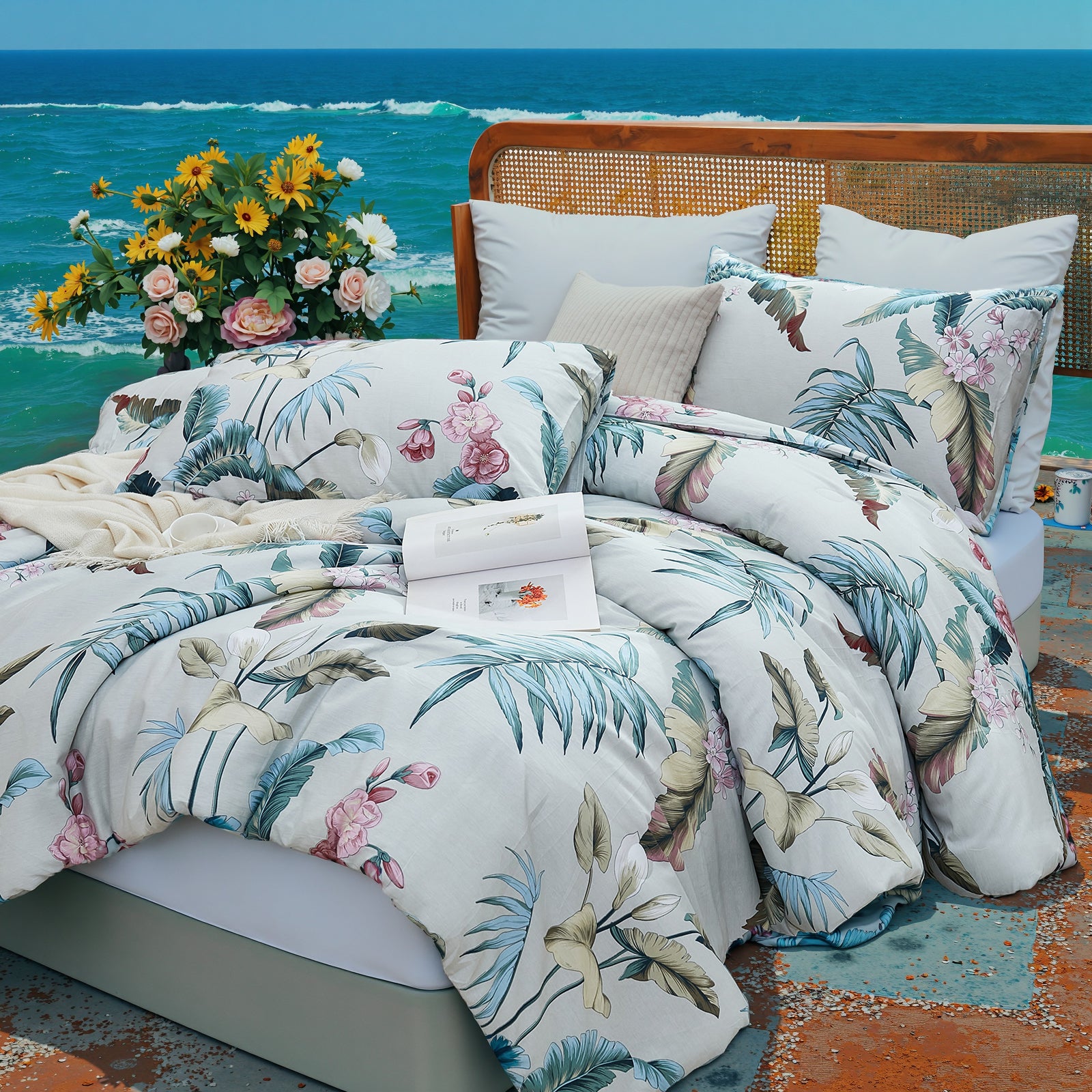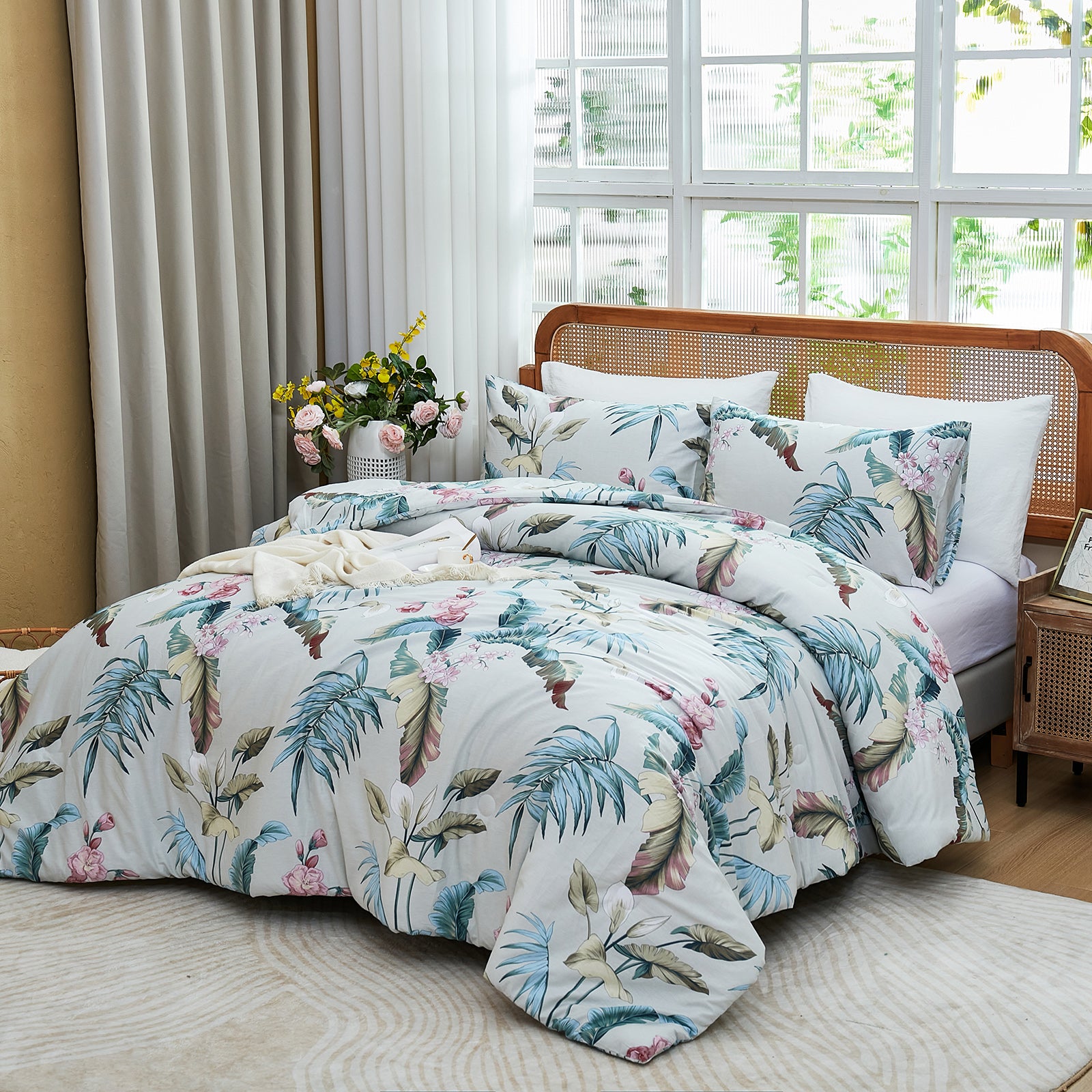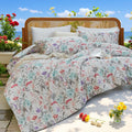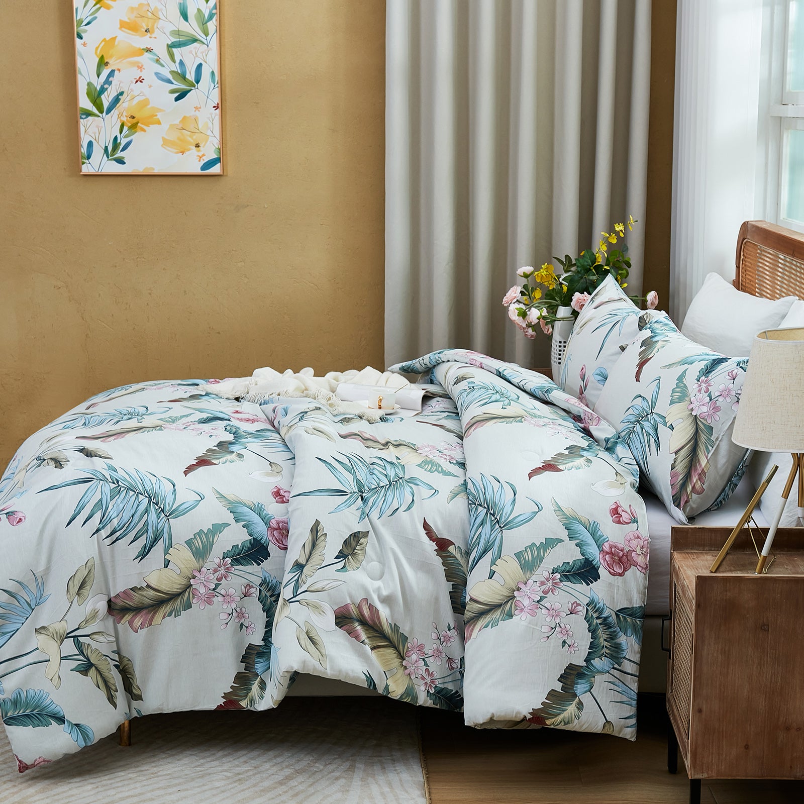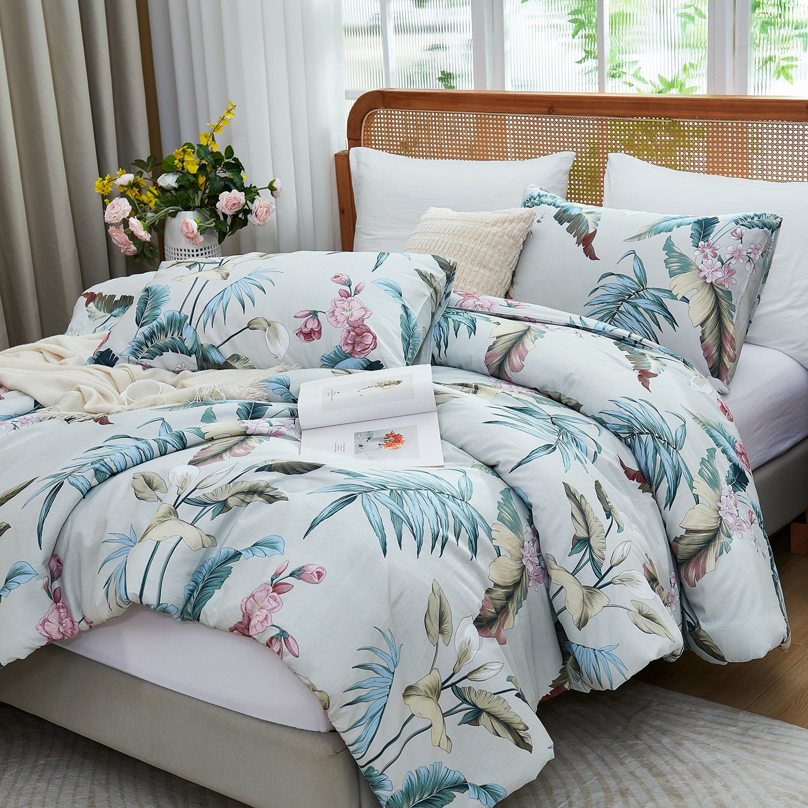 Floral Cotton Comforter Set – 100% Cotton Bedding with Elegant Botanical Print, Soft Lightweight All Season Quilt, King/Queen
