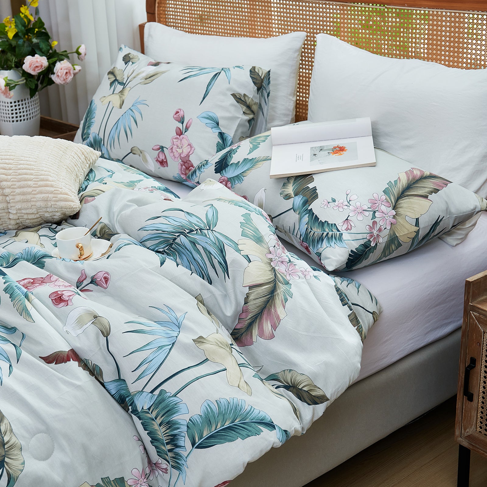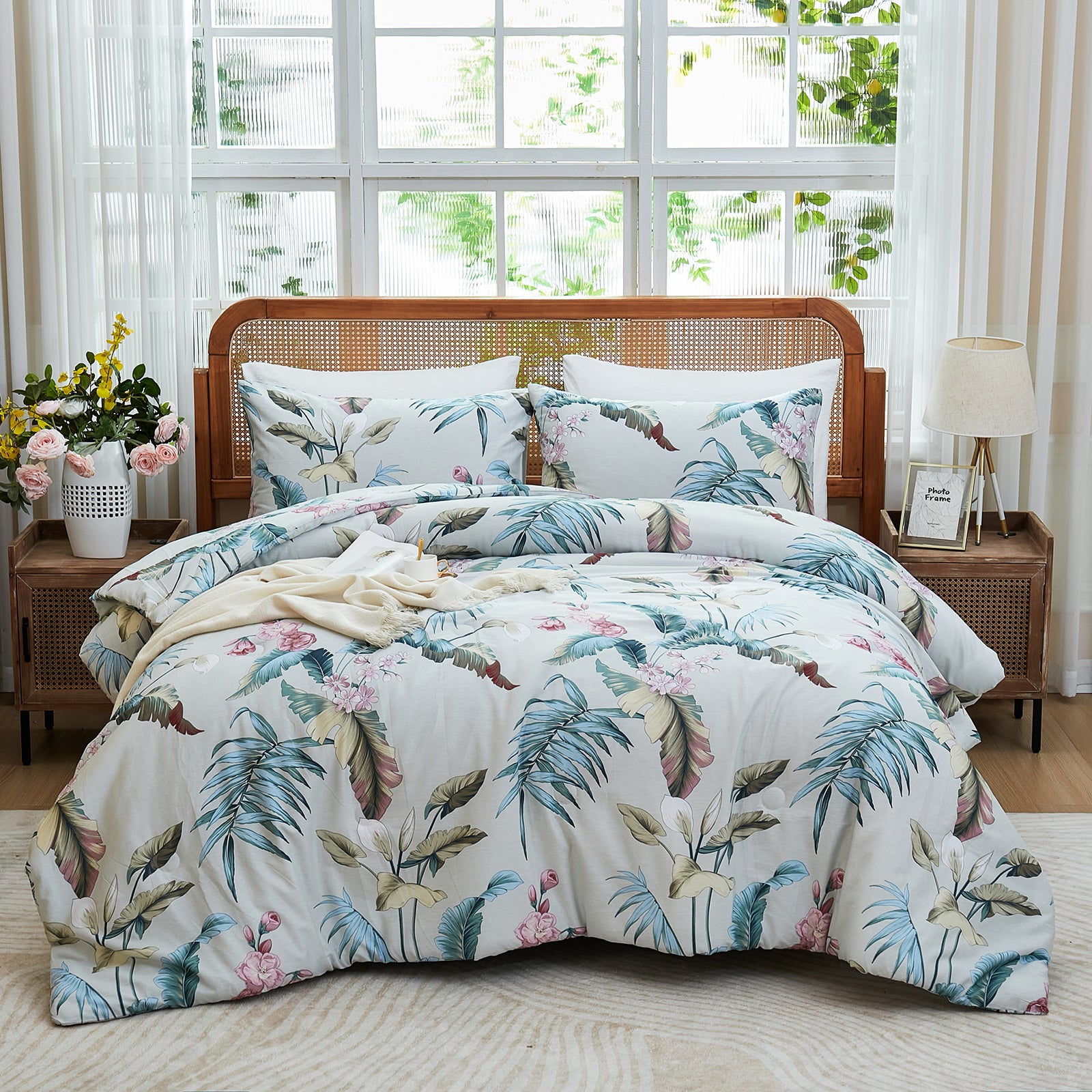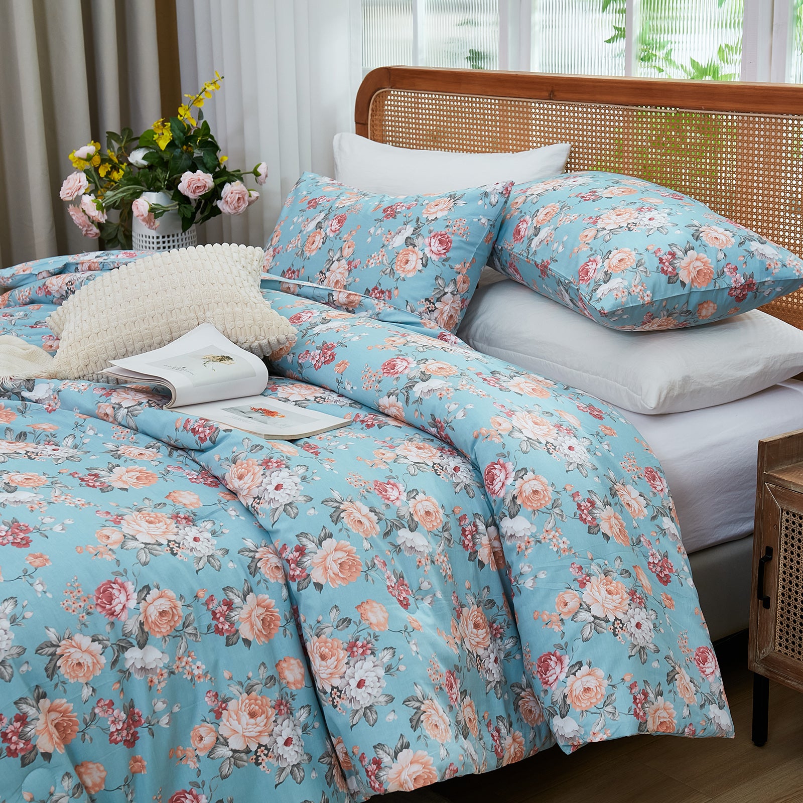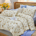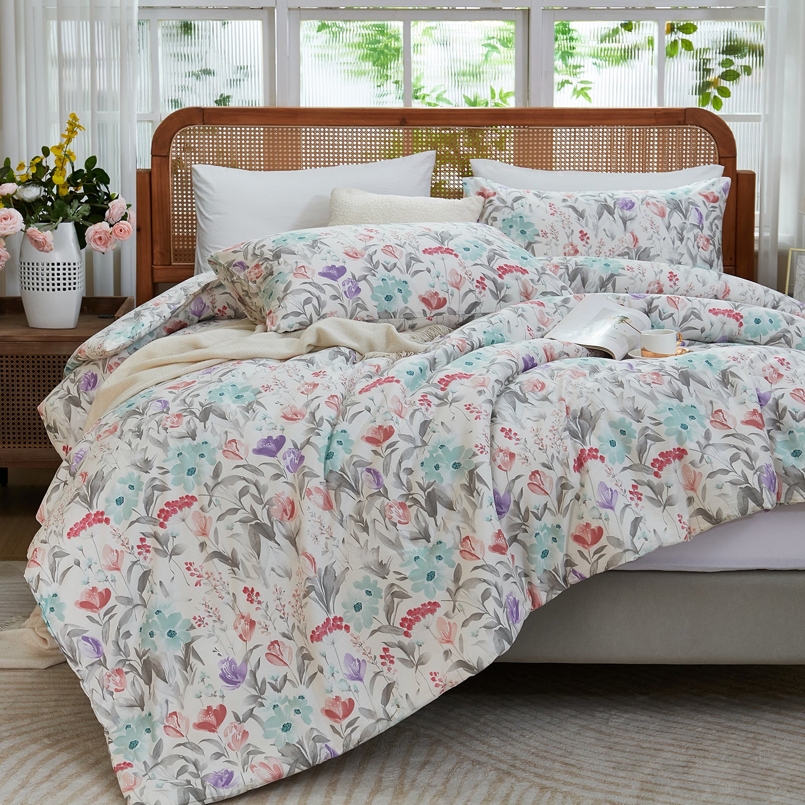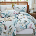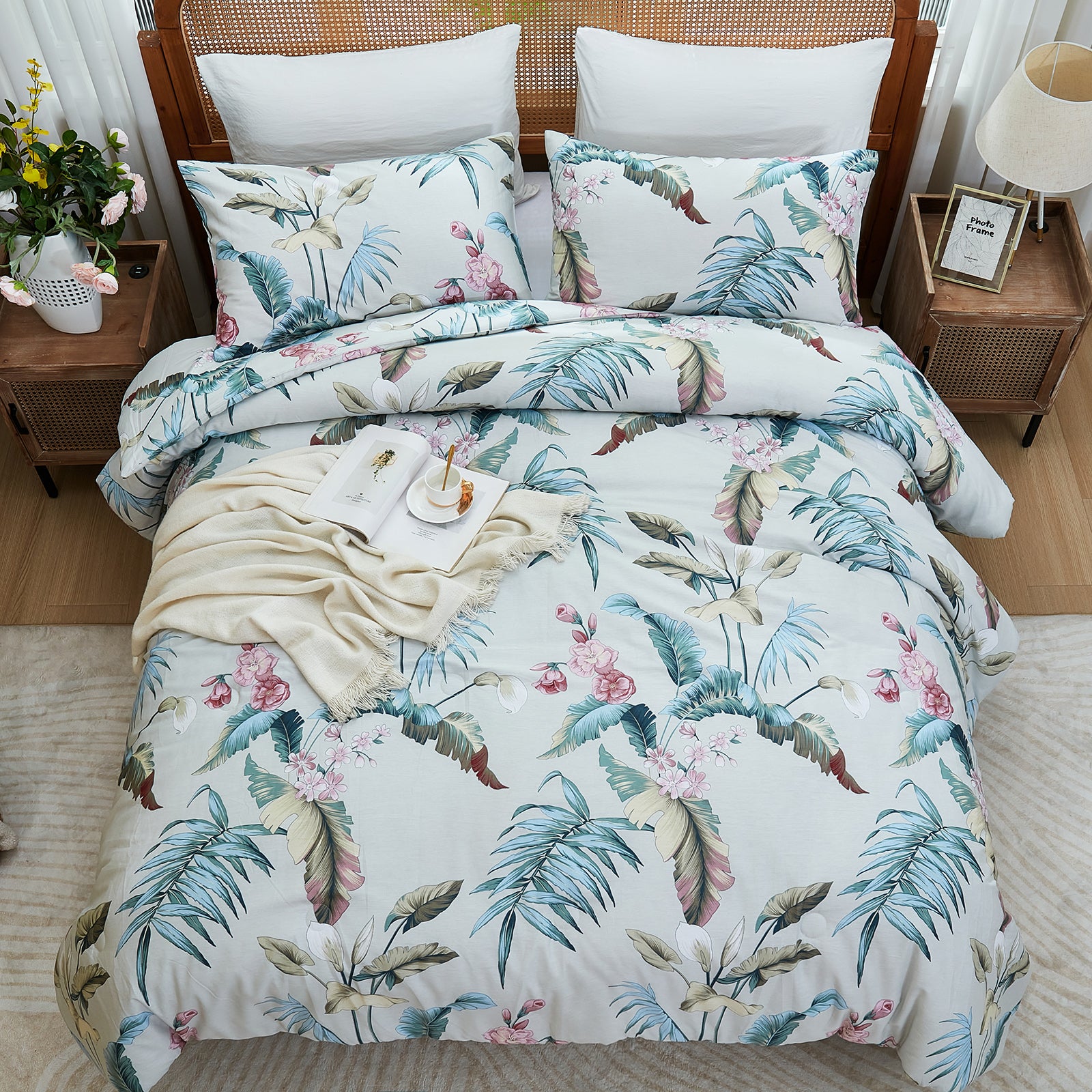 Floral Cotton Comforter Set – 100% Cotton Bedding with Elegant Botanical Print, Soft Lightweight All Season Quilt, King/Queen