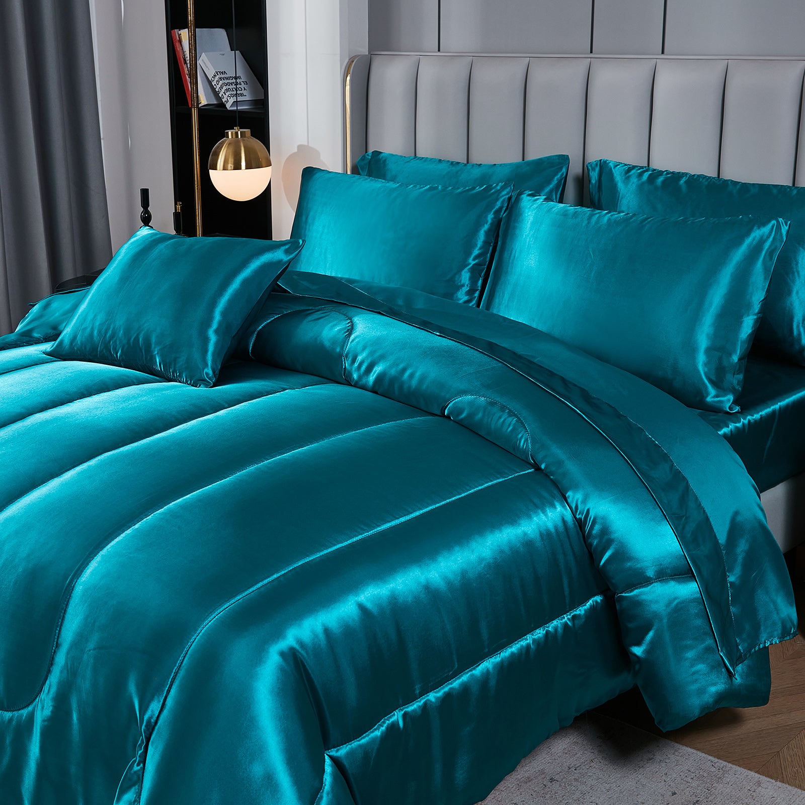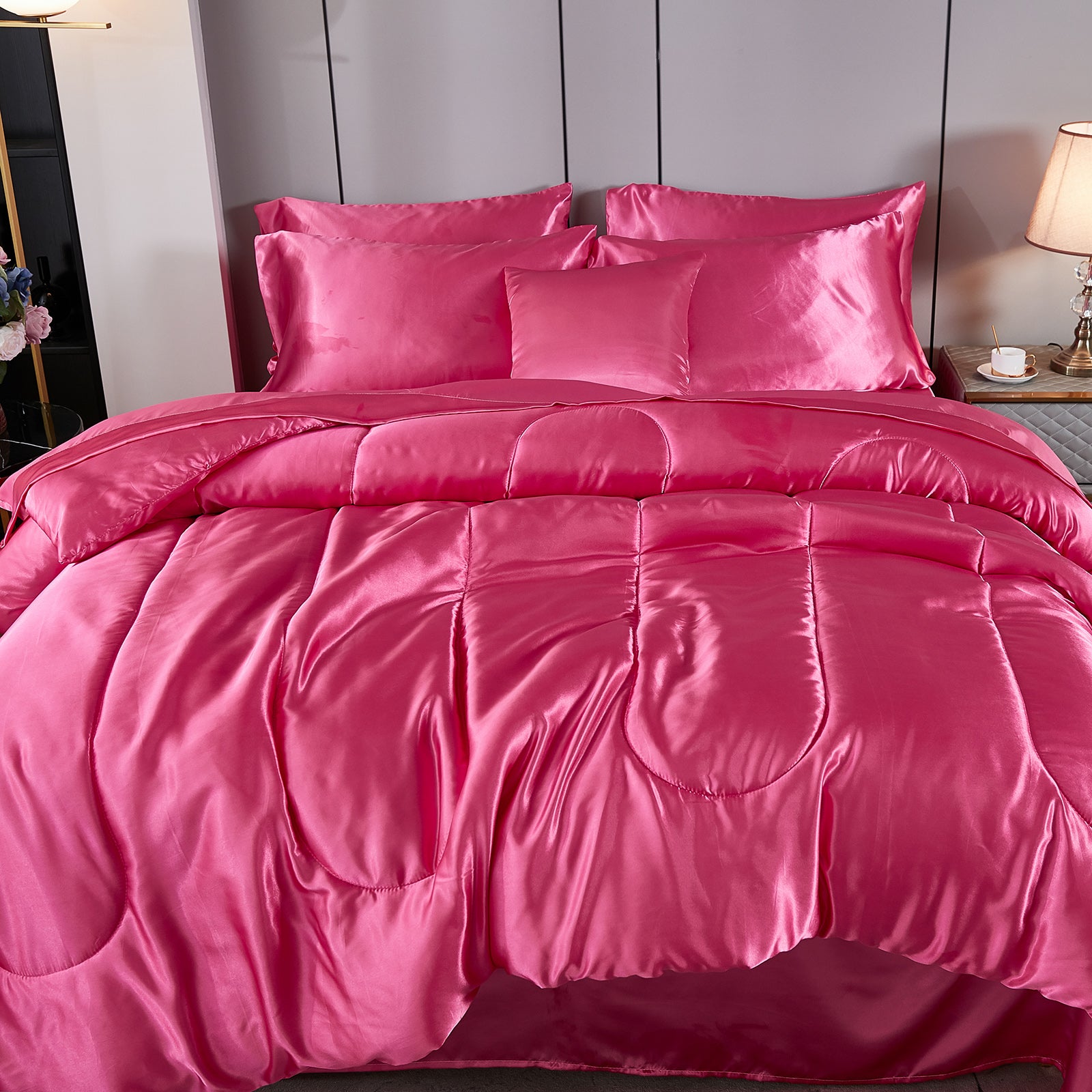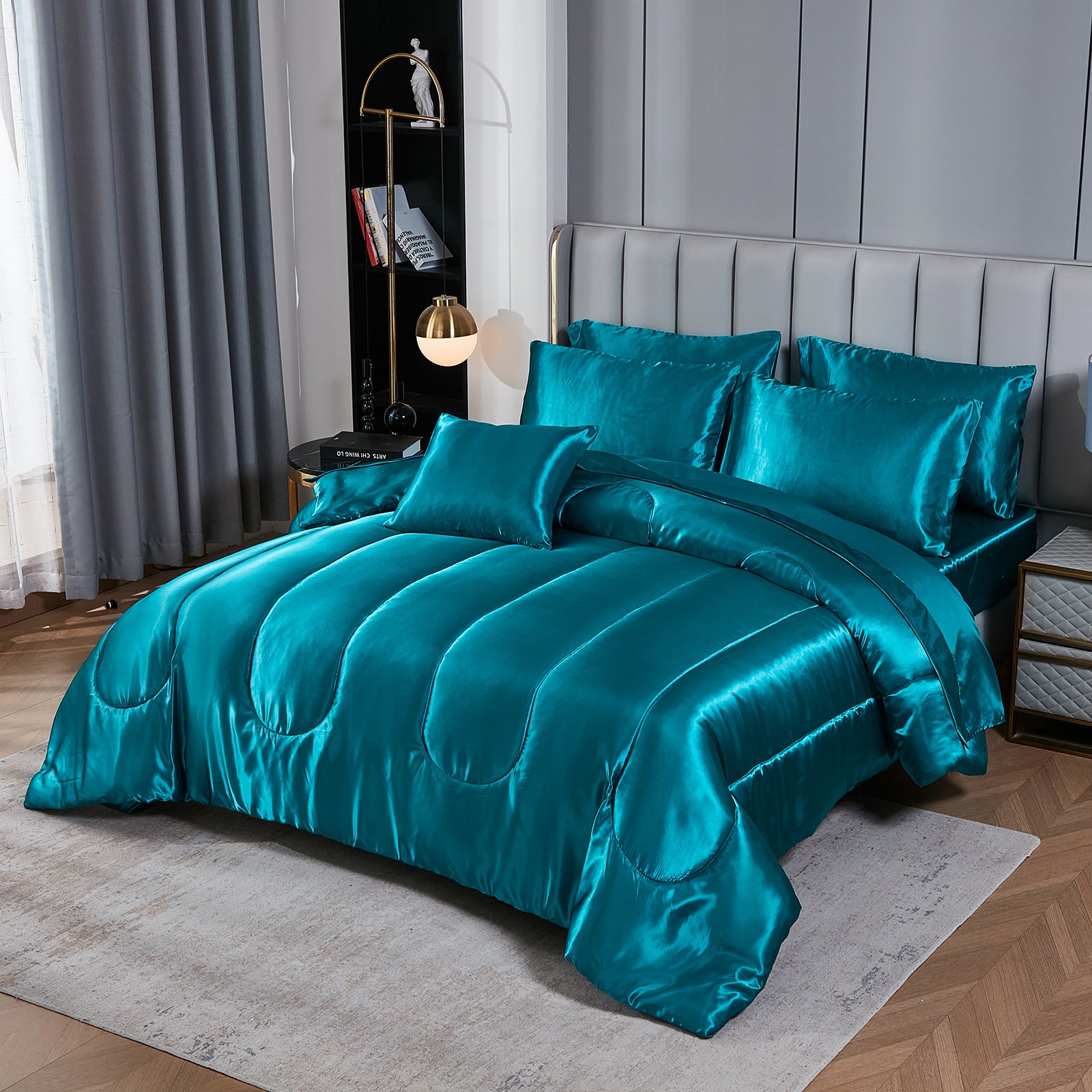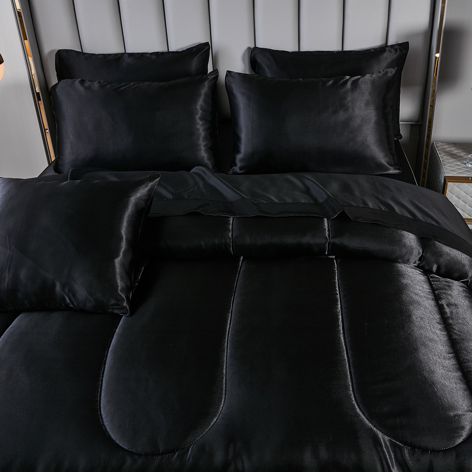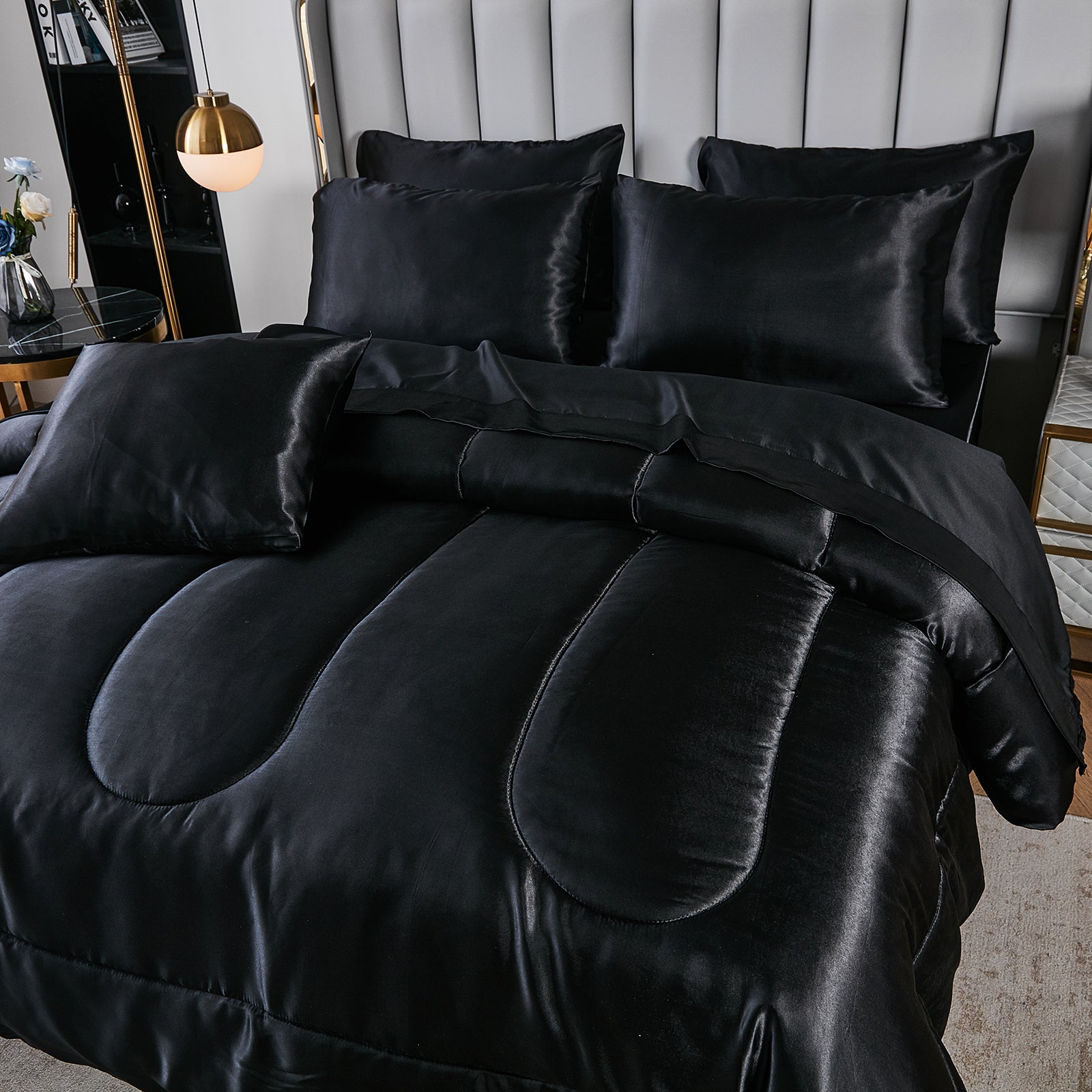 Elevate your bedroom with this Luxury Satin Comforter Set Bed in a Bag, designed to deliver elegance and comfort in one complete package. Crafted with a silky satin finish, the fabric combines the softness of silk with the durability of microfiber, giving your bedding a smooth, pearl-like sheen that brightens any room.