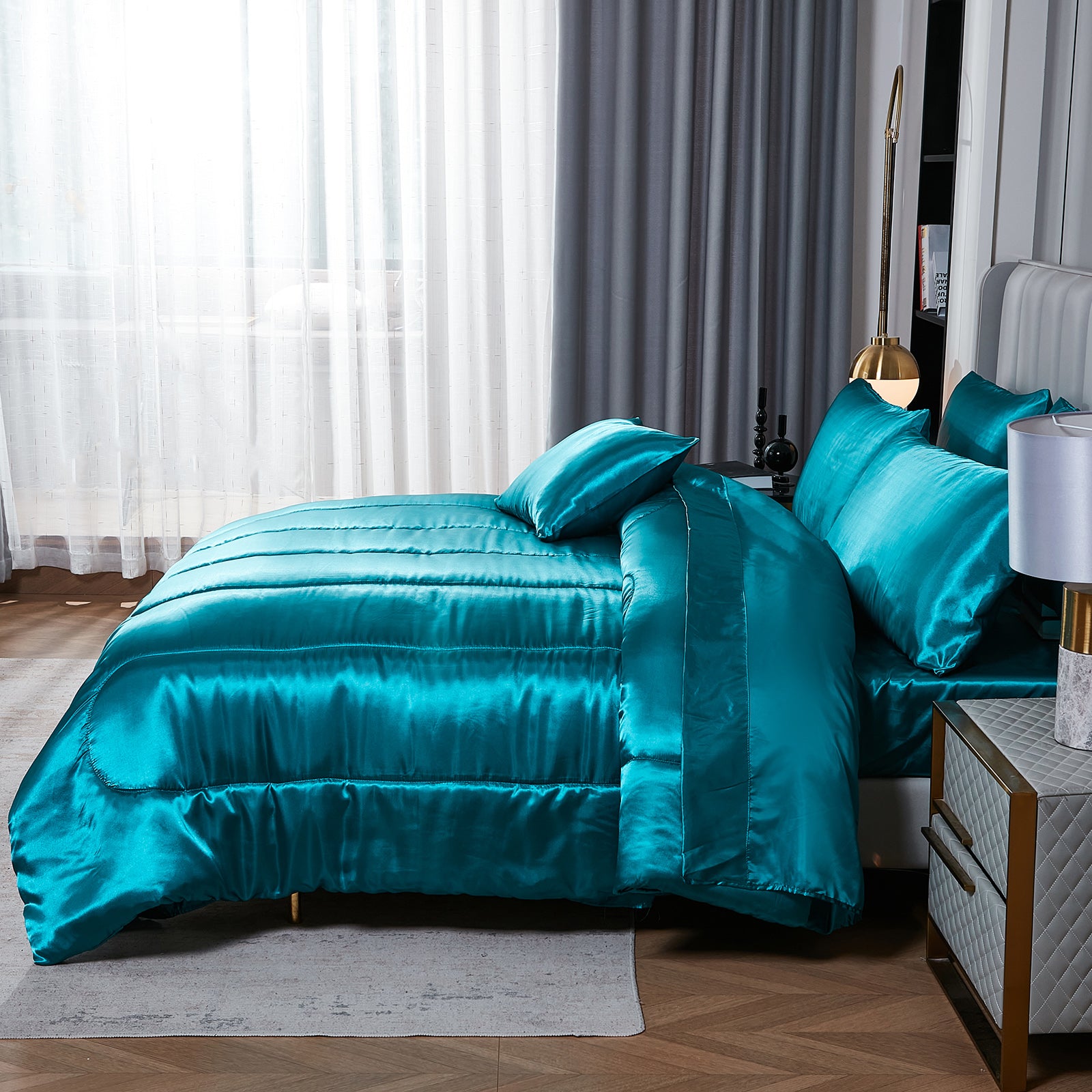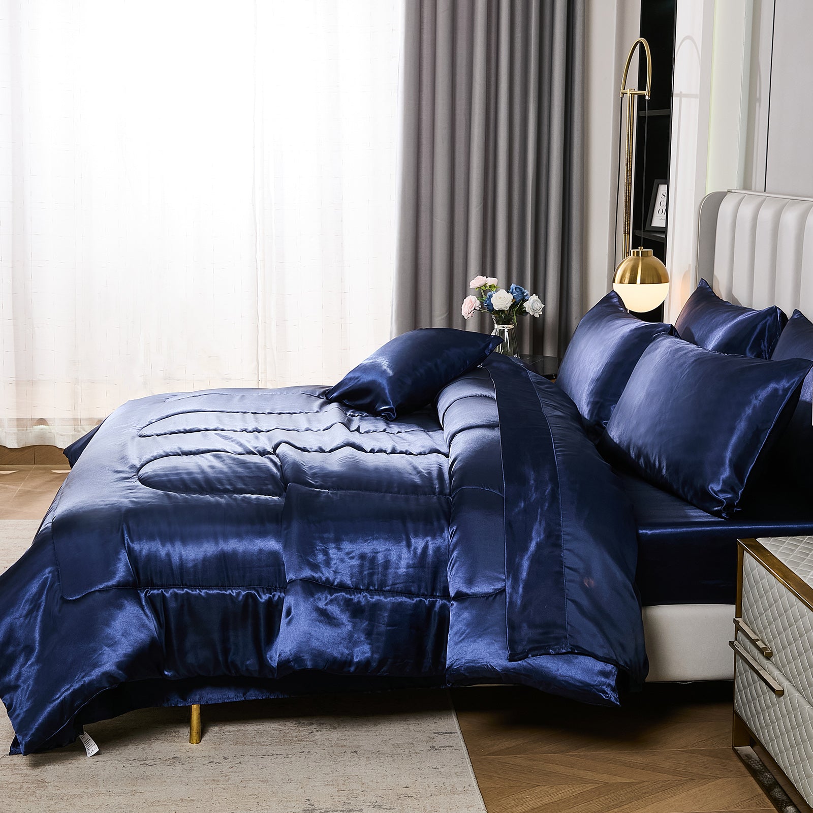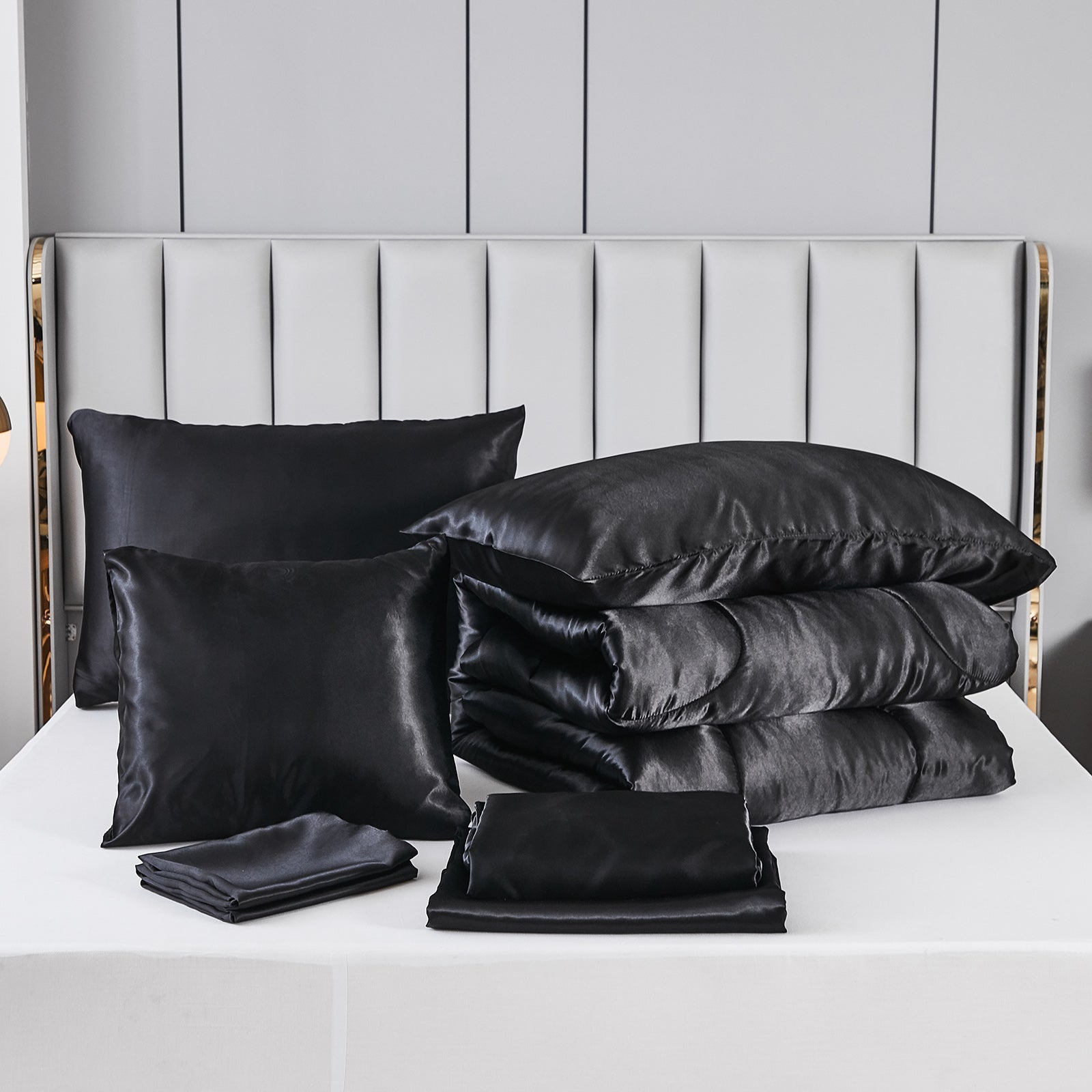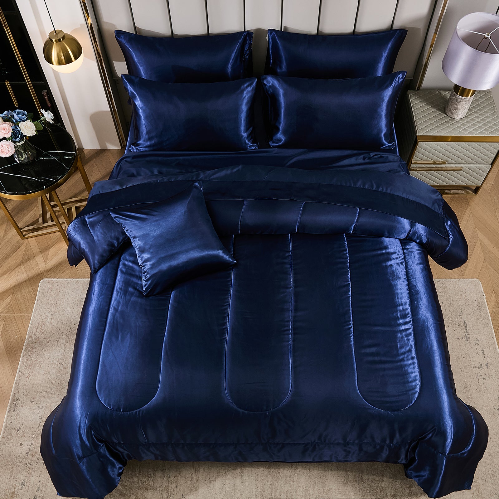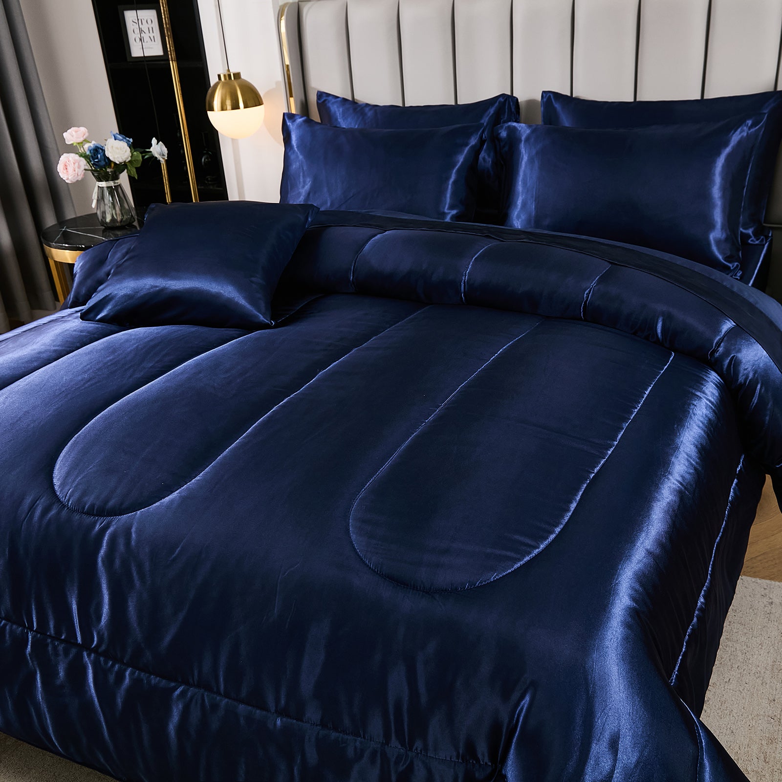 Elevate your bedroom with this Luxury Satin Comforter Set Bed in a Bag, designed to deliver elegance and comfort in one complete package. Crafted with a silky satin finish, the fabric combines the softness of silk with the durability of microfiber, giving your bedding a smooth, pearl-like sheen that brightens any room.