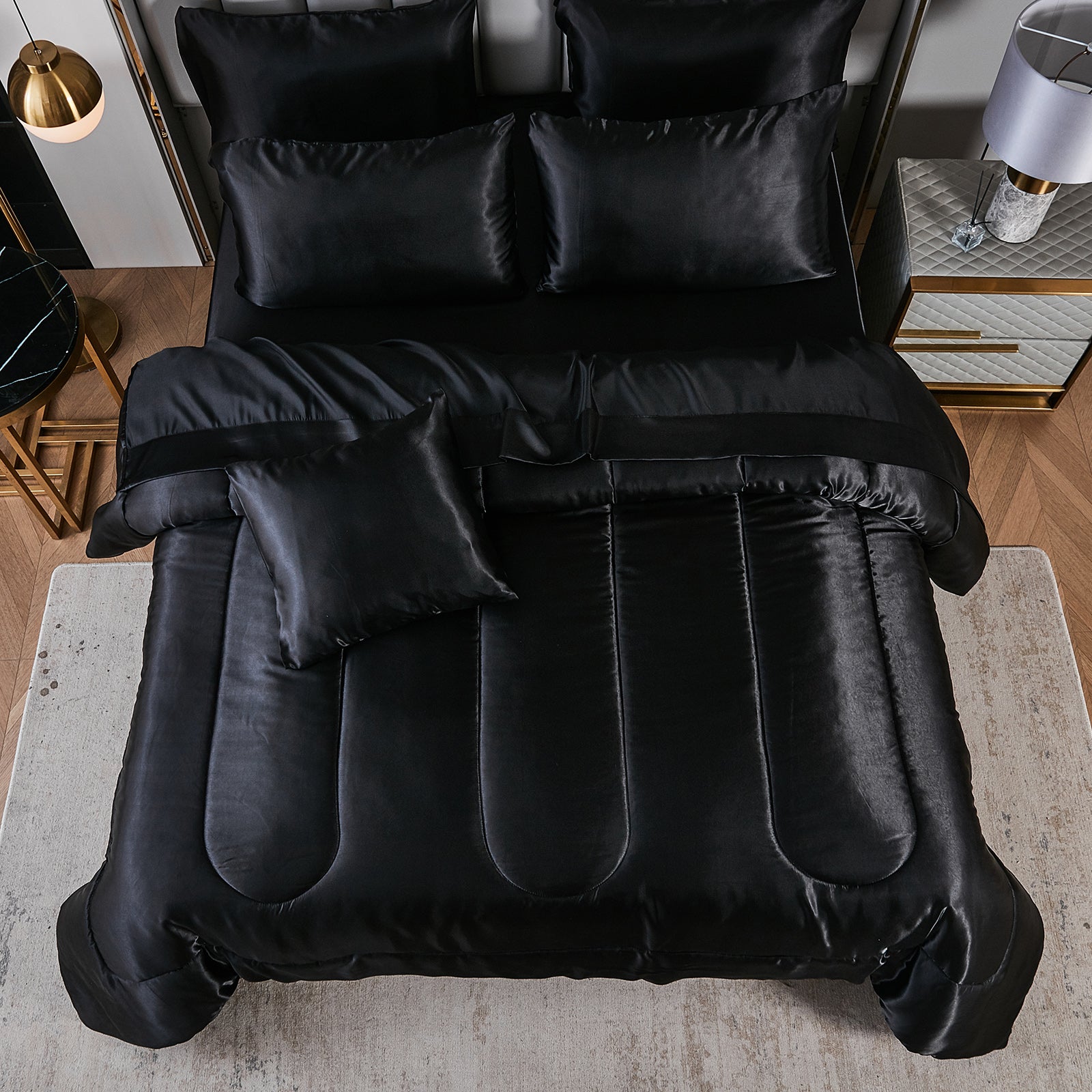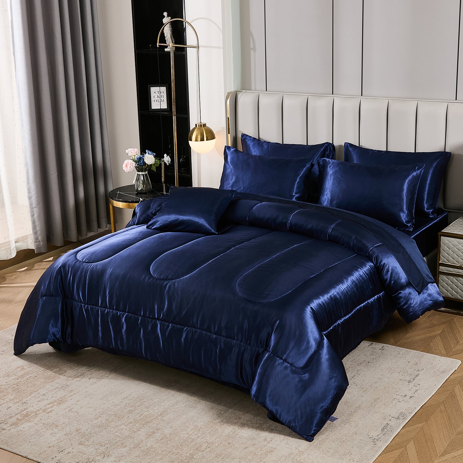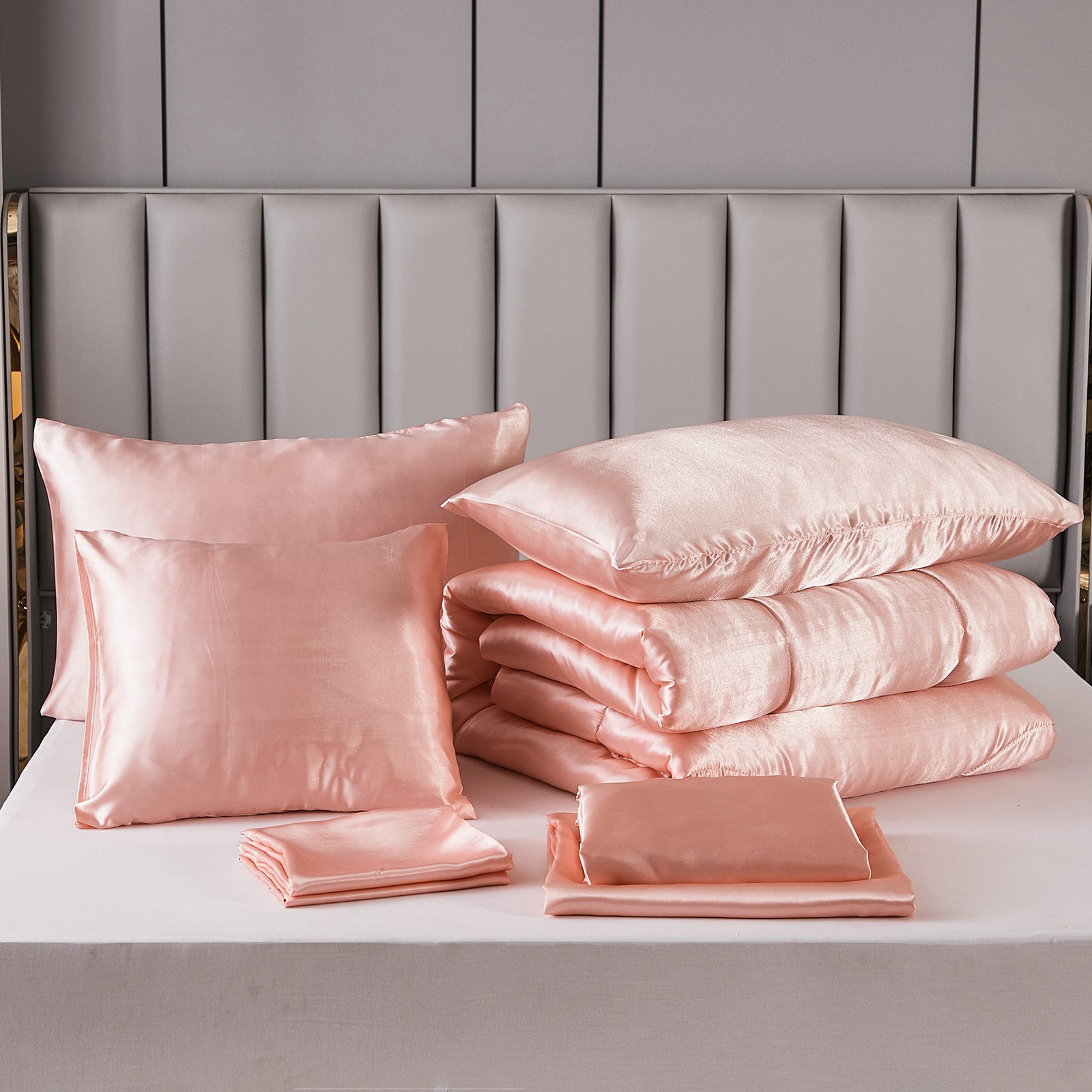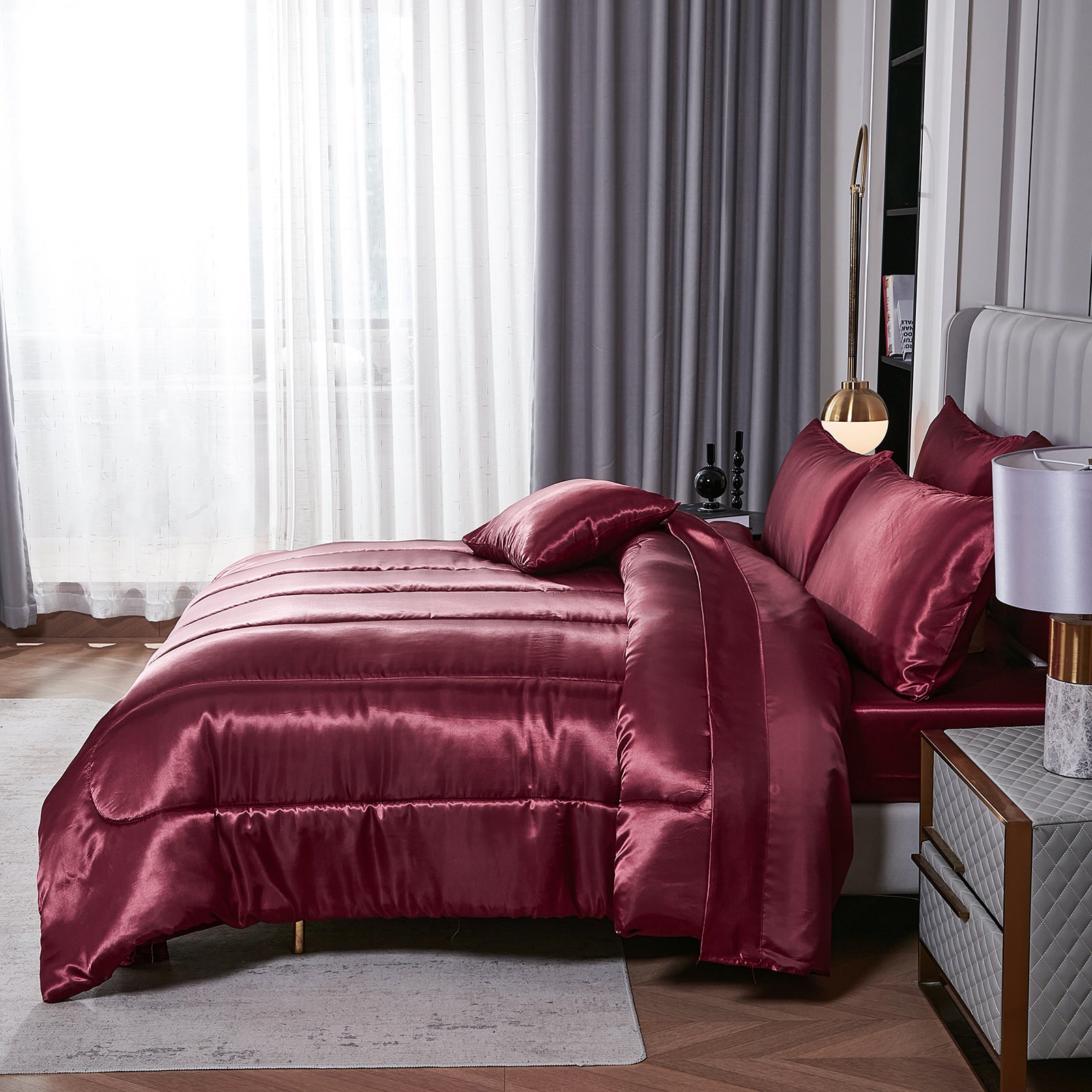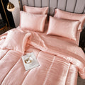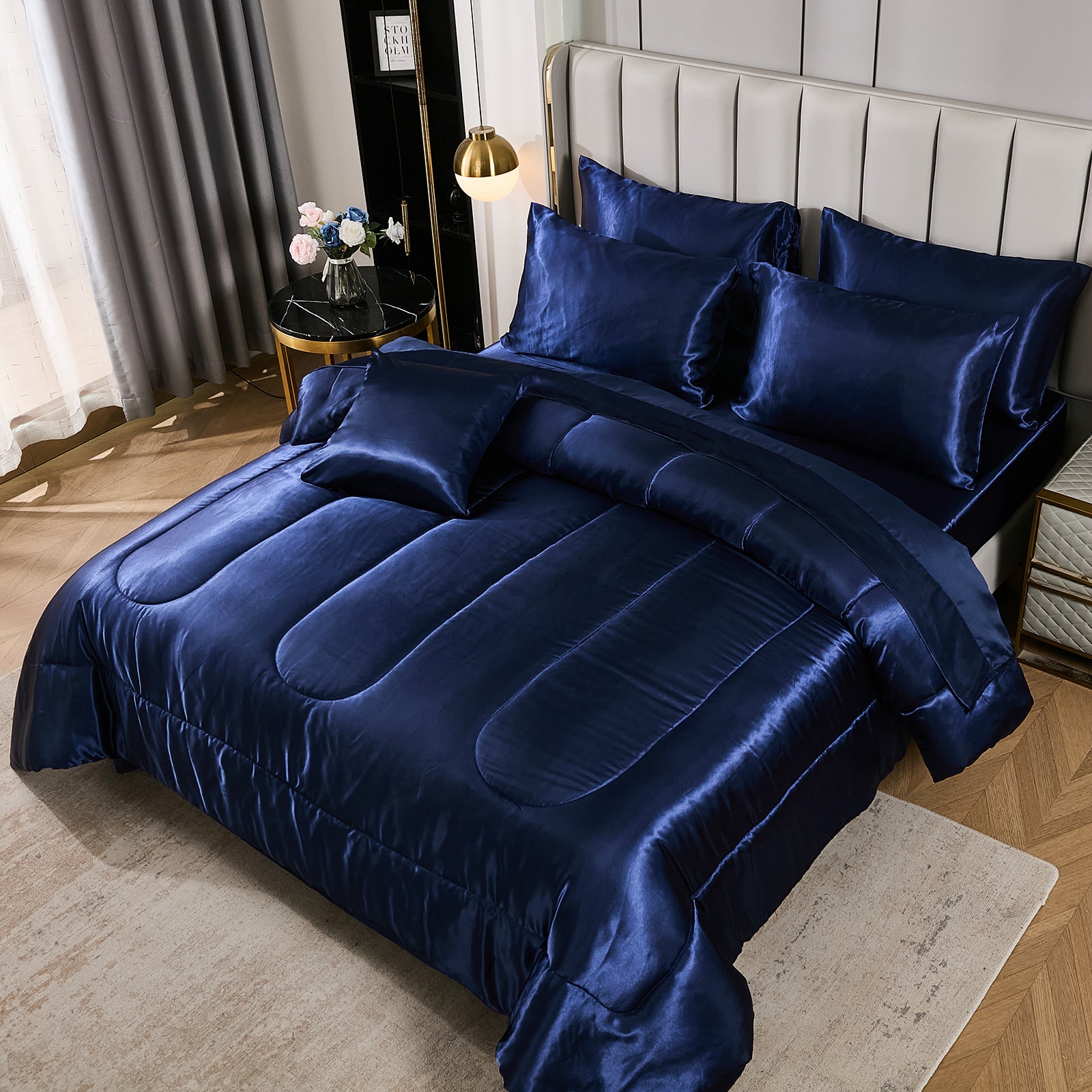 Elevate your bedroom with this Luxury Satin Comforter Set Bed in a Bag, designed to deliver elegance and comfort in one complete package. Crafted with a silky satin finish, the fabric combines the softness of silk with the durability of microfiber, giving your bedding a smooth, pearl-like sheen that brightens any room.