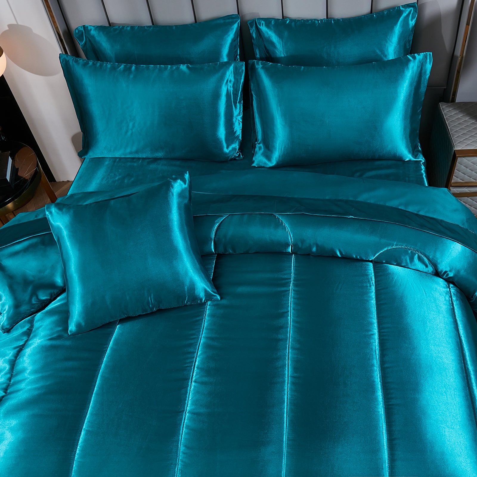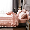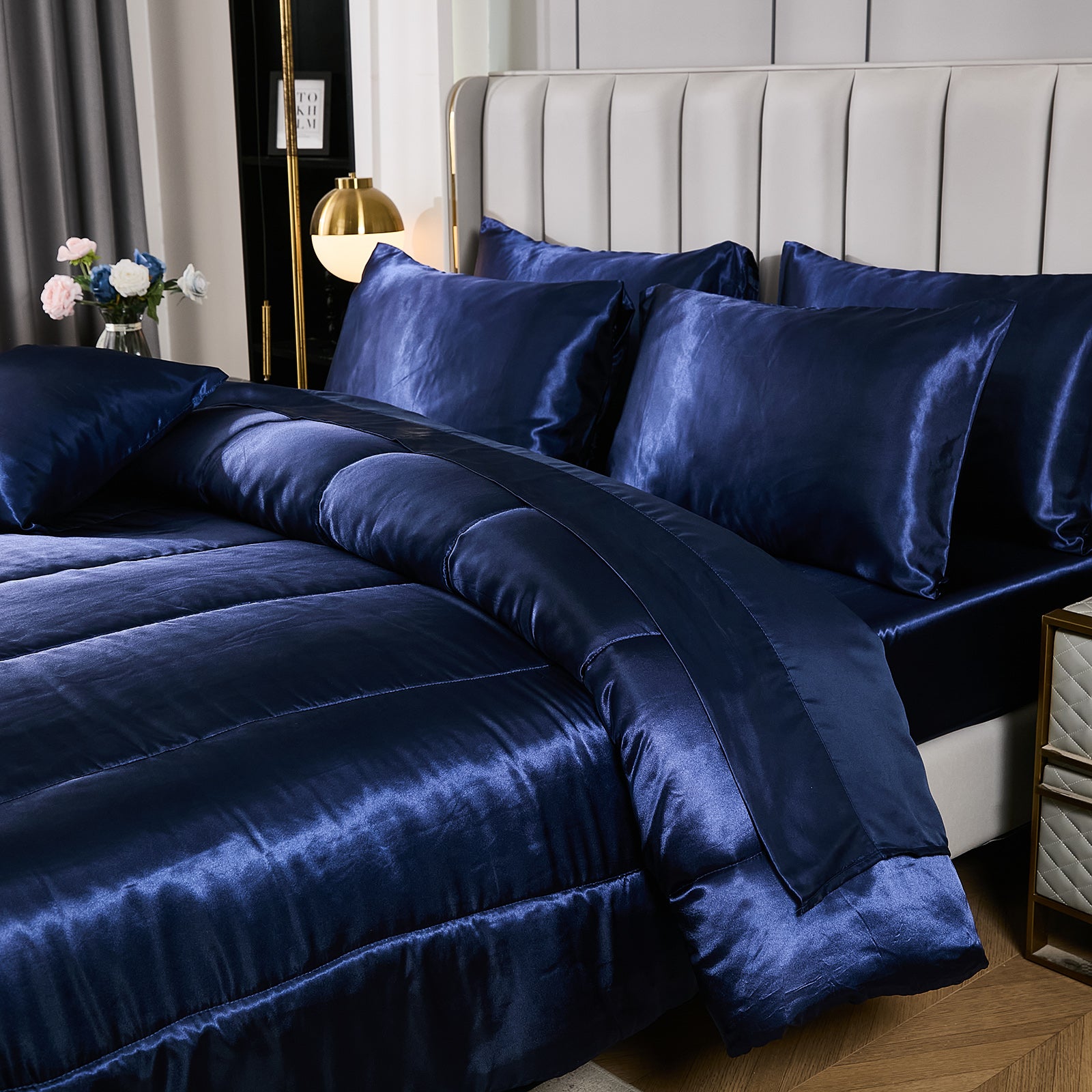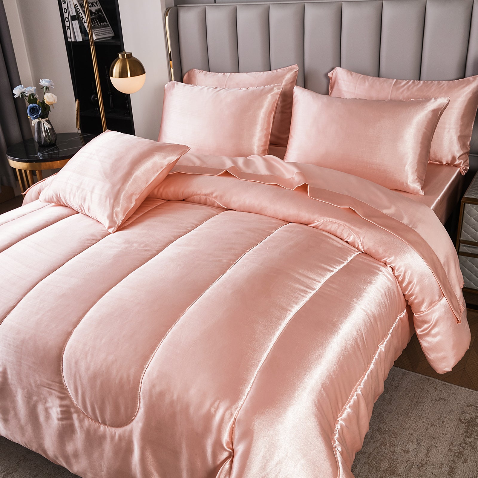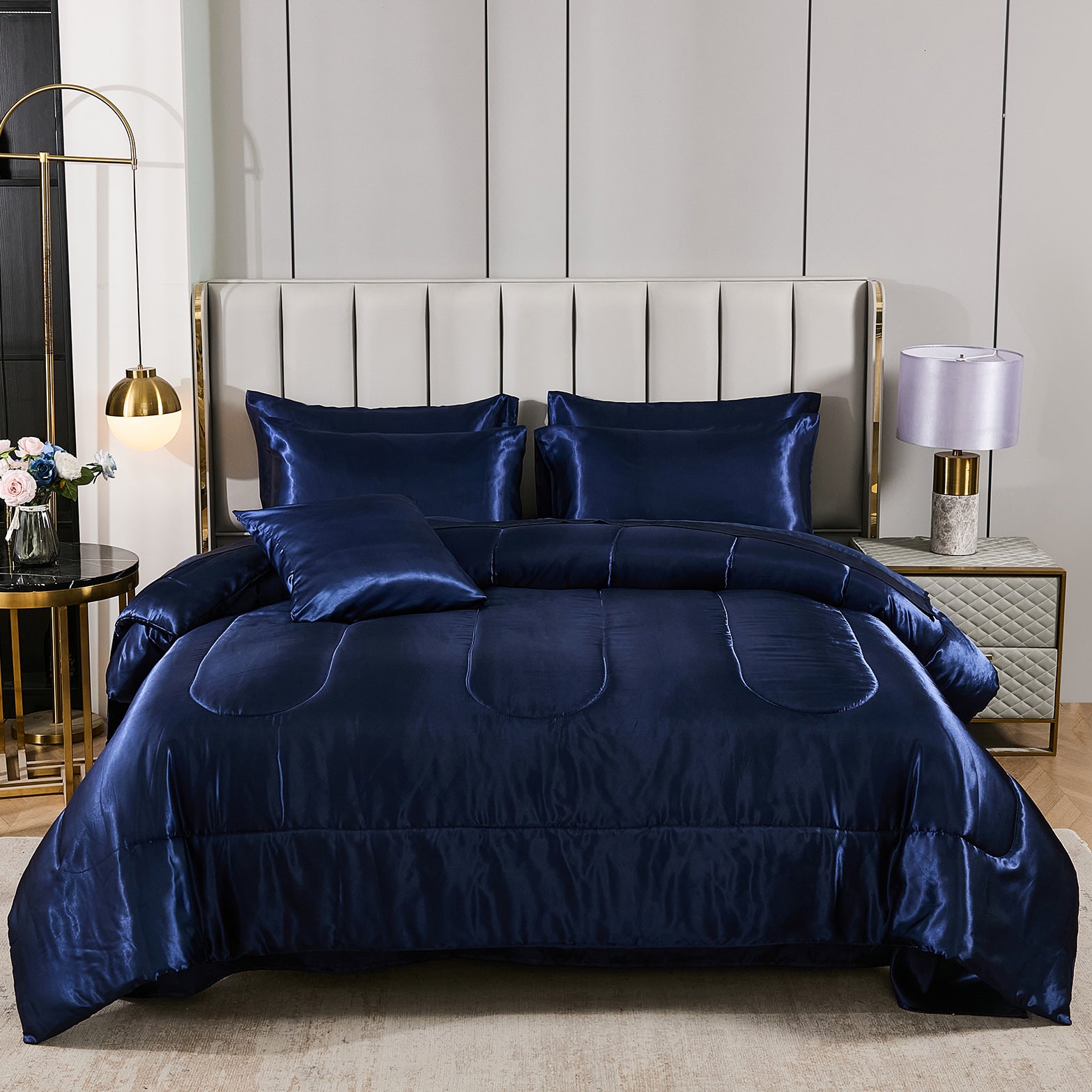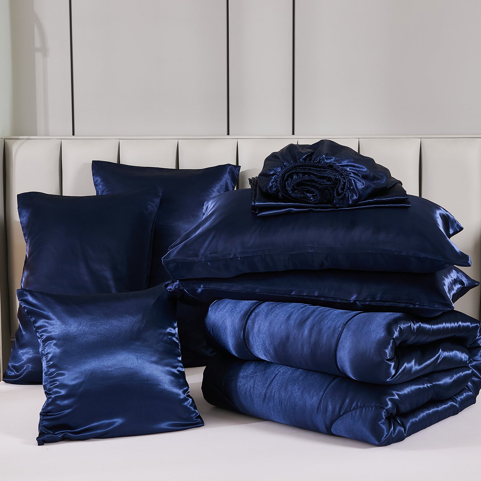 Elevate your bedroom with this Luxury Satin Comforter Set Bed in a Bag, designed to deliver elegance and comfort in one complete package. Crafted with a silky satin finish, the fabric combines the softness of silk with the durability of microfiber, giving your bedding a smooth, pearl-like sheen that brightens any room.