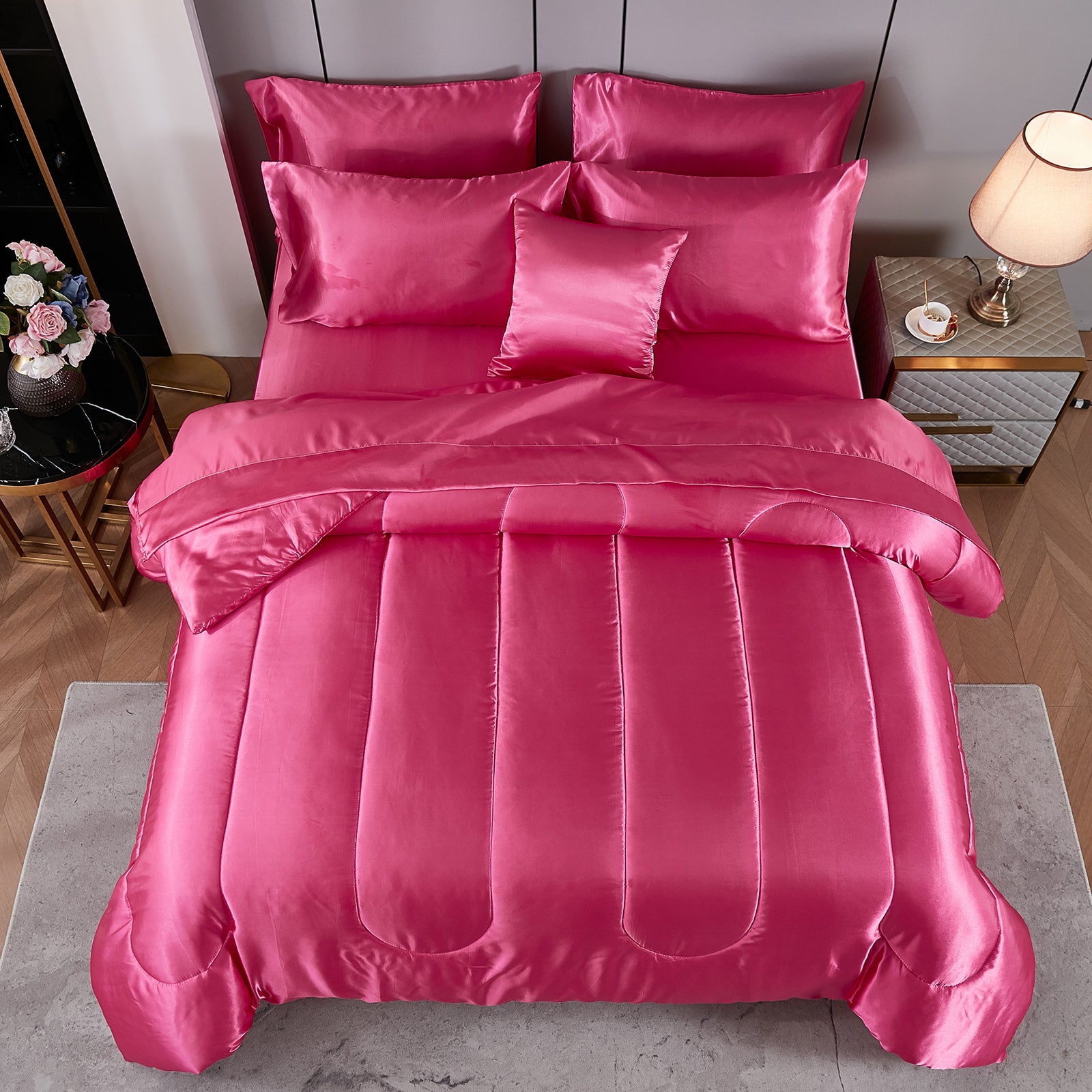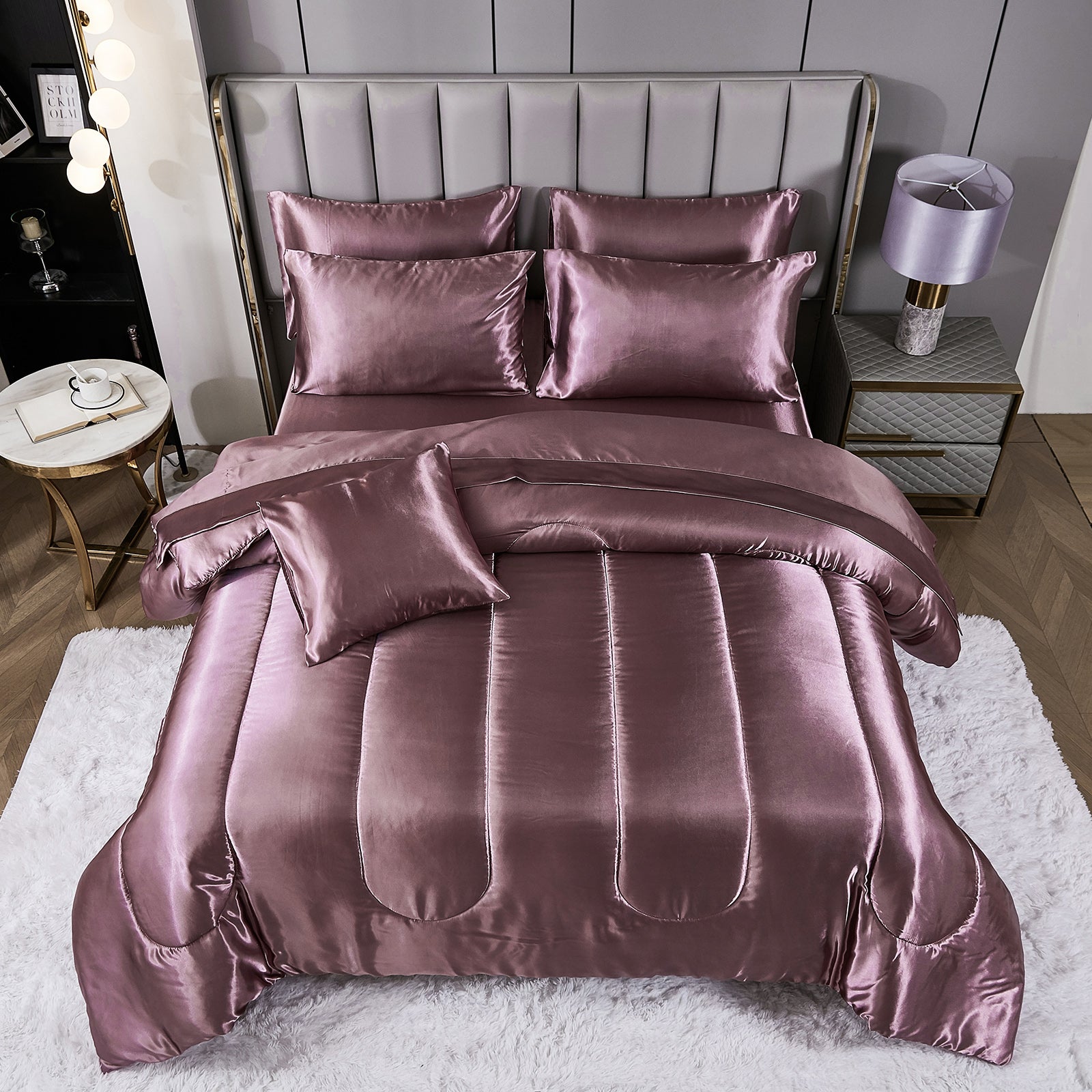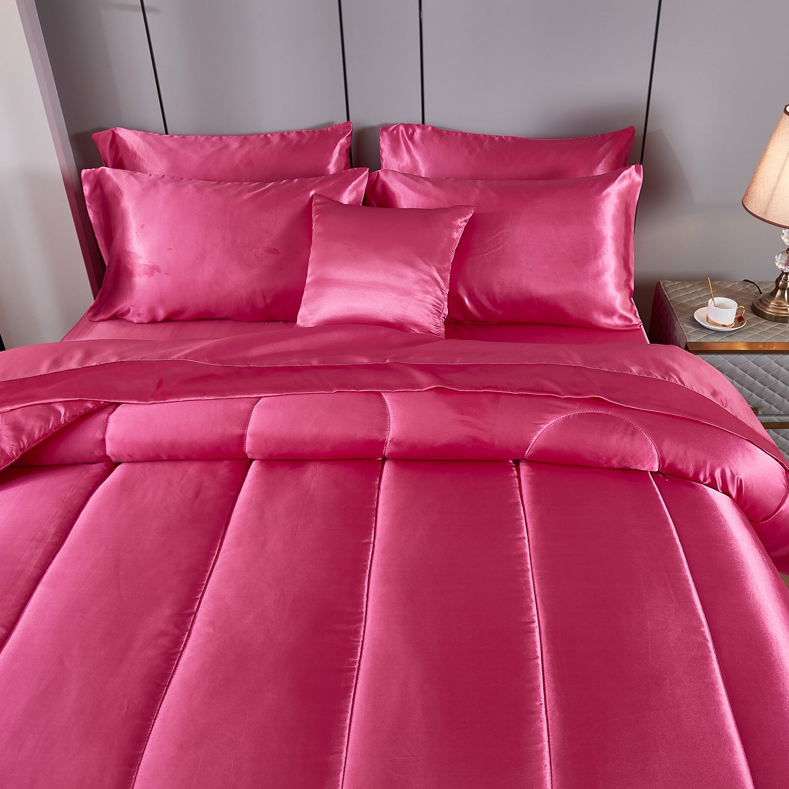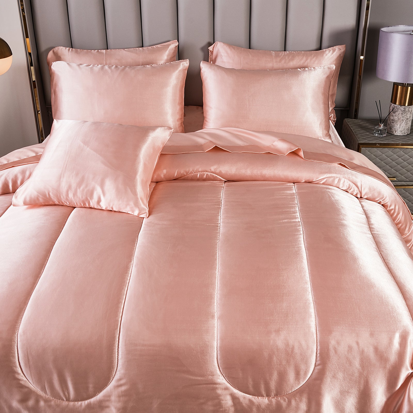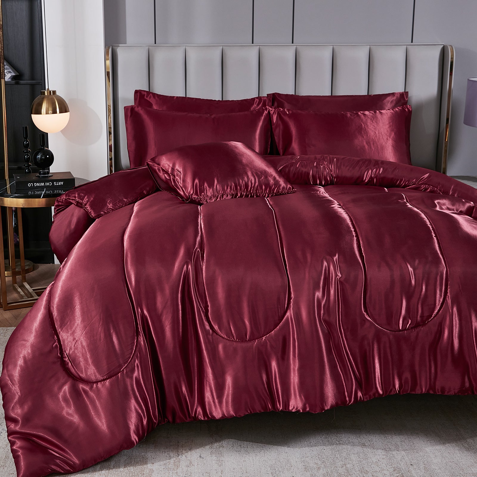 Elevate your bedroom with this Luxury Satin Comforter Set Bed in a Bag, designed to deliver elegance and comfort in one complete package. Crafted with a silky satin finish, the fabric combines the softness of silk with the durability of microfiber, giving your bedding a smooth, pearl-like sheen that brightens any room.