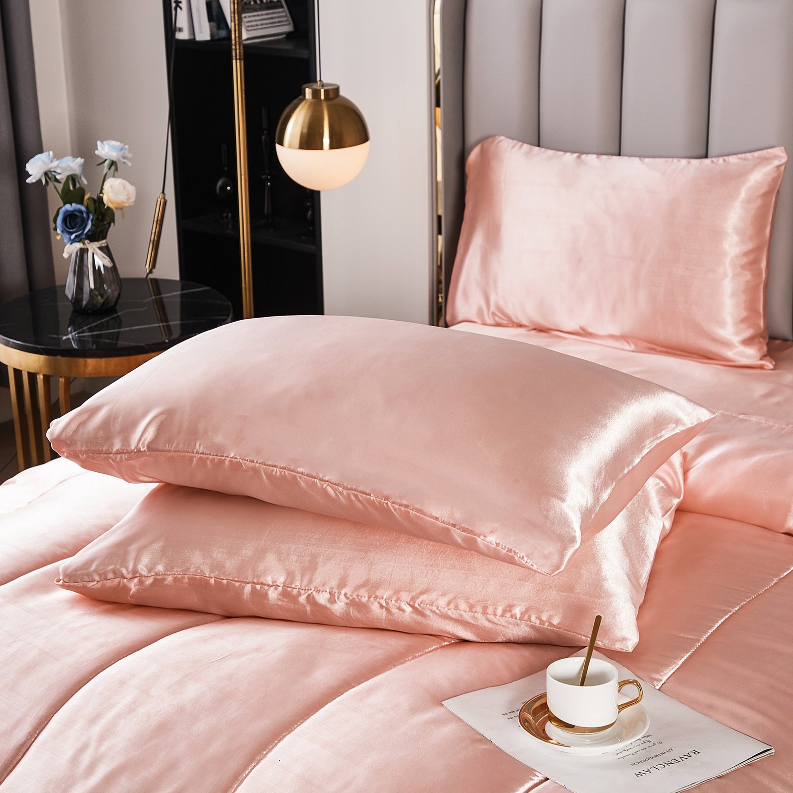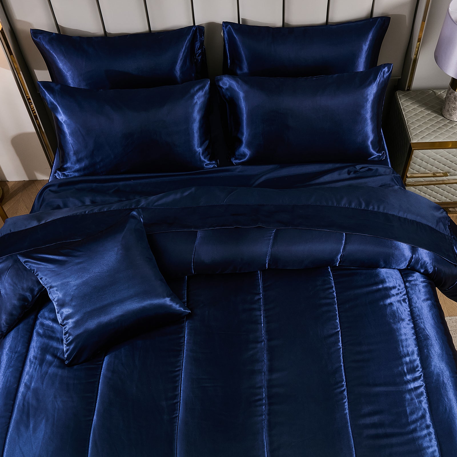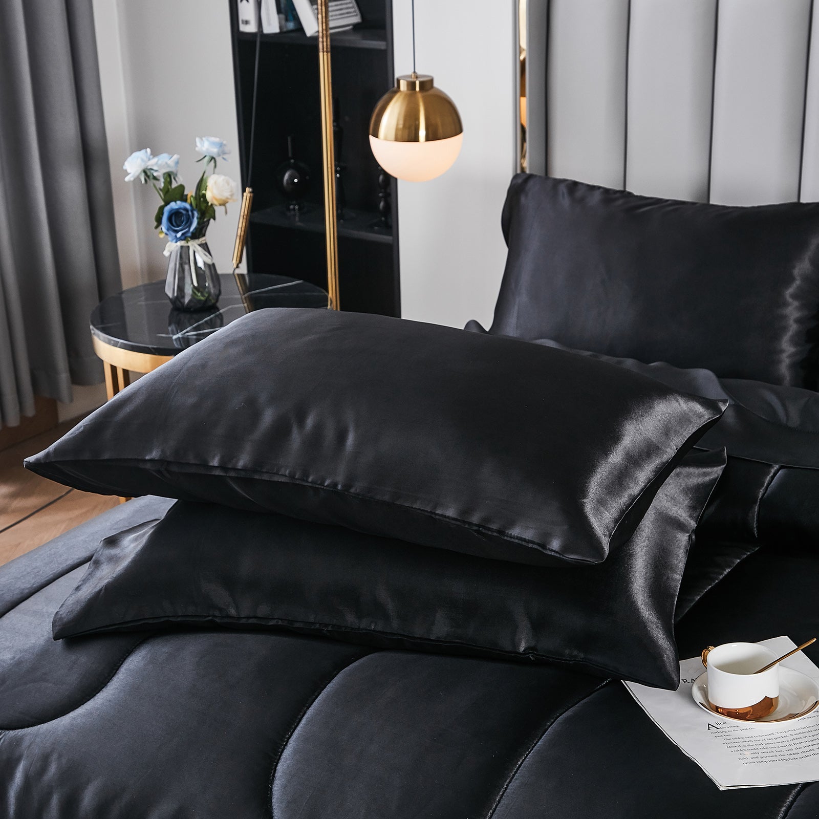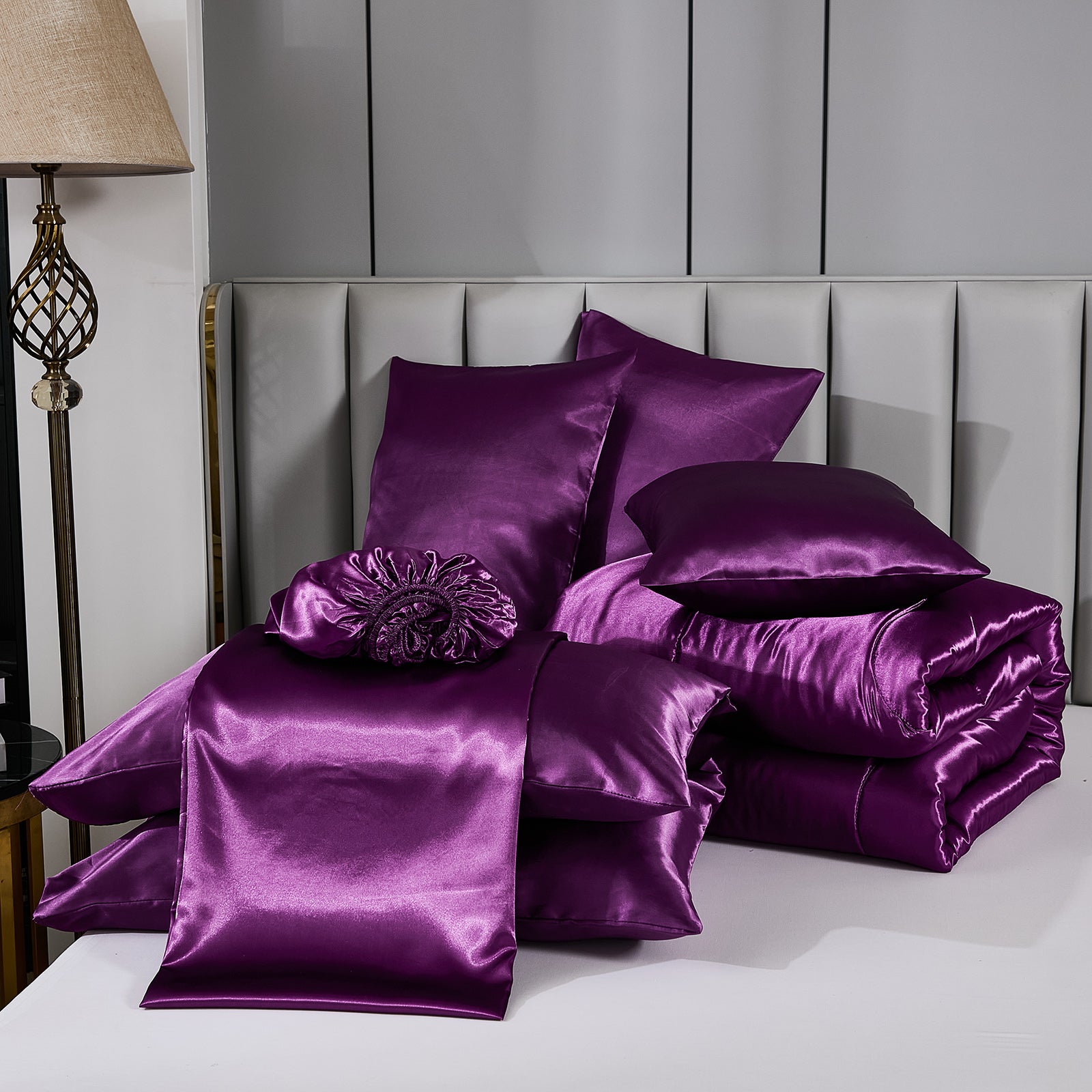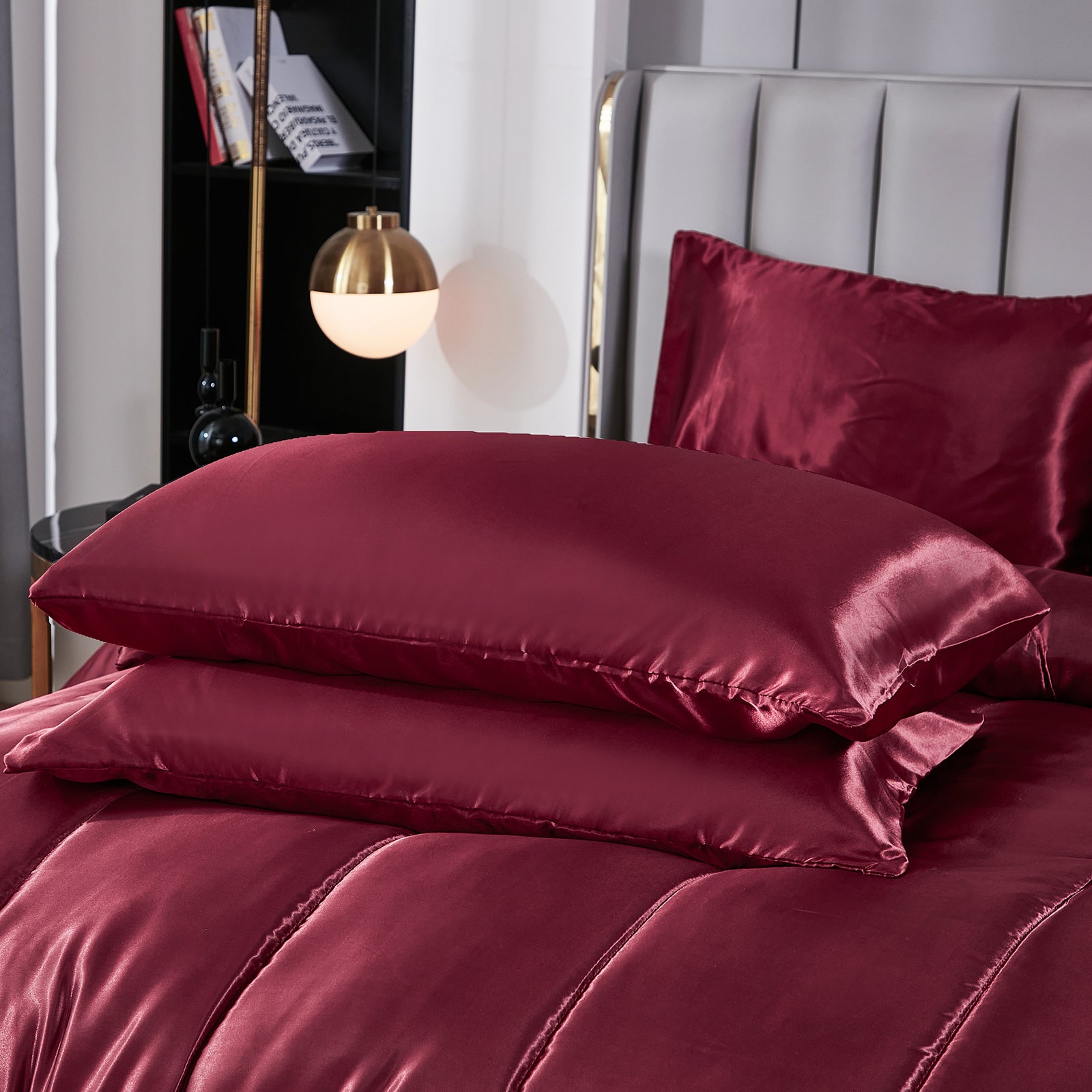 Elevate your bedroom with this Luxury Satin Comforter Set Bed in a Bag, designed to deliver elegance and comfort in one complete package. Crafted with a silky satin finish, the fabric combines the softness of silk with the durability of microfiber, giving your bedding a smooth, pearl-like sheen that brightens any room.