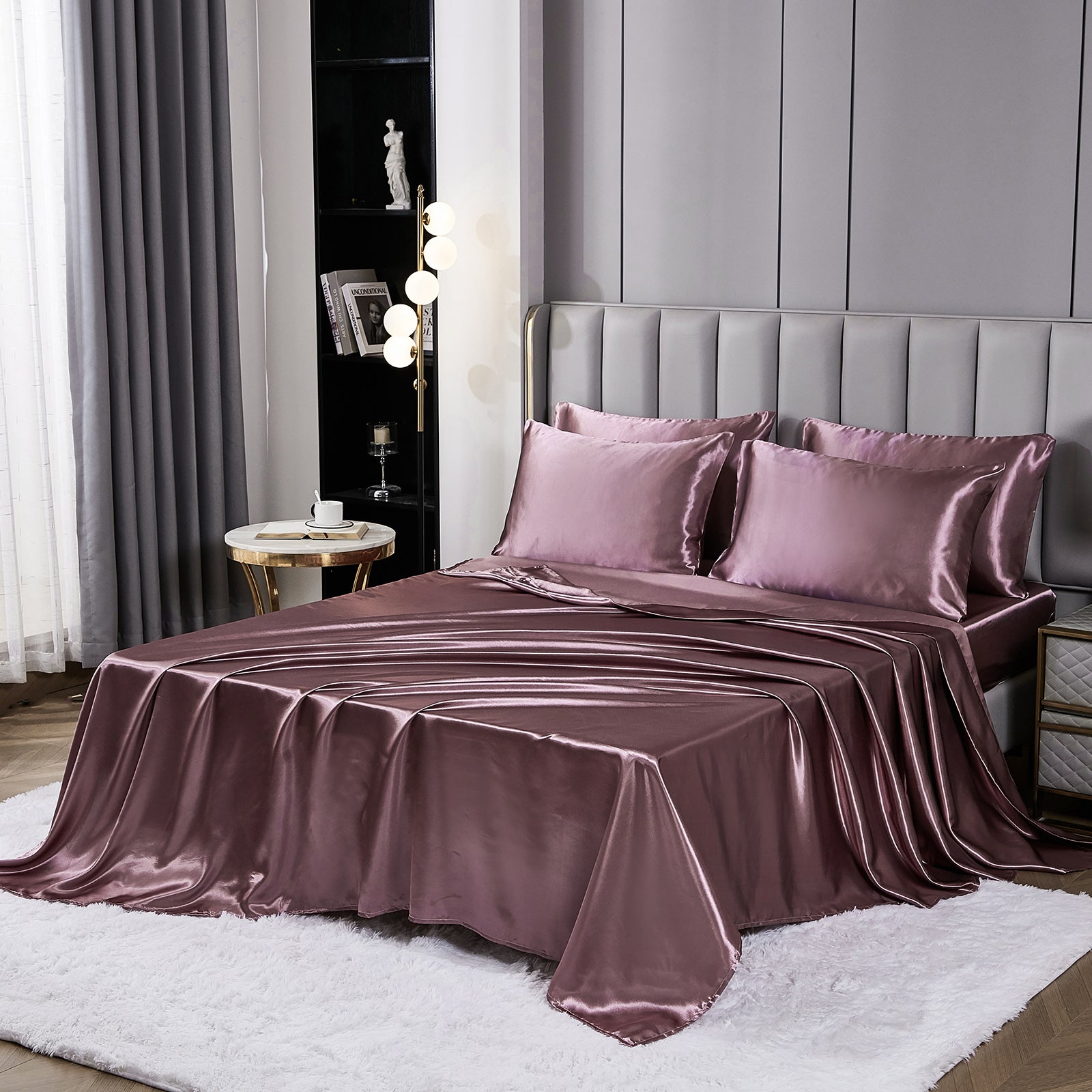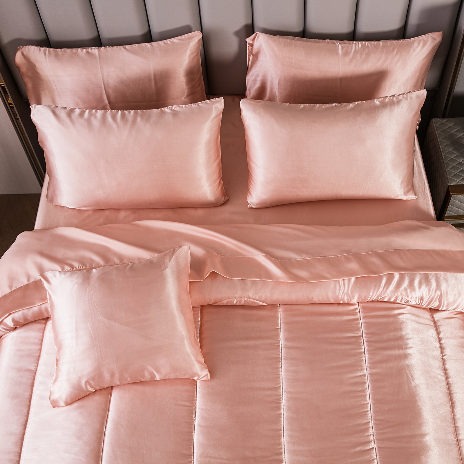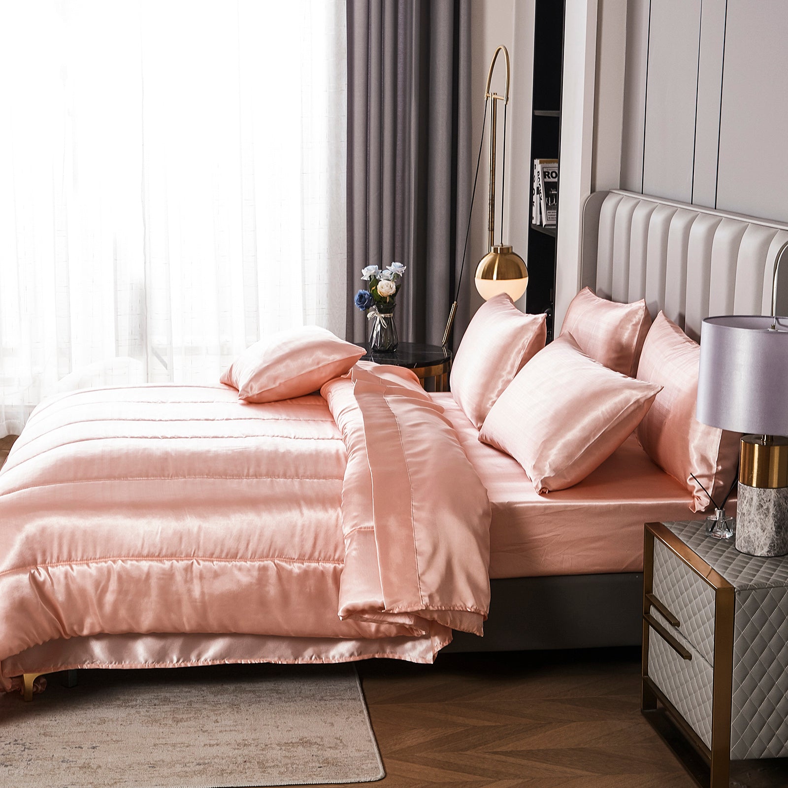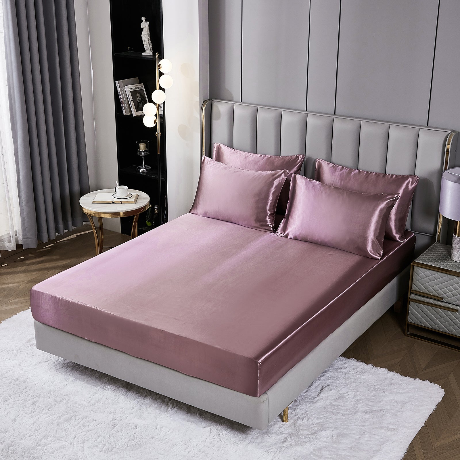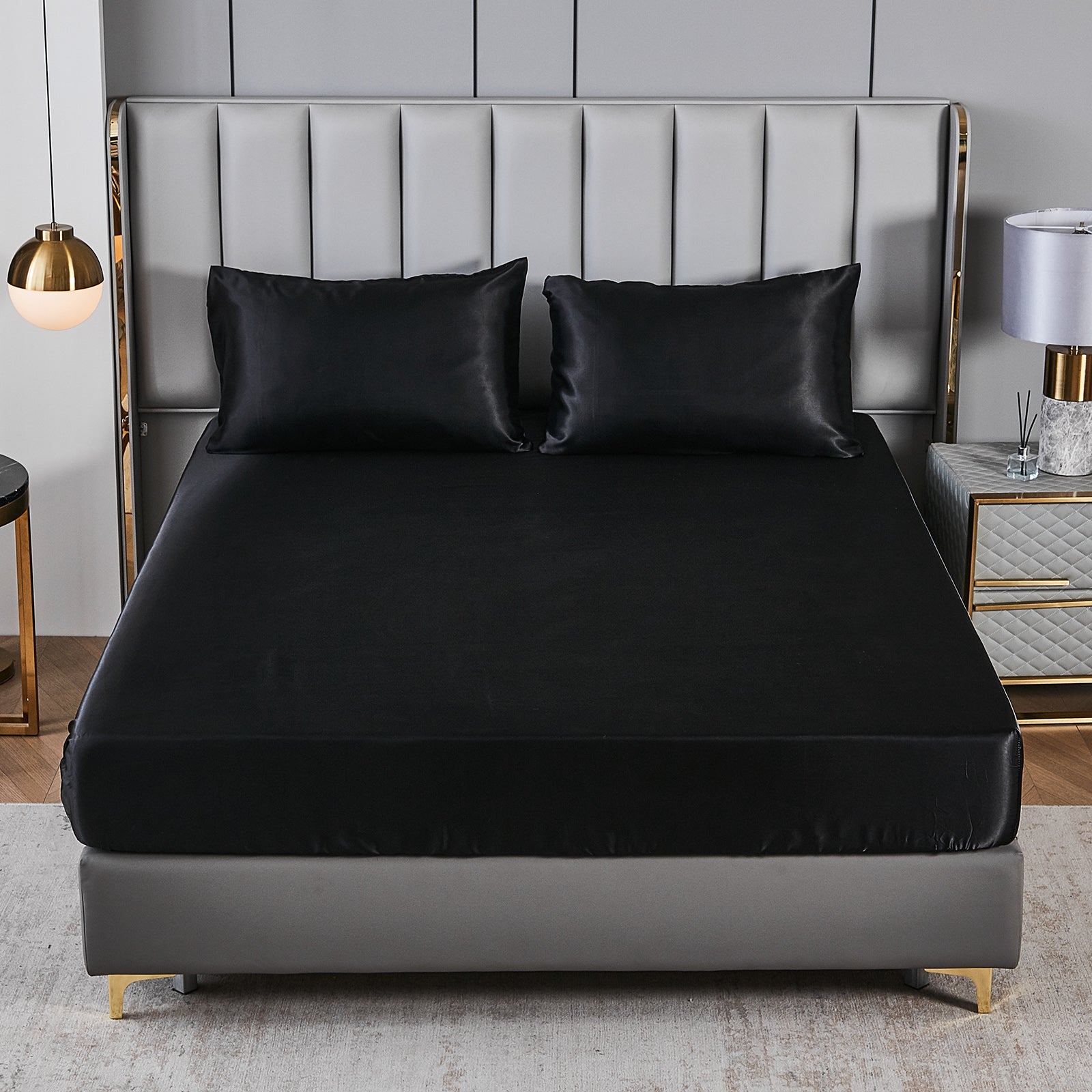 Elevate your bedroom with this Luxury Satin Comforter Set Bed in a Bag, designed to deliver elegance and comfort in one complete package. Crafted with a silky satin finish, the fabric combines the softness of silk with the durability of microfiber, giving your bedding a smooth, pearl-like sheen that brightens any room.