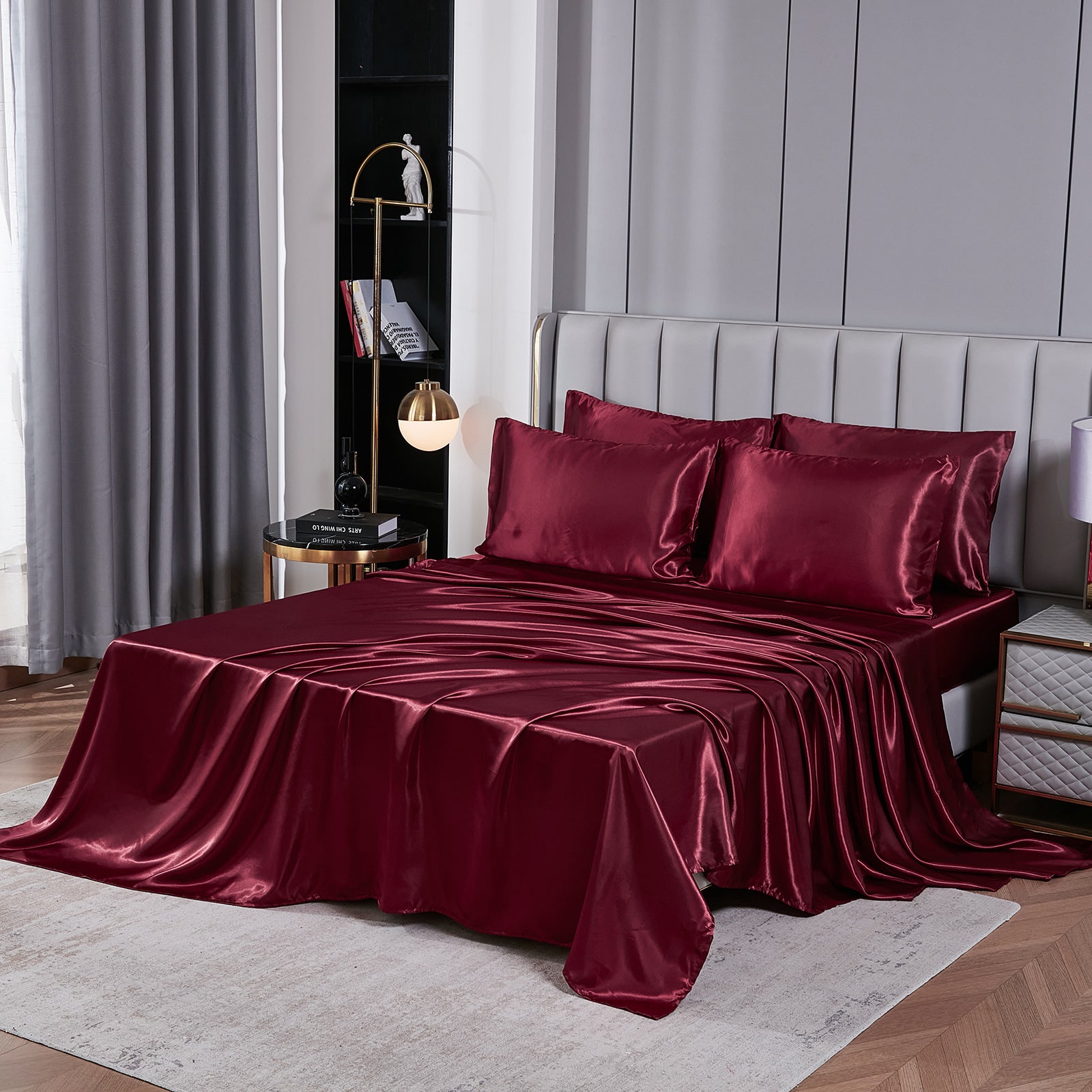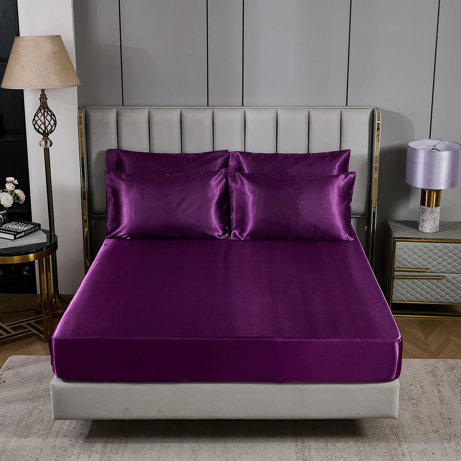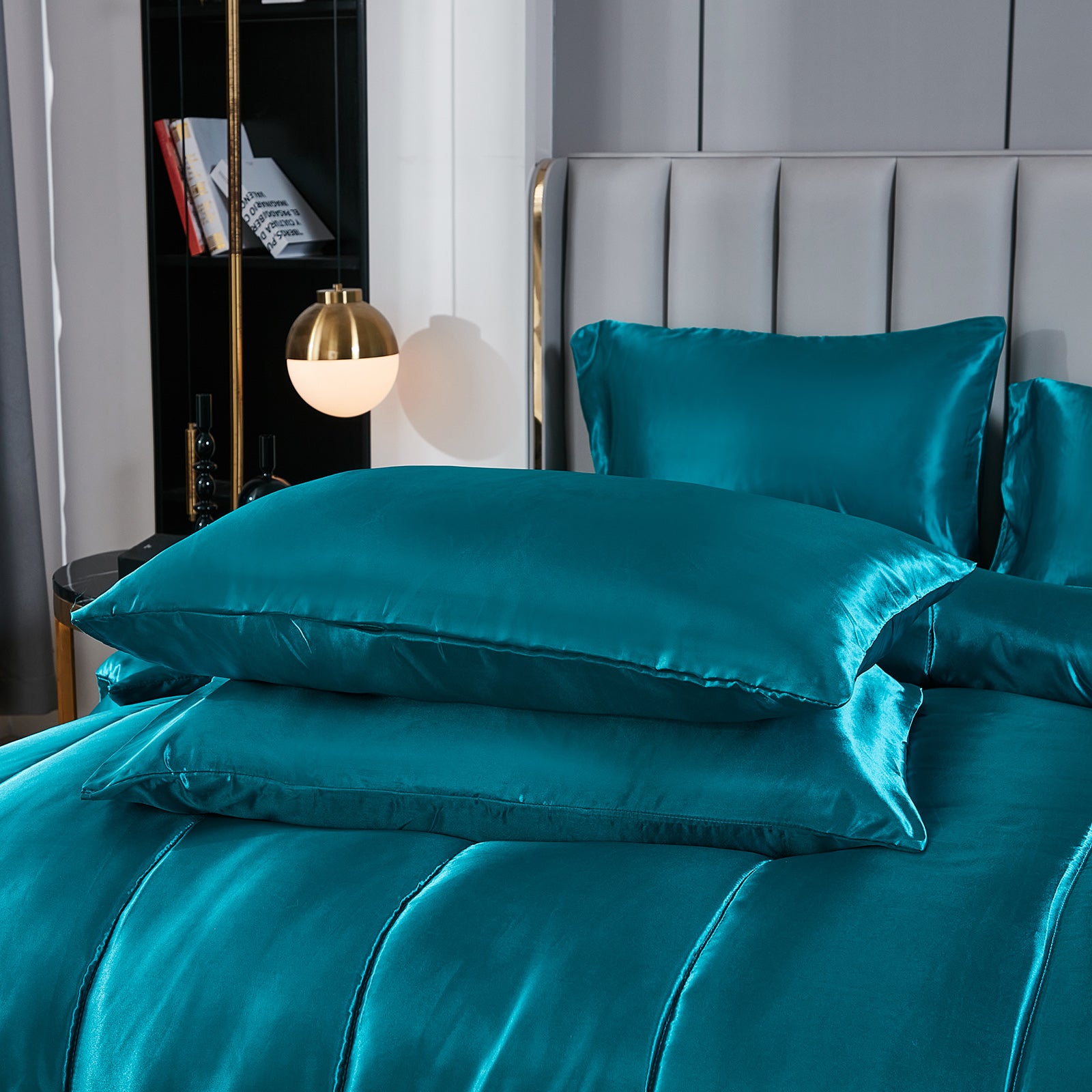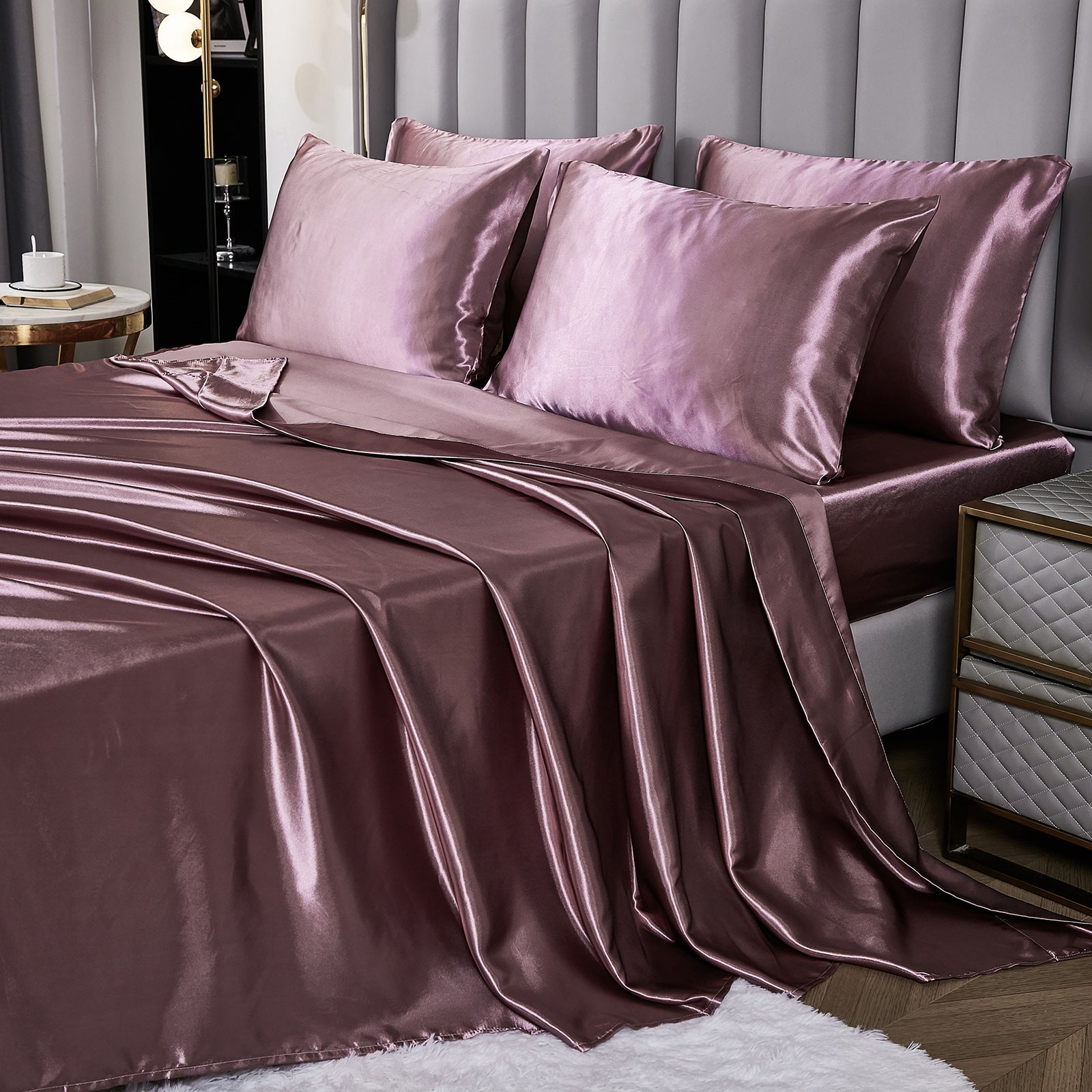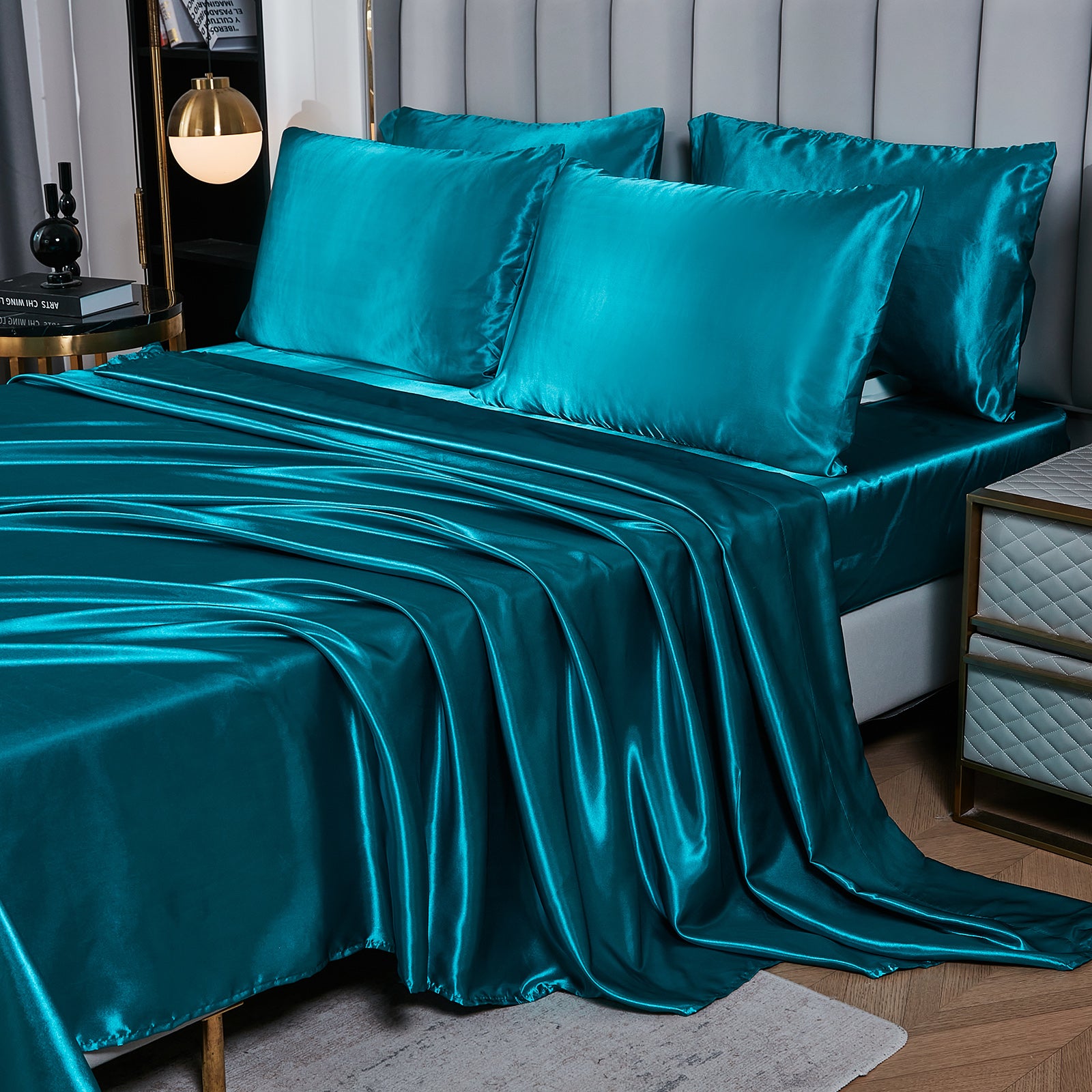 Elevate your bedroom with this Luxury Satin Comforter Set Bed in a Bag, designed to deliver elegance and comfort in one complete package. Crafted with a silky satin finish, the fabric combines the softness of silk with the durability of microfiber, giving your bedding a smooth, pearl-like sheen that brightens any room.