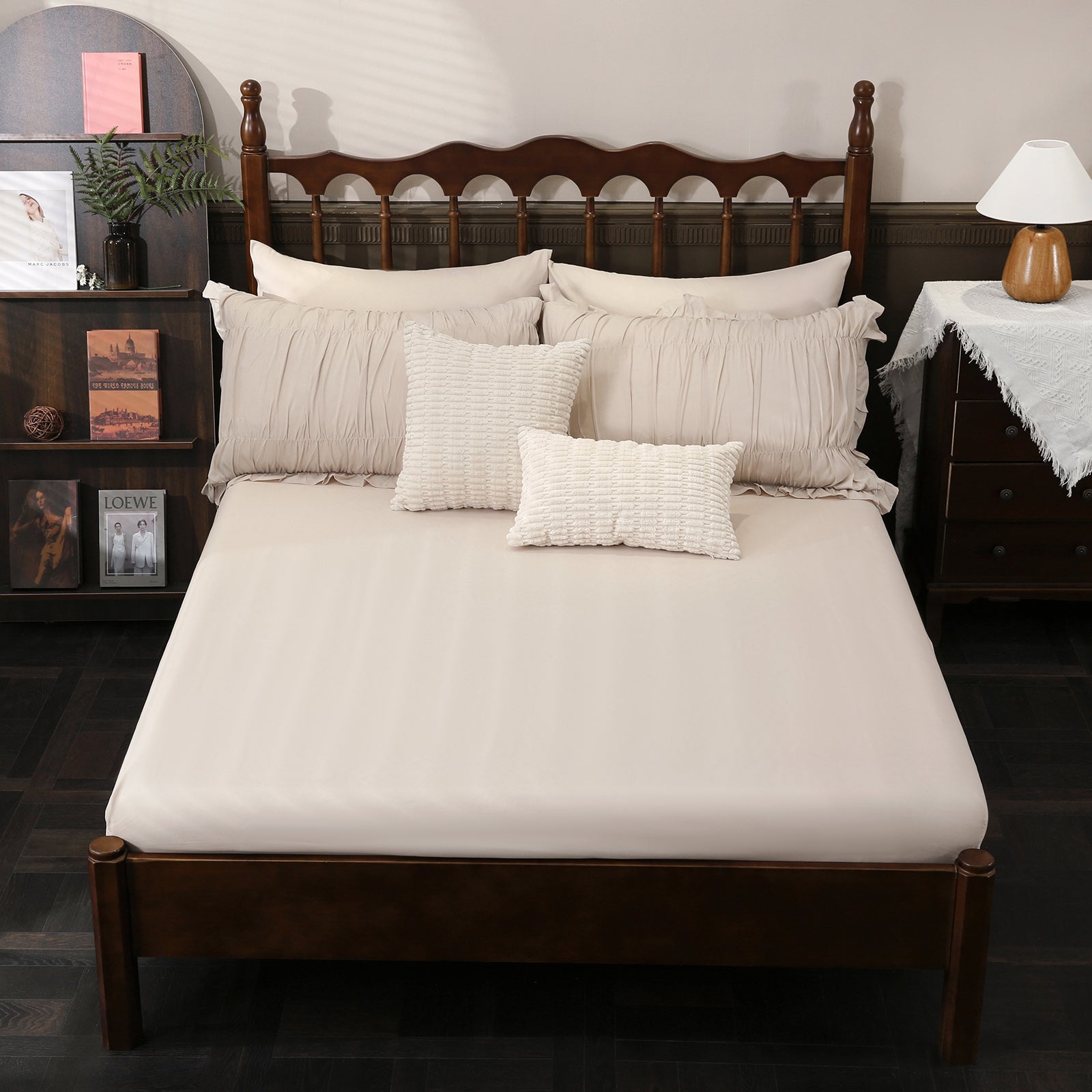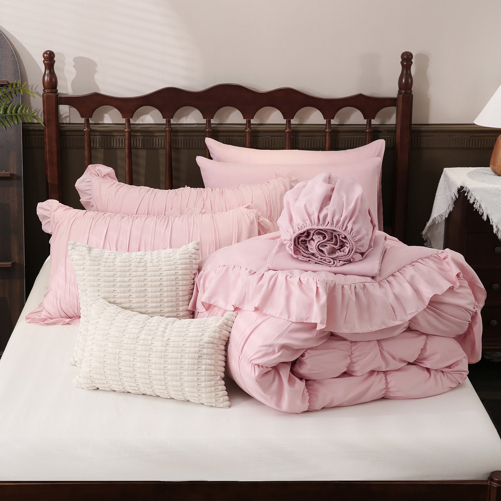 Everything You Need:The queen comforter set includes 1 ruched comforter(90"X90"),2 ruched pillowcases(20"x30"),2 solid pillowcases(20"x30"),1 flat sheet(90"x104"),1 fitted sheet(60"x80"+16") and 2 cushion cover(18"x18" and 12"x20")