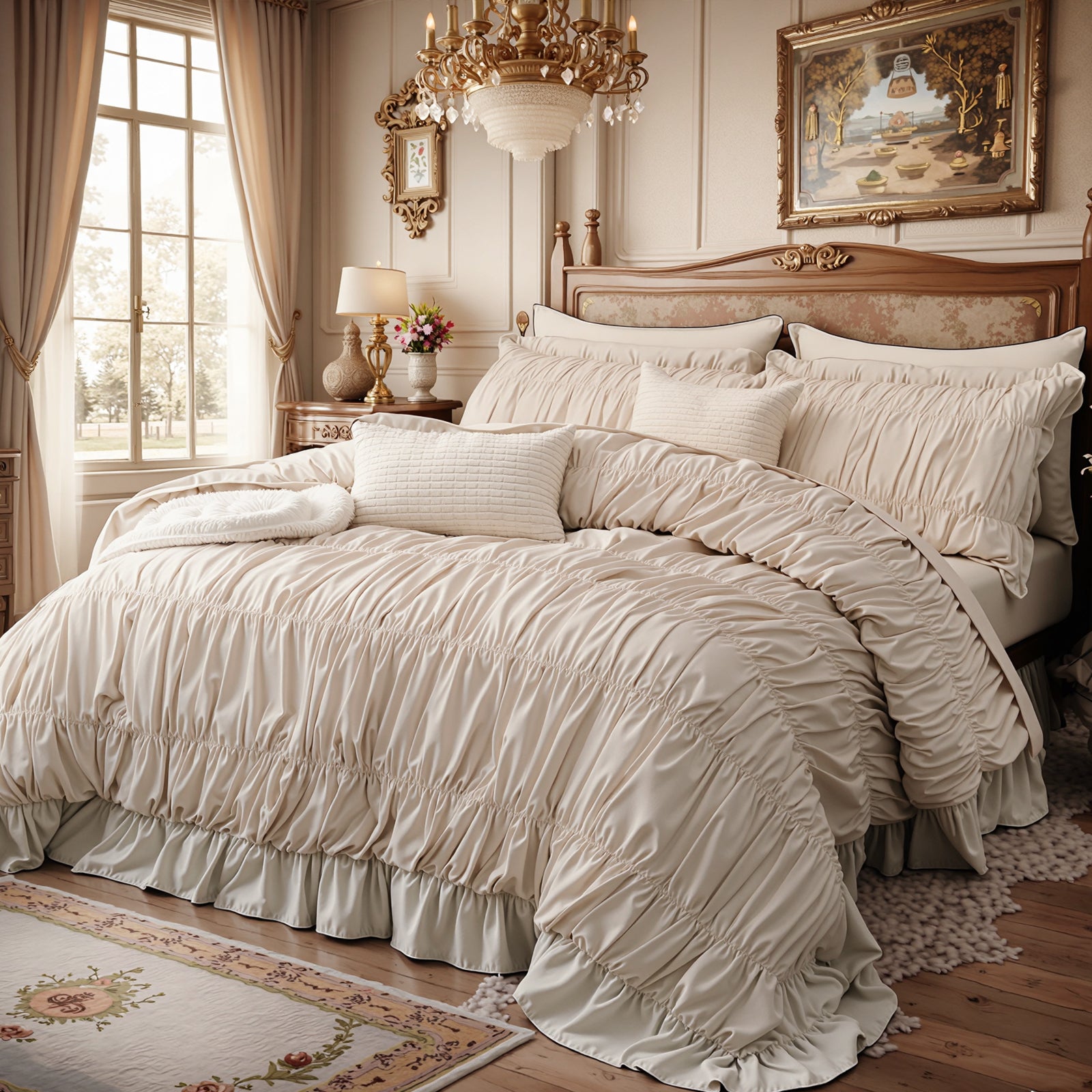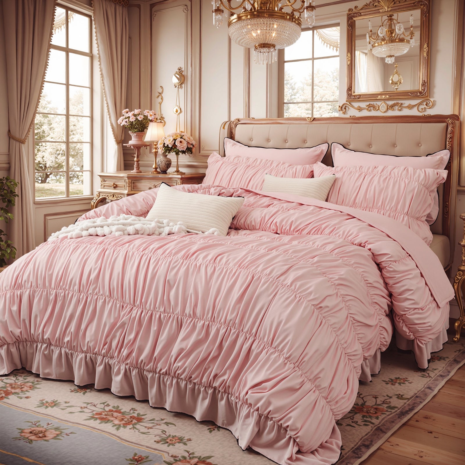 Romantic Bedroom Decor:In addition to the unique ruched trim, we've also sewn ruffles around the quilt to create a romantic and luxurious visual for your bedroom. Those beautiful ruffles and elegant pleats add a sense of romance. We also paired it with matching pillowcases to create an elegant and stylish look in your bedroom