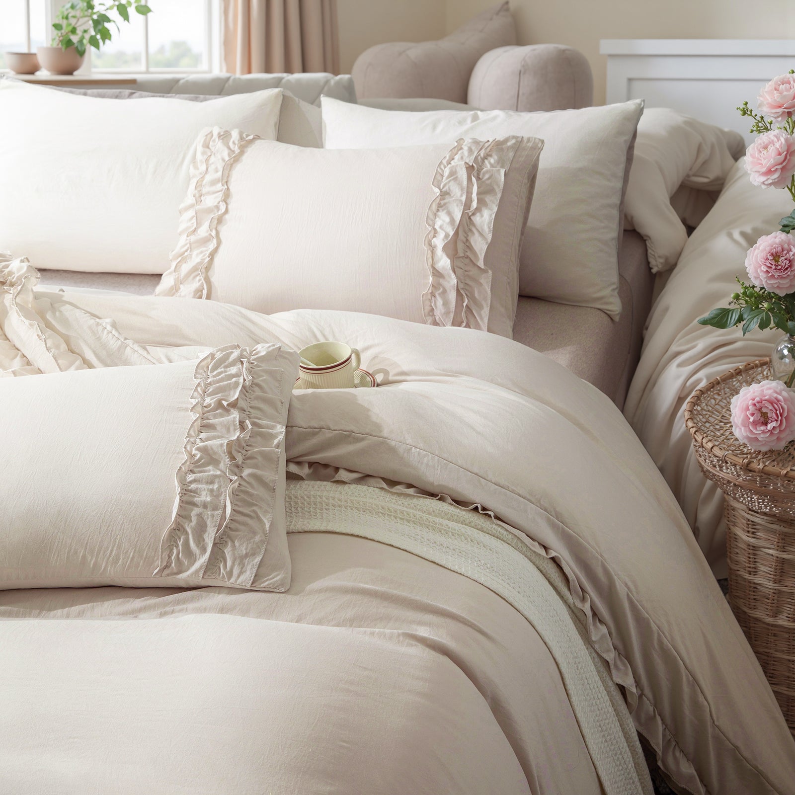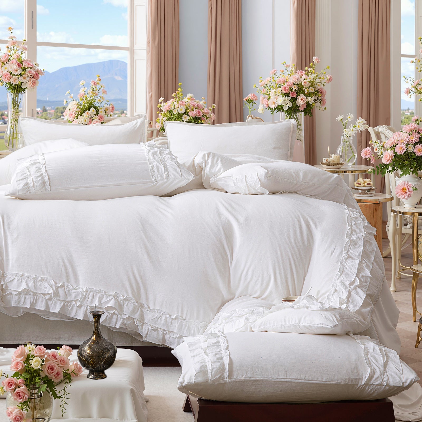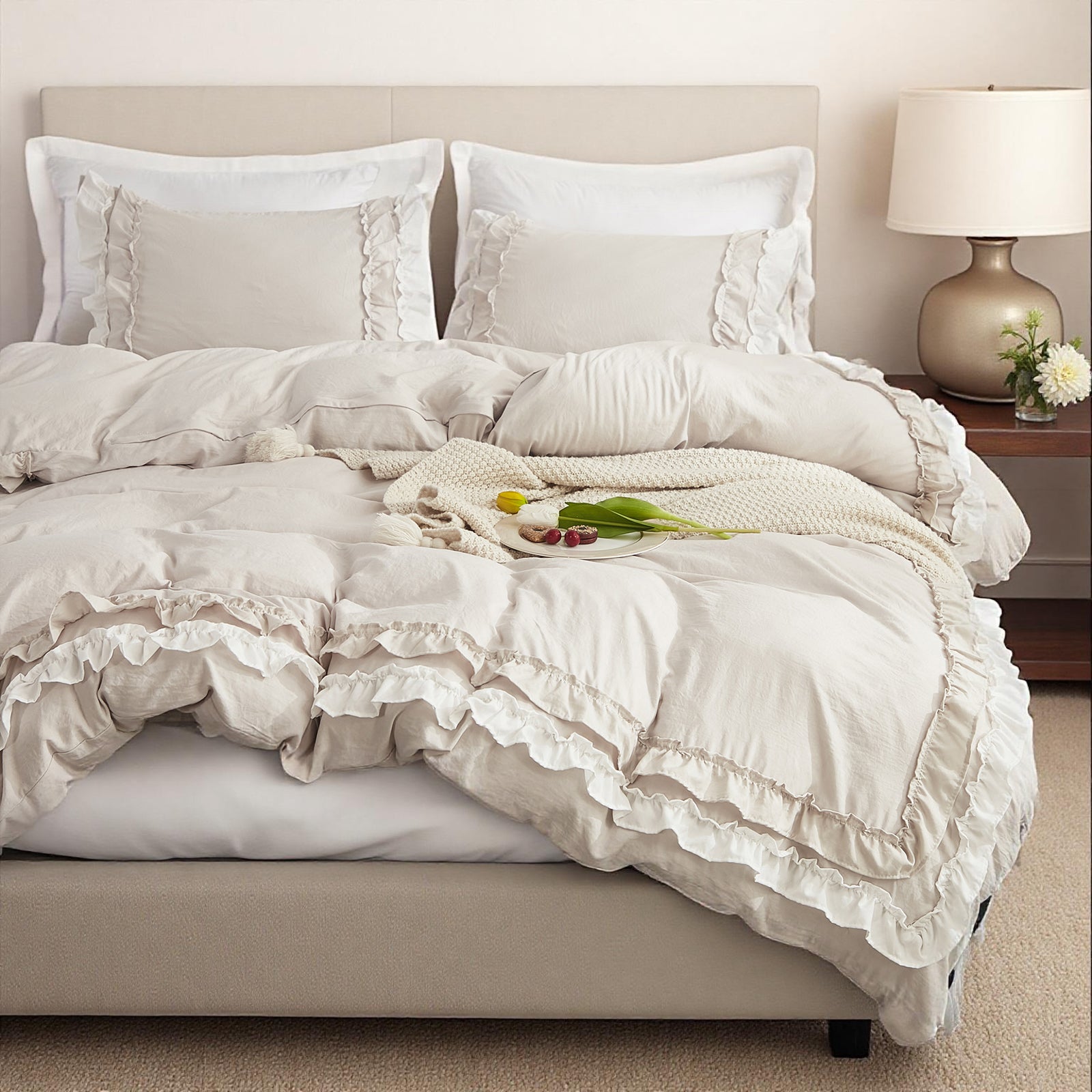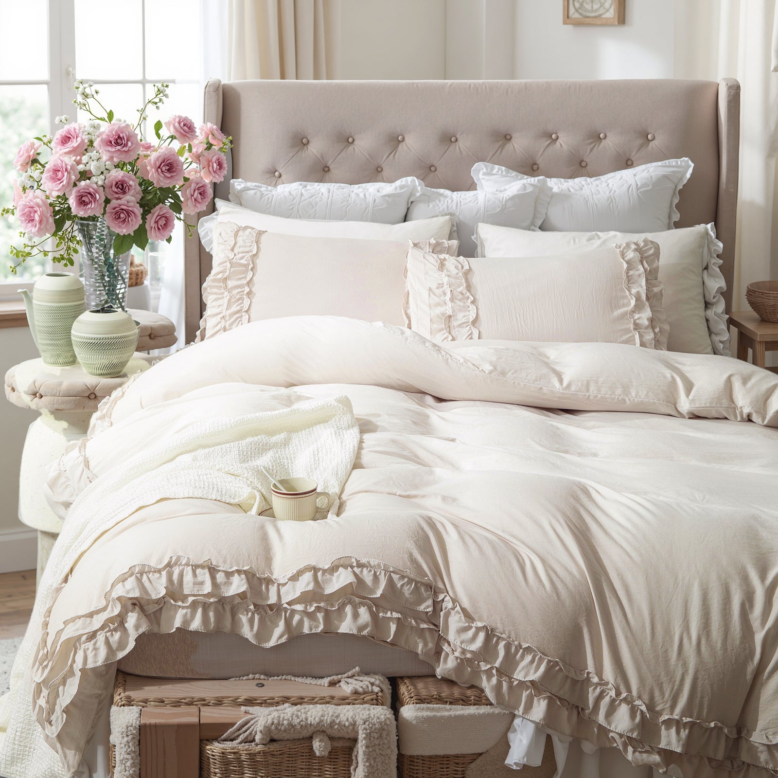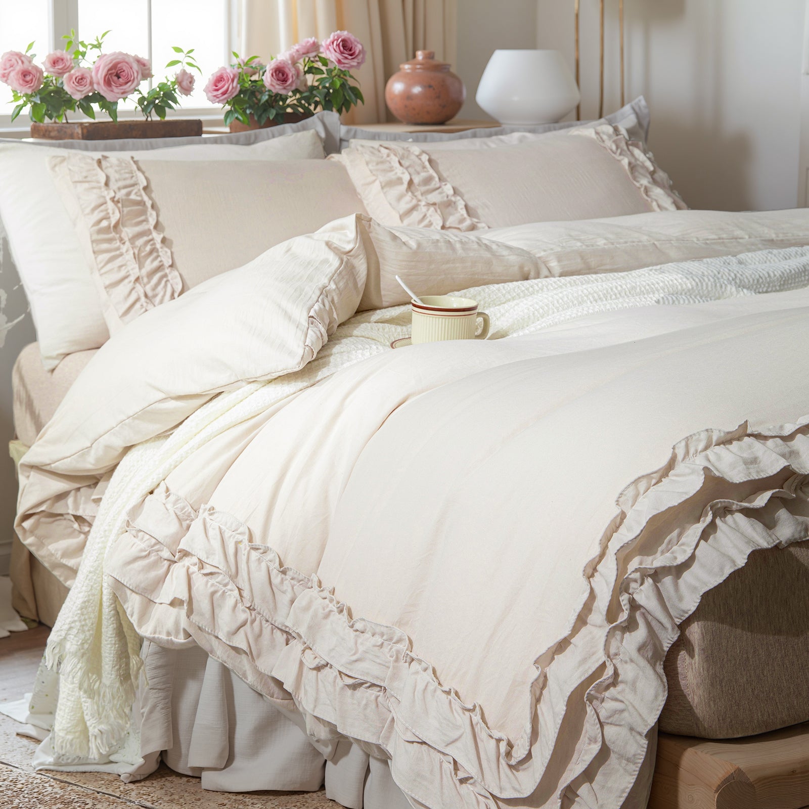 Refresh your bedroom with the Ruffle Duvet Cover Set, designed with delicate pleated ruffles that bring a chic, romantic flair to your space. Perfect for farmhouse, boho, or shabby chic décor, this bedding adds soft elegance and a cozy cottage vibe.