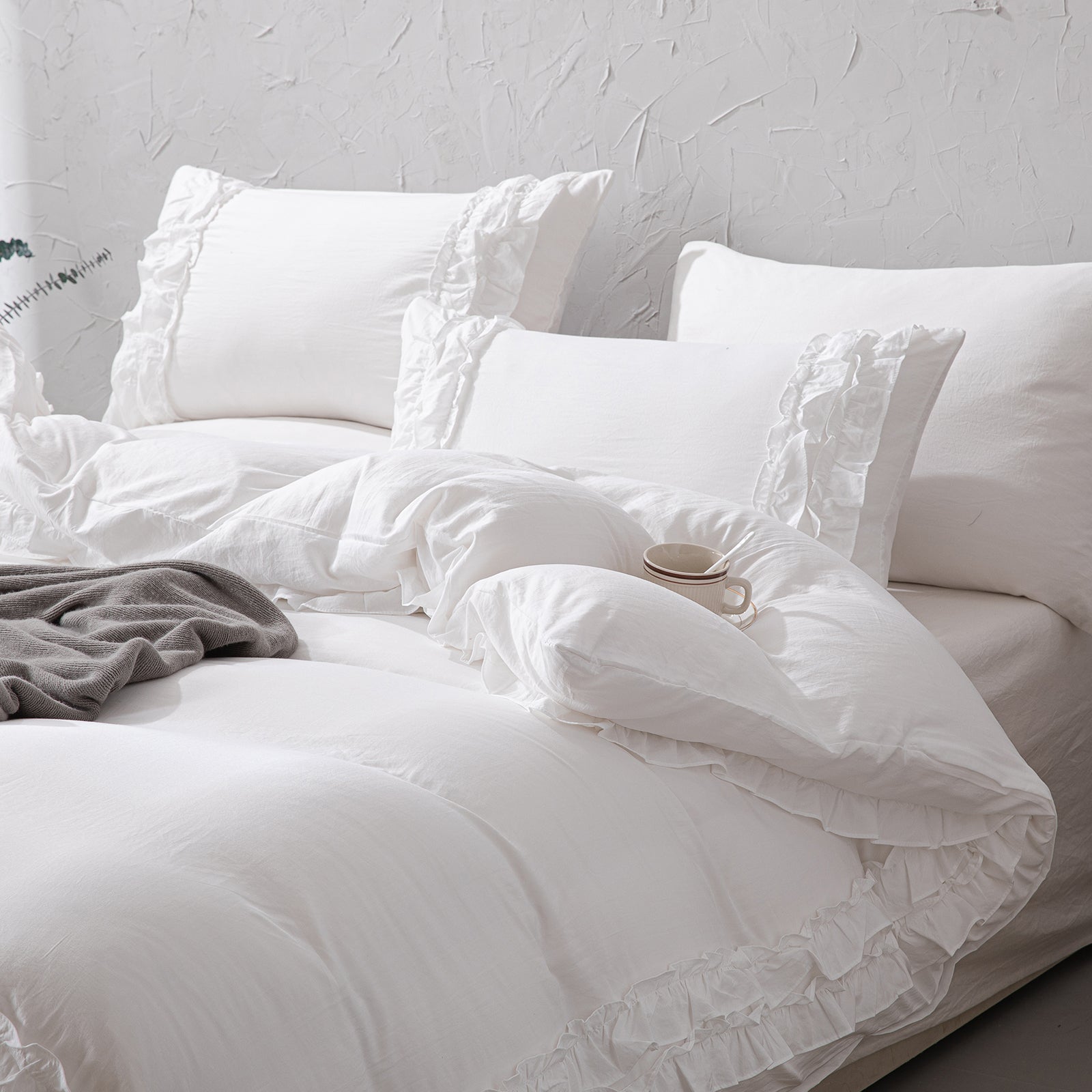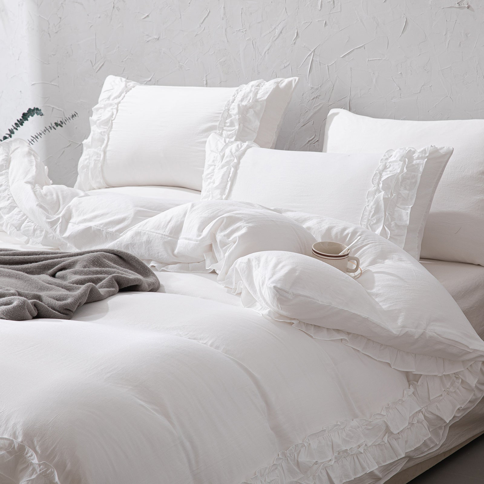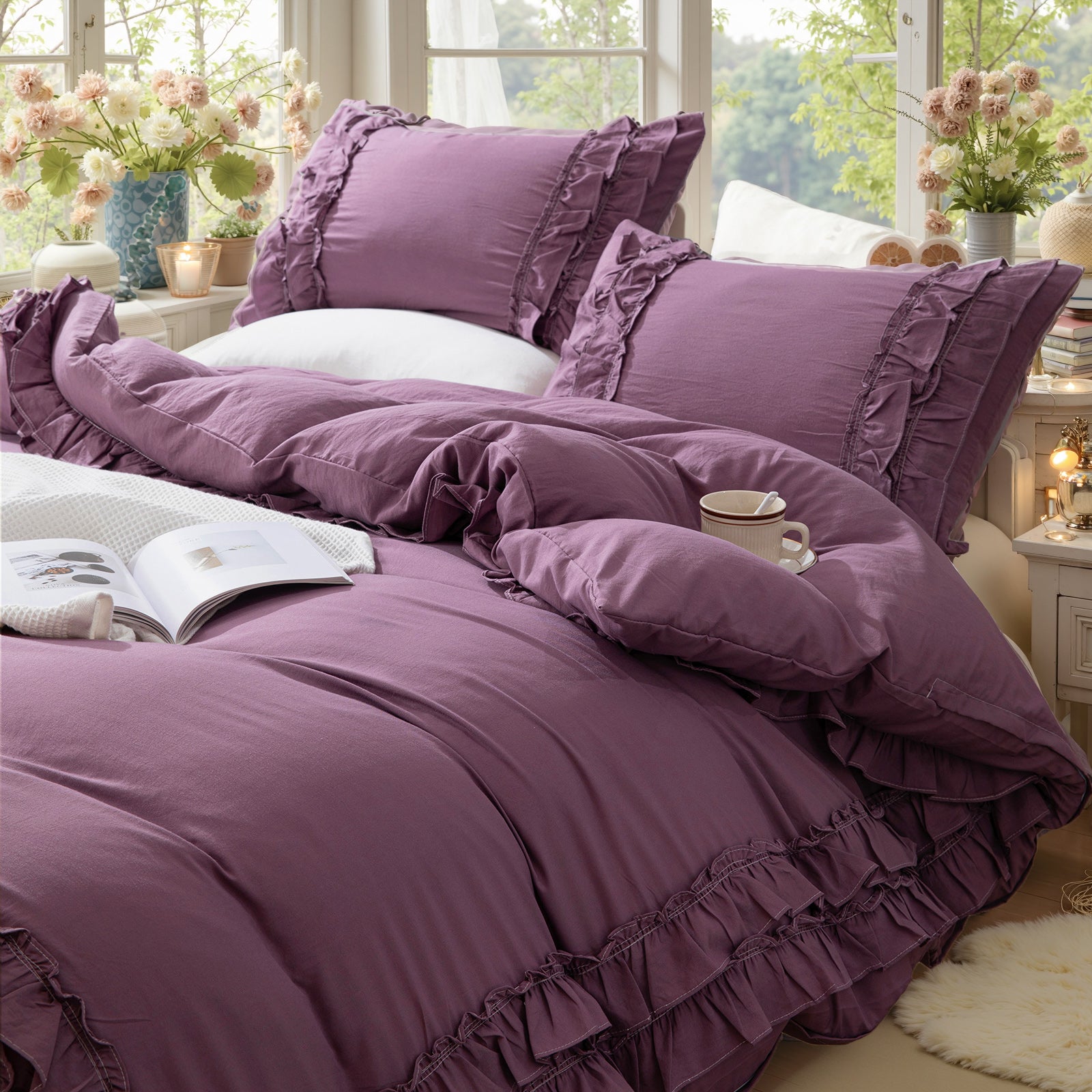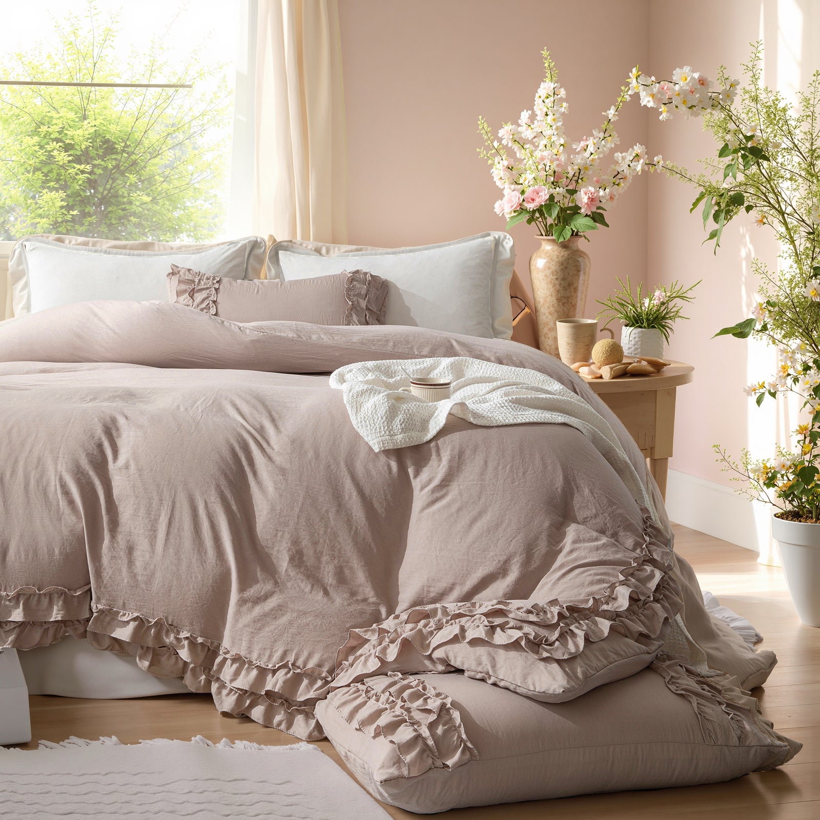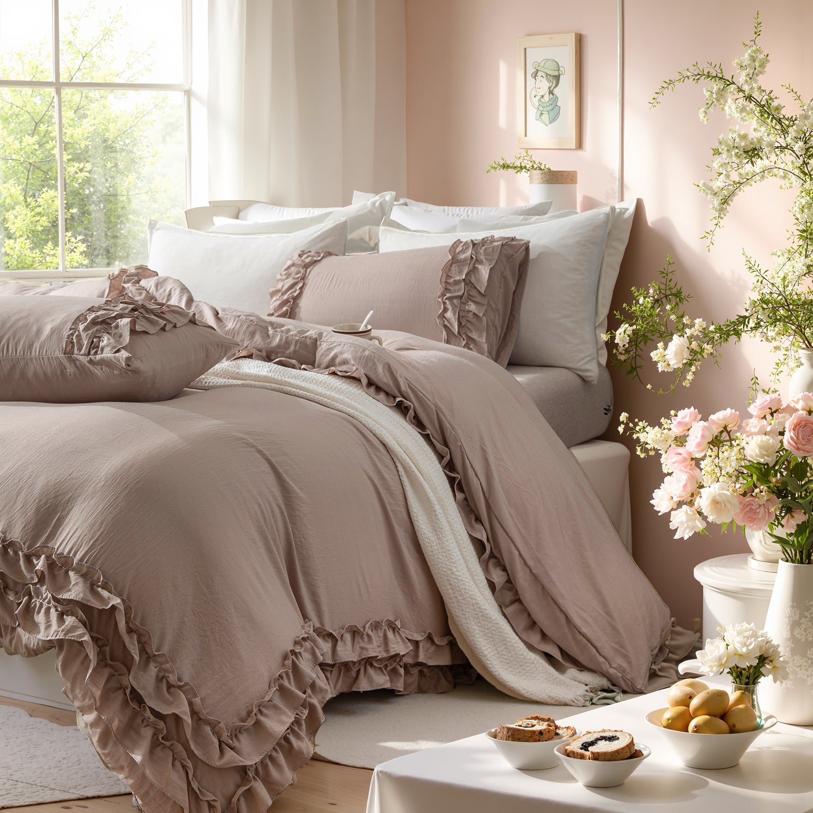 Refresh your bedroom with the Ruffle Duvet Cover Set, designed with delicate pleated ruffles that bring a chic, romantic flair to your space. Perfect for farmhouse, boho, or shabby chic décor, this bedding adds soft elegance and a cozy cottage vibe.