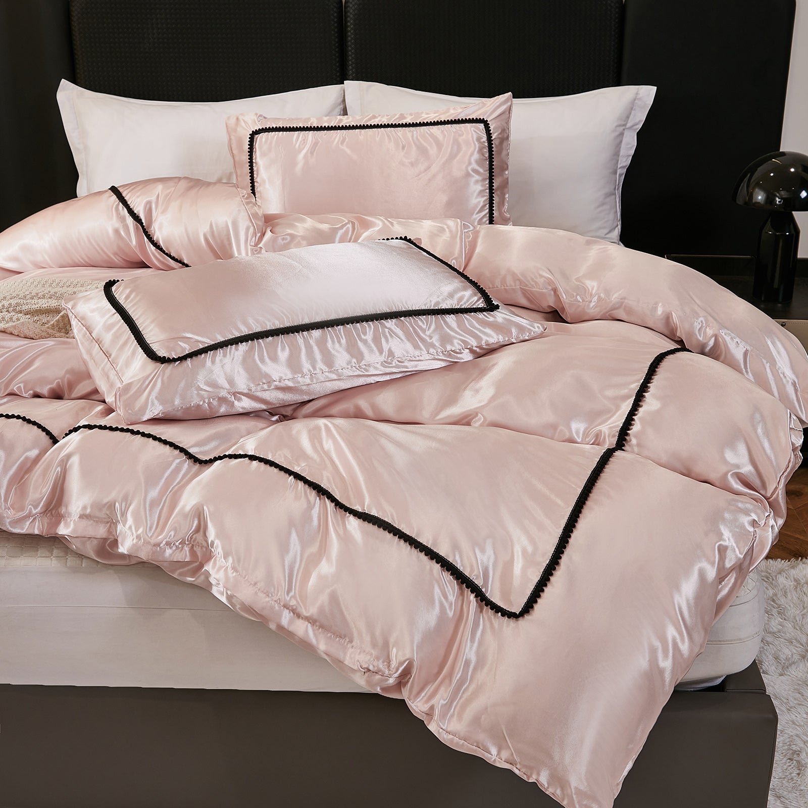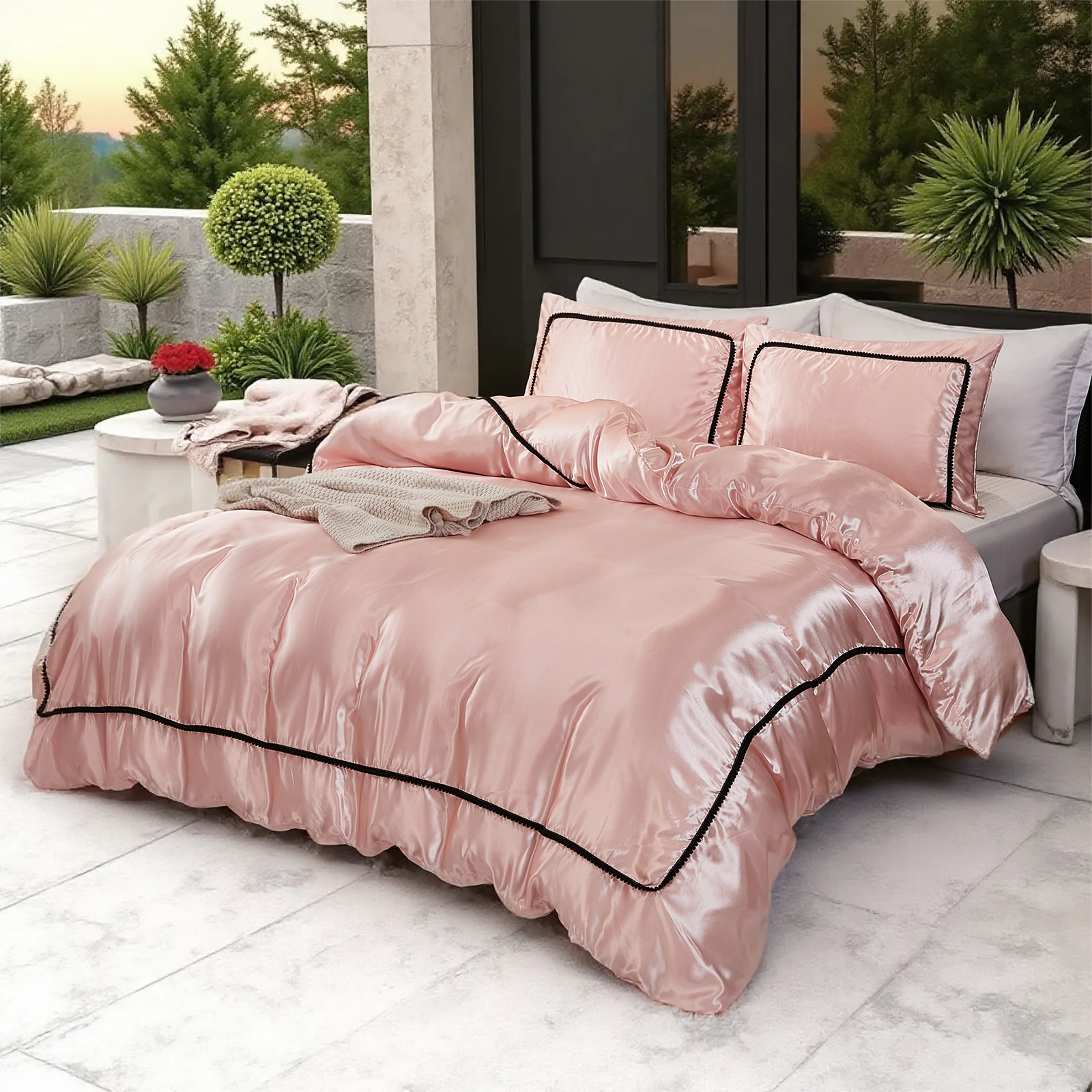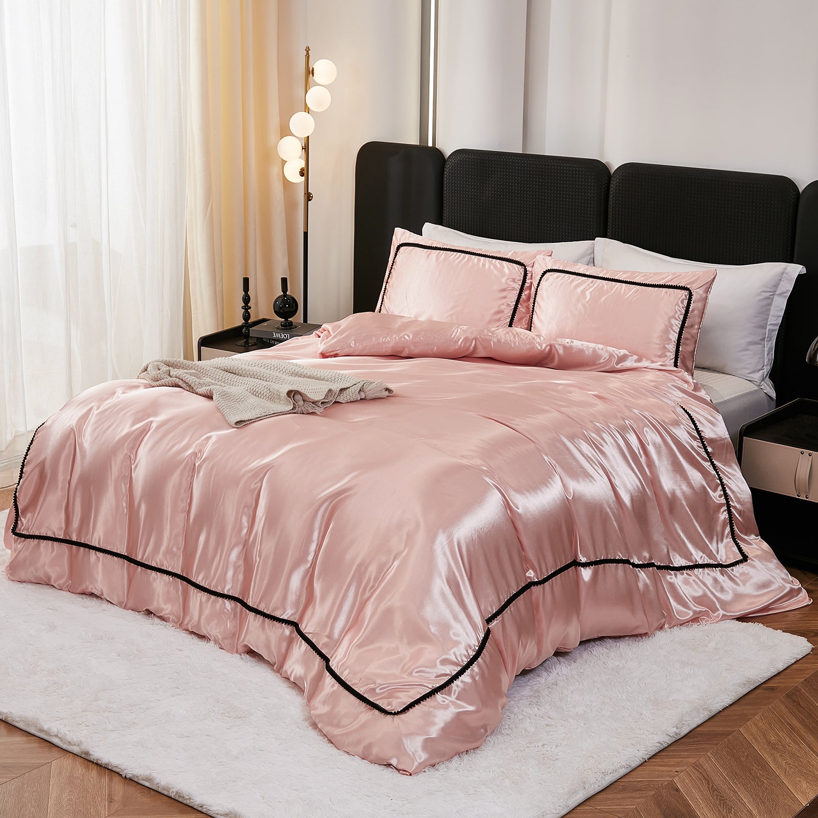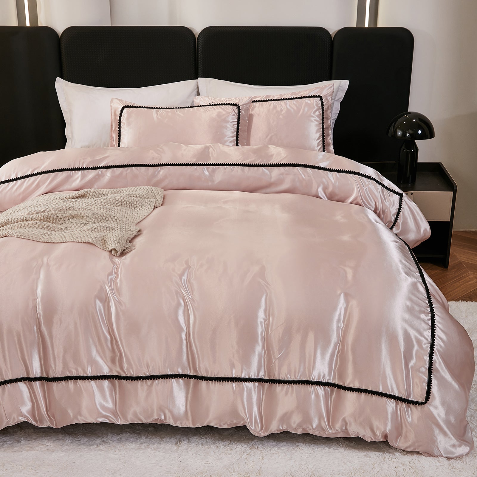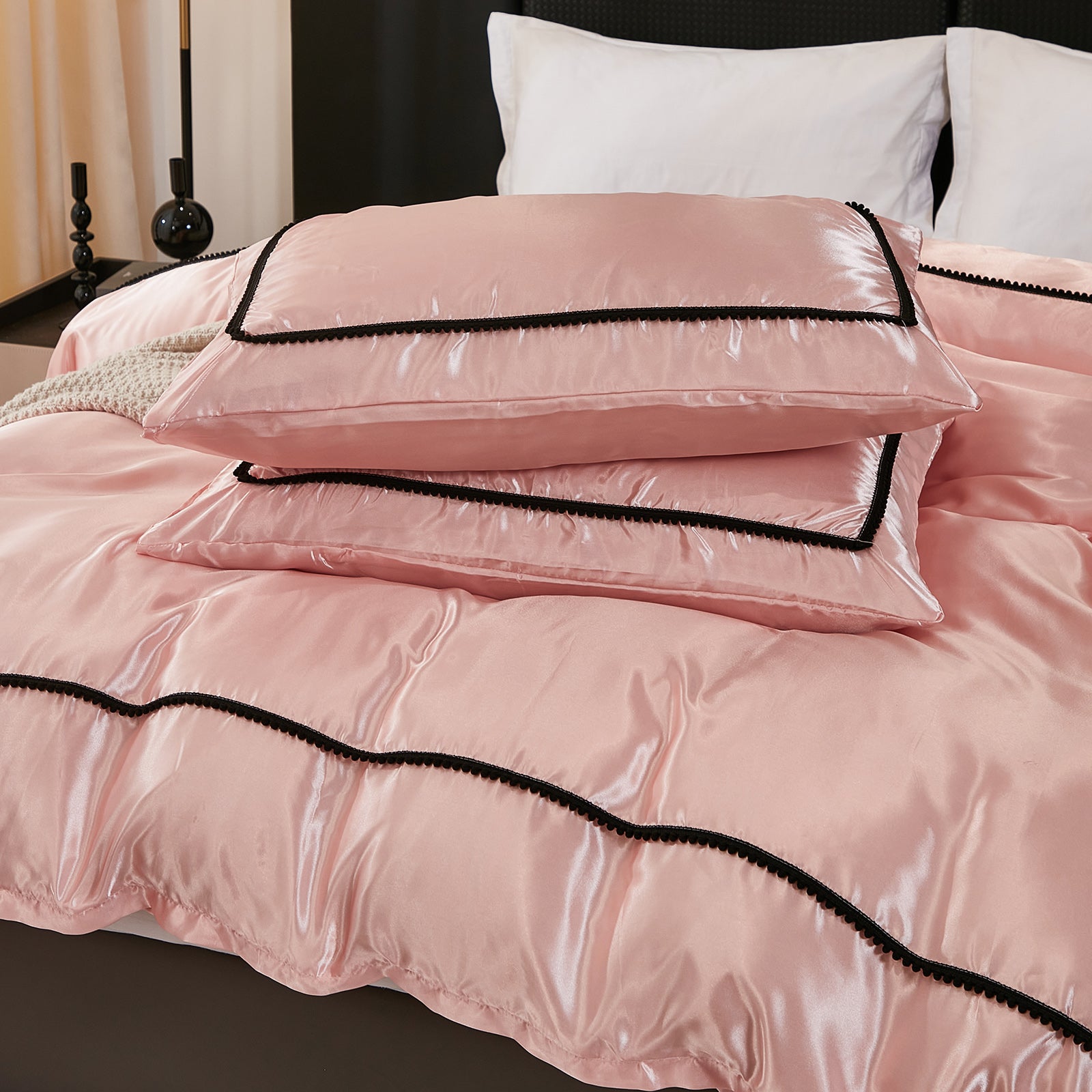 Made from luxurious satin fabric, the comforter has a silky smooth texture with a glossy finish, bringing a sophisticated look to any room. The unique square frame with mini pom pom trim adds playful elegance, making this set both chic and timeless.