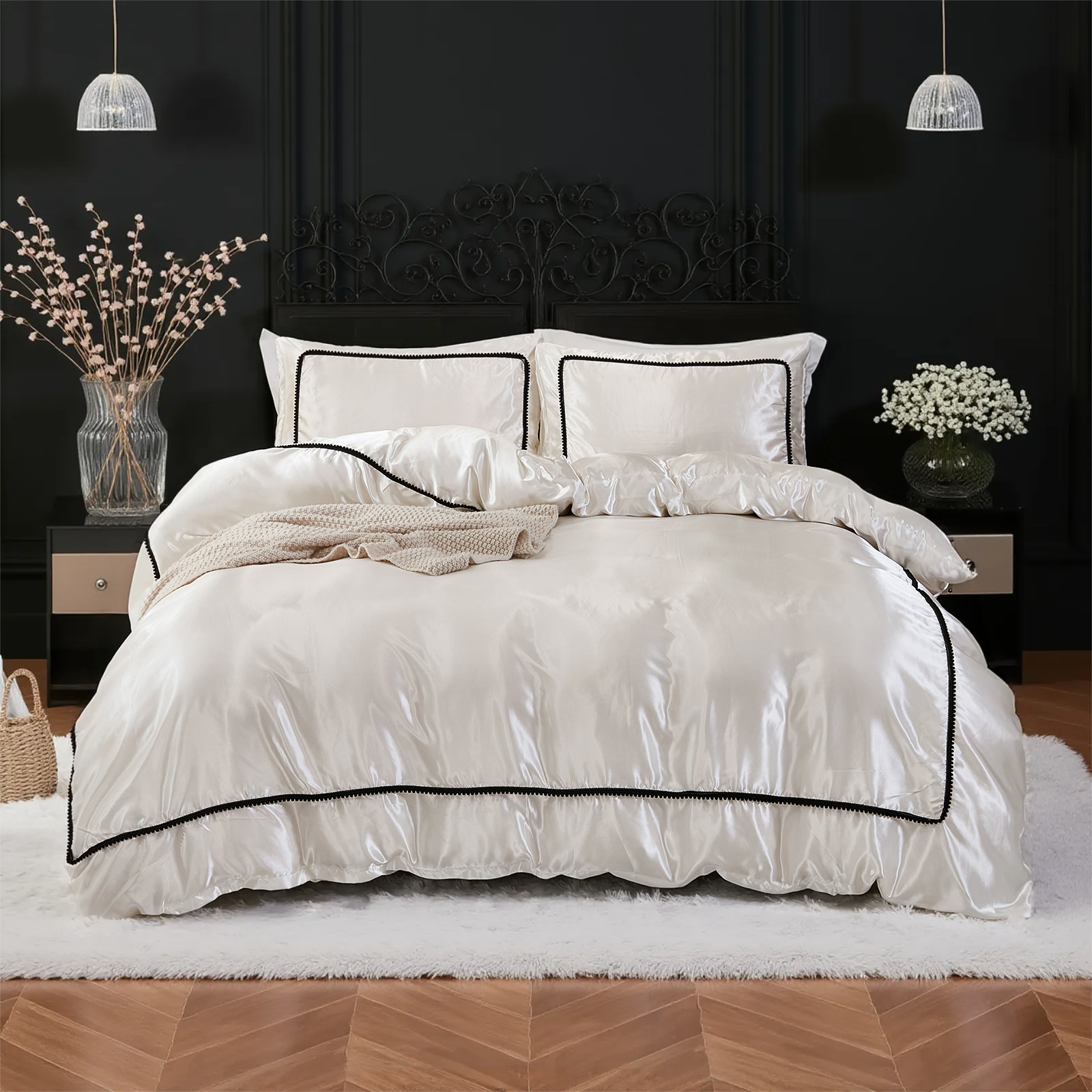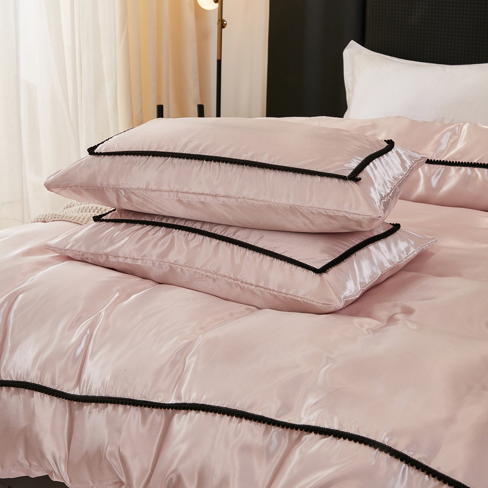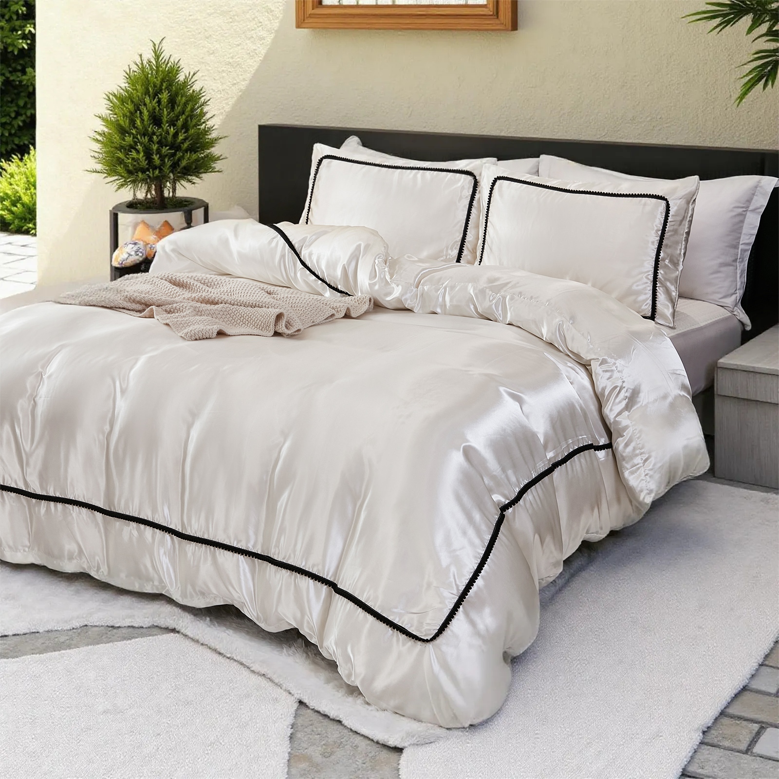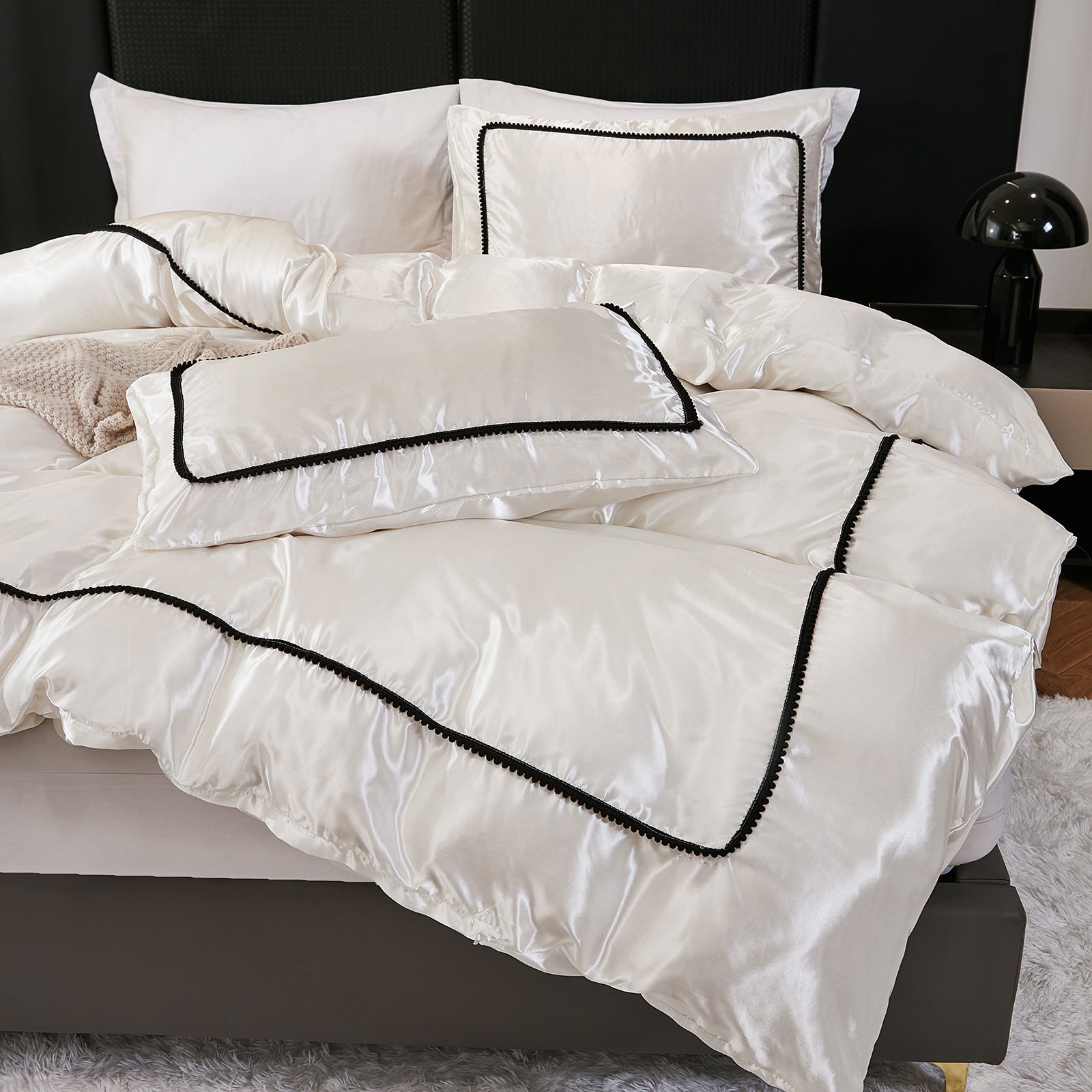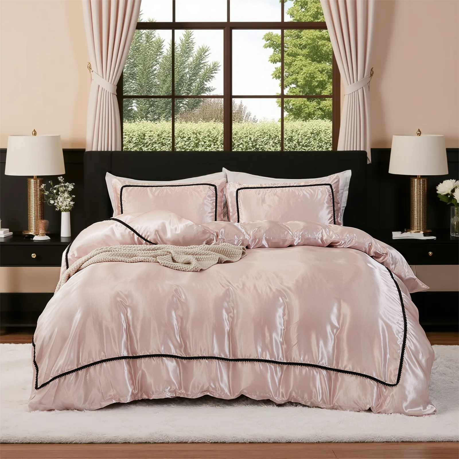 Made from luxurious satin fabric, the comforter has a silky smooth texture with a glossy finish, bringing a sophisticated look to any room. The unique square frame with mini pom pom trim adds playful elegance, making this set both chic and timeless.