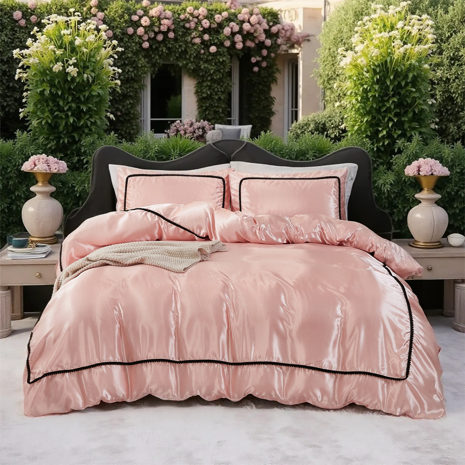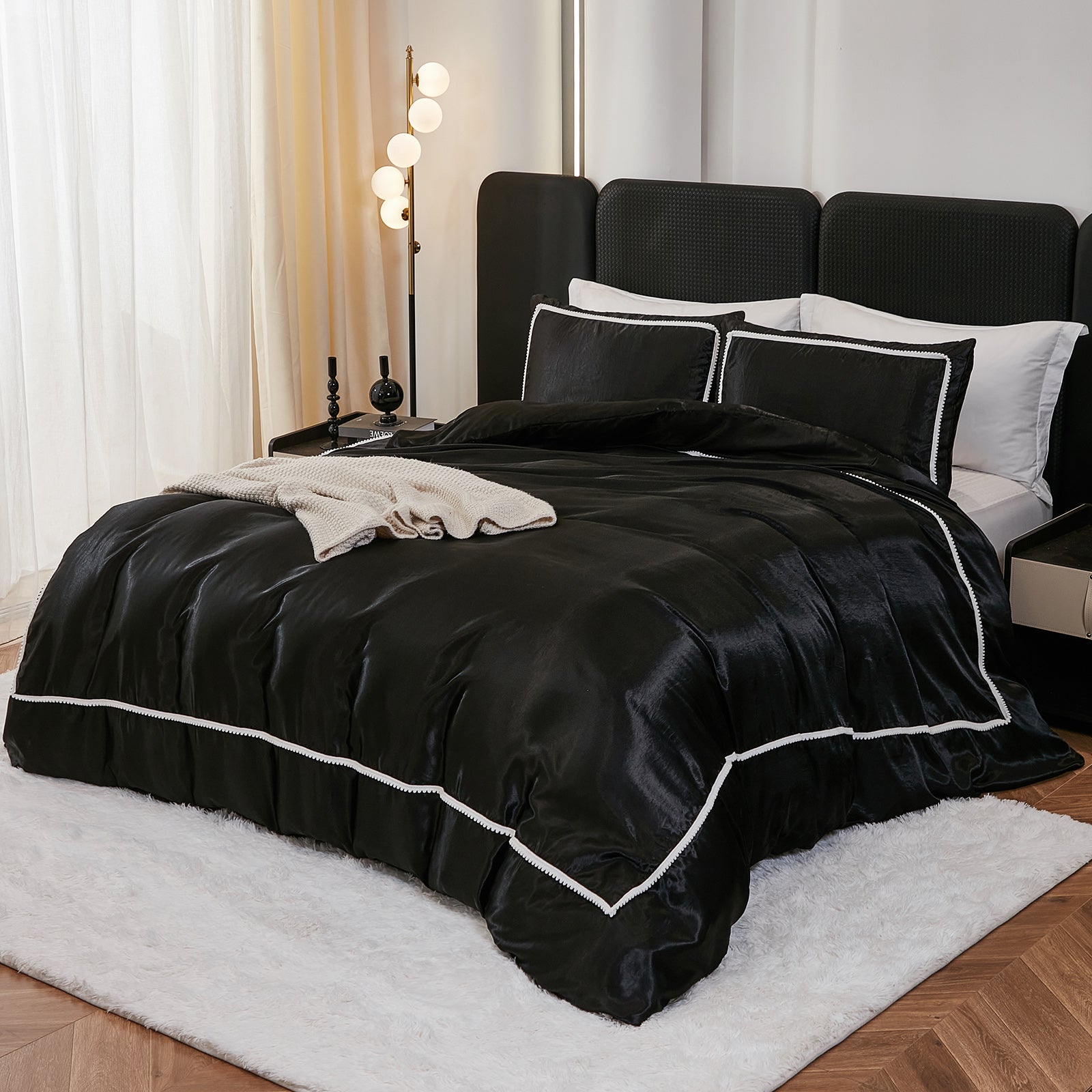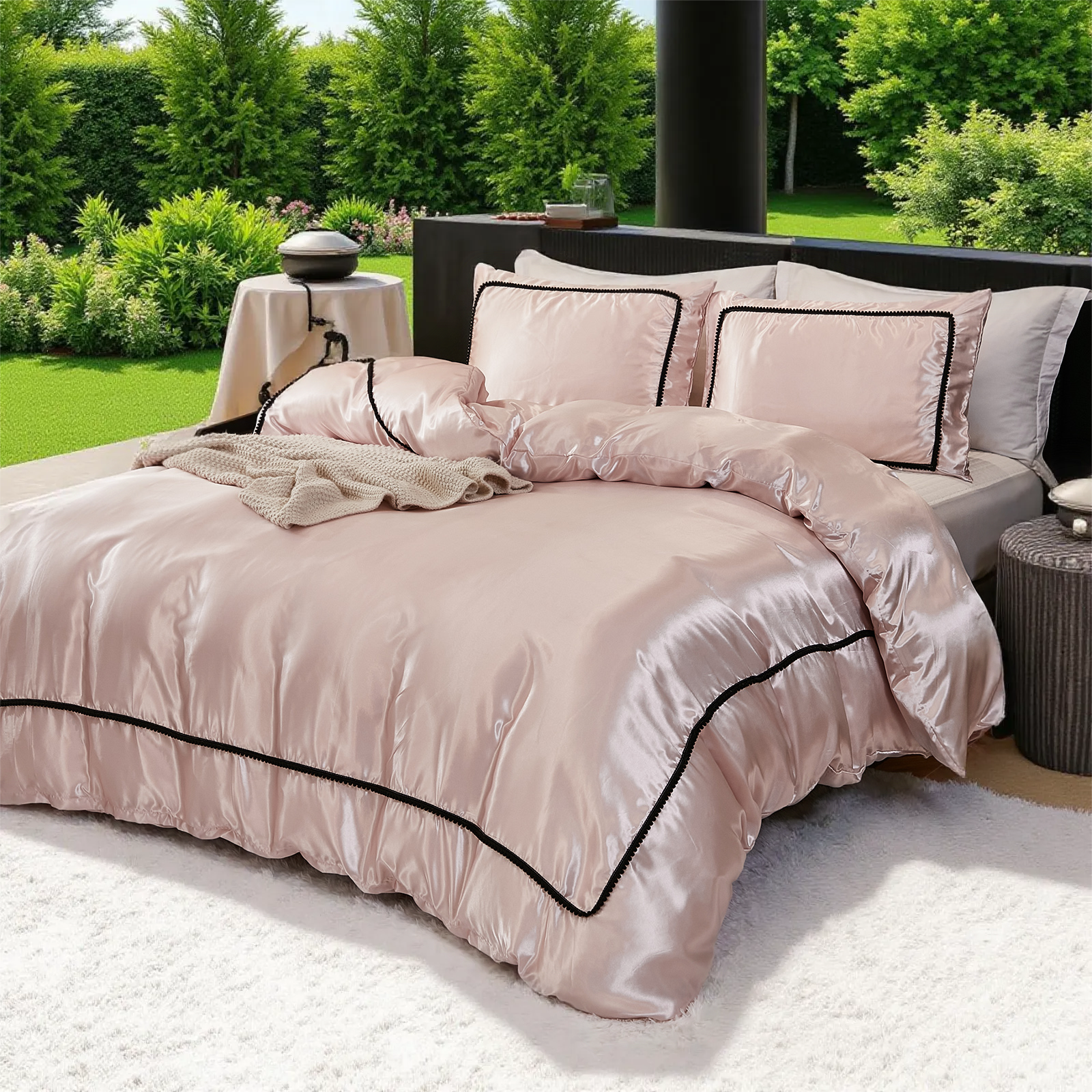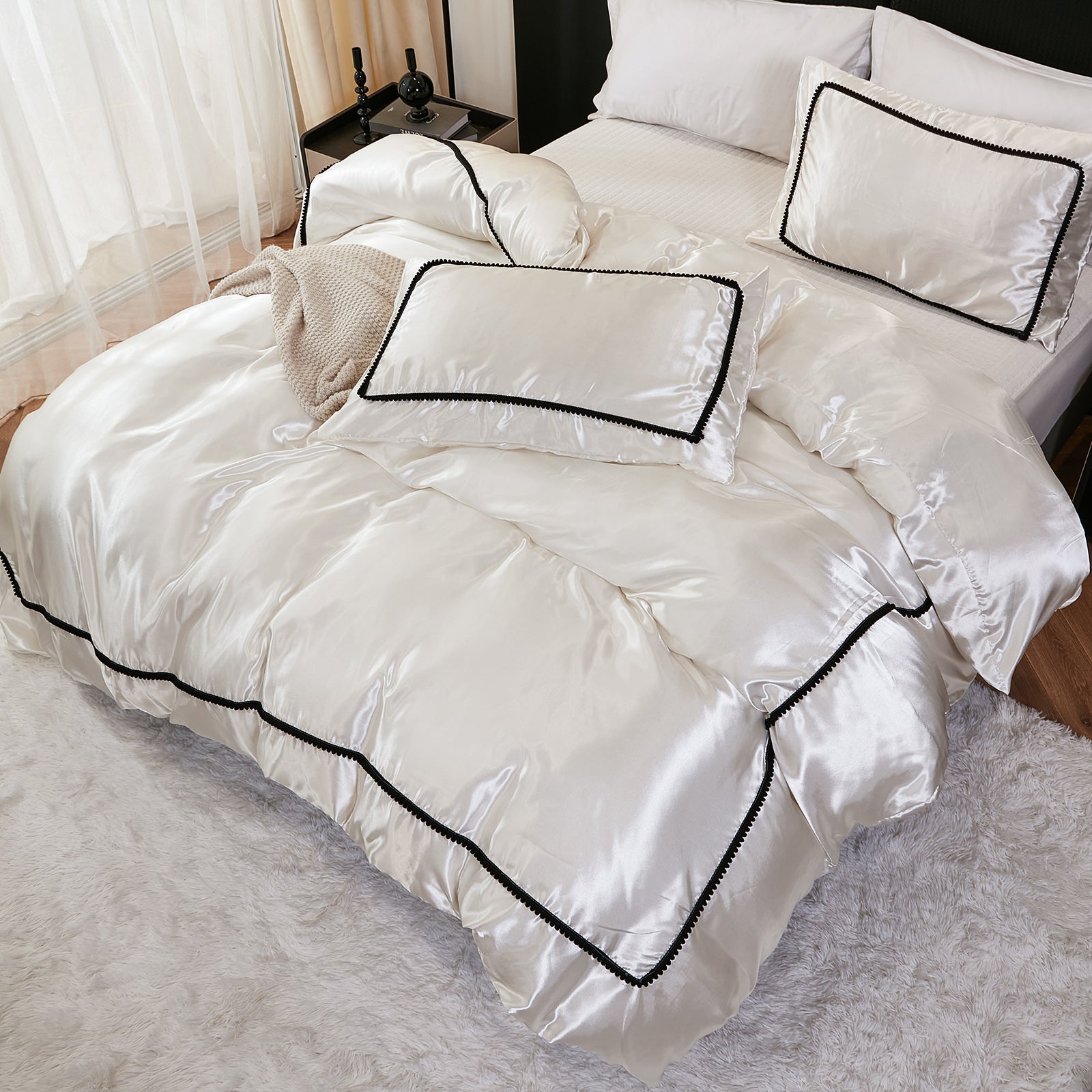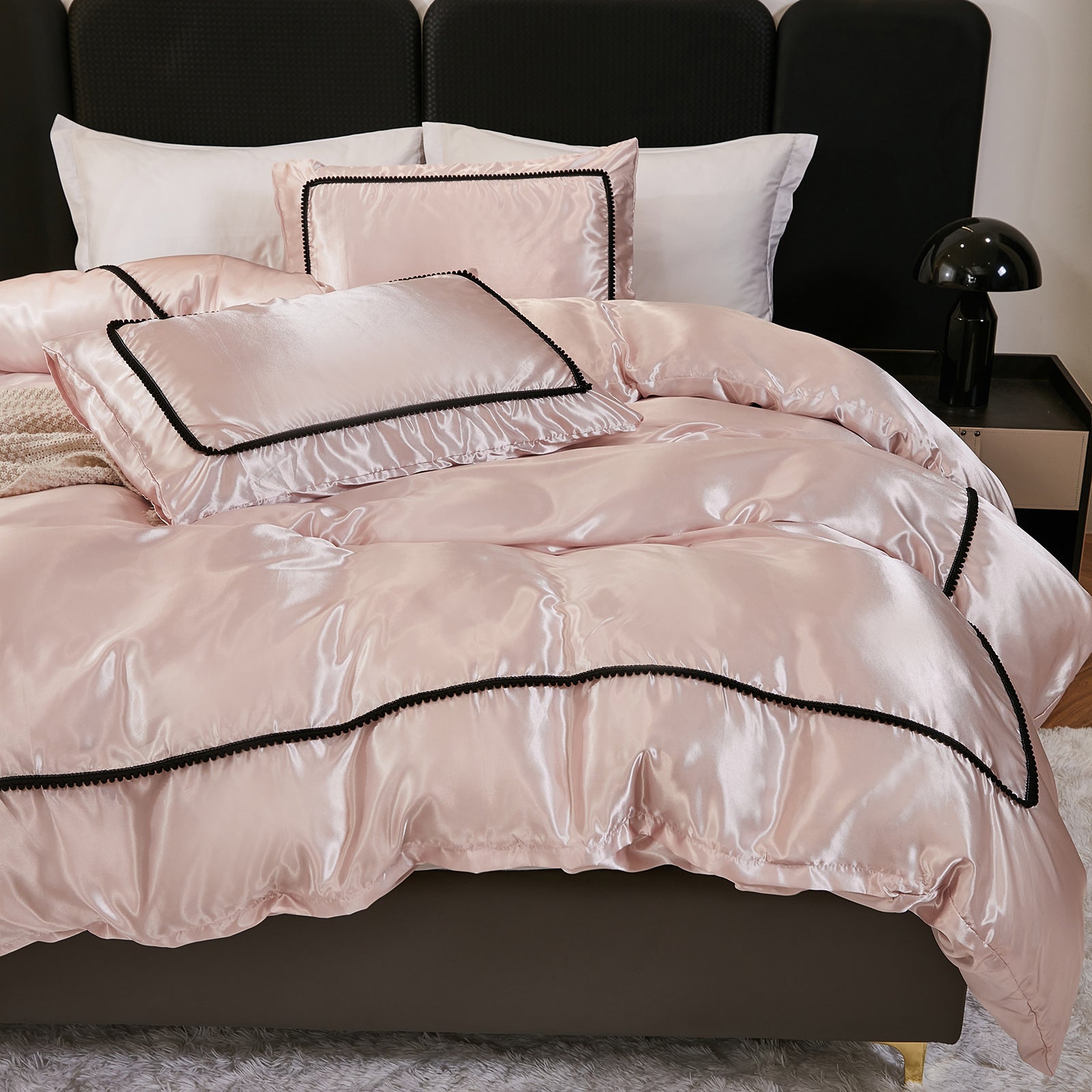 Made from luxurious satin fabric, the comforter has a silky smooth texture with a glossy finish, bringing a sophisticated look to any room. The unique square frame with mini pom pom trim adds playful elegance, making this set both chic and timeless.