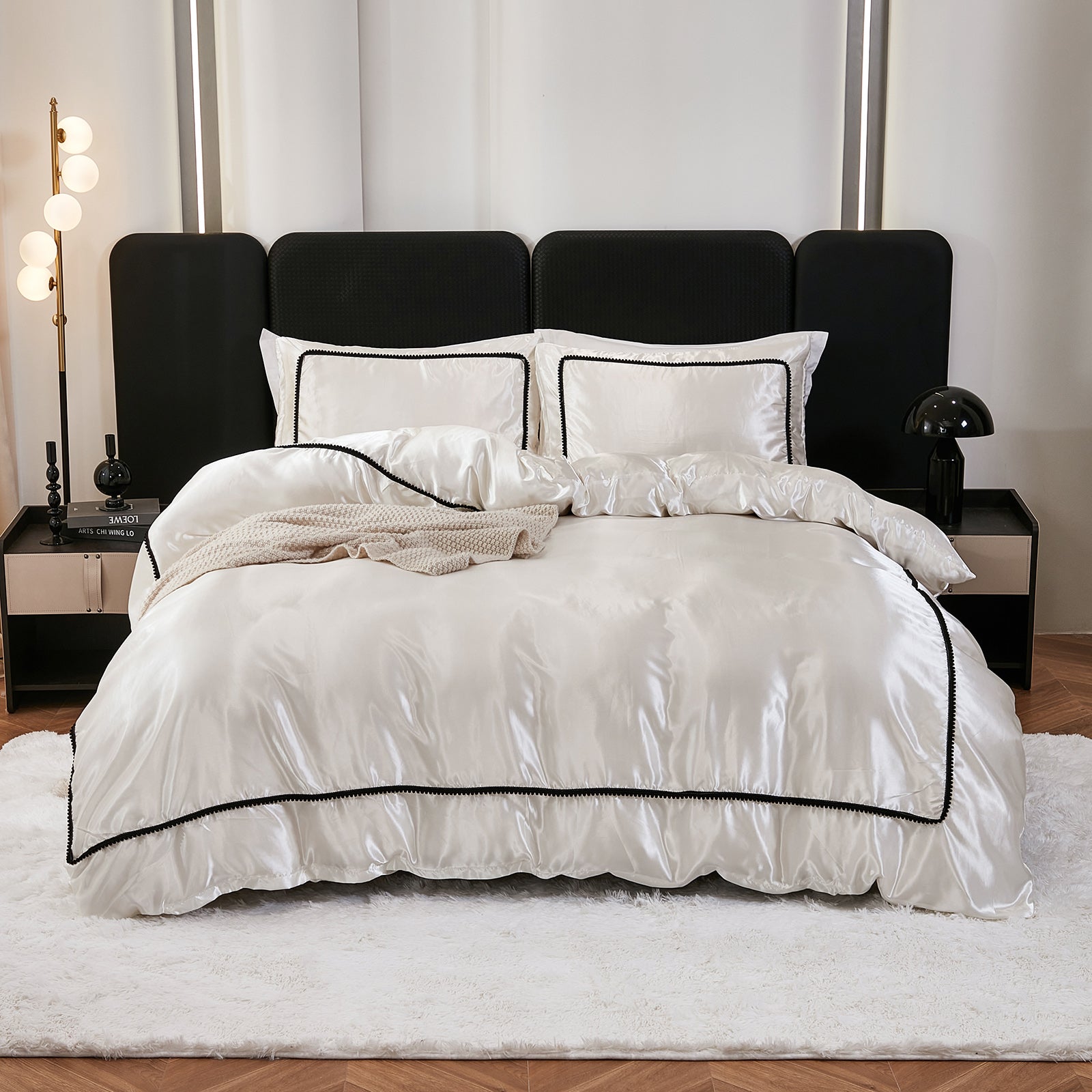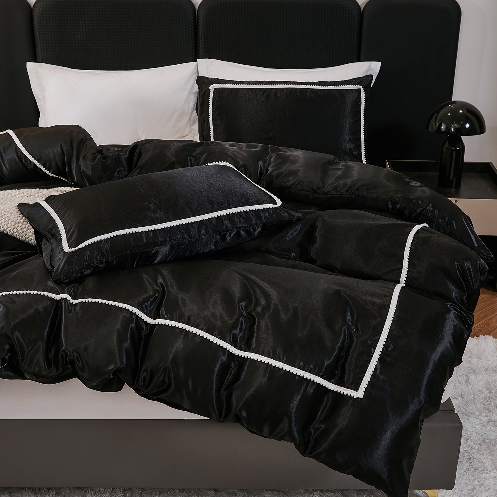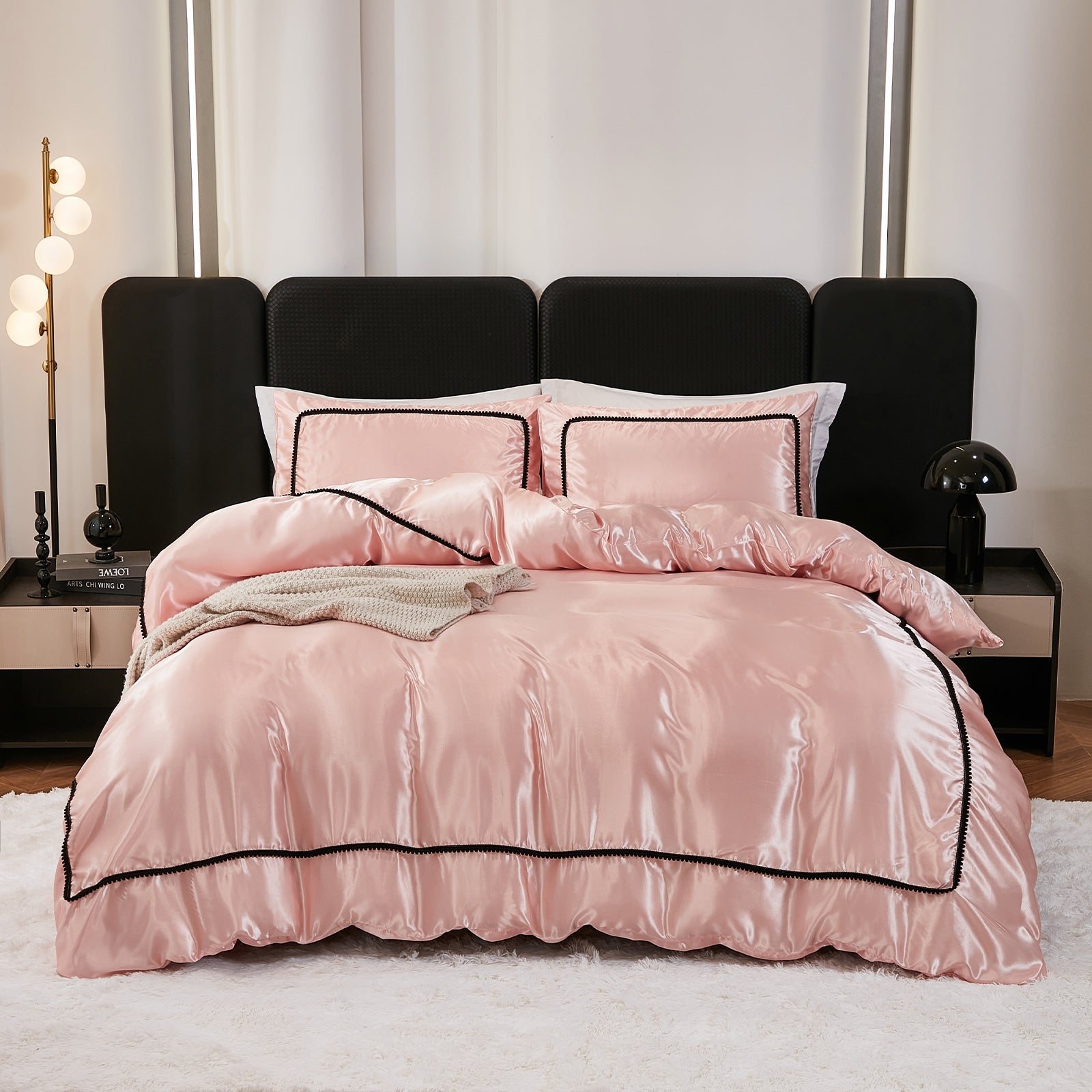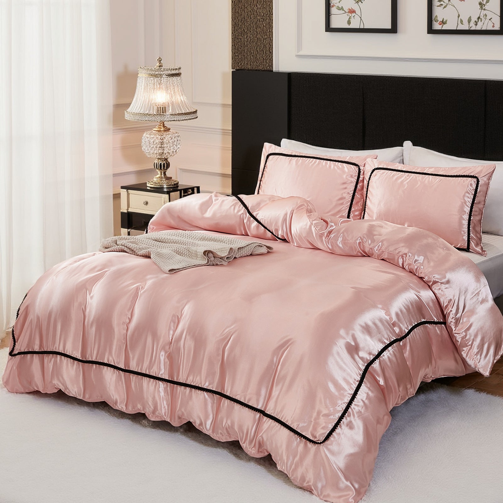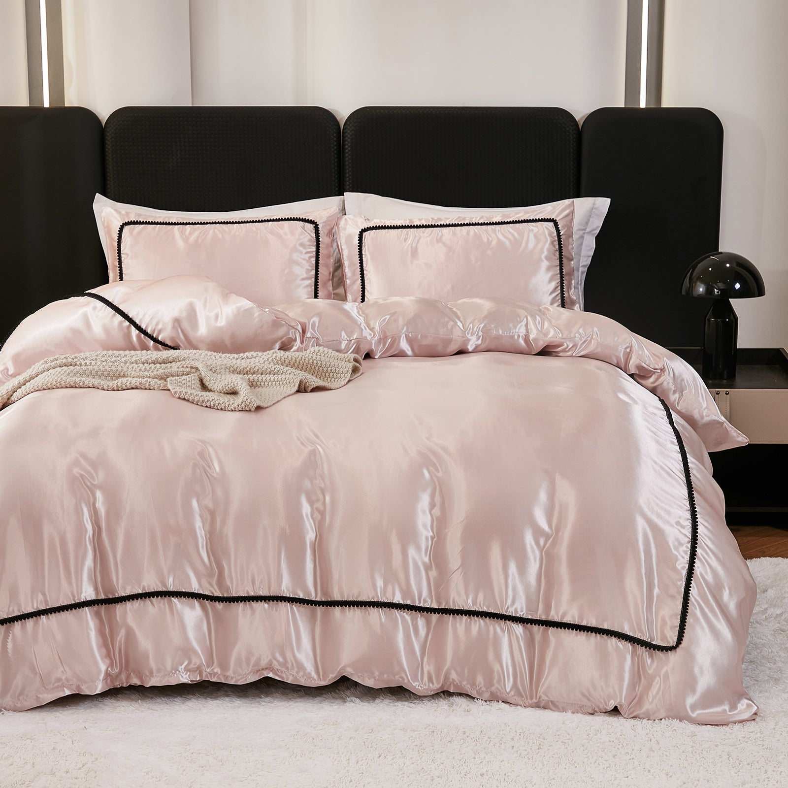 Made from luxurious satin fabric, the comforter has a silky smooth texture with a glossy finish, bringing a sophisticated look to any room. The unique square frame with mini pom pom trim adds playful elegance, making this set both chic and timeless.