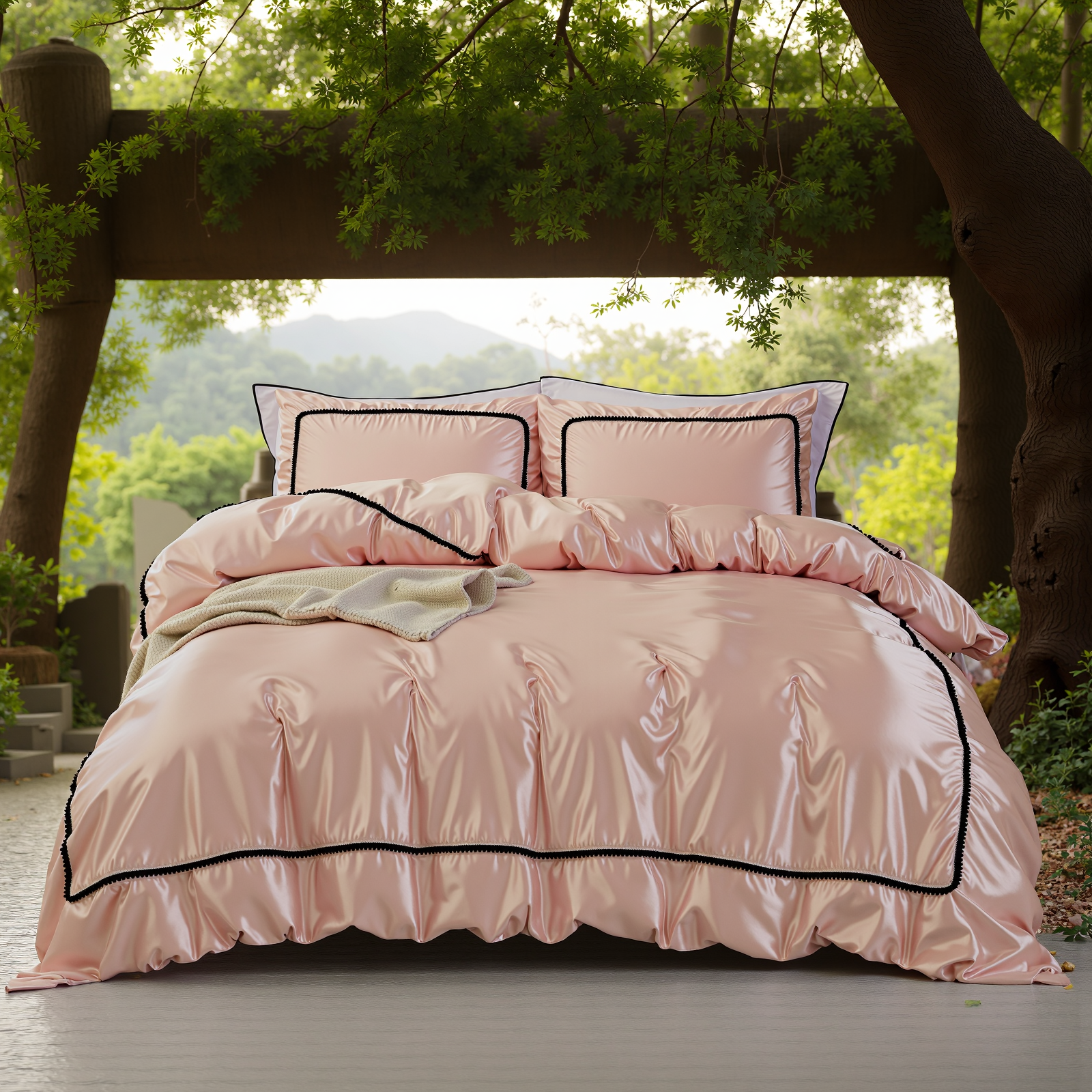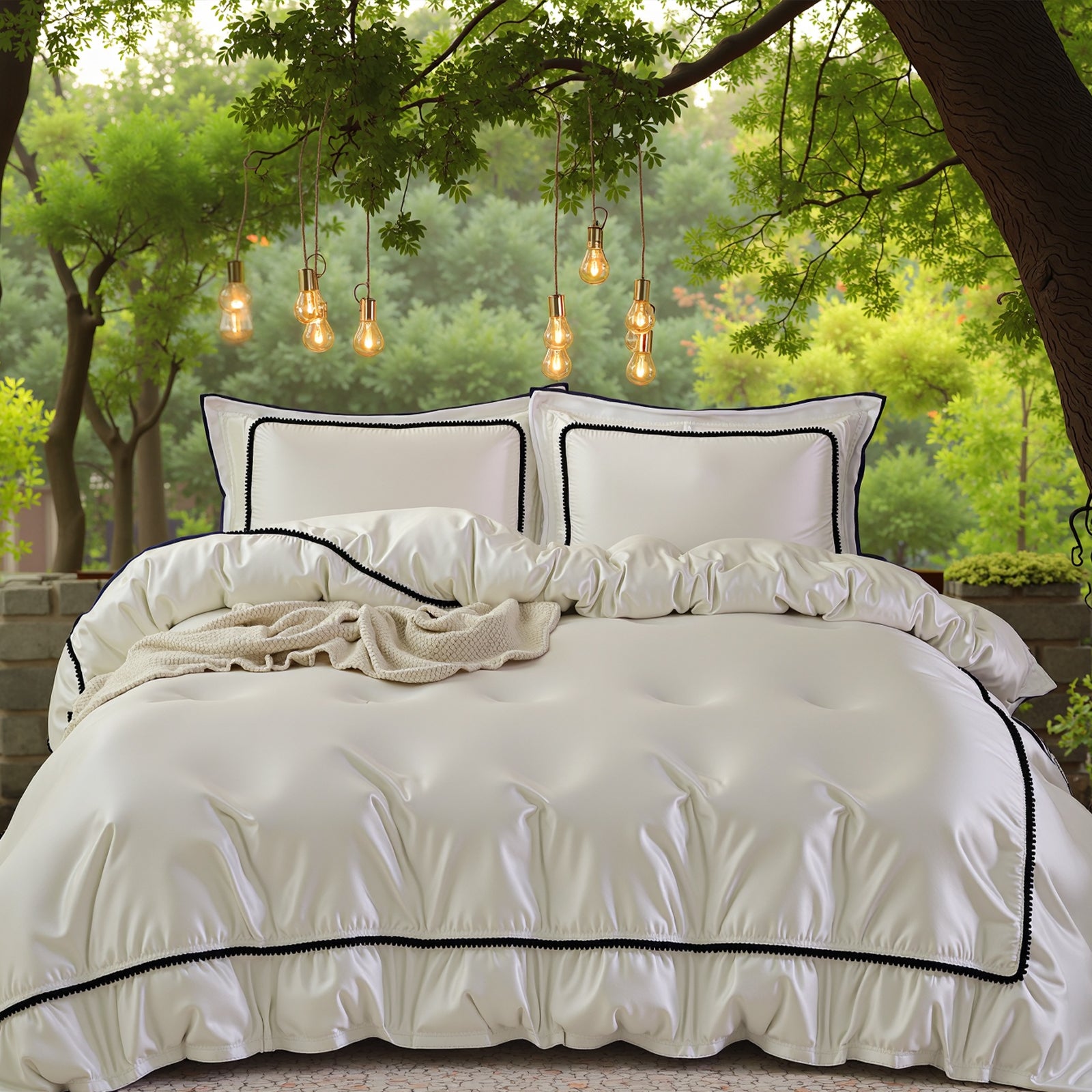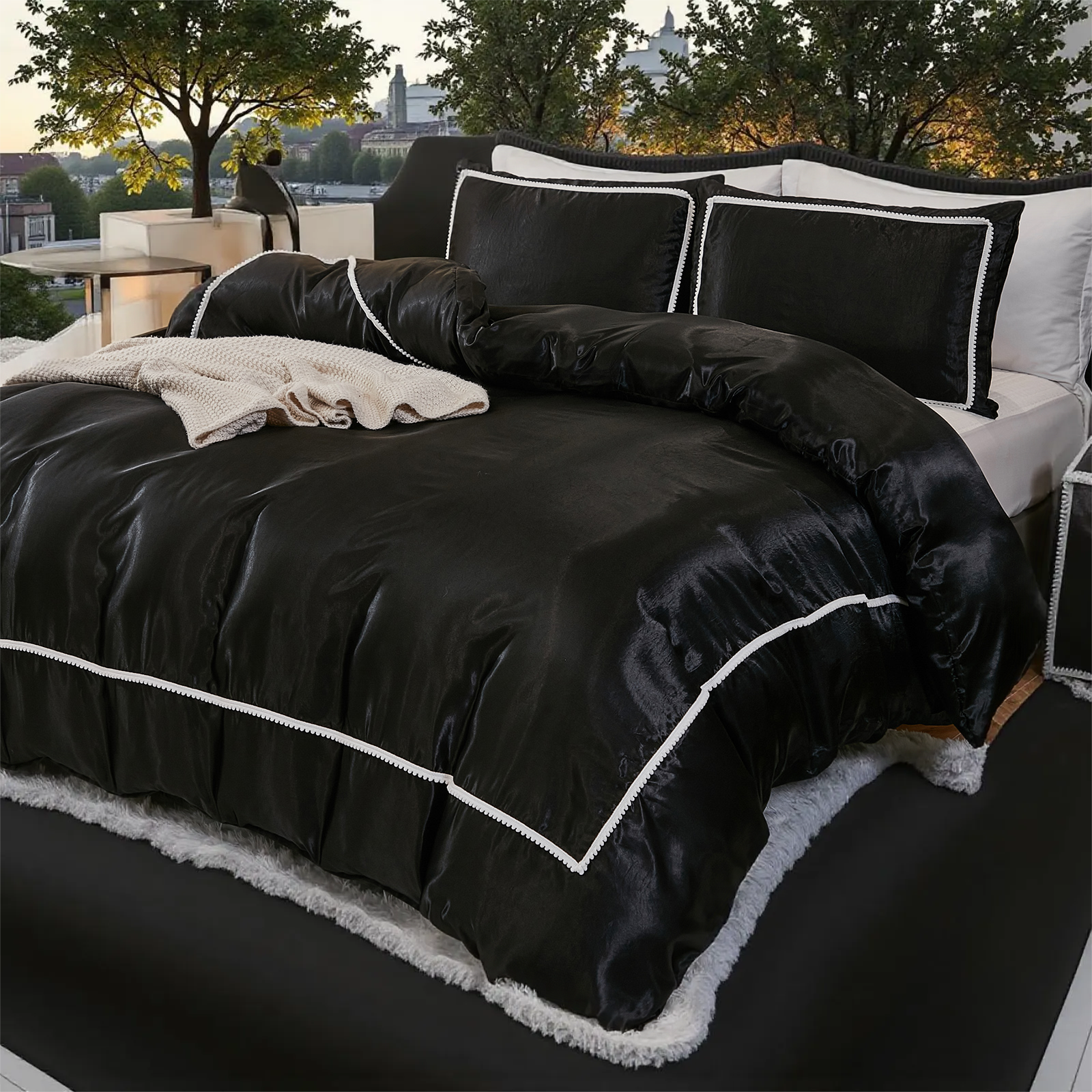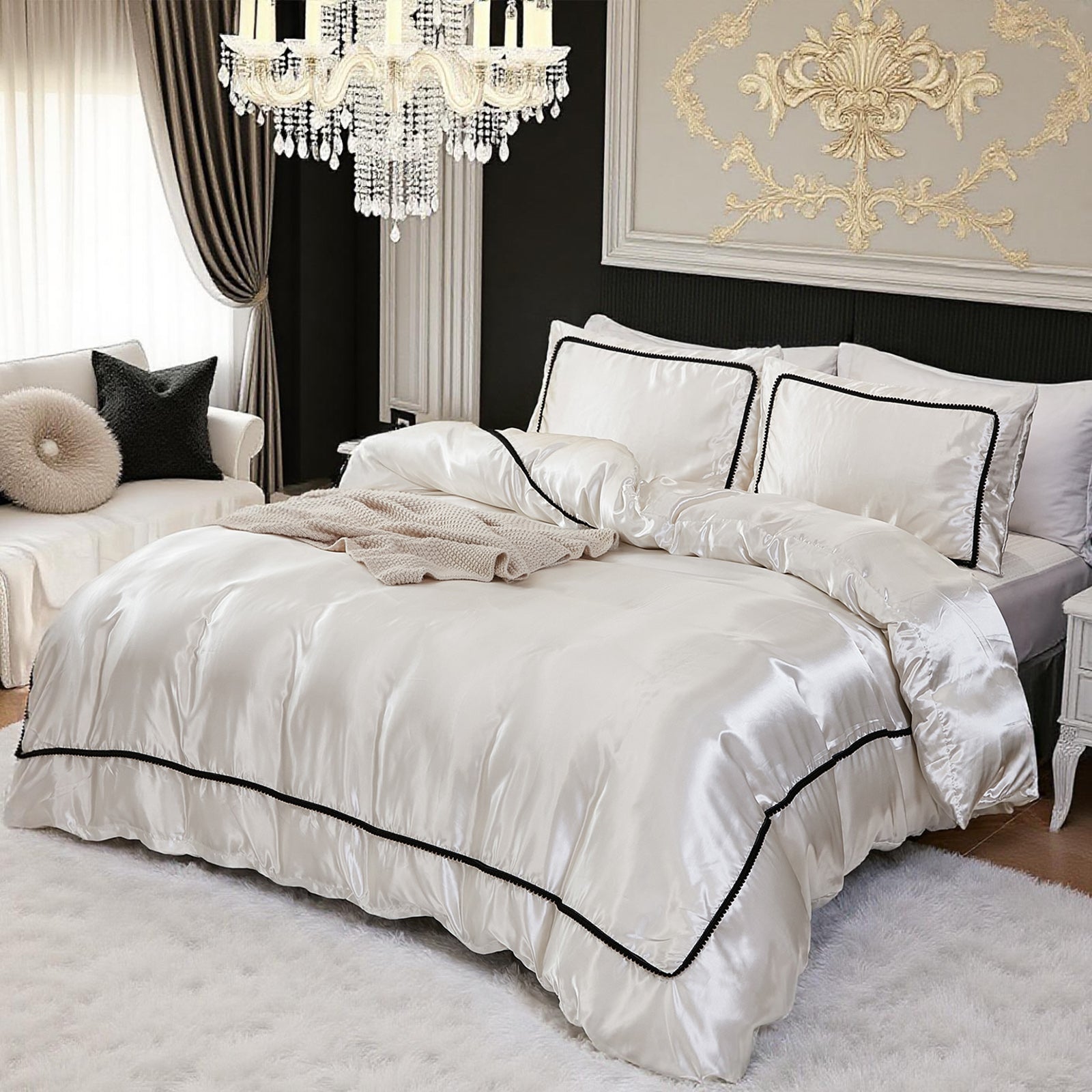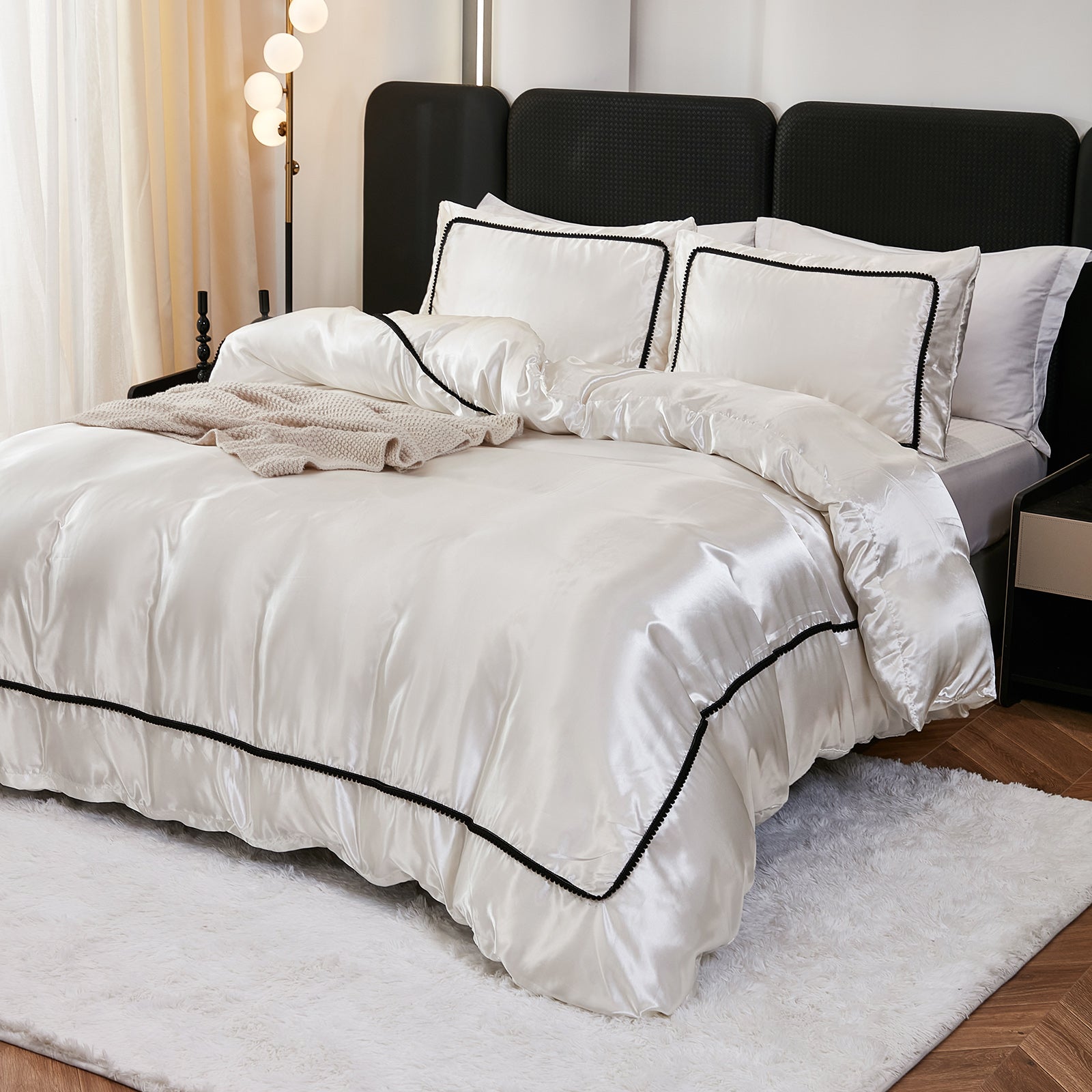 Made from luxurious satin fabric, the comforter has a silky smooth texture with a glossy finish, bringing a sophisticated look to any room. The unique square frame with mini pom pom trim adds playful elegance, making this set both chic and timeless.