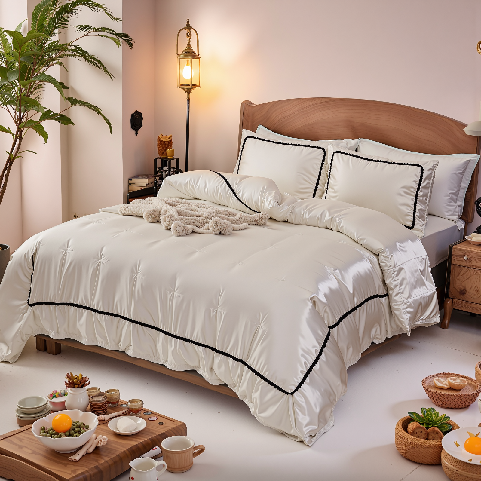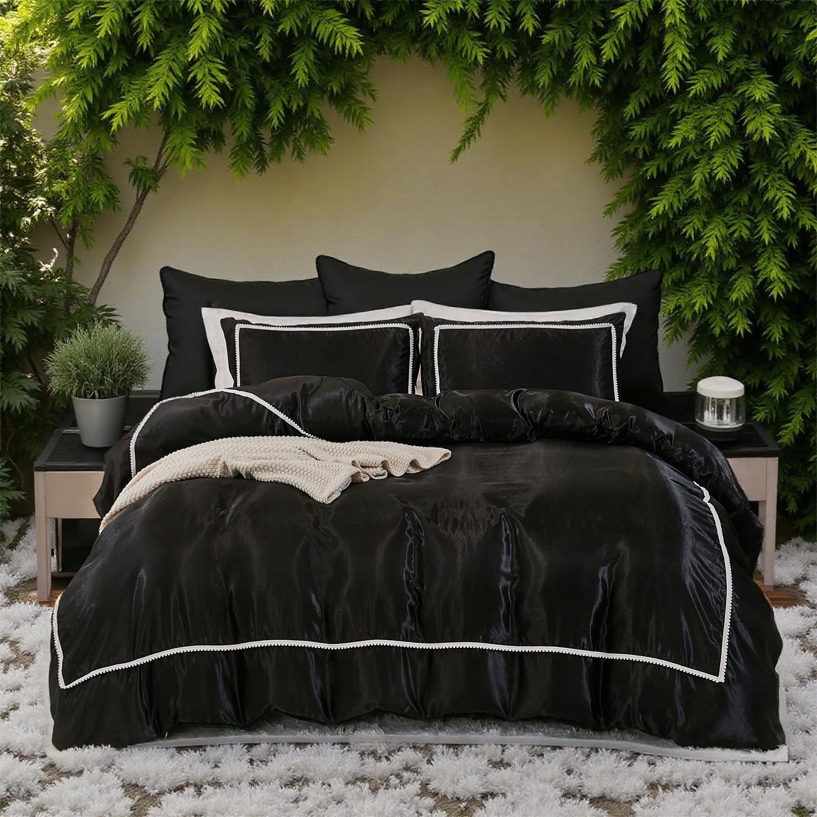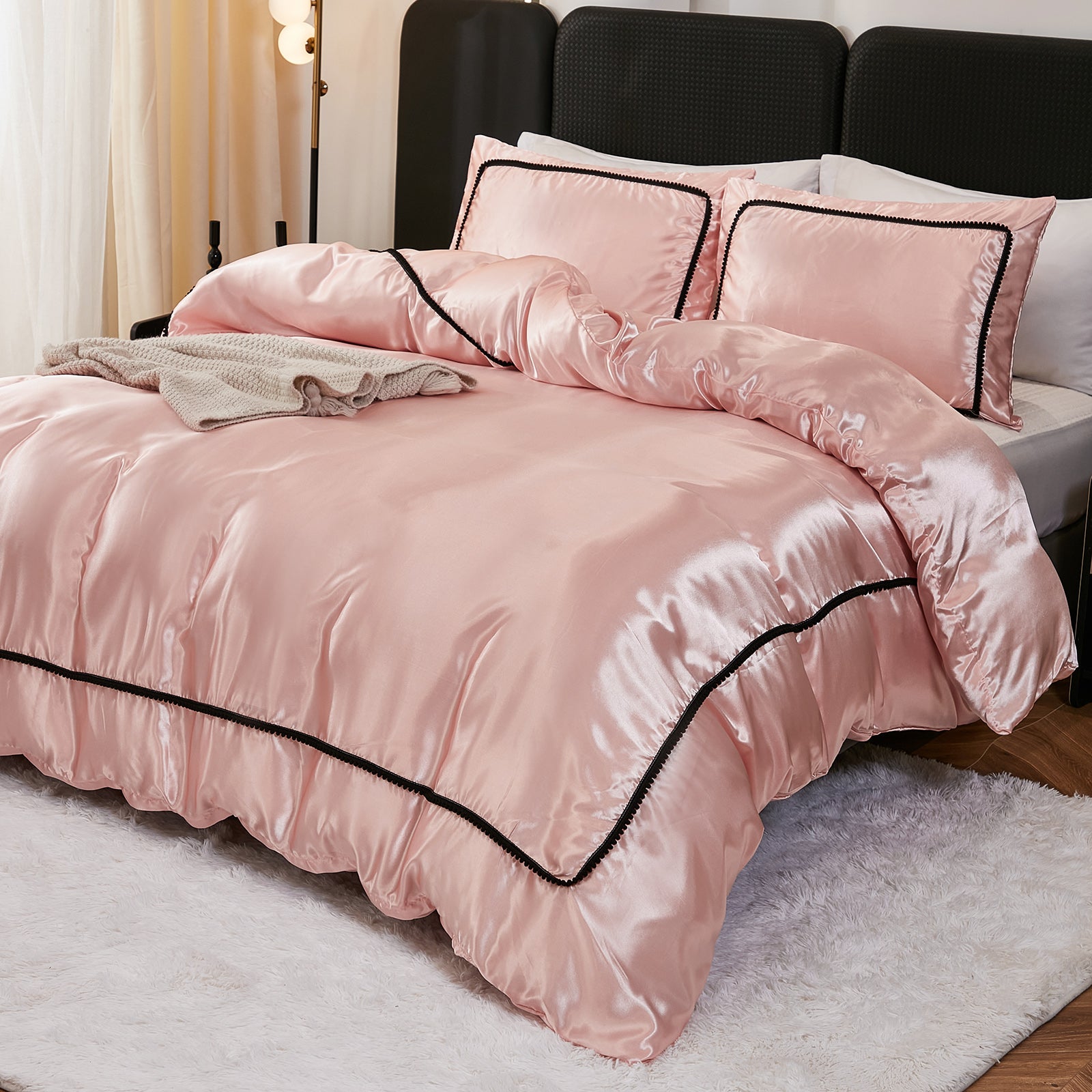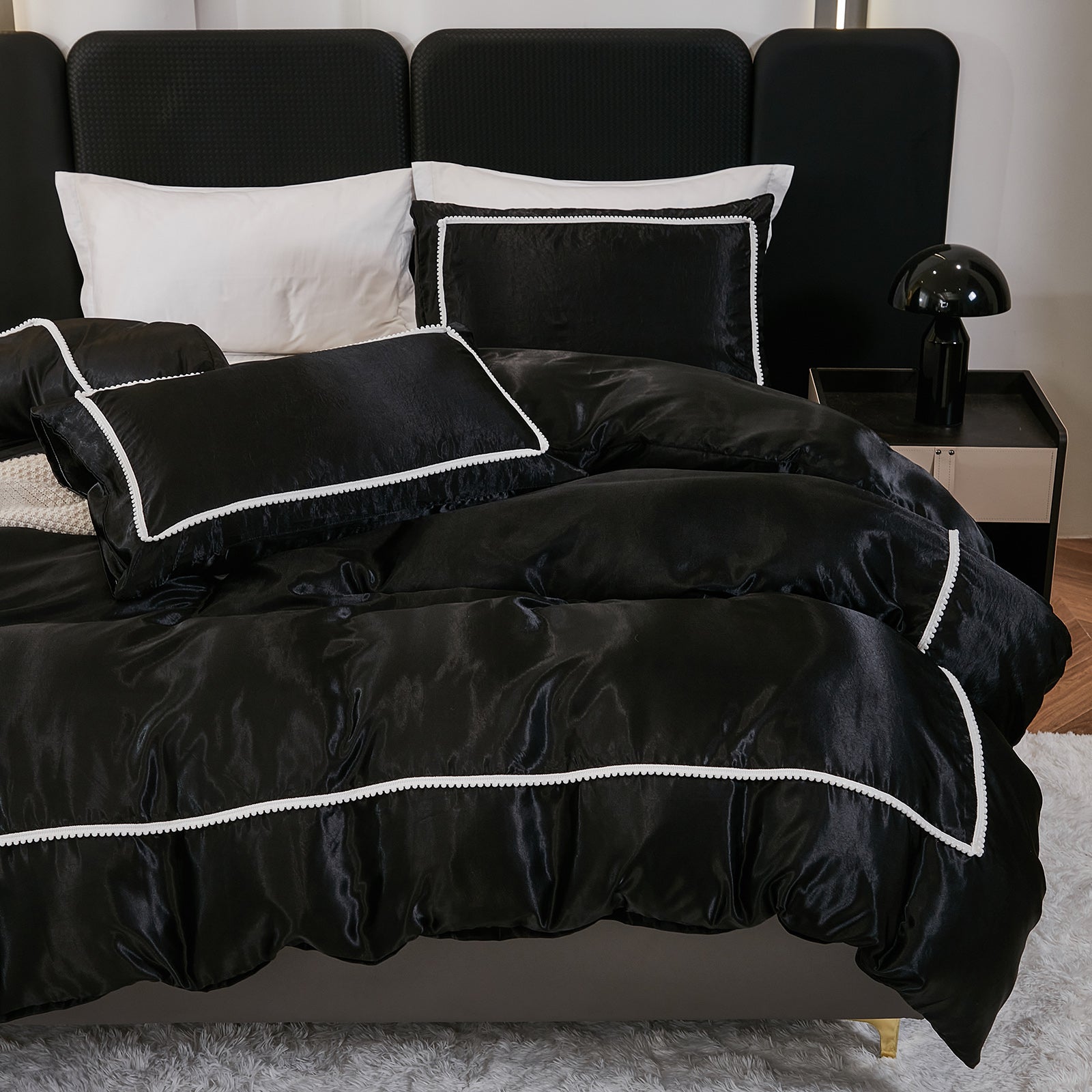 Made from luxurious satin fabric, the comforter has a silky smooth texture with a glossy finish, bringing a sophisticated look to any room. The unique square frame with mini pom pom trim adds playful elegance, making this set both chic and timeless.