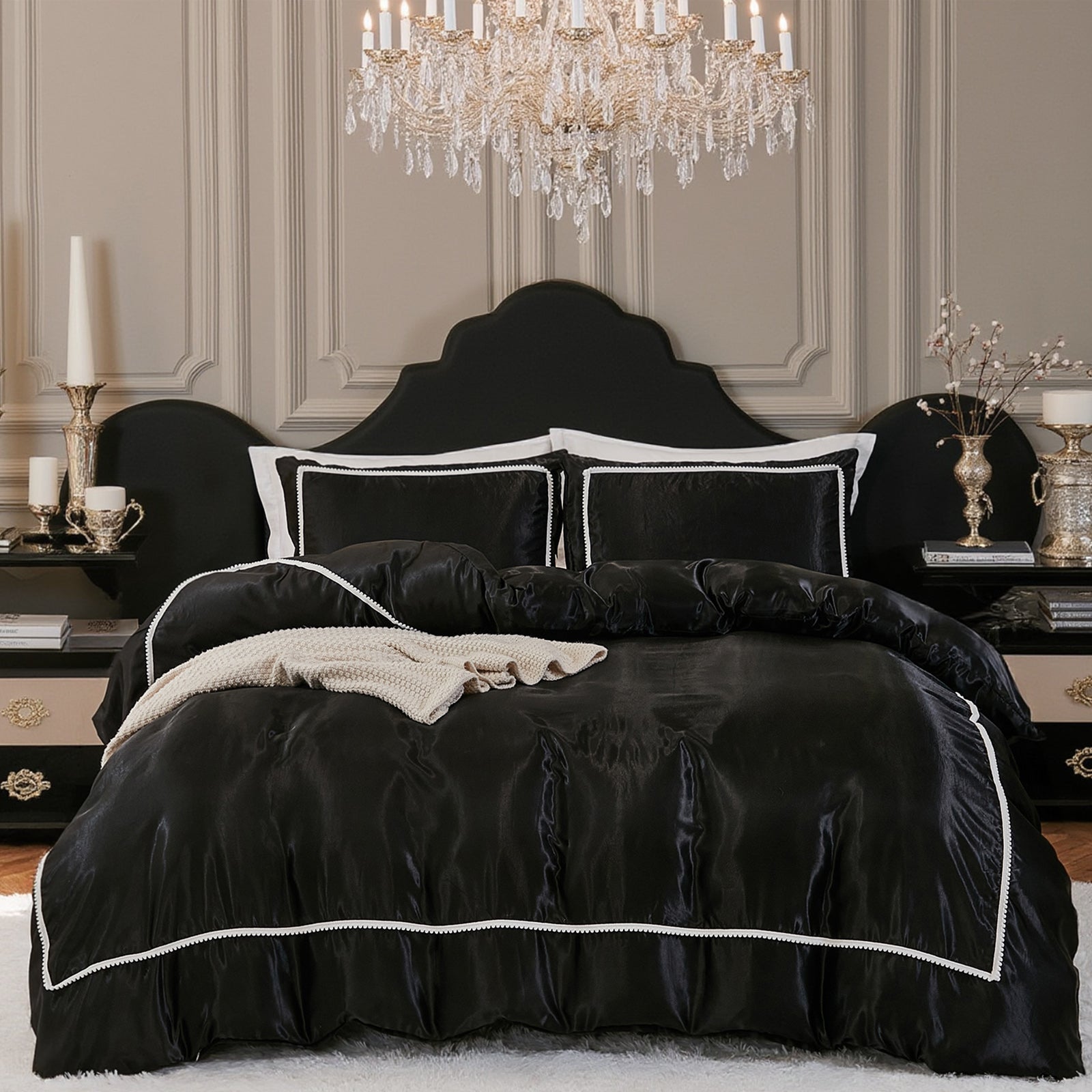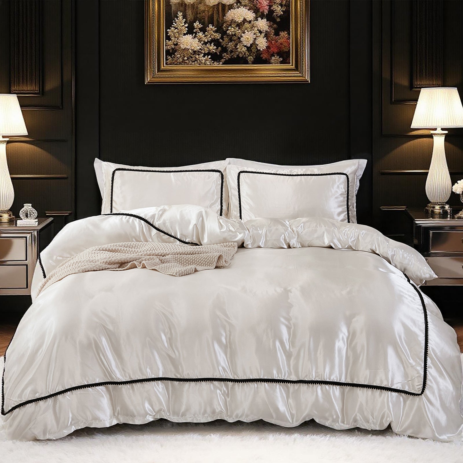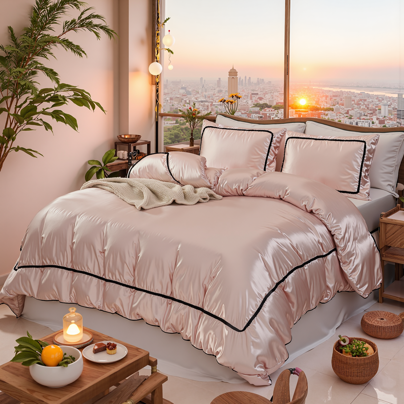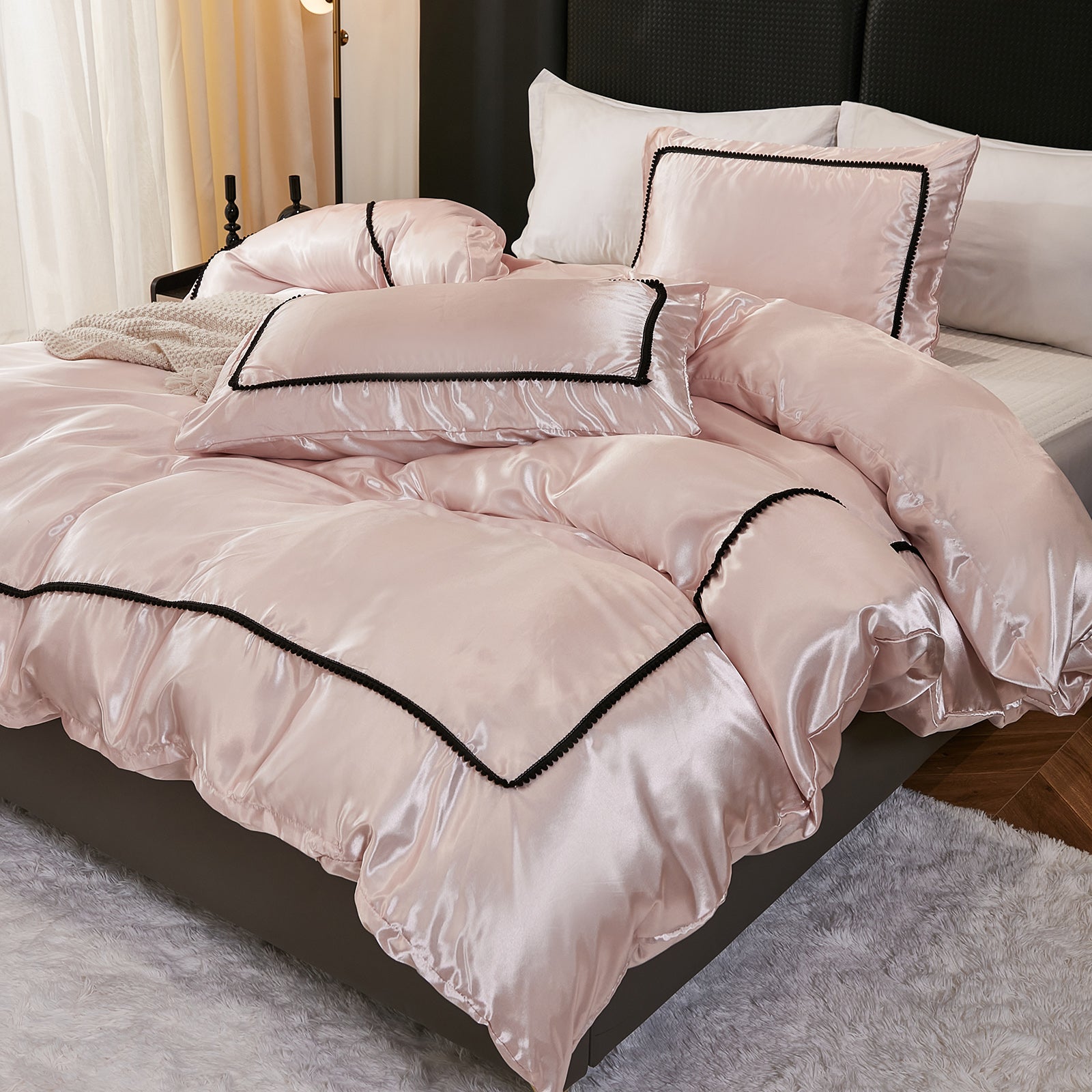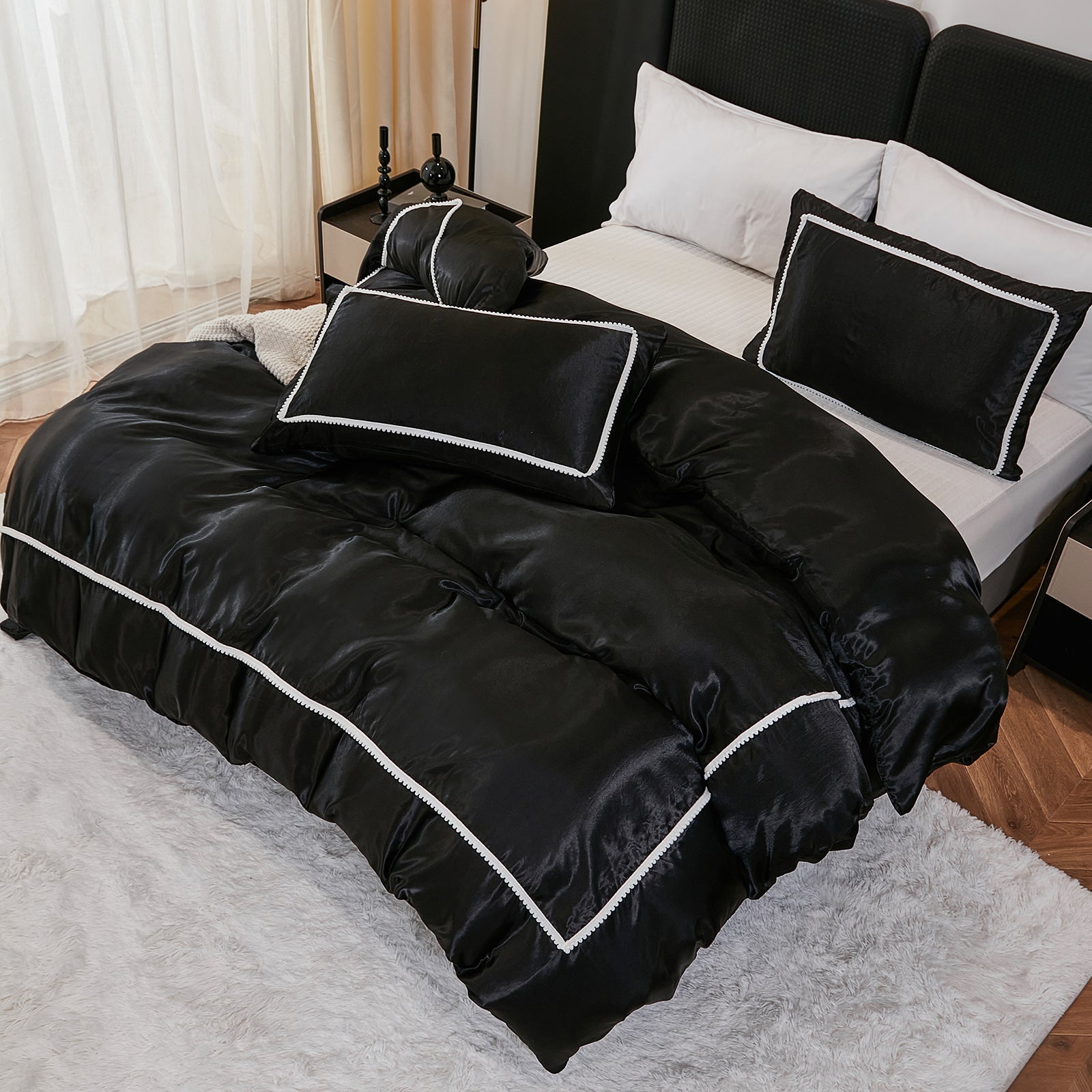 Made from luxurious satin fabric, the comforter has a silky smooth texture with a glossy finish, bringing a sophisticated look to any room. The unique square frame with mini pom pom trim adds playful elegance, making this set both chic and timeless.