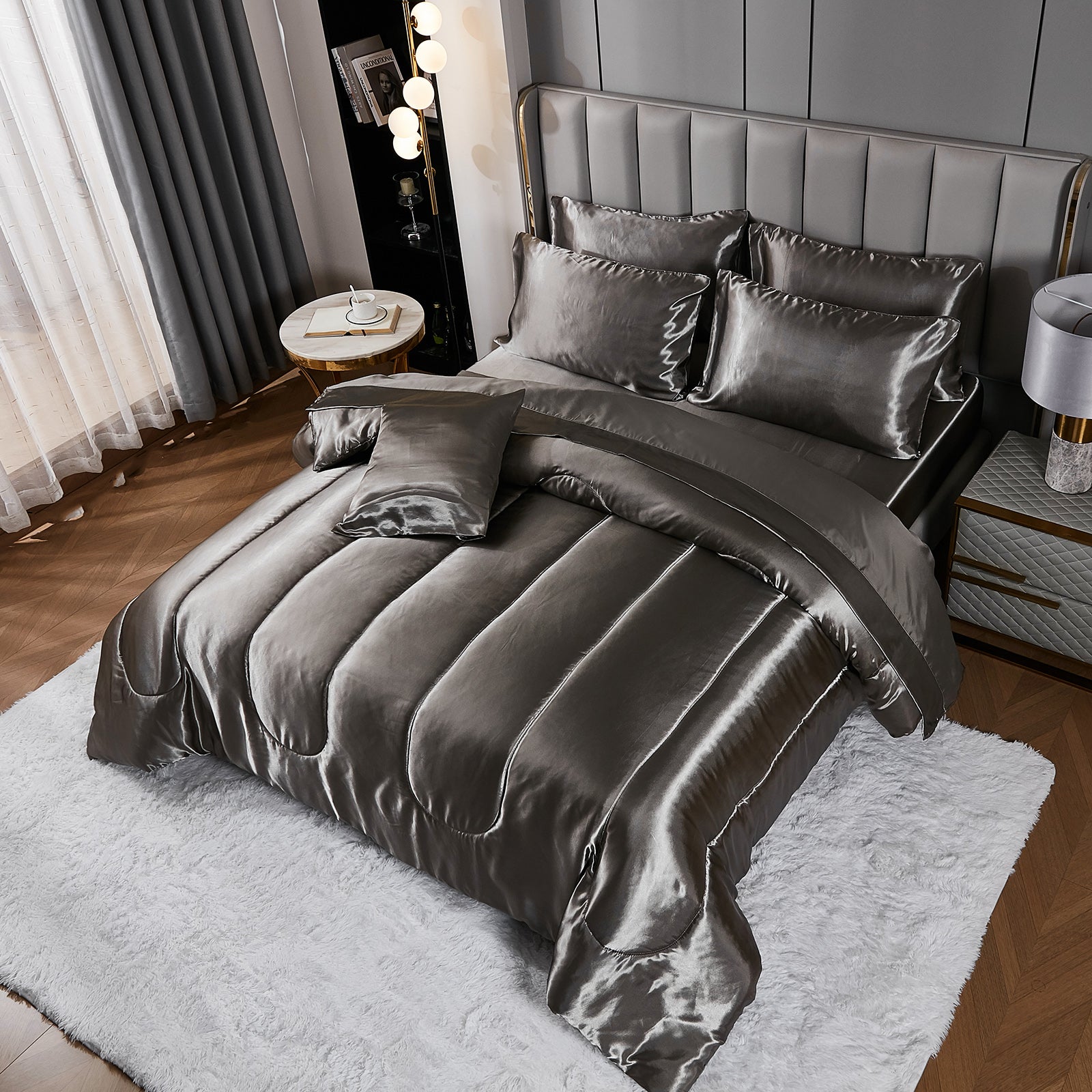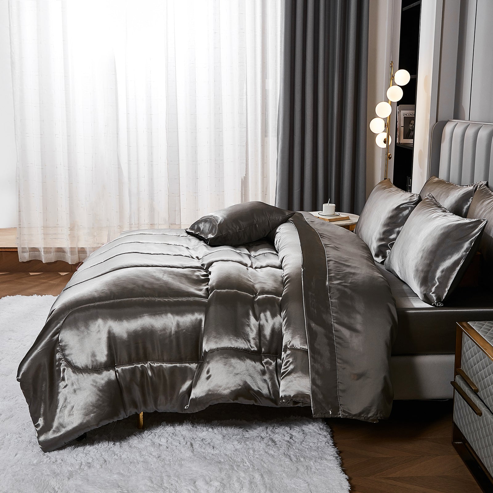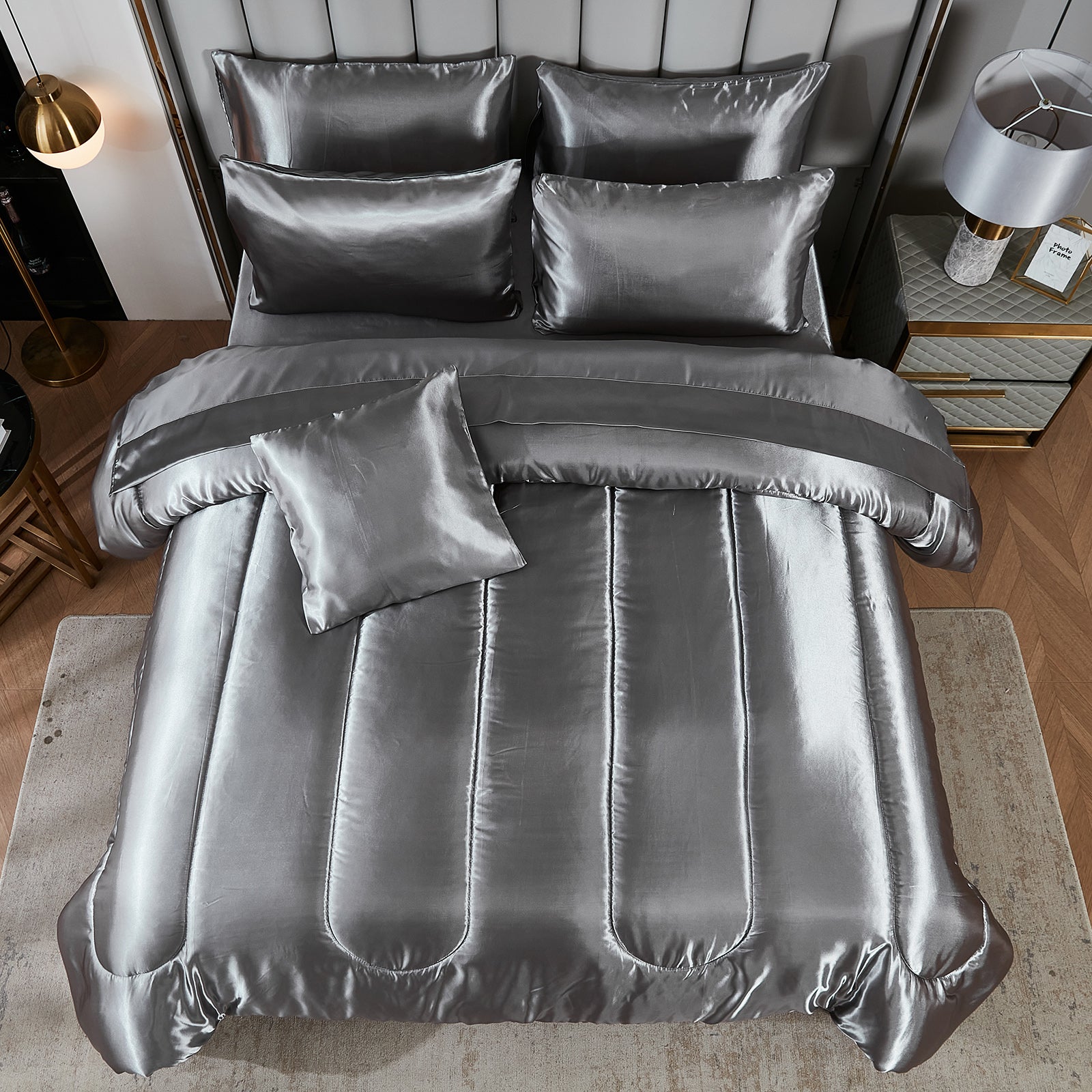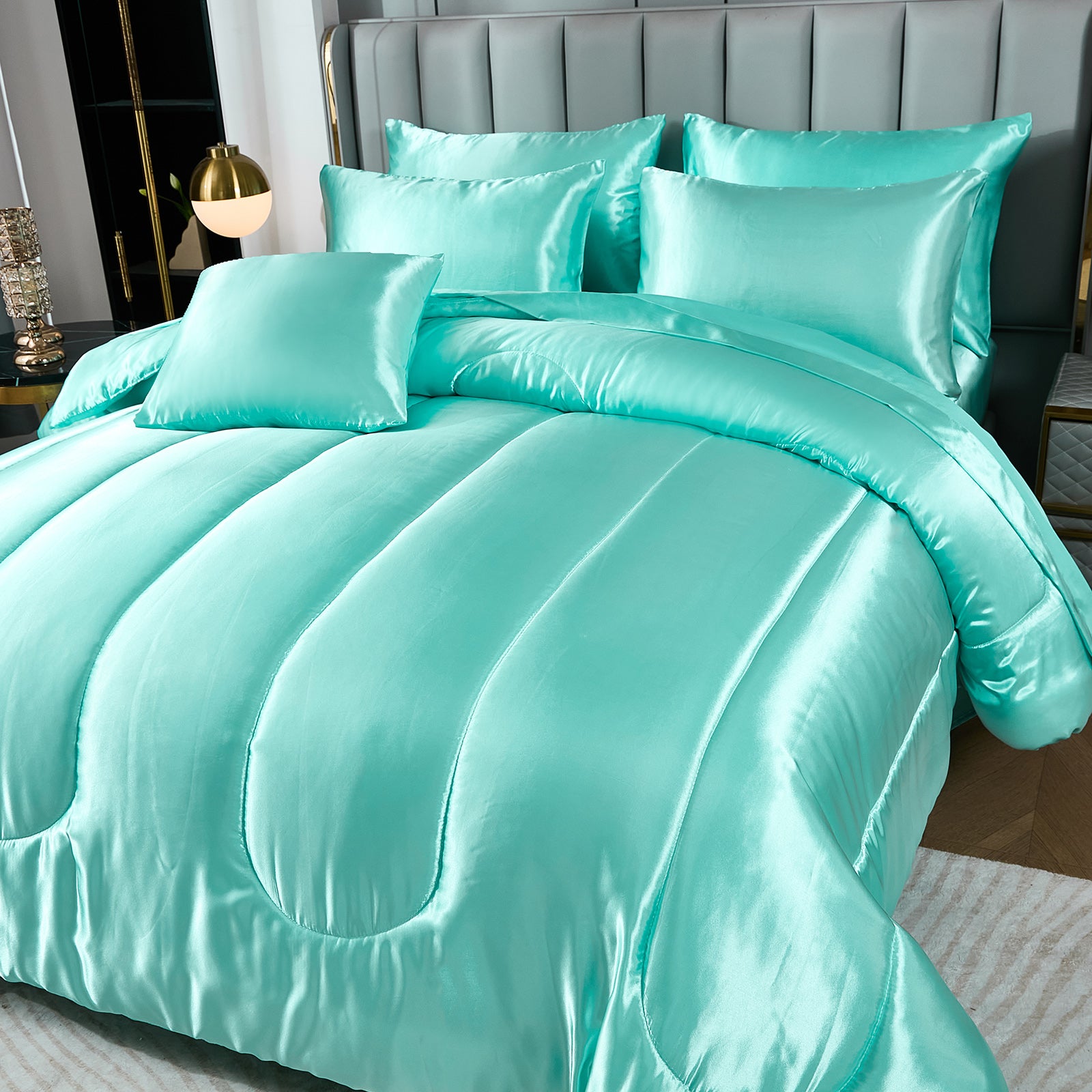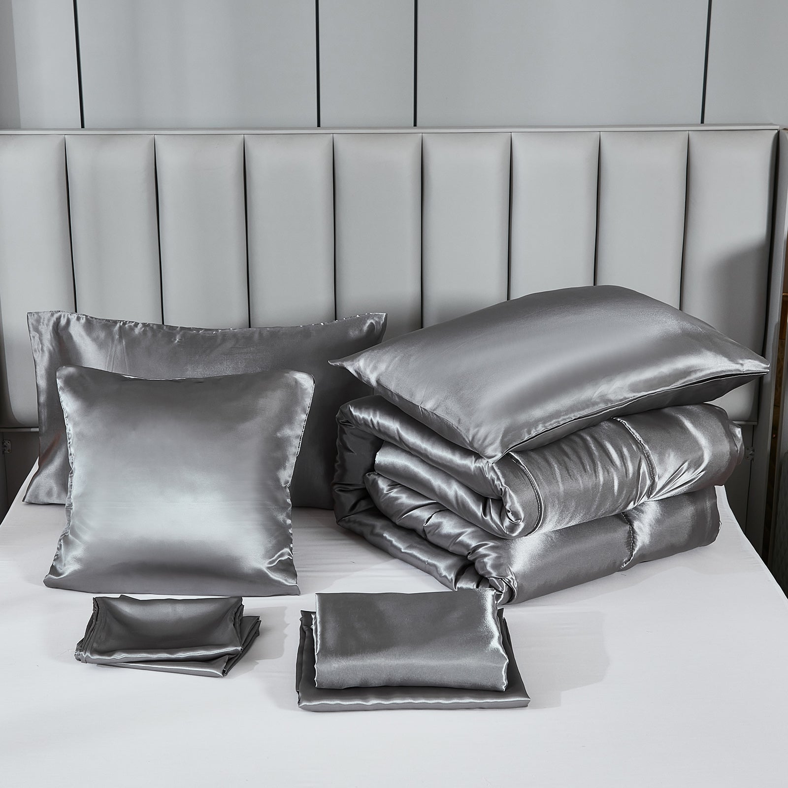 Bring elegance and comfort to your bedroom with the Satin Comforter Set with Sheet Set, a luxurious 8-piece bed-in-a-bag designed to create a refined and cozy sleeping environment. Crafted from silky satin microfiber, this bedding offers the smooth, lustrous texture of real silk while remaining durable and easy to care for.