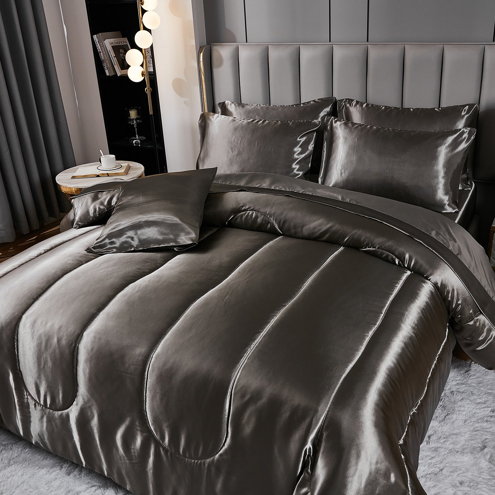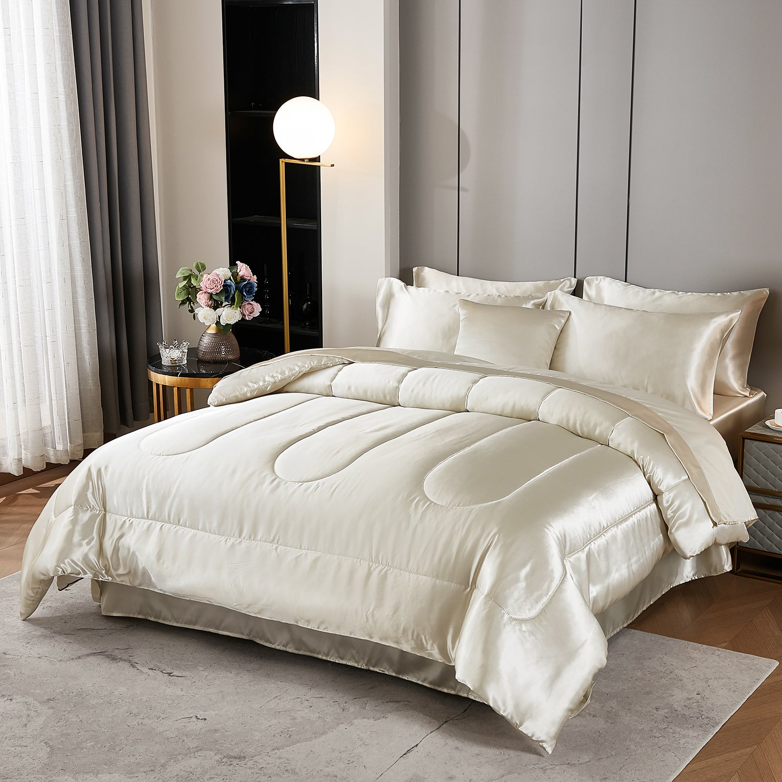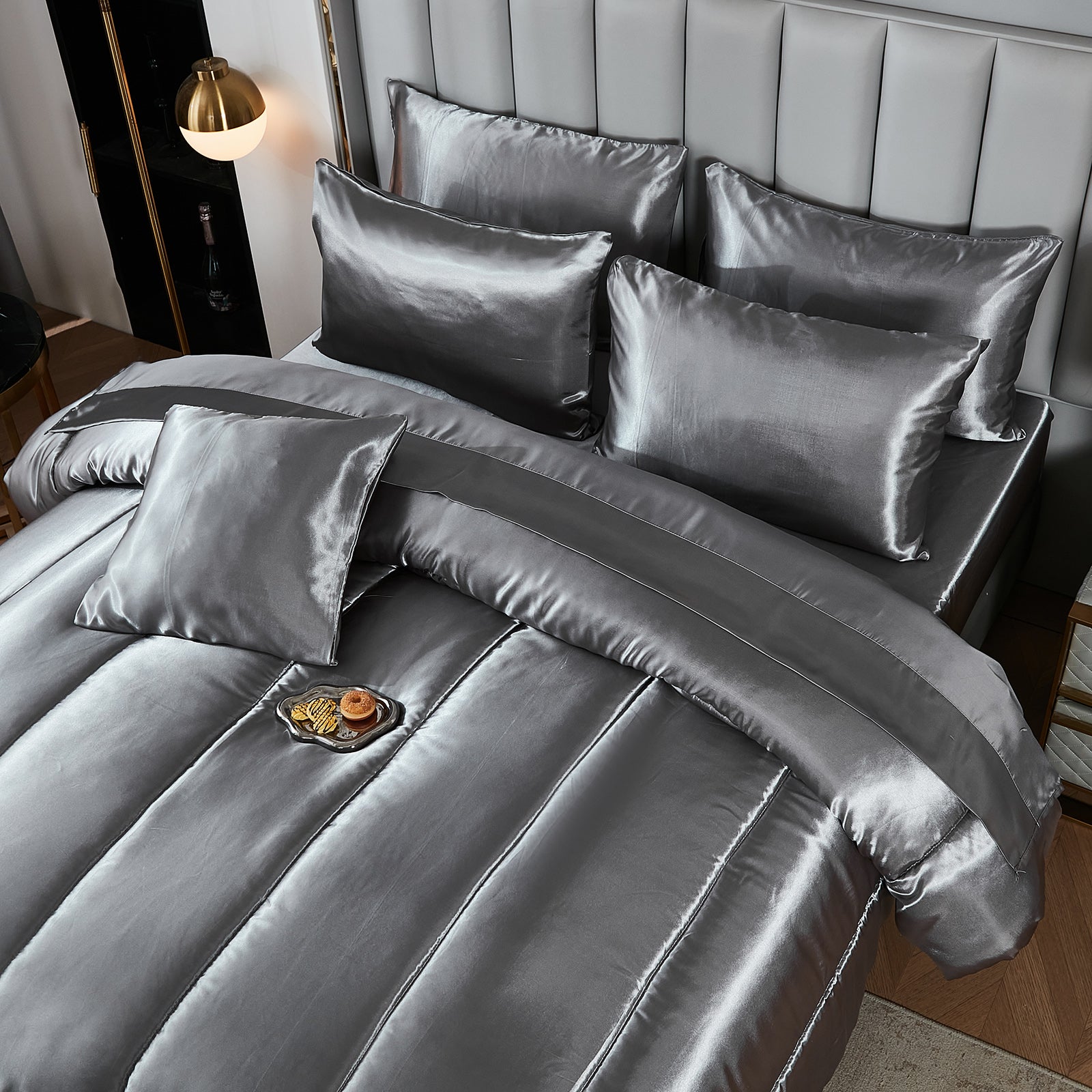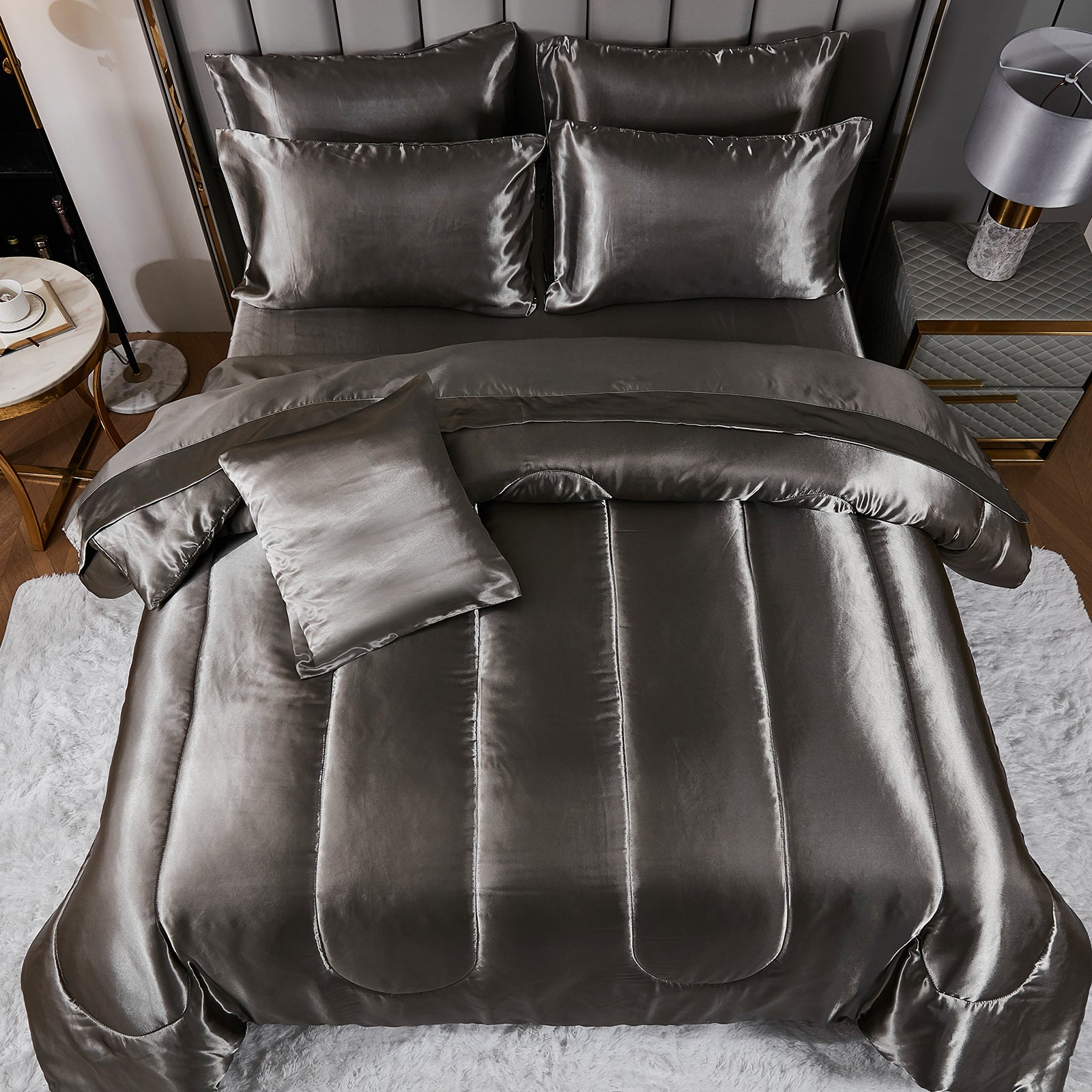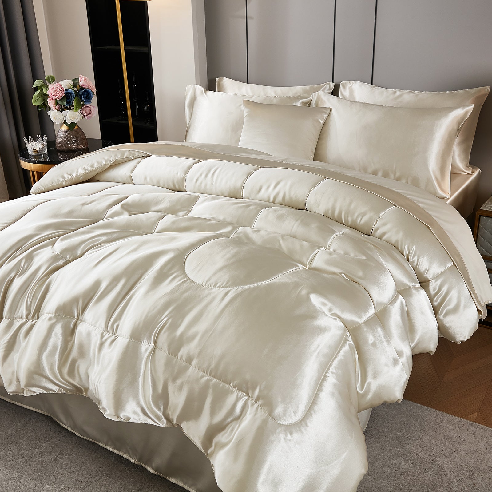 Bring elegance and comfort to your bedroom with the Satin Comforter Set with Sheet Set, a luxurious 8-piece bed-in-a-bag designed to create a refined and cozy sleeping environment. Crafted from silky satin microfiber, this bedding offers the smooth, lustrous texture of real silk while remaining durable and easy to care for.
