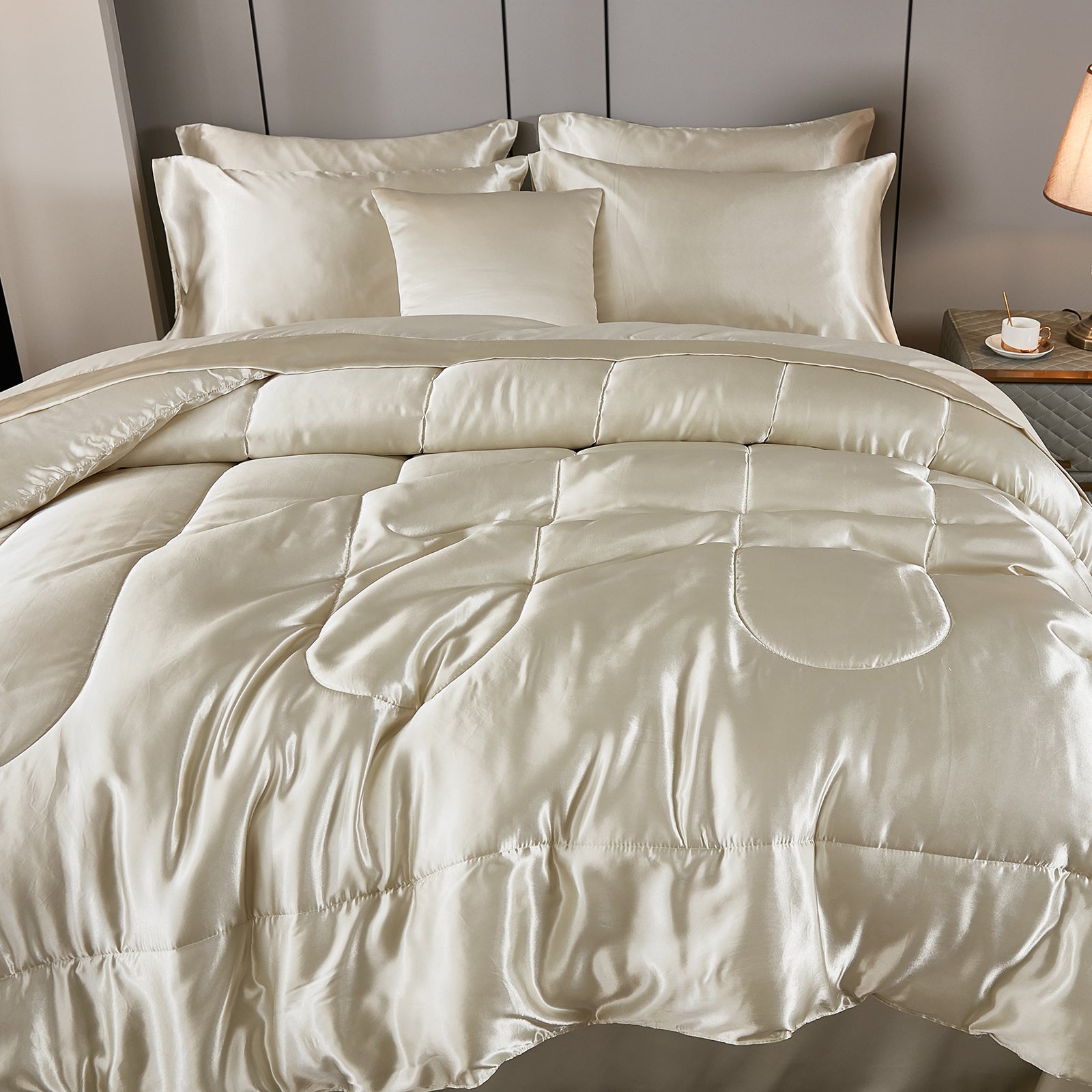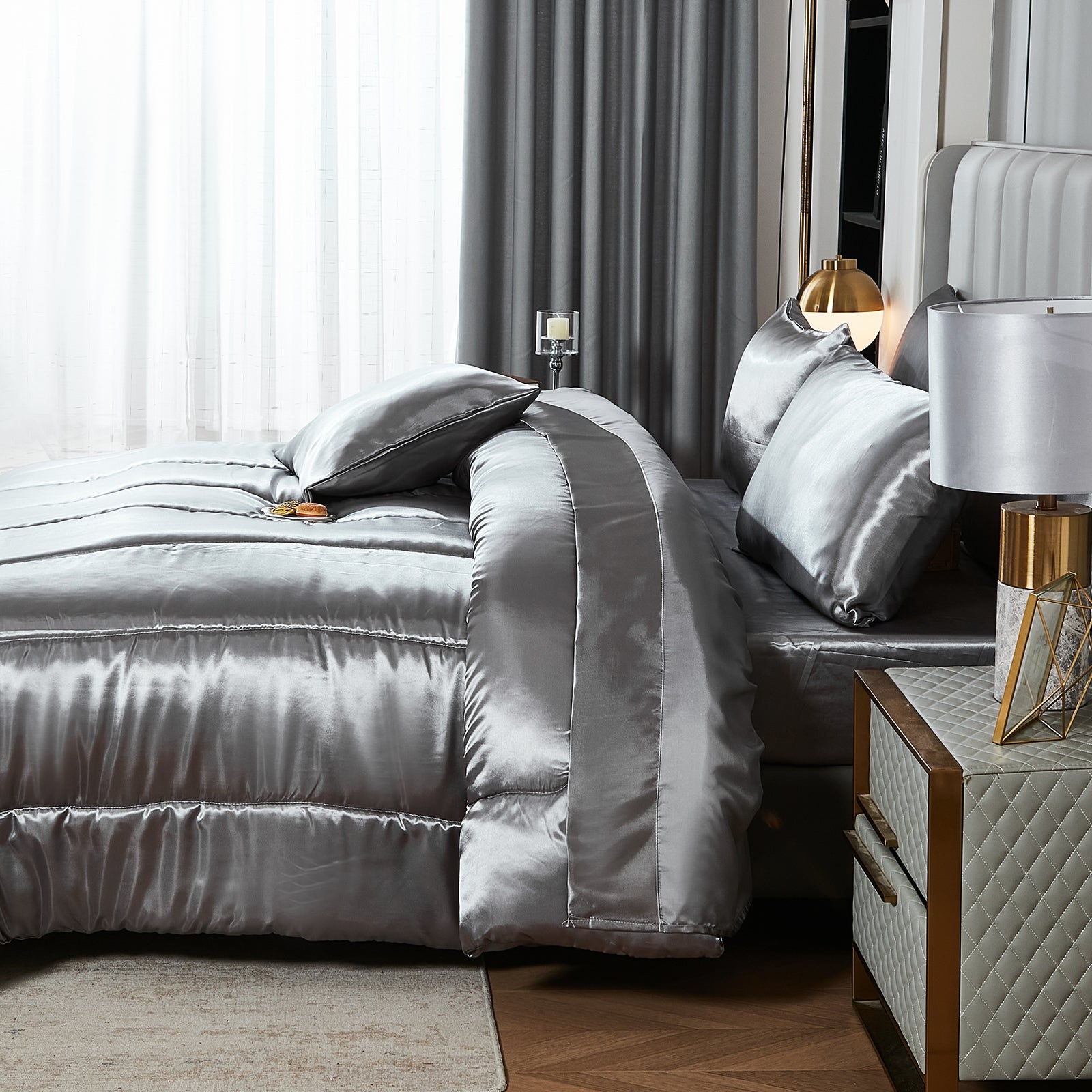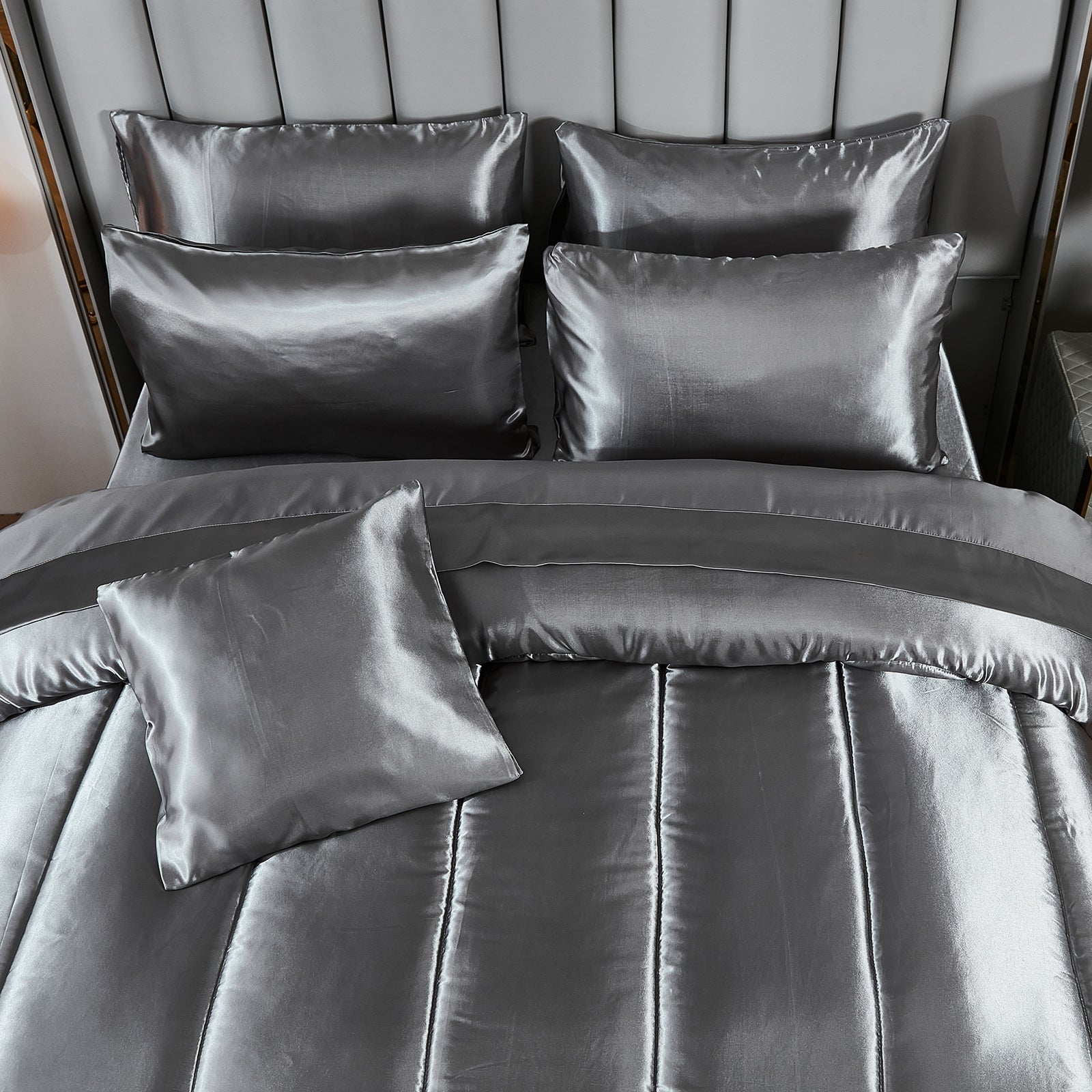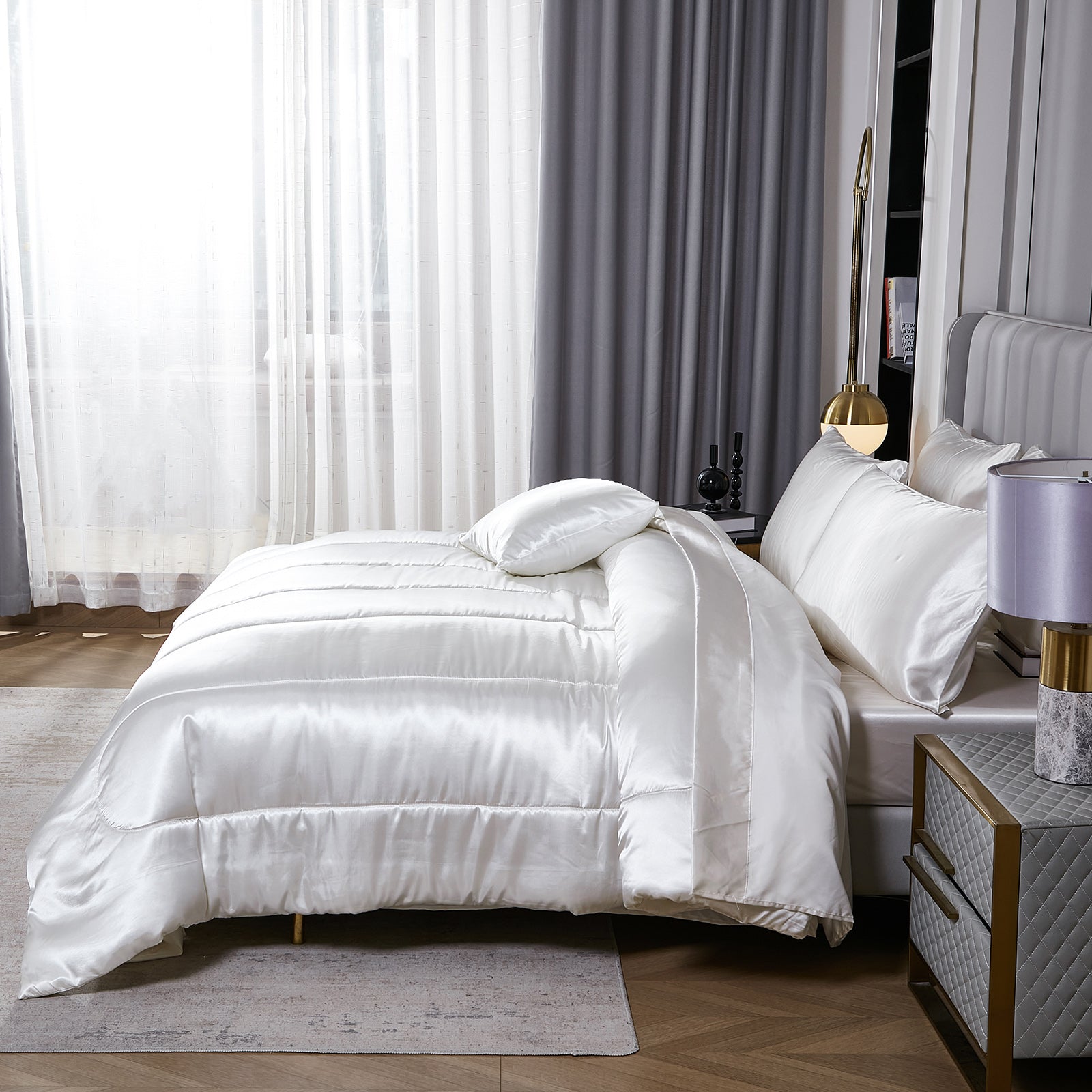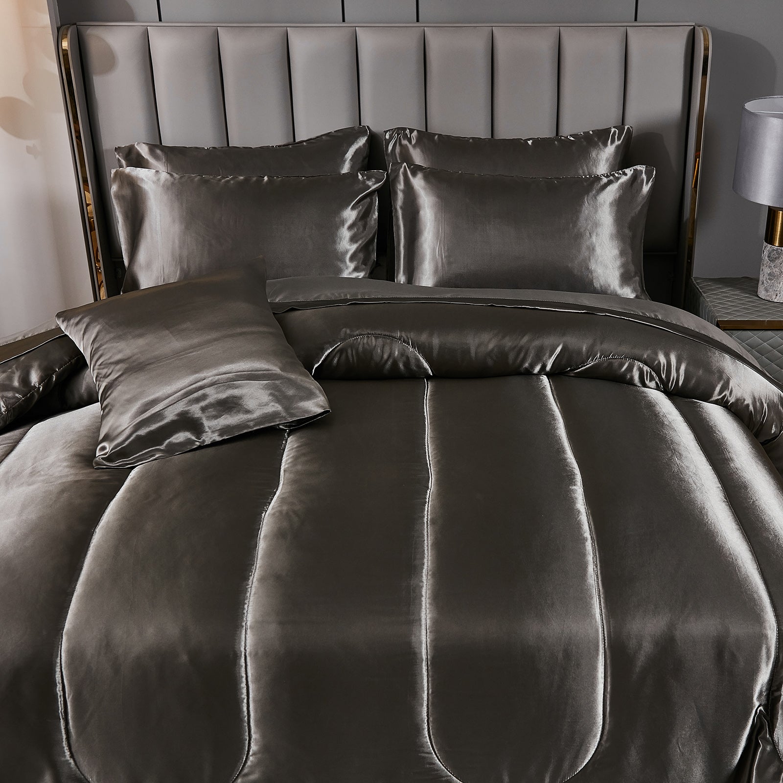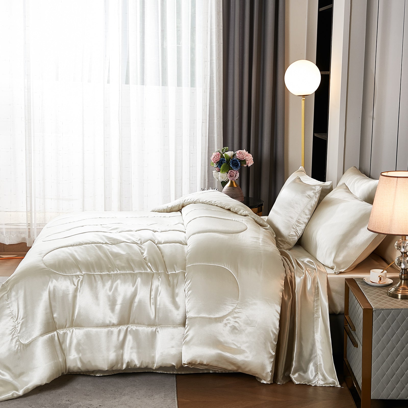 Bring elegance and comfort to your bedroom with the Satin Comforter Set with Sheet Set, a luxurious 8-piece bed-in-a-bag designed to create a refined and cozy sleeping environment. Crafted from silky satin microfiber, this bedding offers the smooth, lustrous texture of real silk while remaining durable and easy to care for.