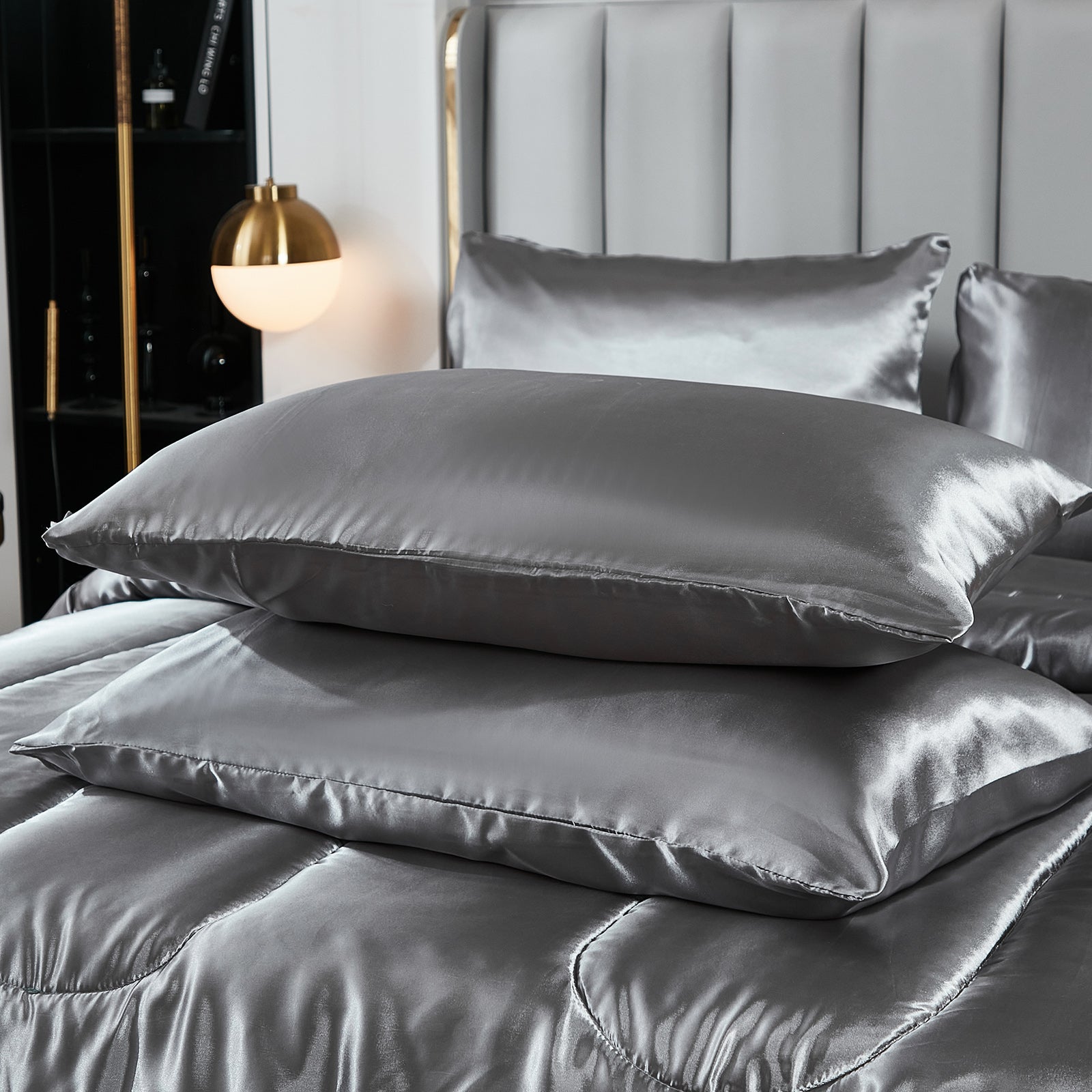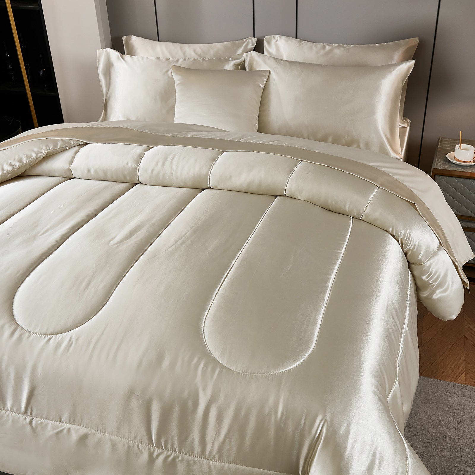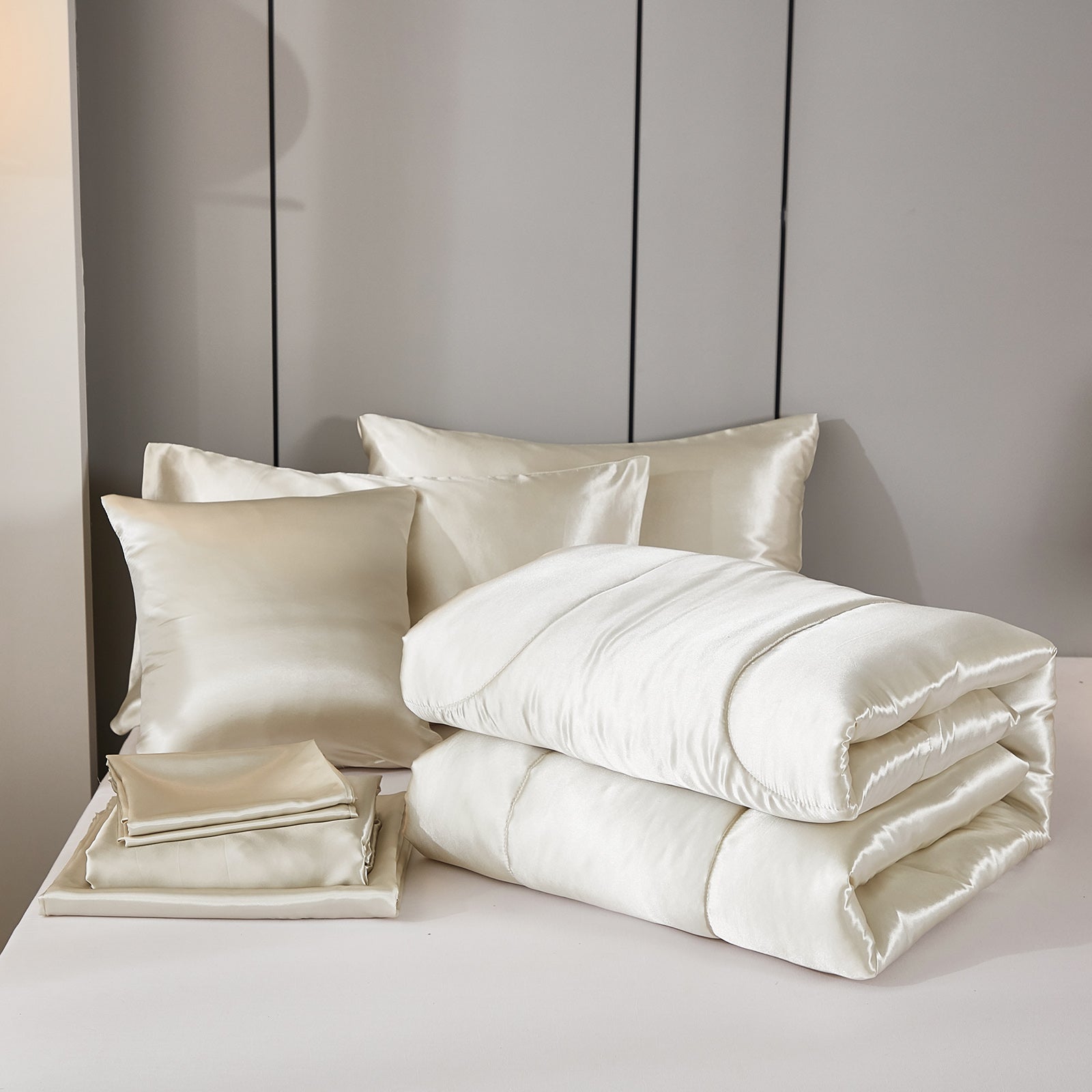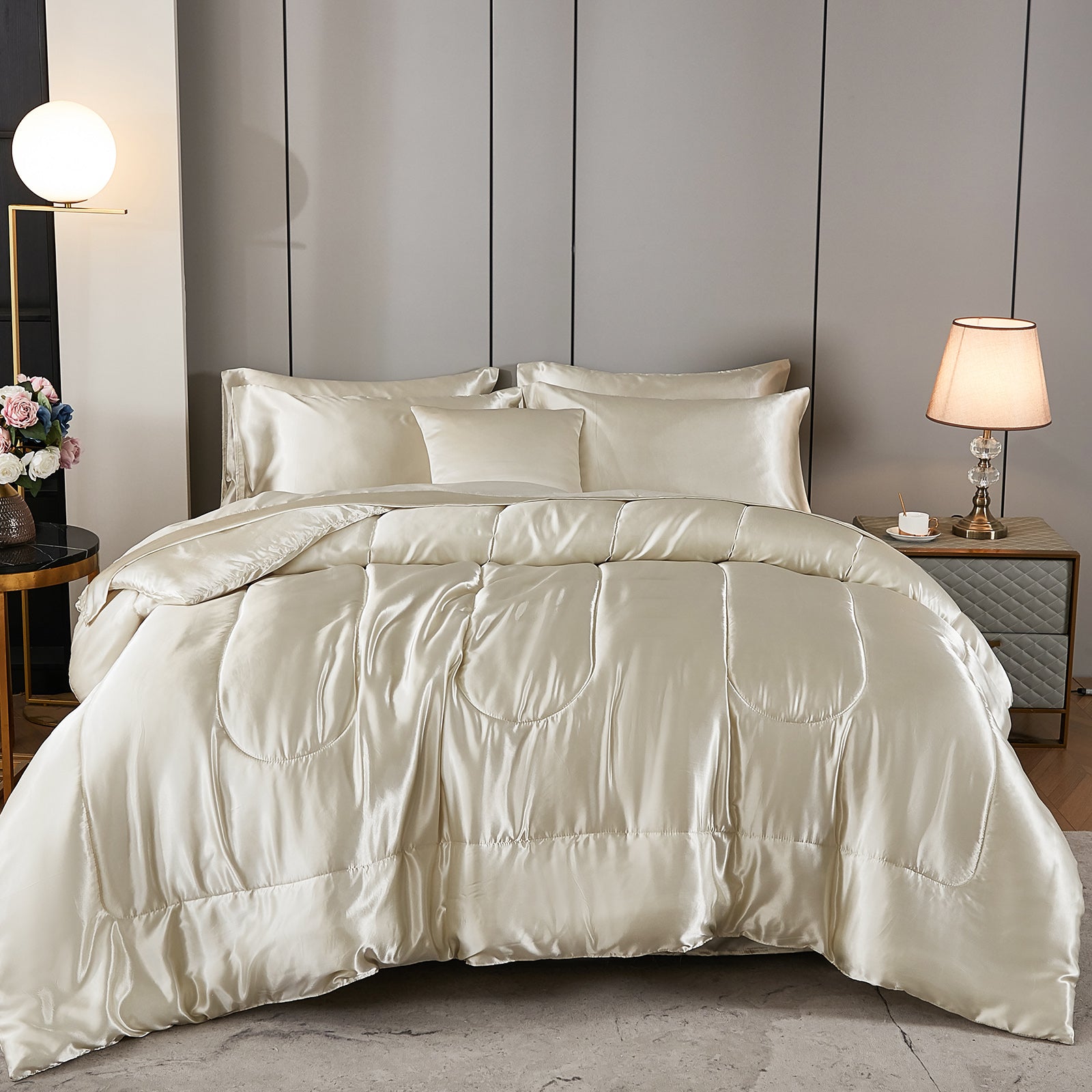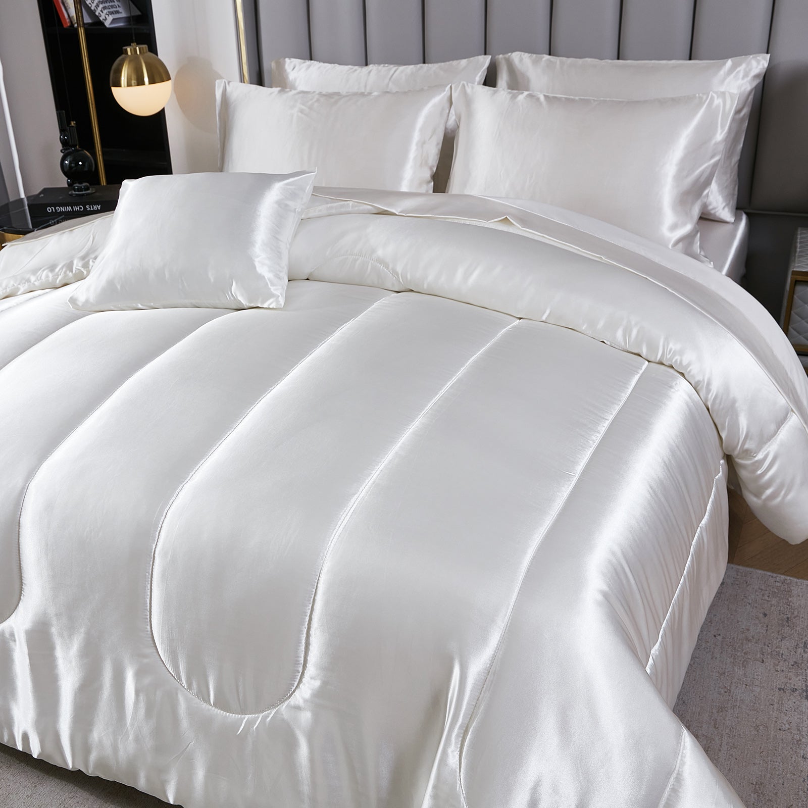 Bring elegance and comfort to your bedroom with the Satin Comforter Set with Sheet Set, a luxurious 8-piece bed-in-a-bag designed to create a refined and cozy sleeping environment. Crafted from silky satin microfiber, this bedding offers the smooth, lustrous texture of real silk while remaining durable and easy to care for.