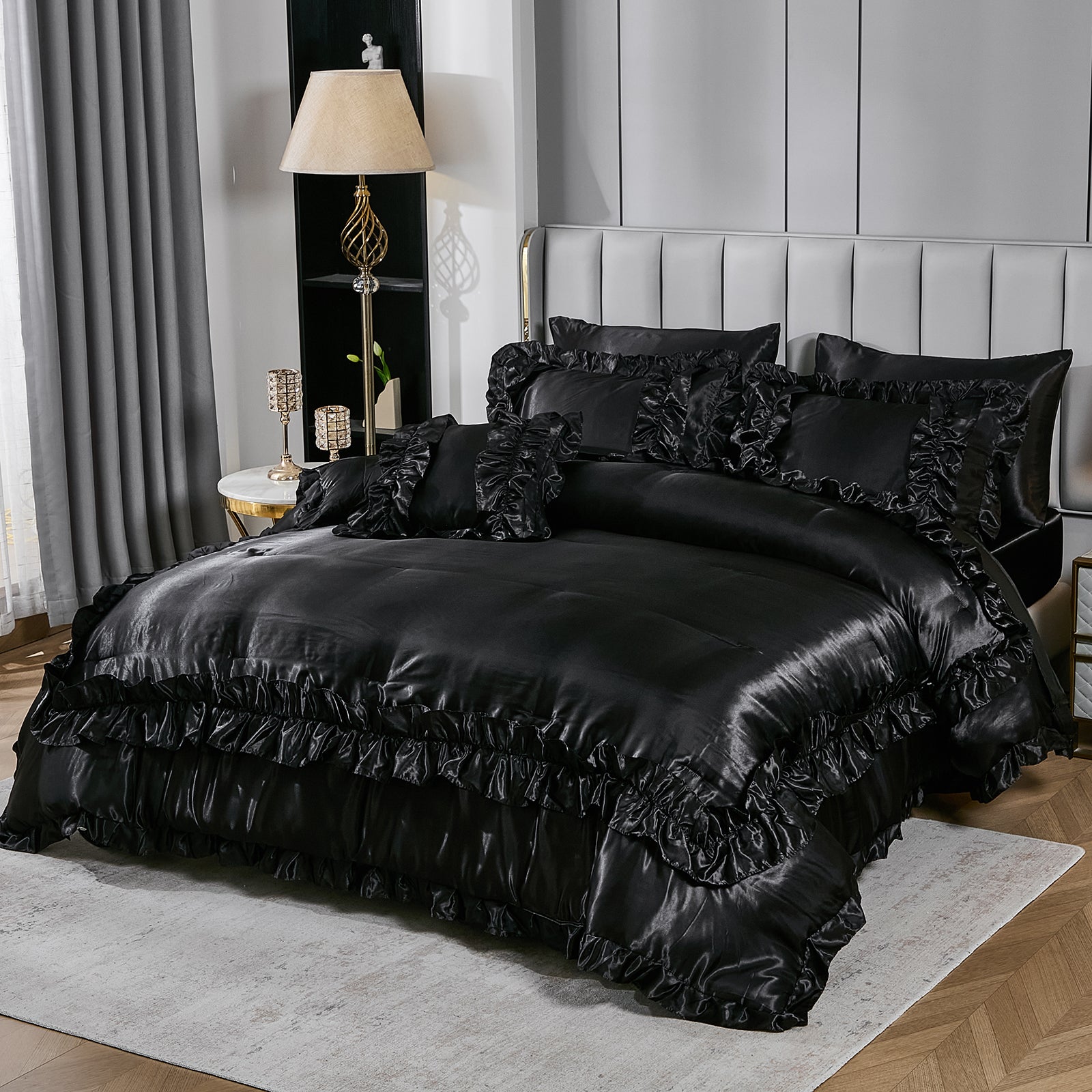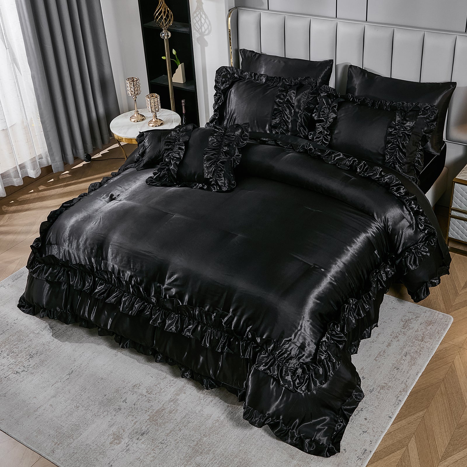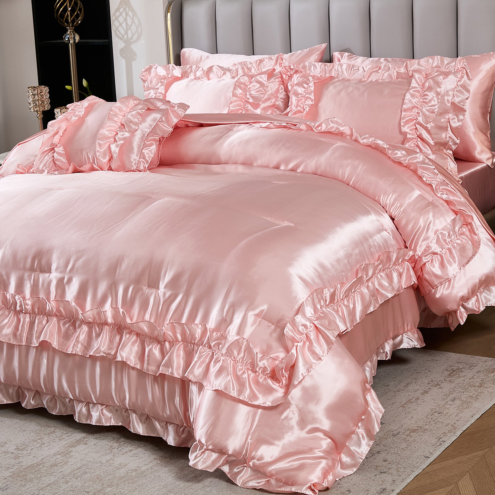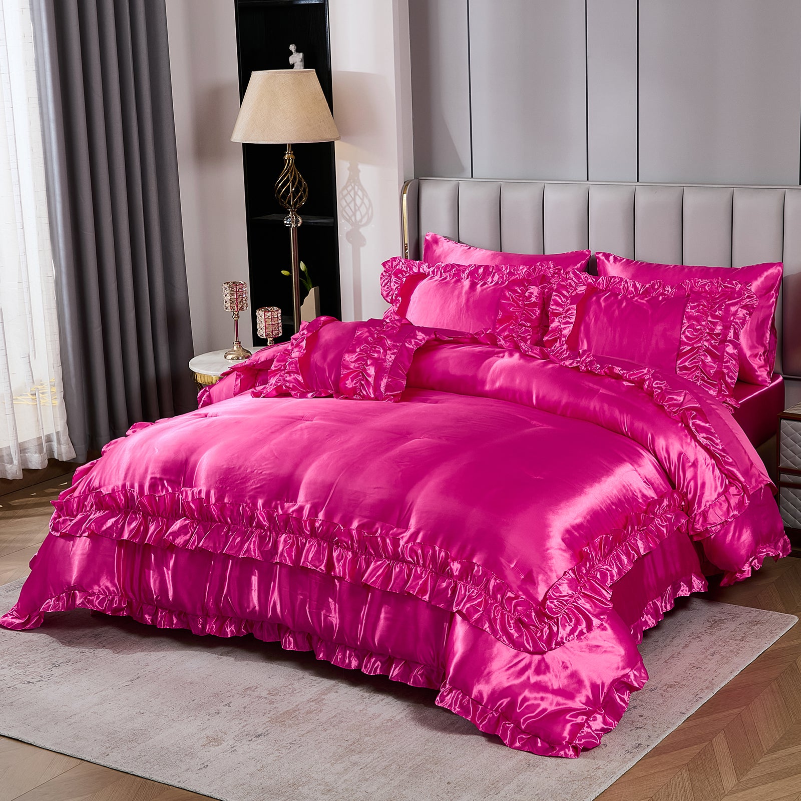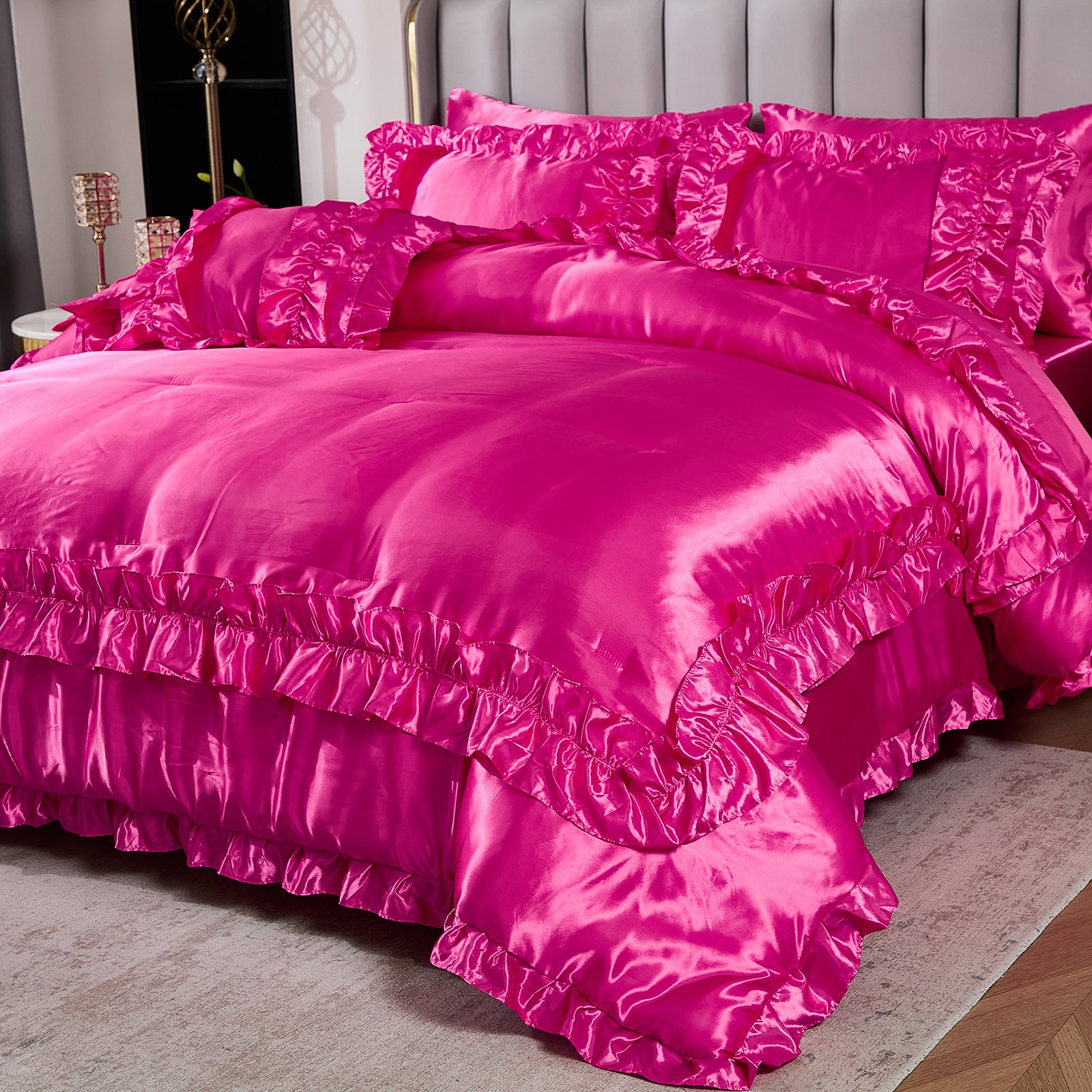 Transform your bedroom with the Satin Ruffle Comforter Set Bed in a Bag, featuring a classic waterfall ruffle design that brings romance and elegance to your space. The cascading ruffles add a princess-inspired charm, making this set perfect for farmhouse, shabby chic, or boho bedrooms.