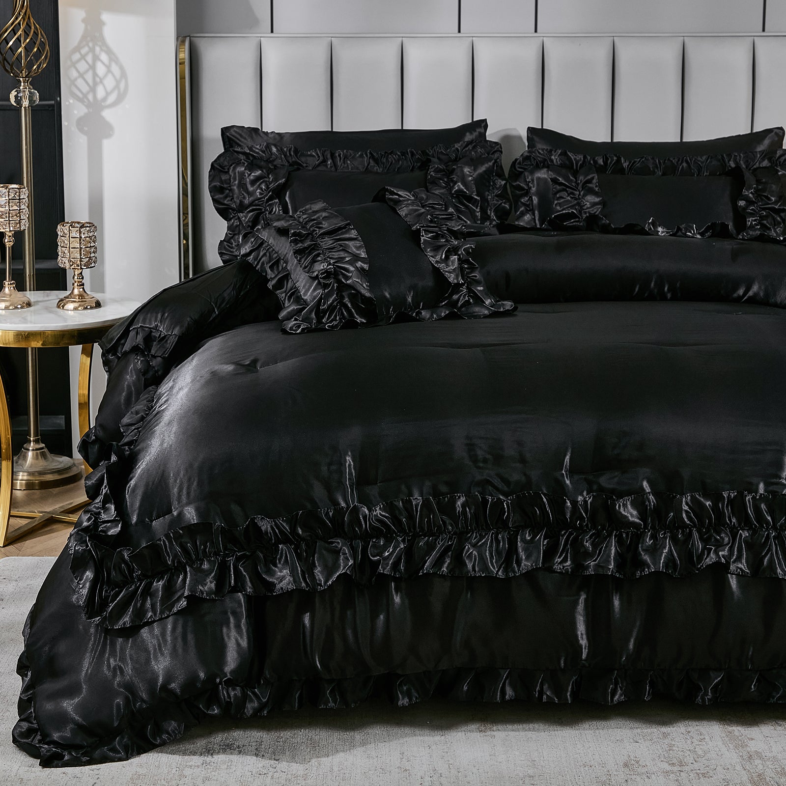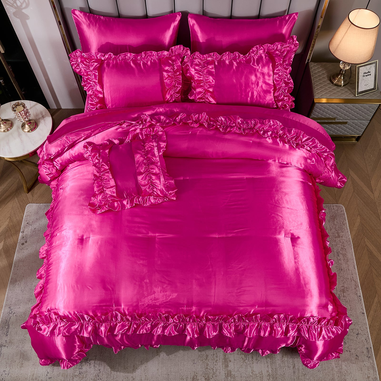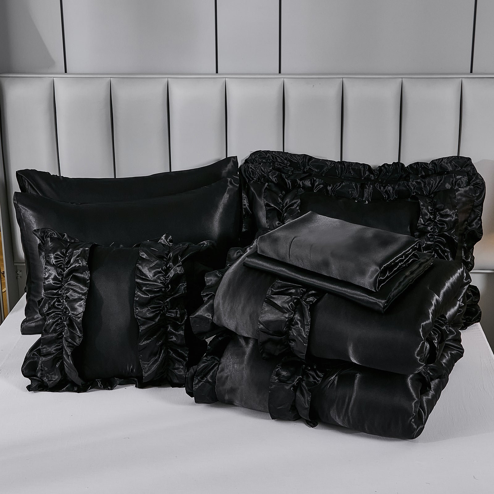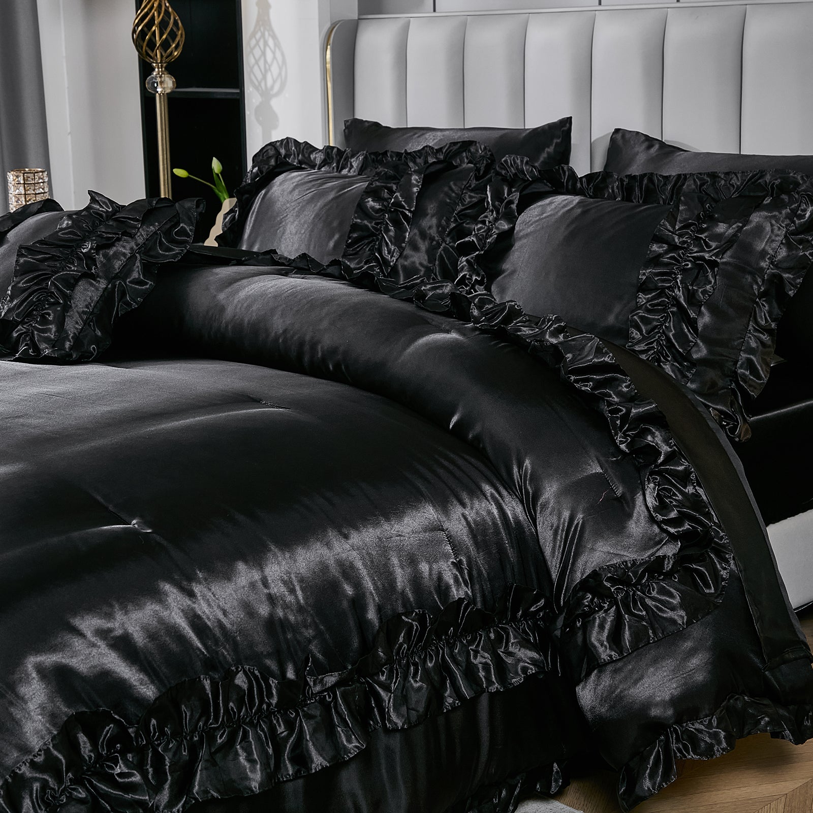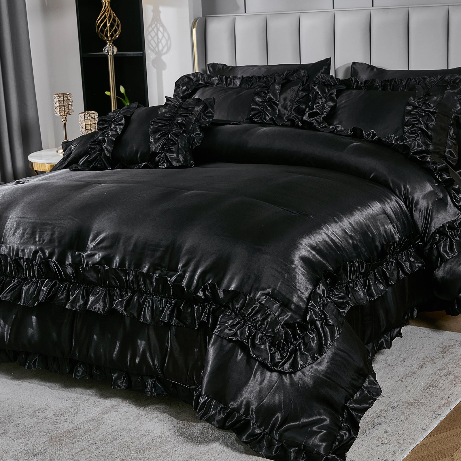 Transform your bedroom with the Satin Ruffle Comforter Set Bed in a Bag, featuring a classic waterfall ruffle design that brings romance and elegance to your space. The cascading ruffles add a princess-inspired charm, making this set perfect for farmhouse, shabby chic, or boho bedrooms.
