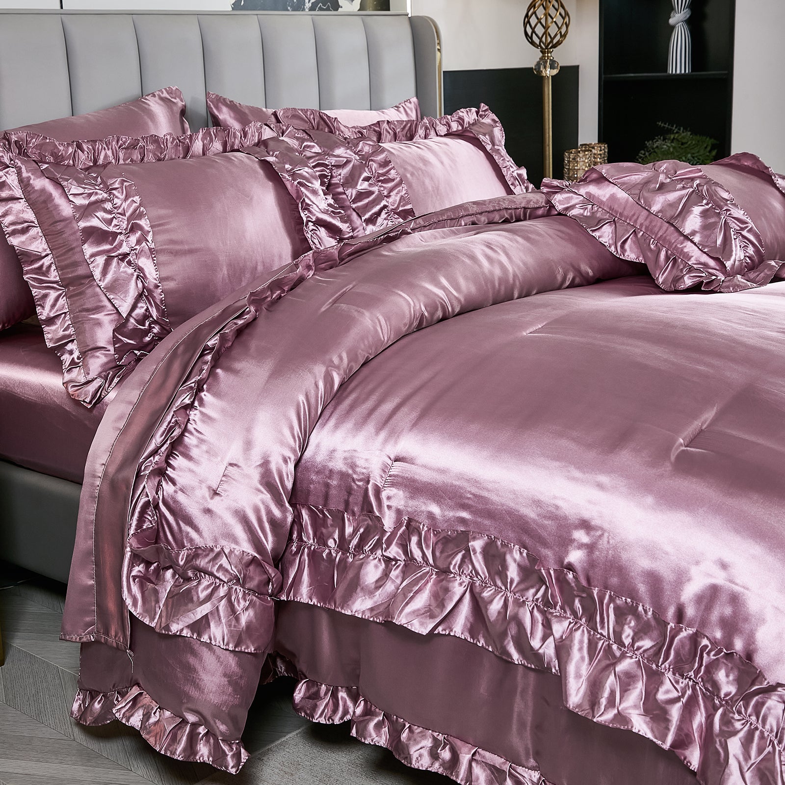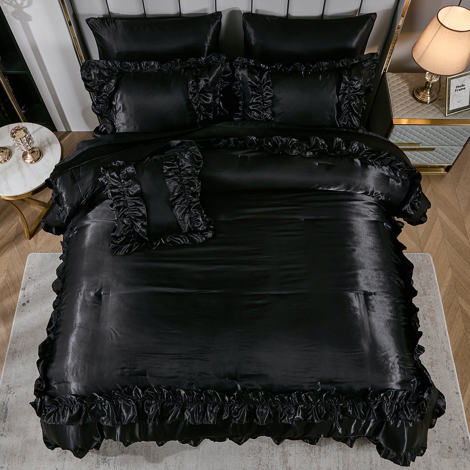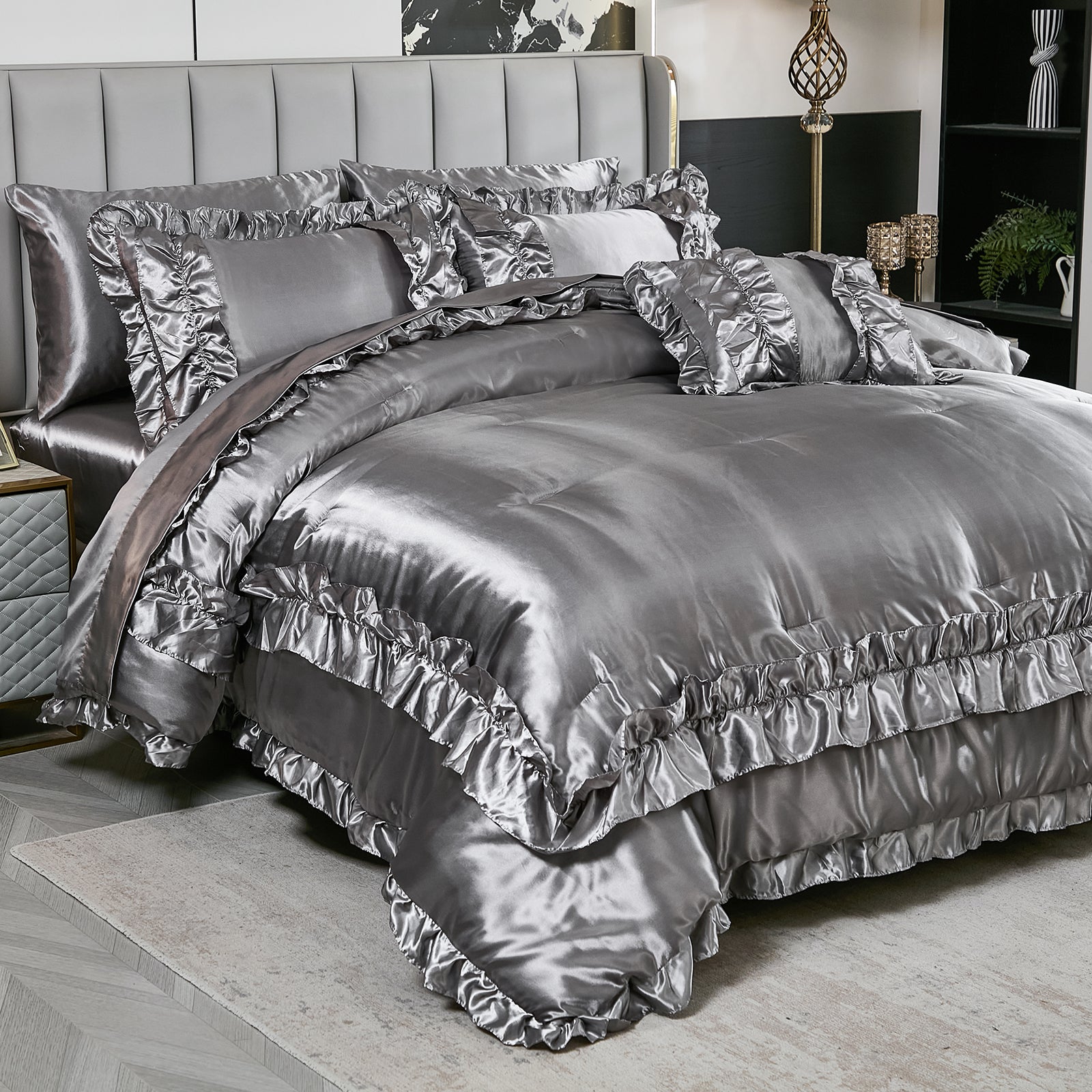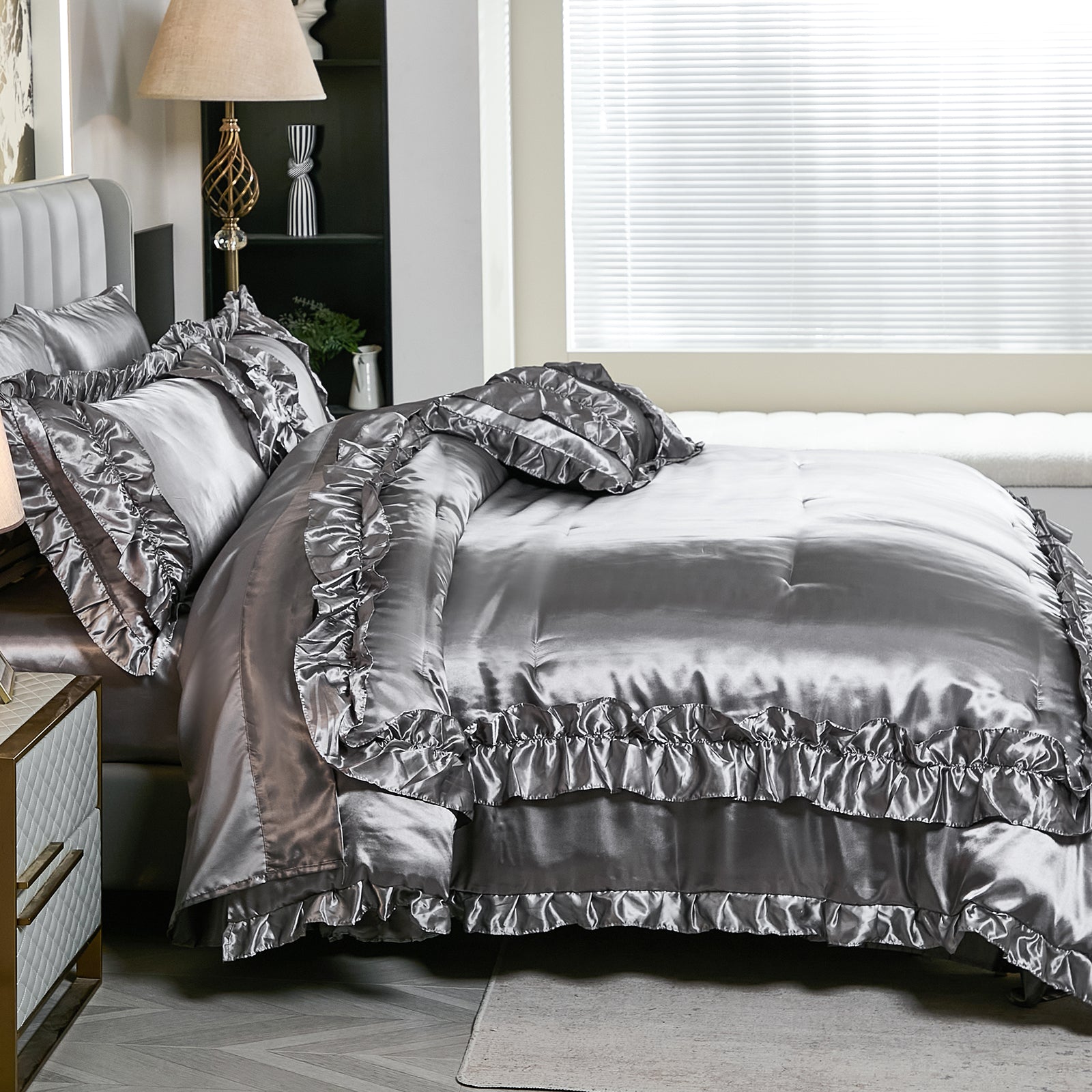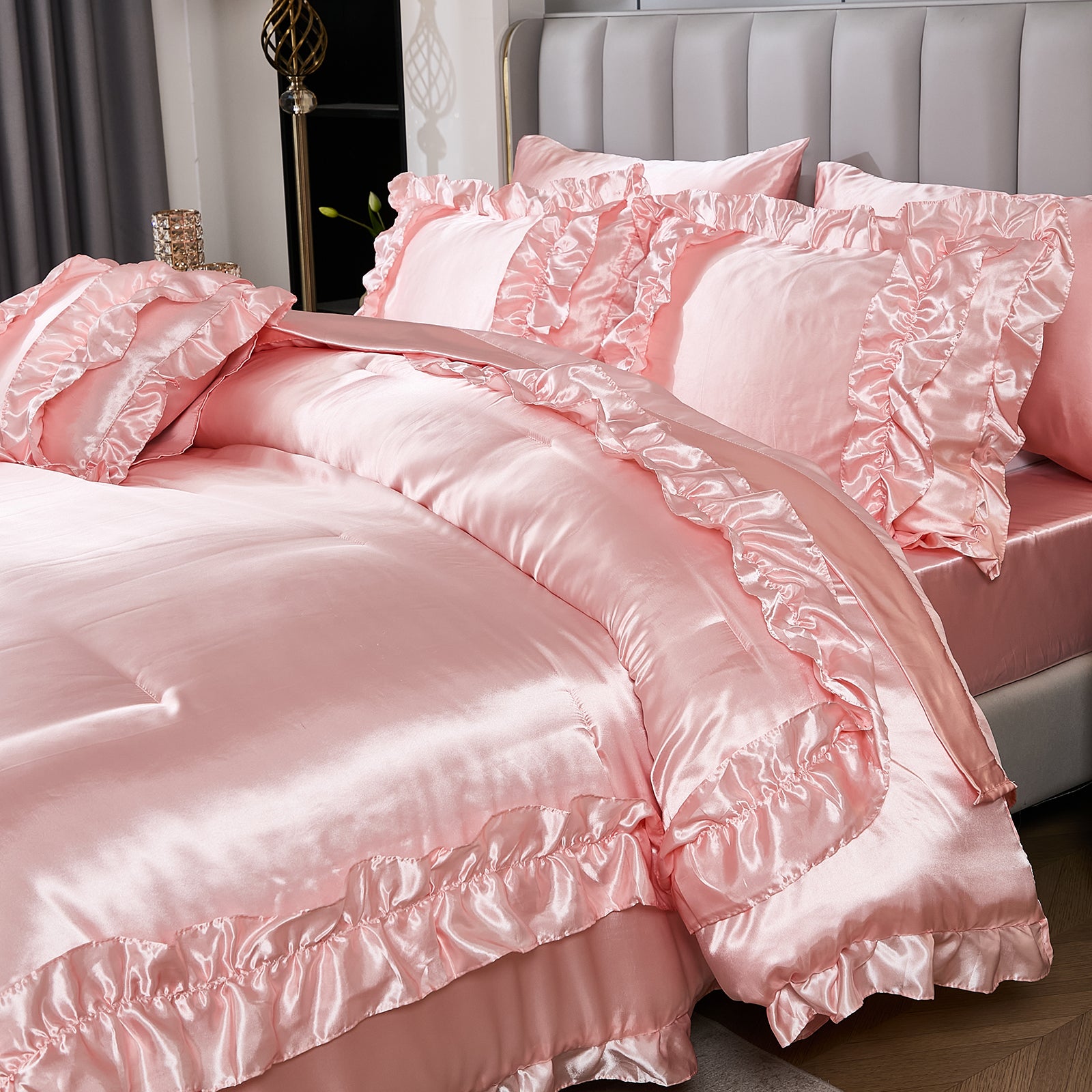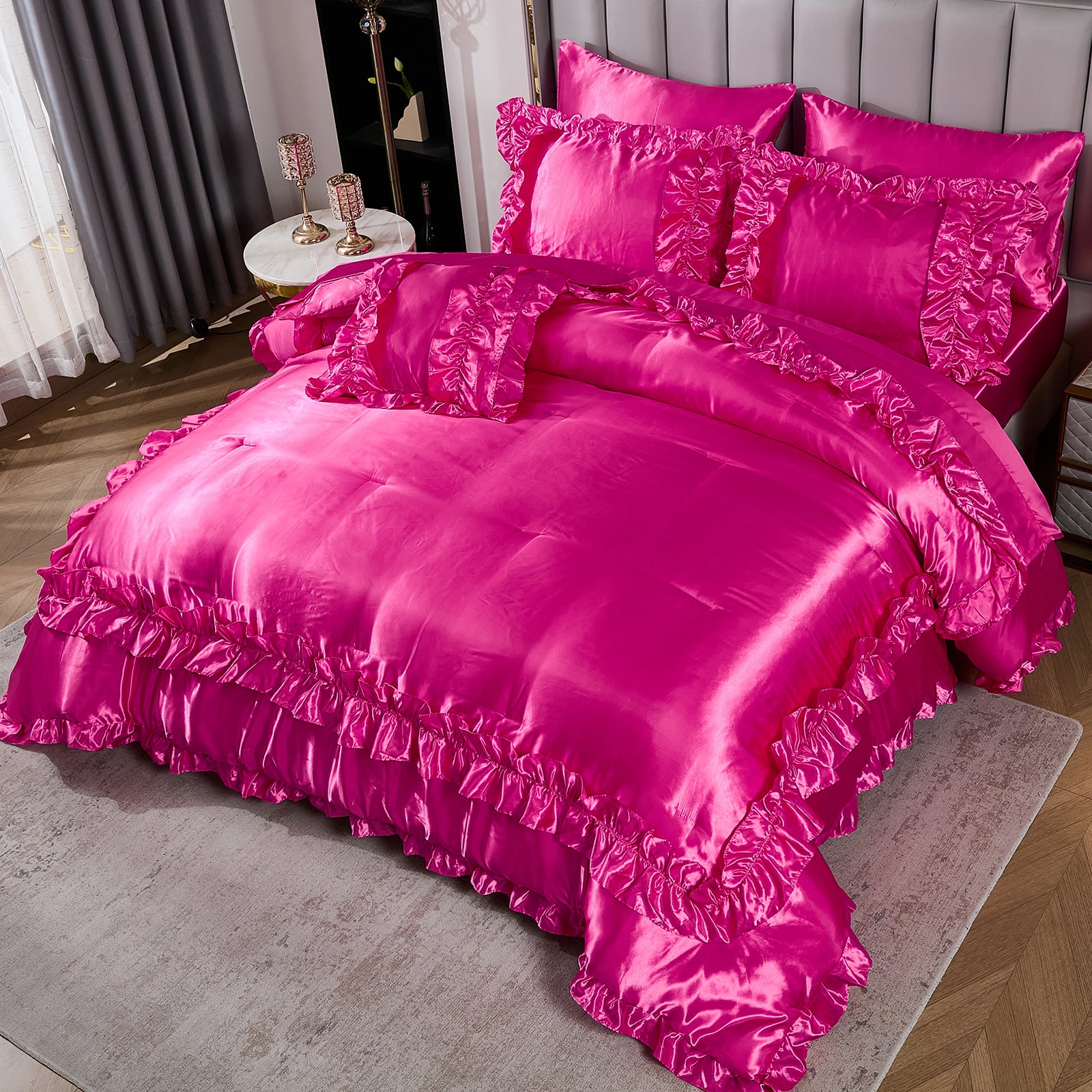 Transform your bedroom with the Satin Ruffle Comforter Set Bed in a Bag, featuring a classic waterfall ruffle design that brings romance and elegance to your space. The cascading ruffles add a princess-inspired charm, making this set perfect for farmhouse, shabby chic, or boho bedrooms.