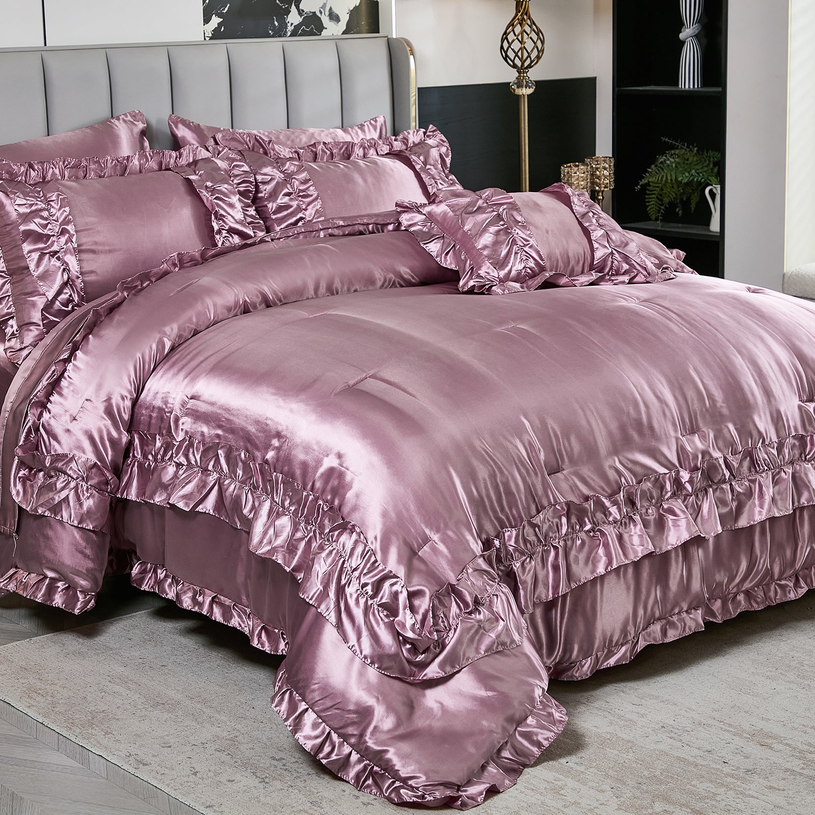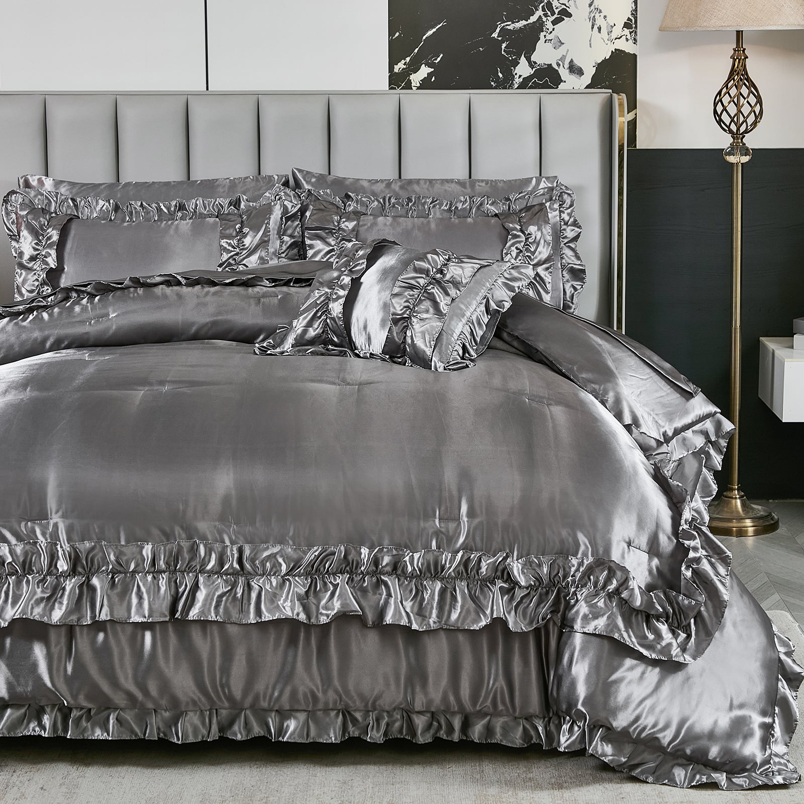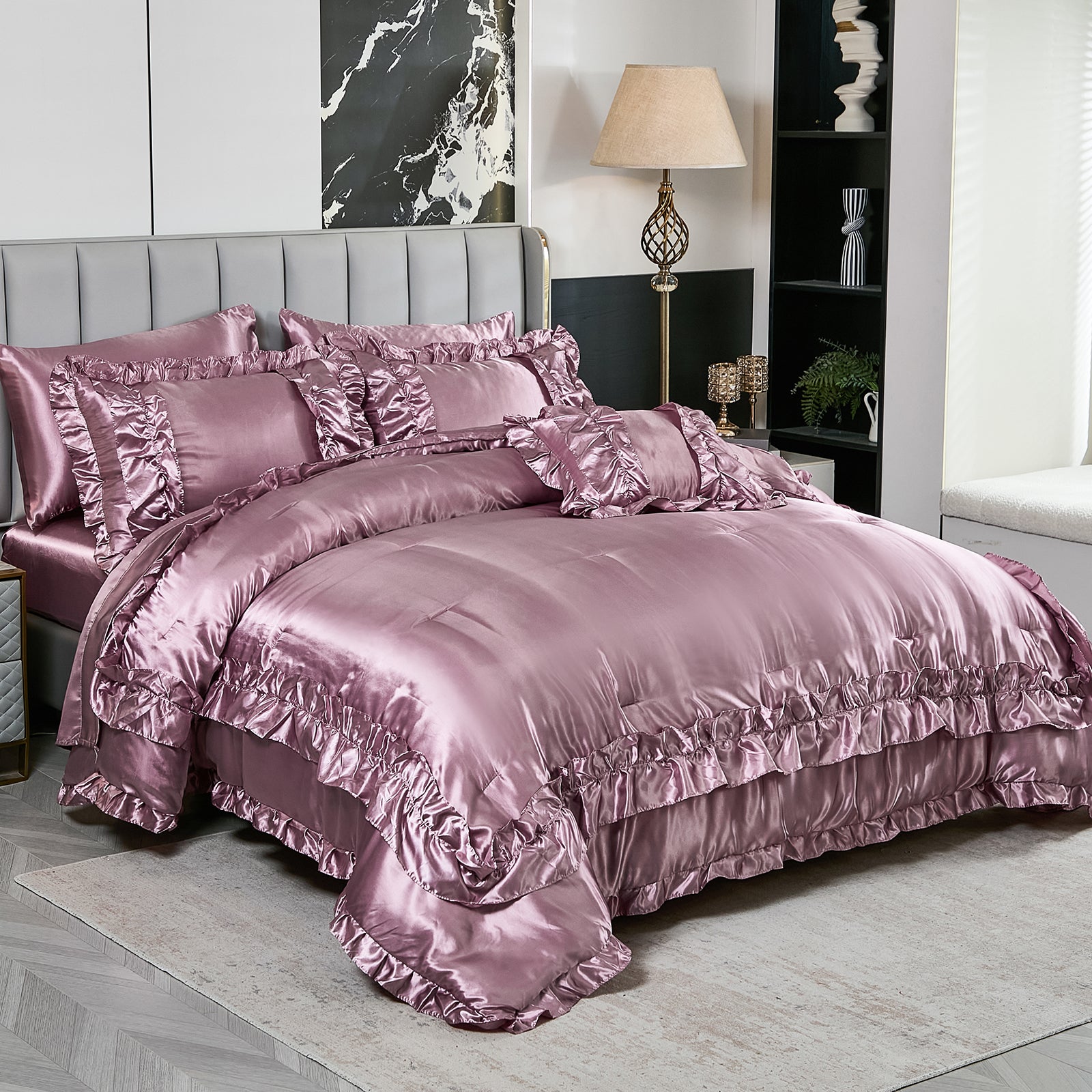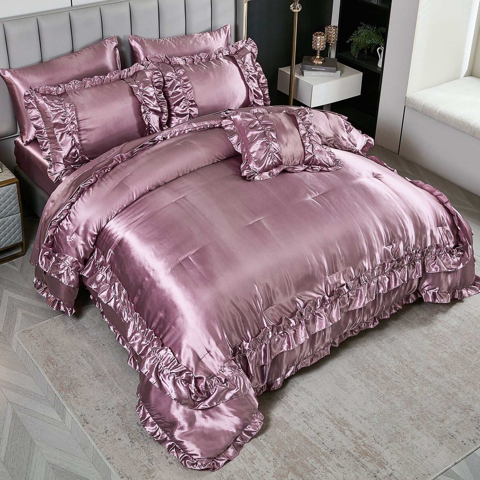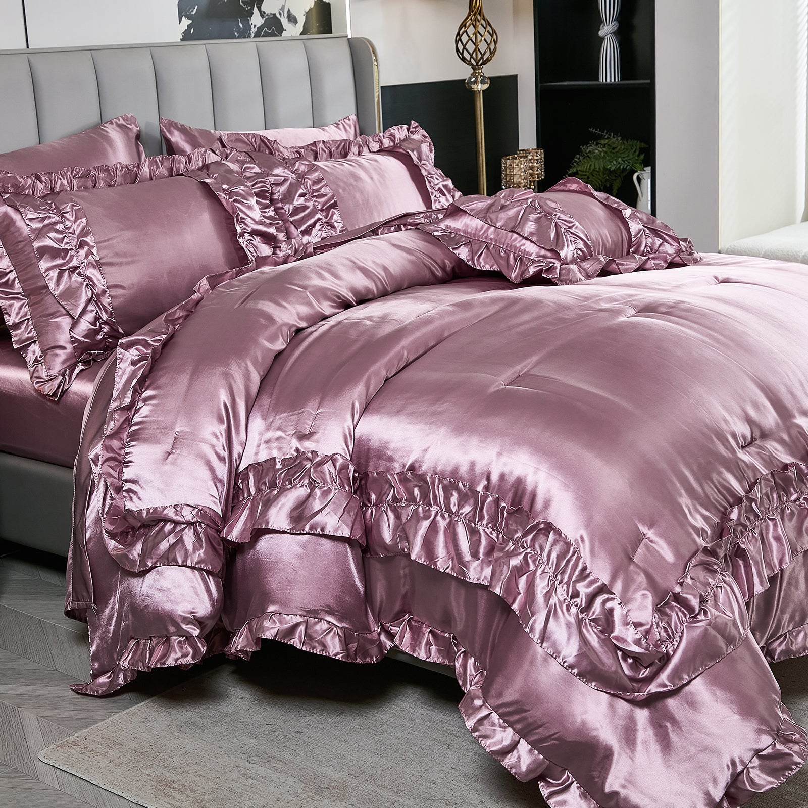 Transform your bedroom with the Satin Ruffle Comforter Set Bed in a Bag, featuring a classic waterfall ruffle design that brings romance and elegance to your space. The cascading ruffles add a princess-inspired charm, making this set perfect for farmhouse, shabby chic, or boho bedrooms.
