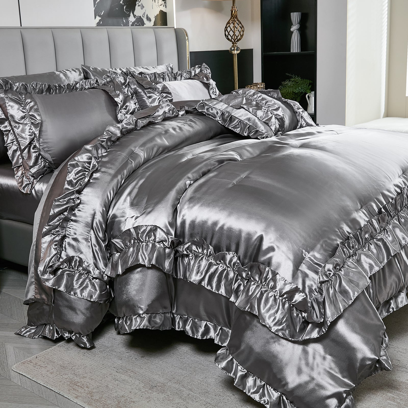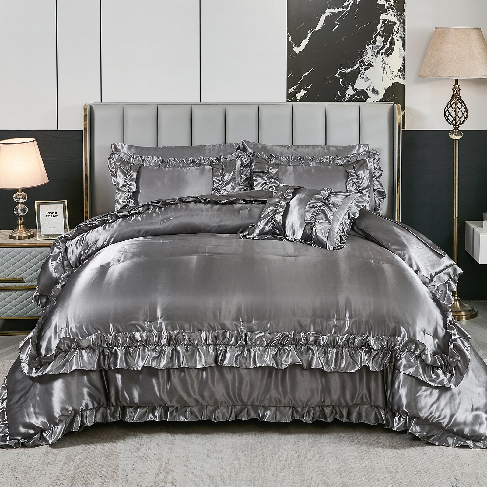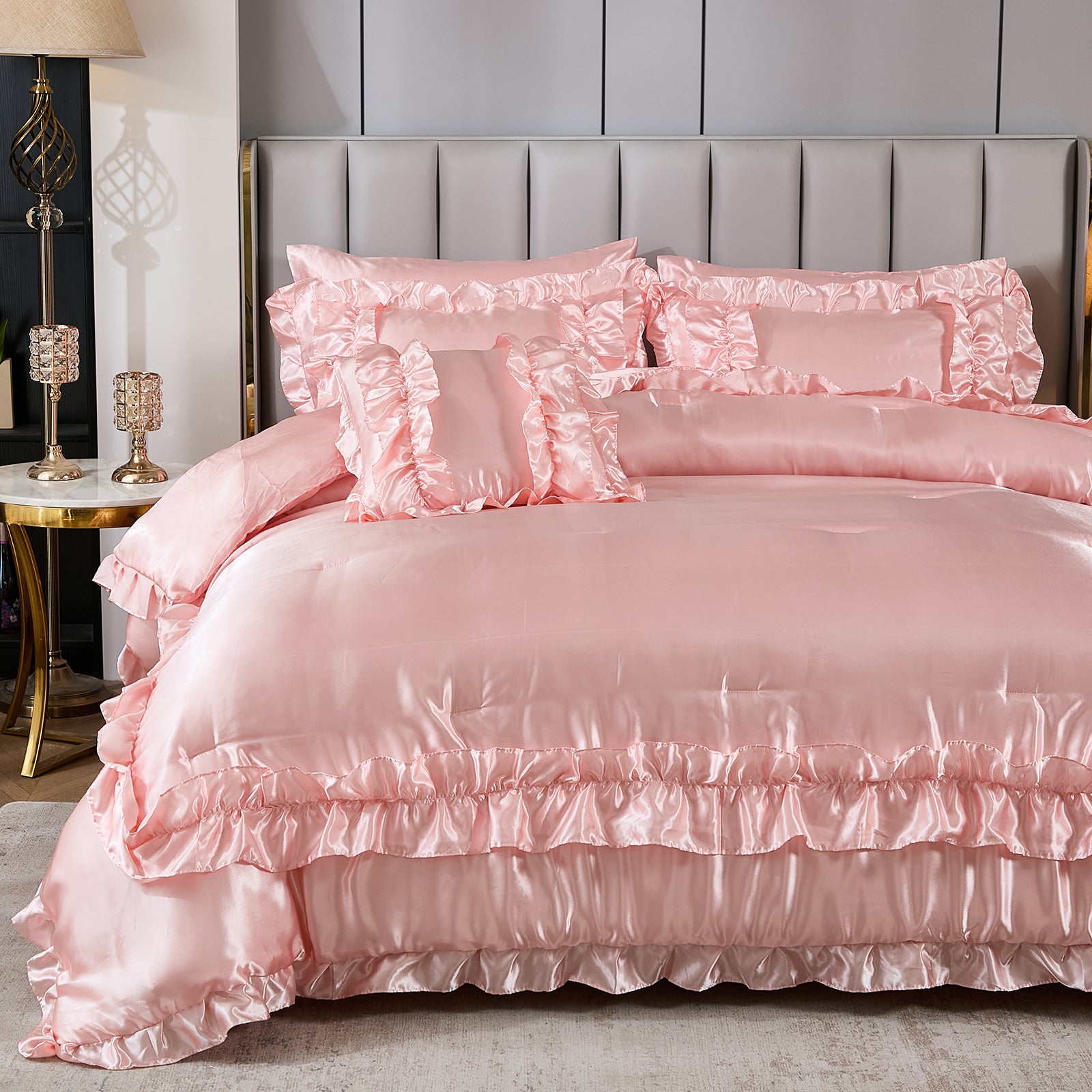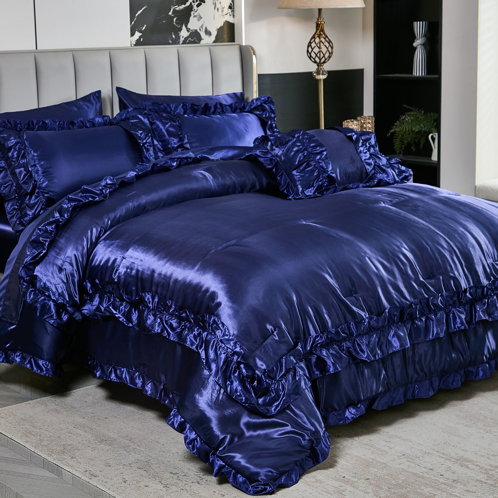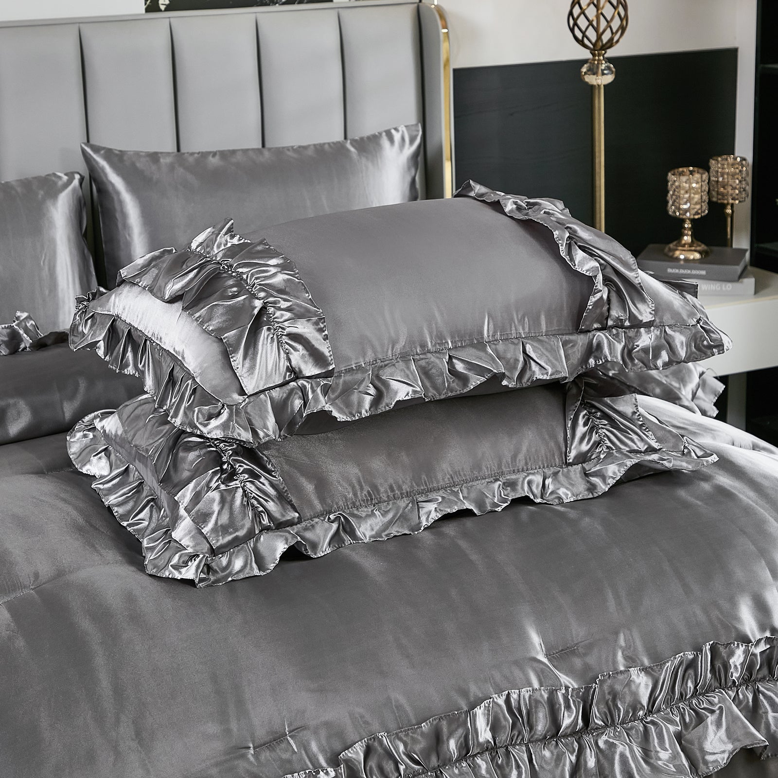 Transform your bedroom with the Satin Ruffle Comforter Set Bed in a Bag, featuring a classic waterfall ruffle design that brings romance and elegance to your space. The cascading ruffles add a princess-inspired charm, making this set perfect for farmhouse, shabby chic, or boho bedrooms.