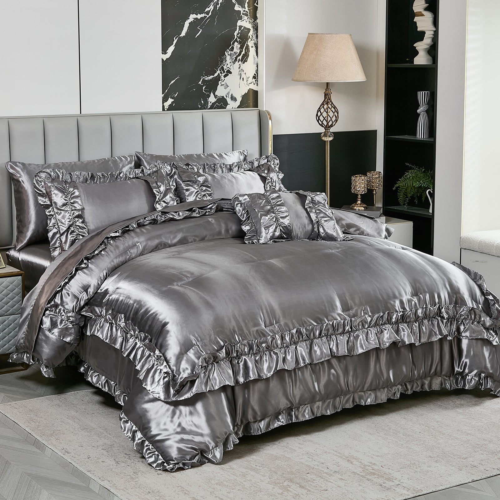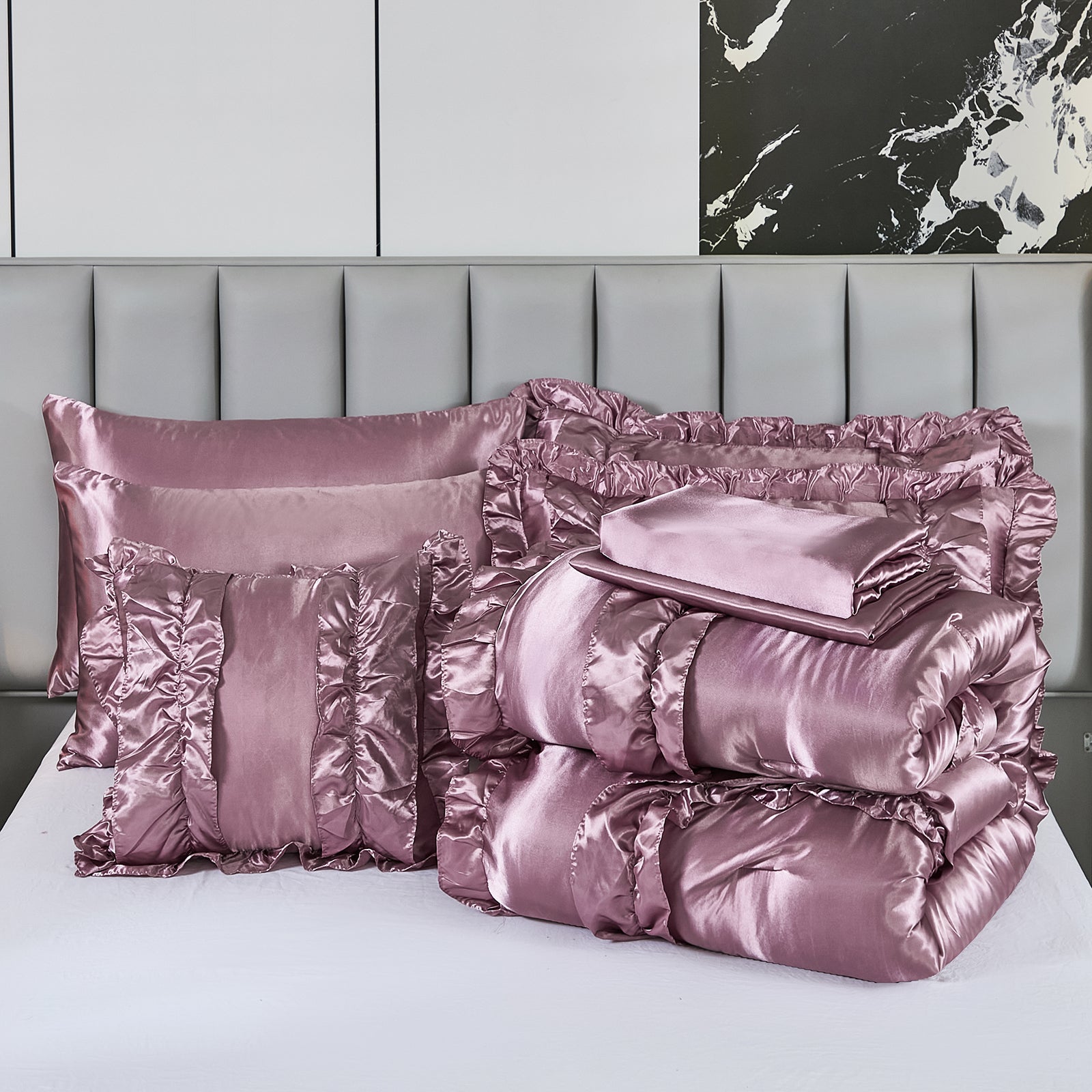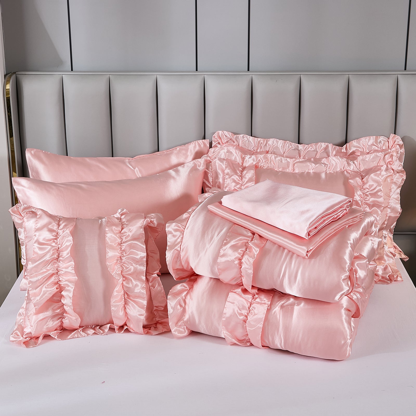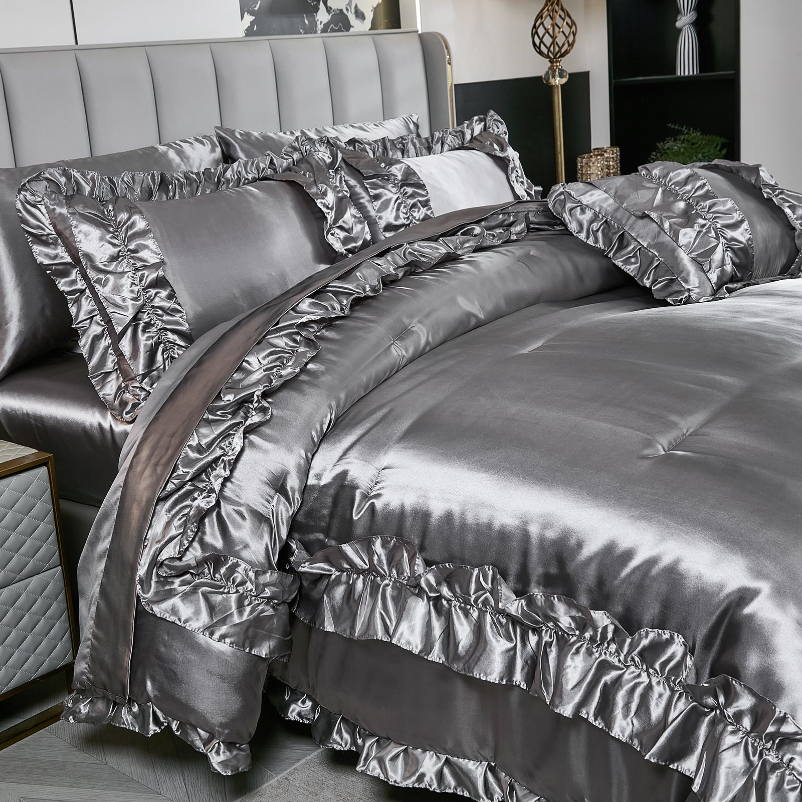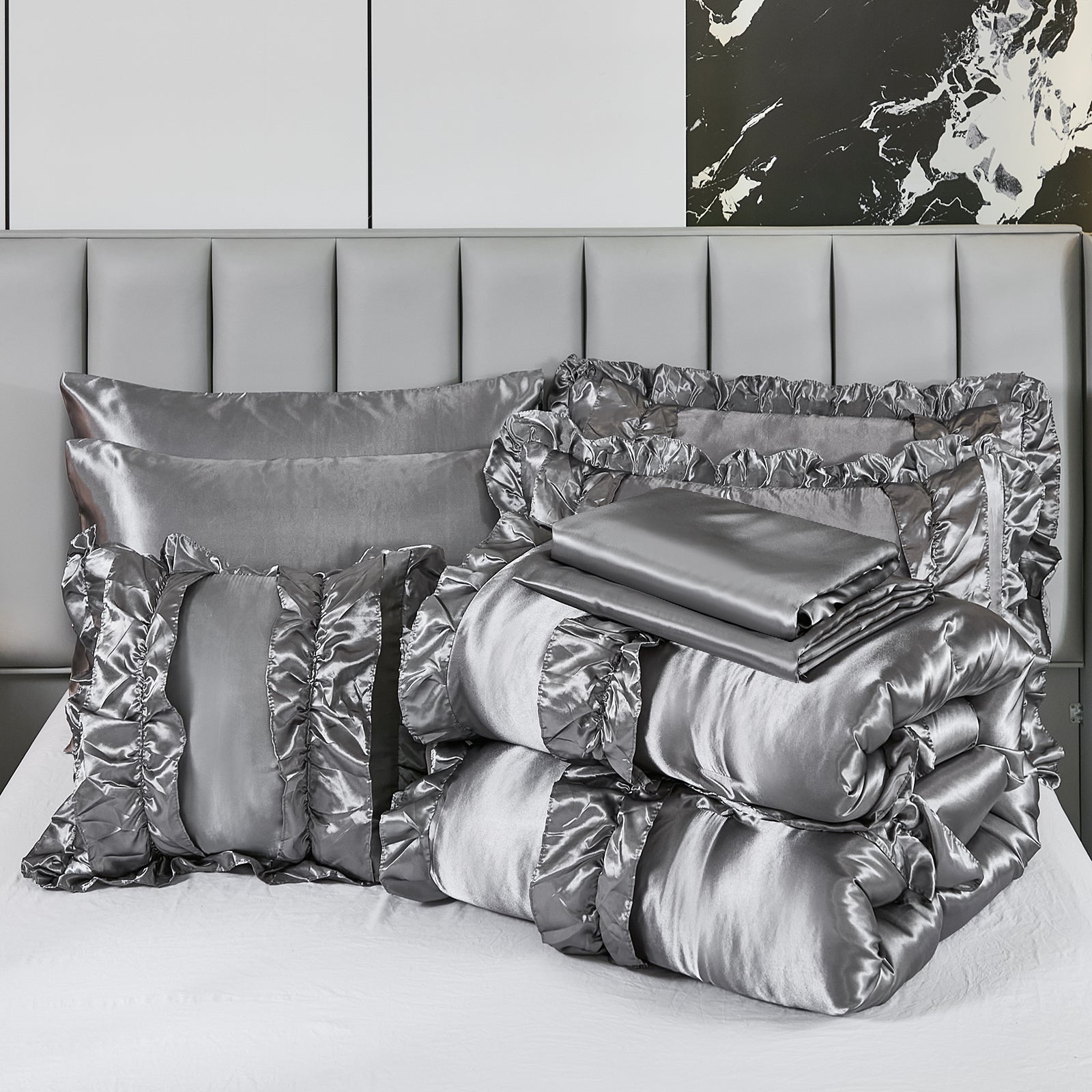 Transform your bedroom with the Satin Ruffle Comforter Set Bed in a Bag, featuring a classic waterfall ruffle design that brings romance and elegance to your space. The cascading ruffles add a princess-inspired charm, making this set perfect for farmhouse, shabby chic, or boho bedrooms.